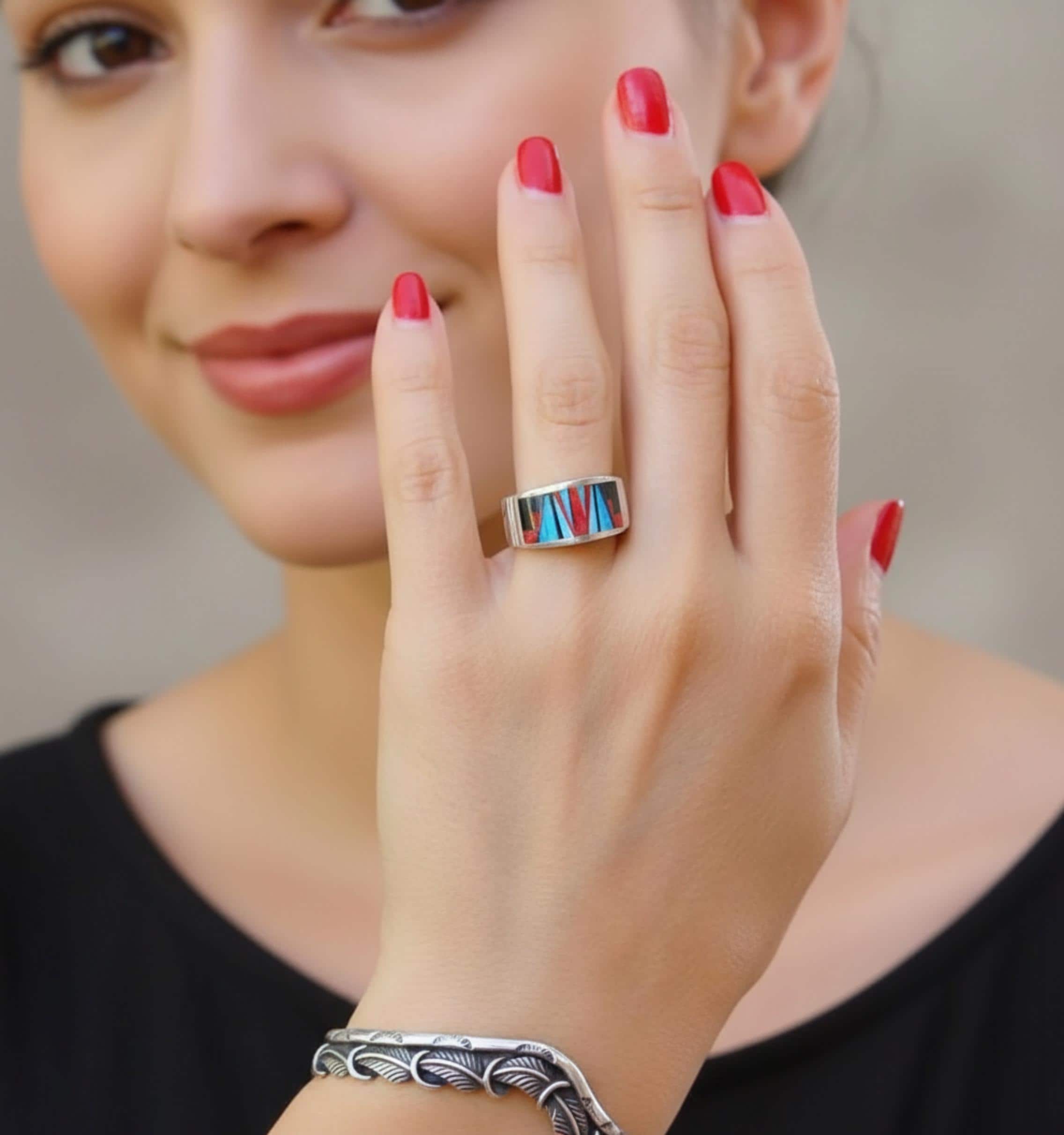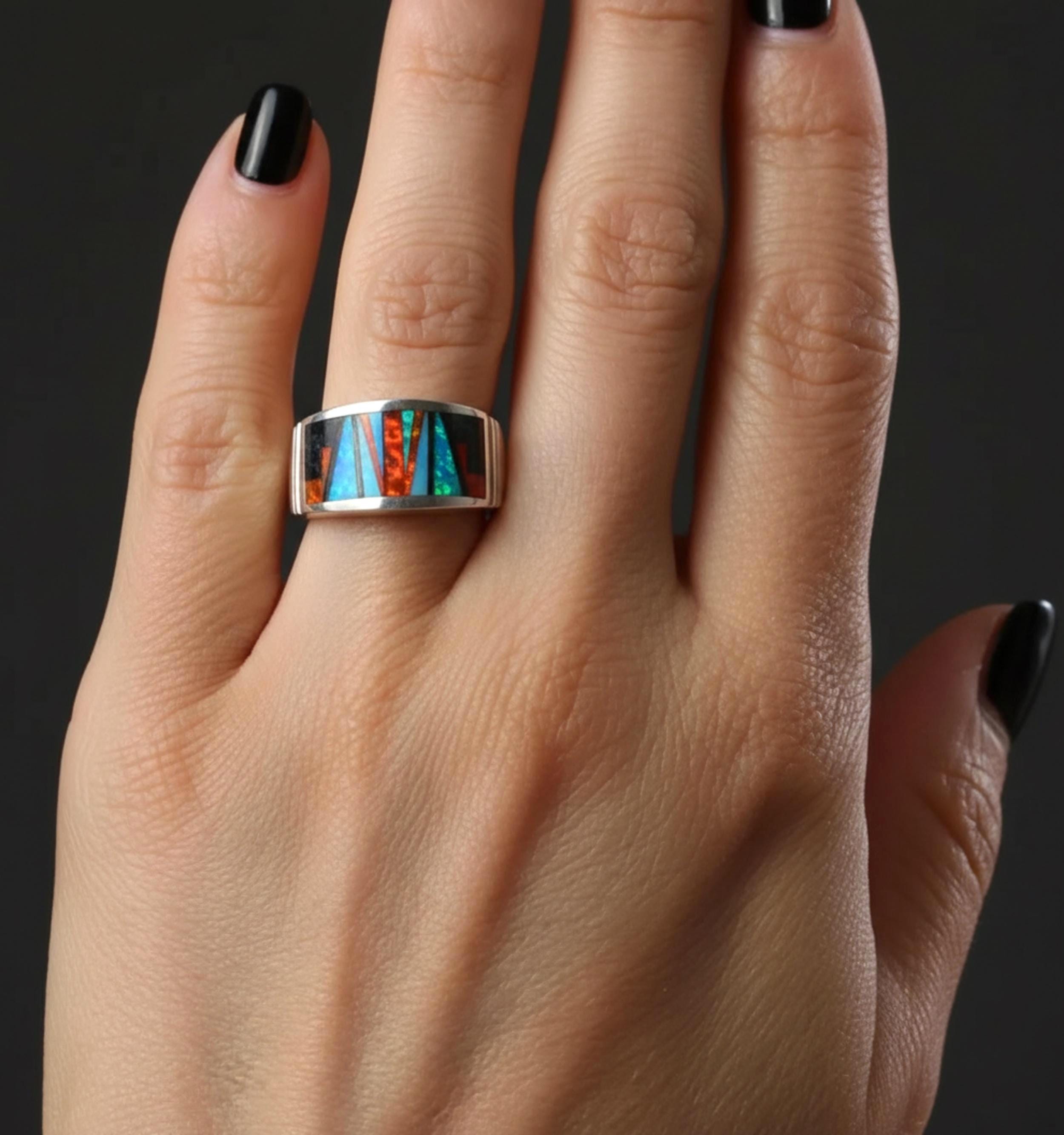This band ring is handcrafted with Sterling Silver and beautifully inlaid with bright, dazzling, red Fire Lab Opal (lab) and Onyx. As is seen in this work of art, the artist's talent is evident! It is a favorite due to the expertly clean cut geometric work, followed by the angular shape of the ring. This is that signature accessory that will compliment your wardrobe.