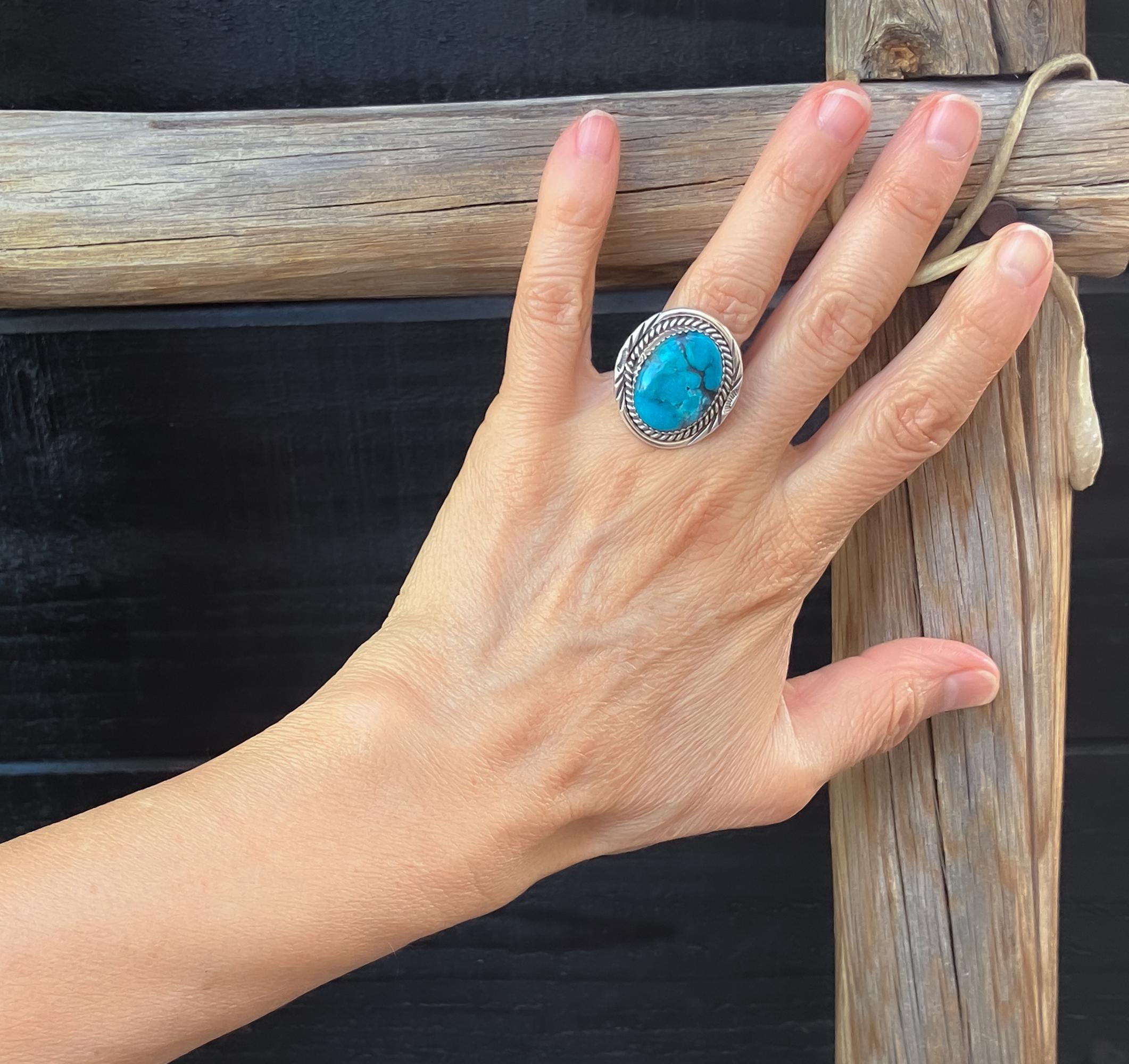 This exquisite Navajo turquoise ring showcases a hand-cut stone set within an elegant sterling silver design. The vivid blue turquoise with its striking dark matrix makes this piece a timeless masterpiece of traditional craftsmanship. The twisted silver wire and hand tooled frame adds a refined touch to the stone, perfectly complementing the size and style for a flattering fit.