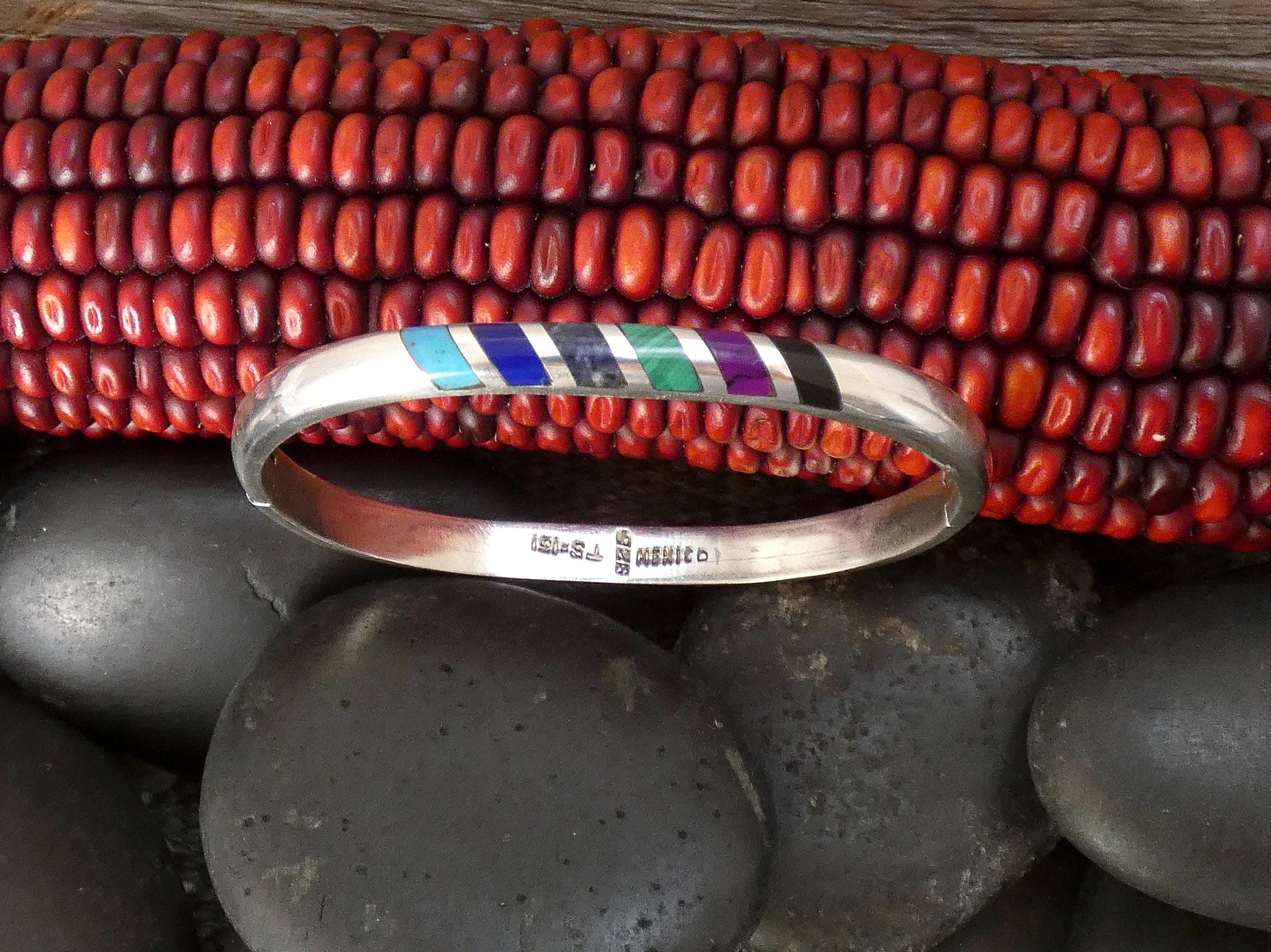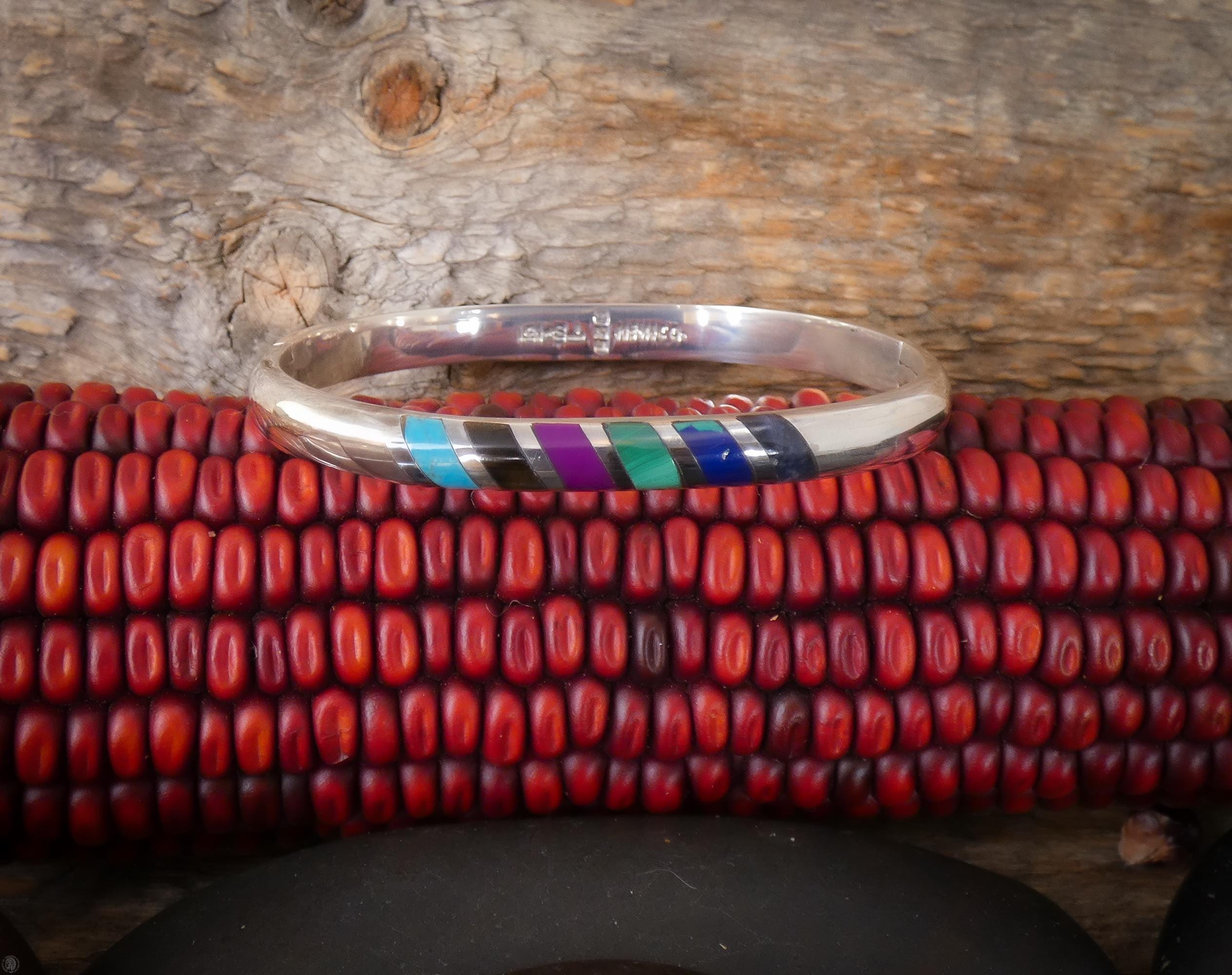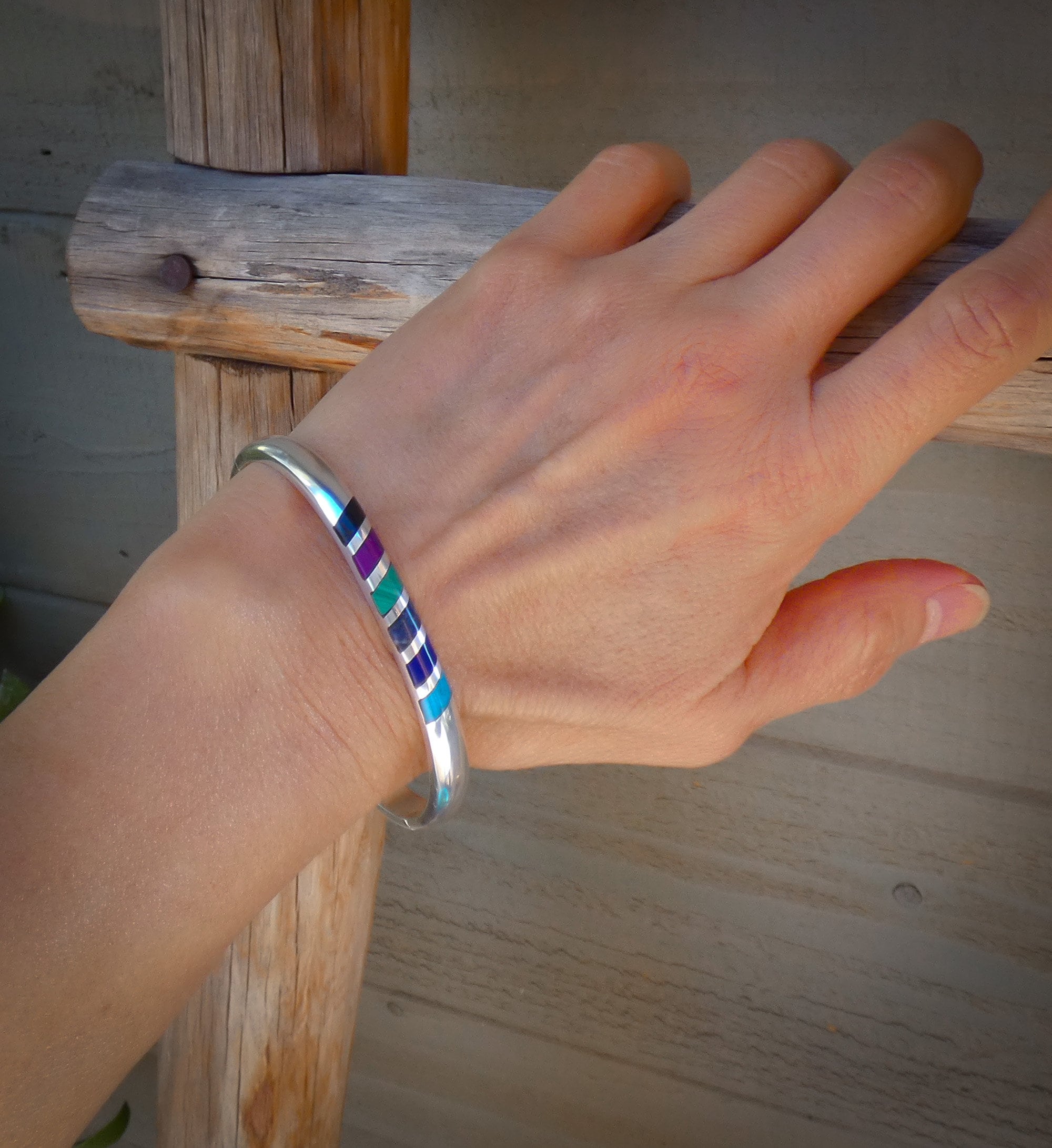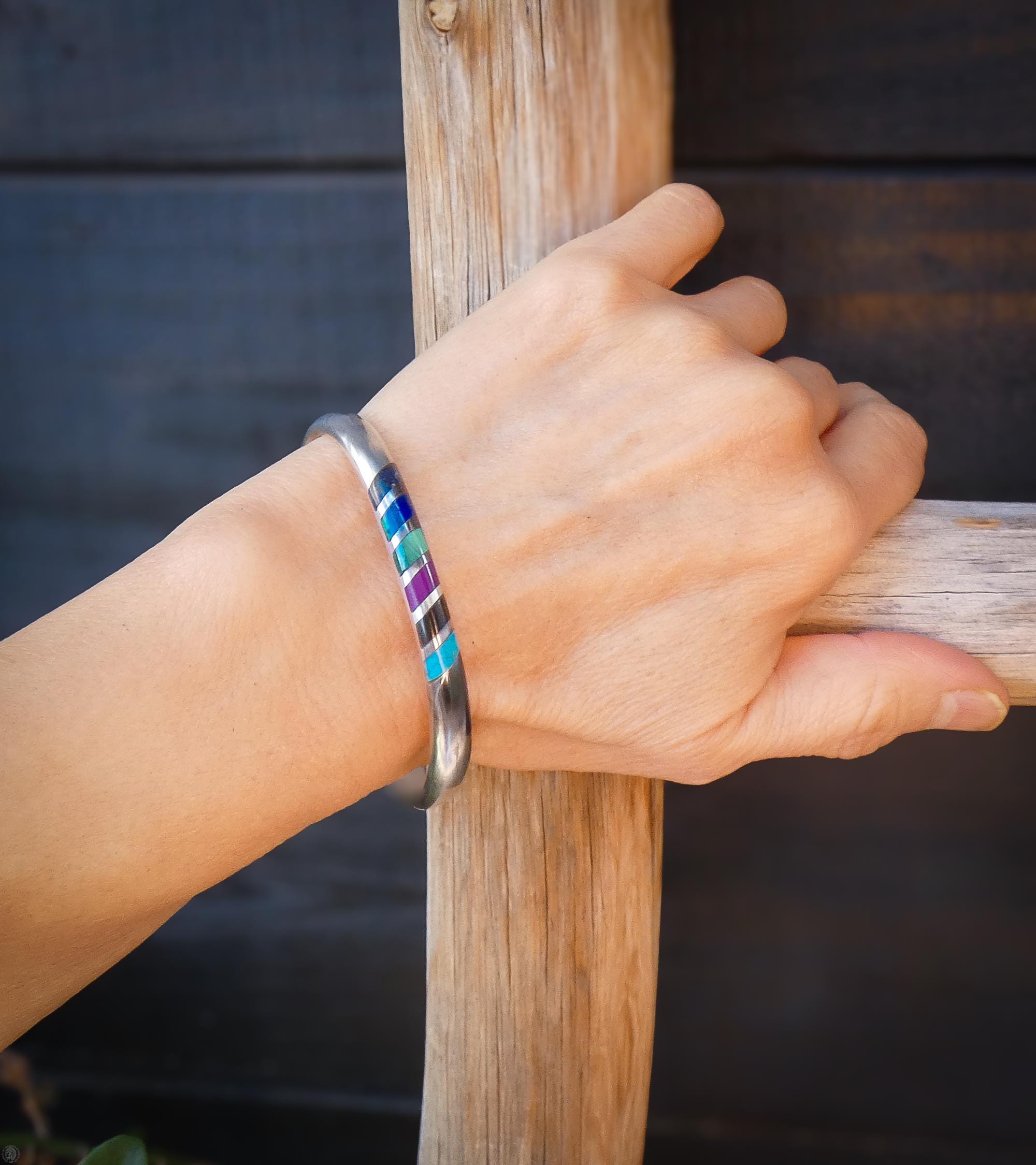 This Sterling Silver Lapis, Turquoise, Sugilite, Malachite, Azurite, and Onyx inlay design offers a subtle signature of understated quality. This is a stunning, expertly hand-tooled bangle that can be worn stacked with multiple jewelry styles.