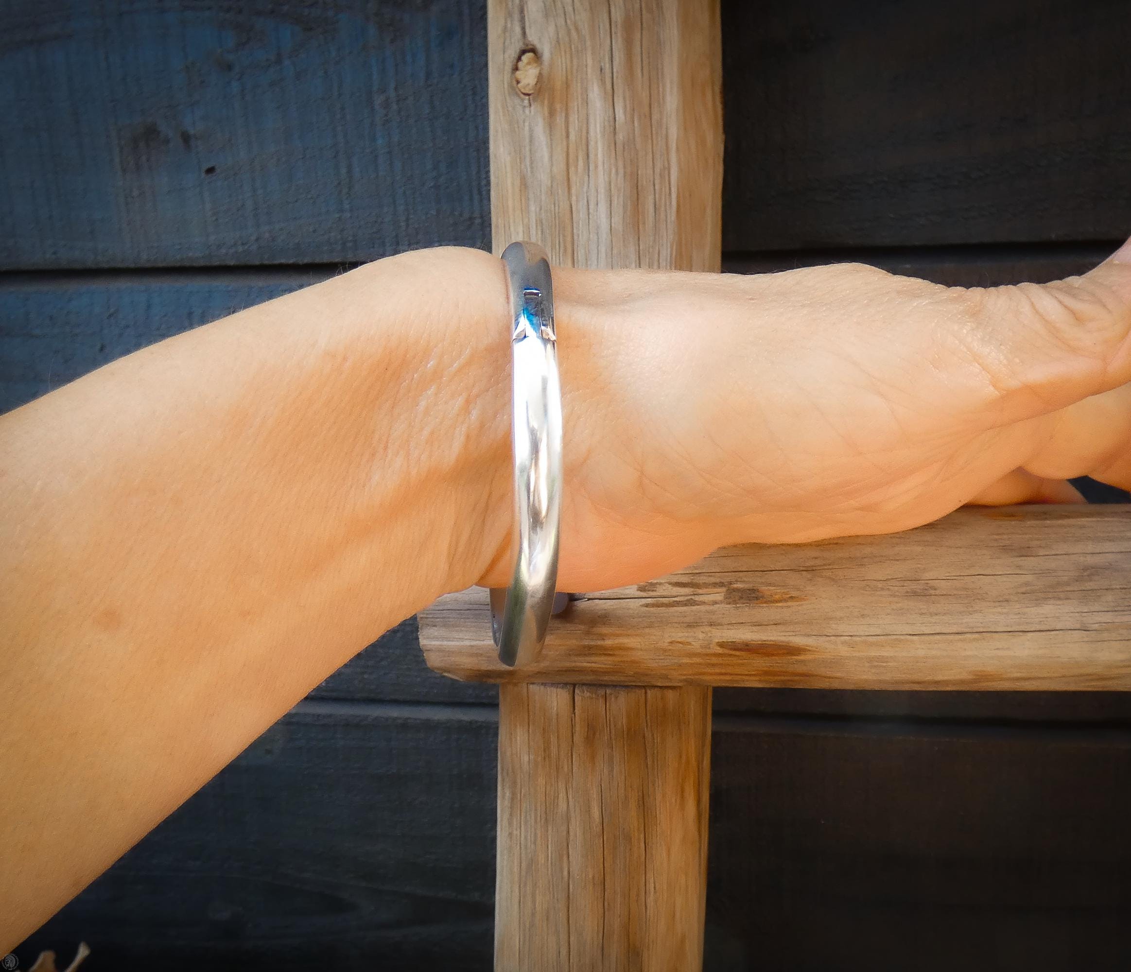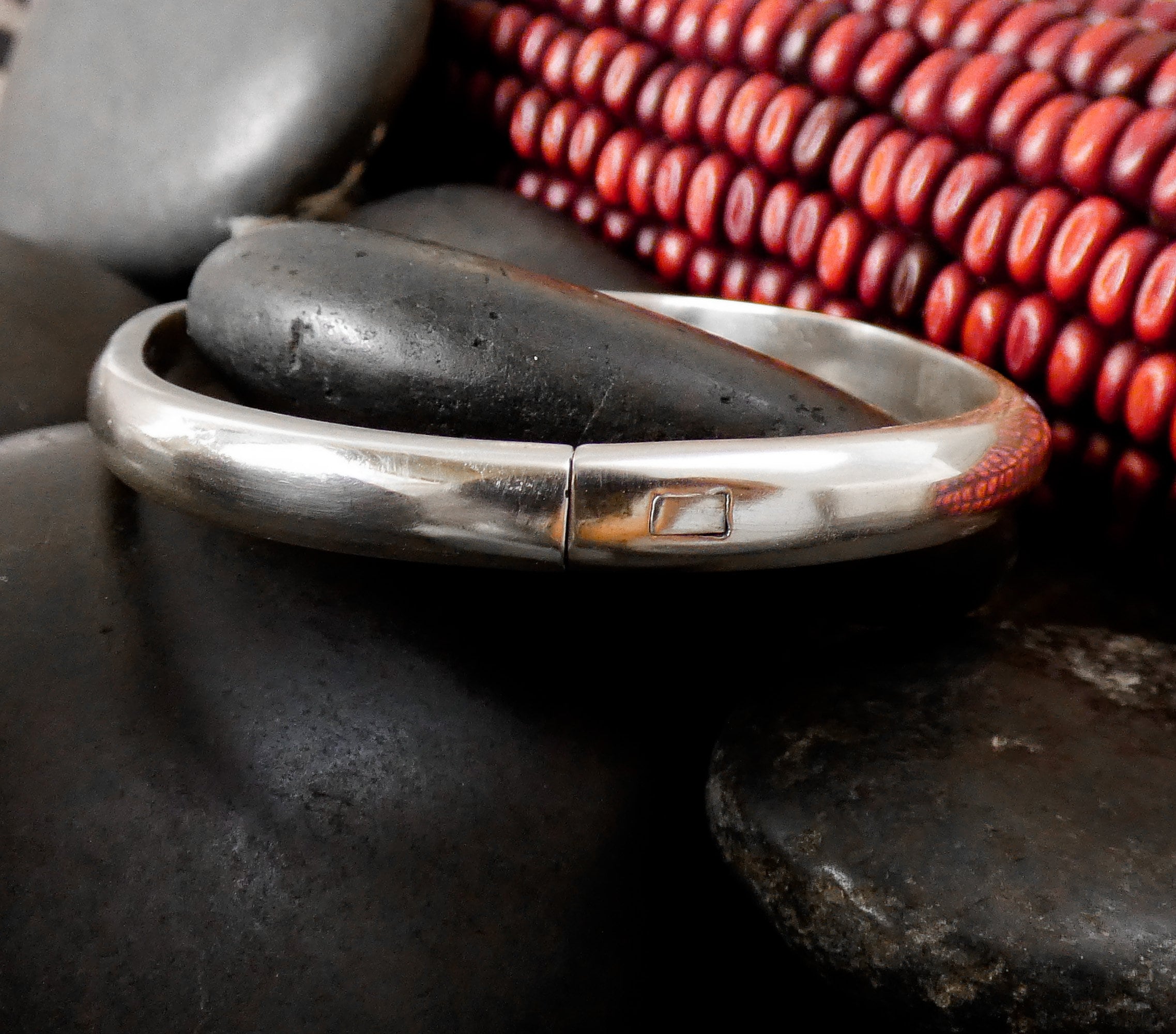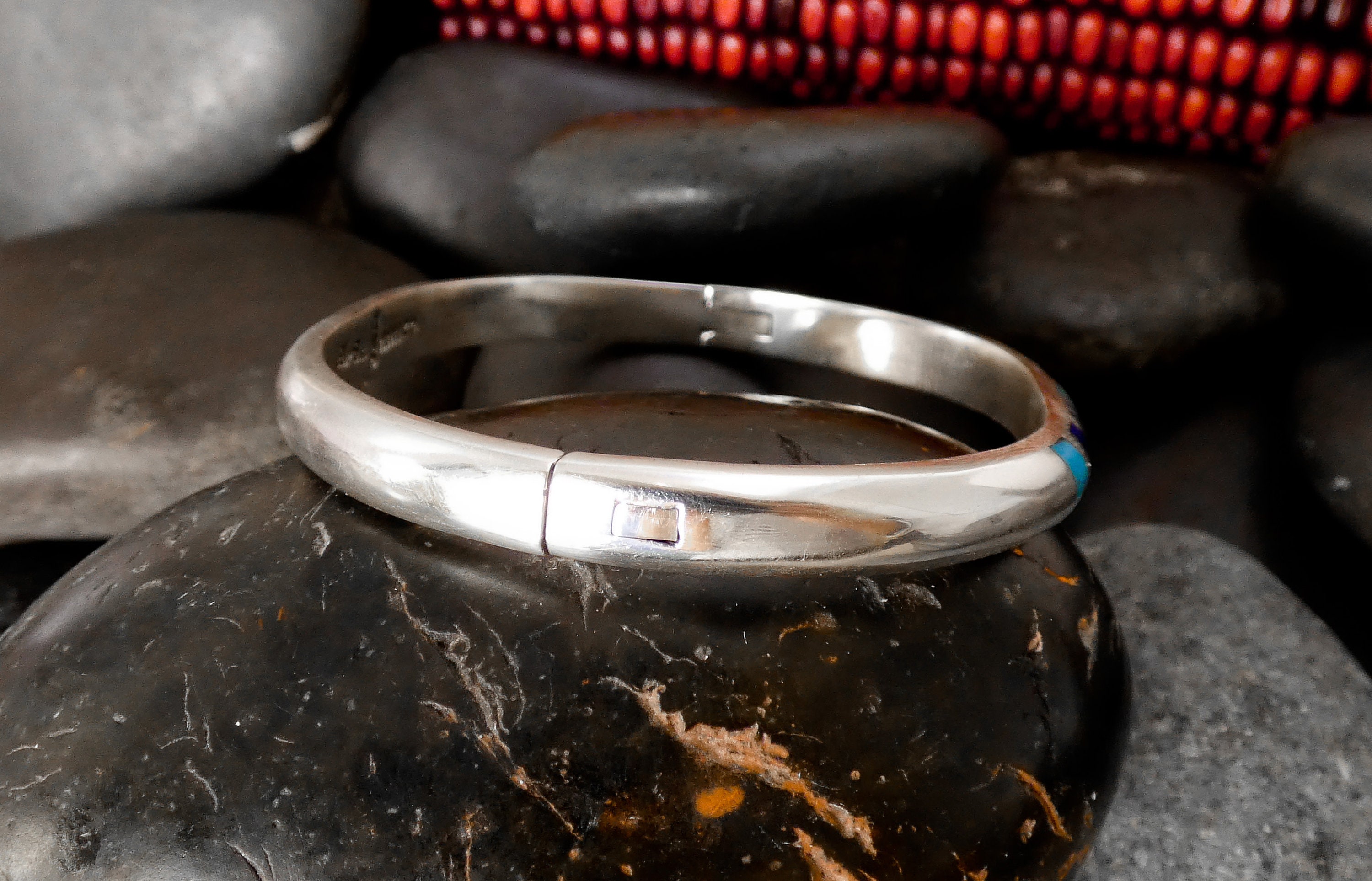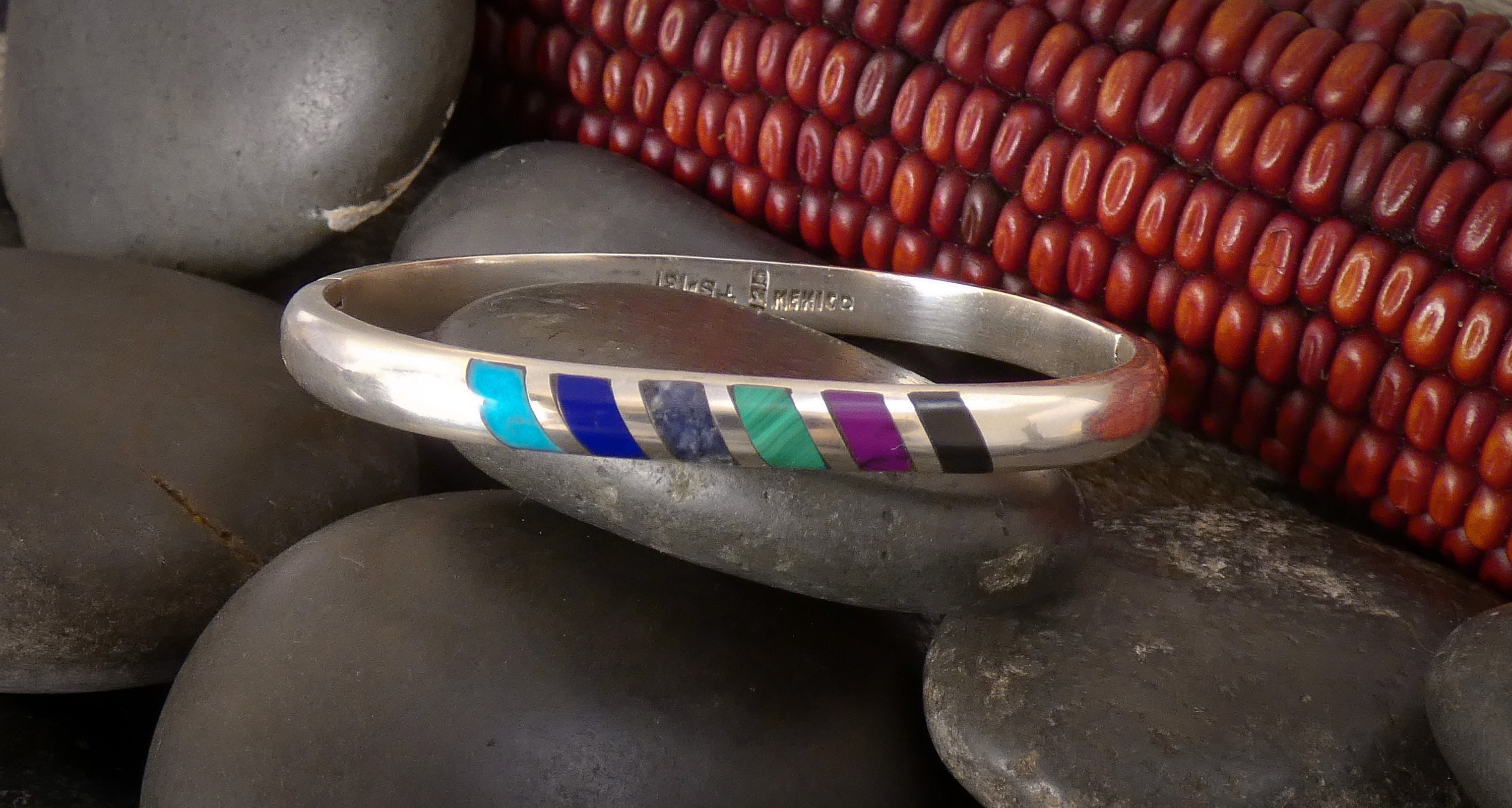 This Sterling Silver Lapis, Turquoise, Sugilite, Malachite, Azurite, and Onyx inlay design offers a subtle signature of understated quality. This is a stunning, expertly hand-tooled bangle that can be worn stacked with multiple jewelry styles.