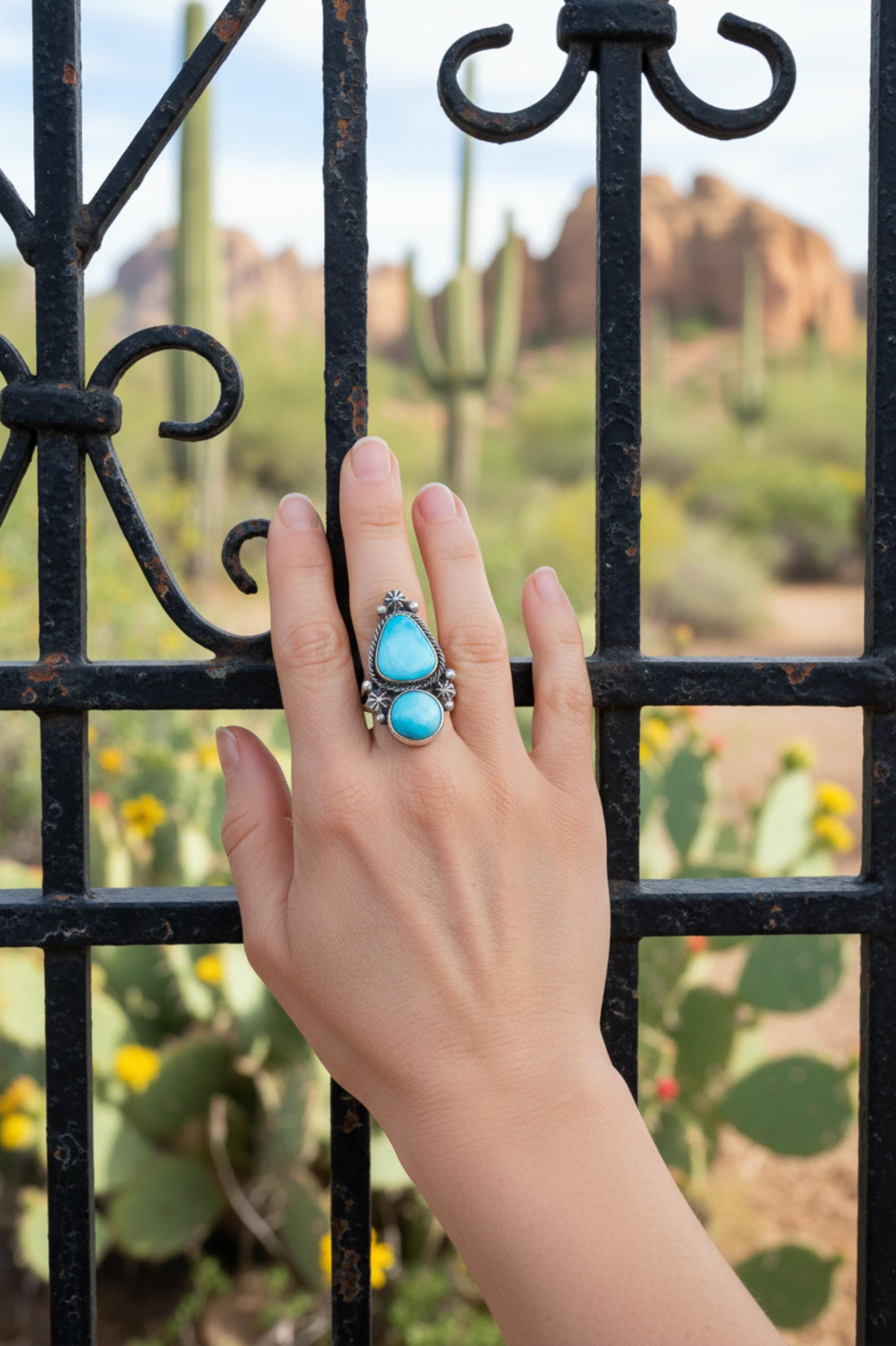 This Native American Women's Turquoise ring is a real find. Eli Skeets is considered a master at his craft. His hallmark is an oxidized silver border with stunning turquoise stones. The result is a remarkable work of art! This statement ring is a show-stopper and a treasure for generations to come.