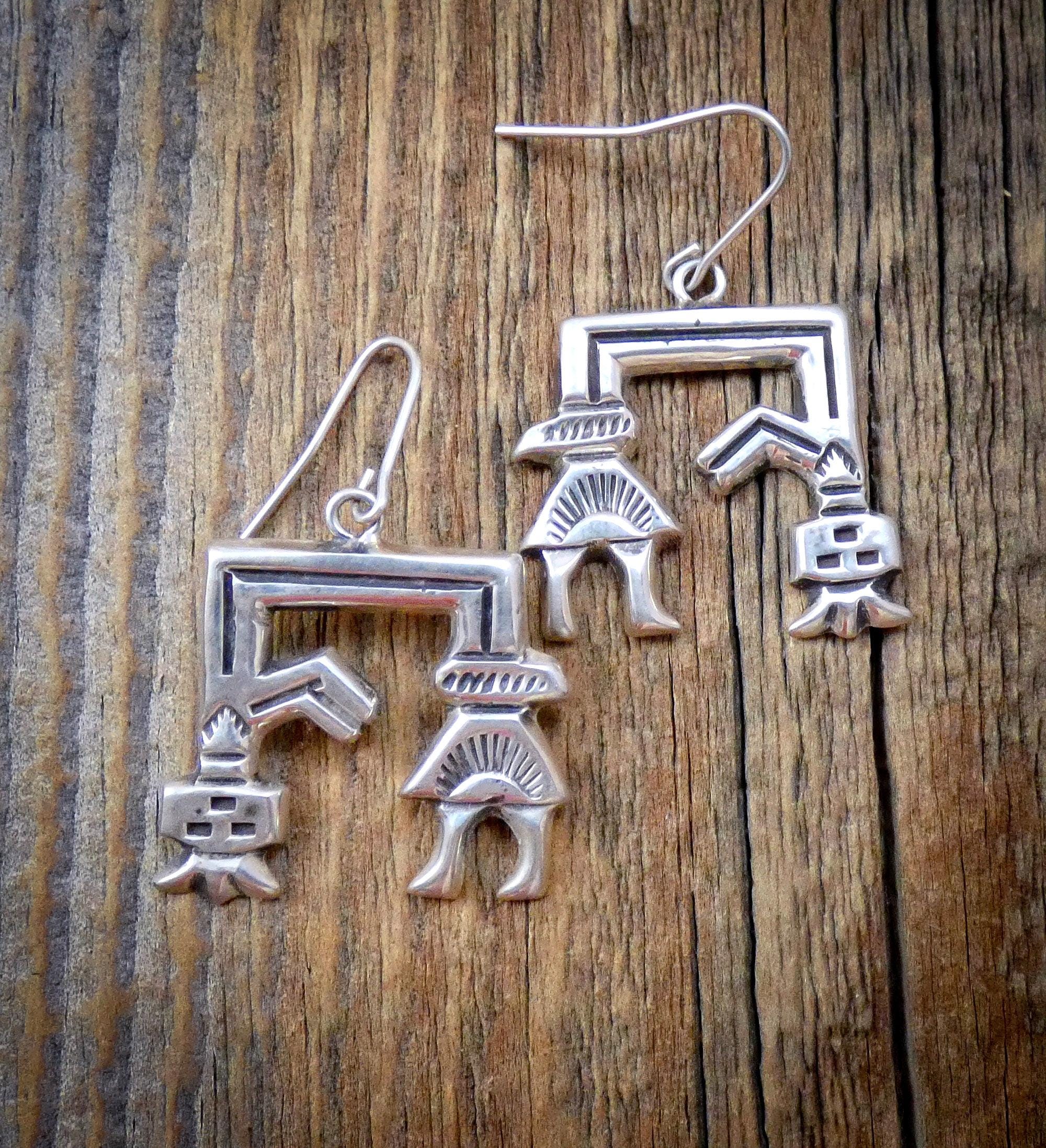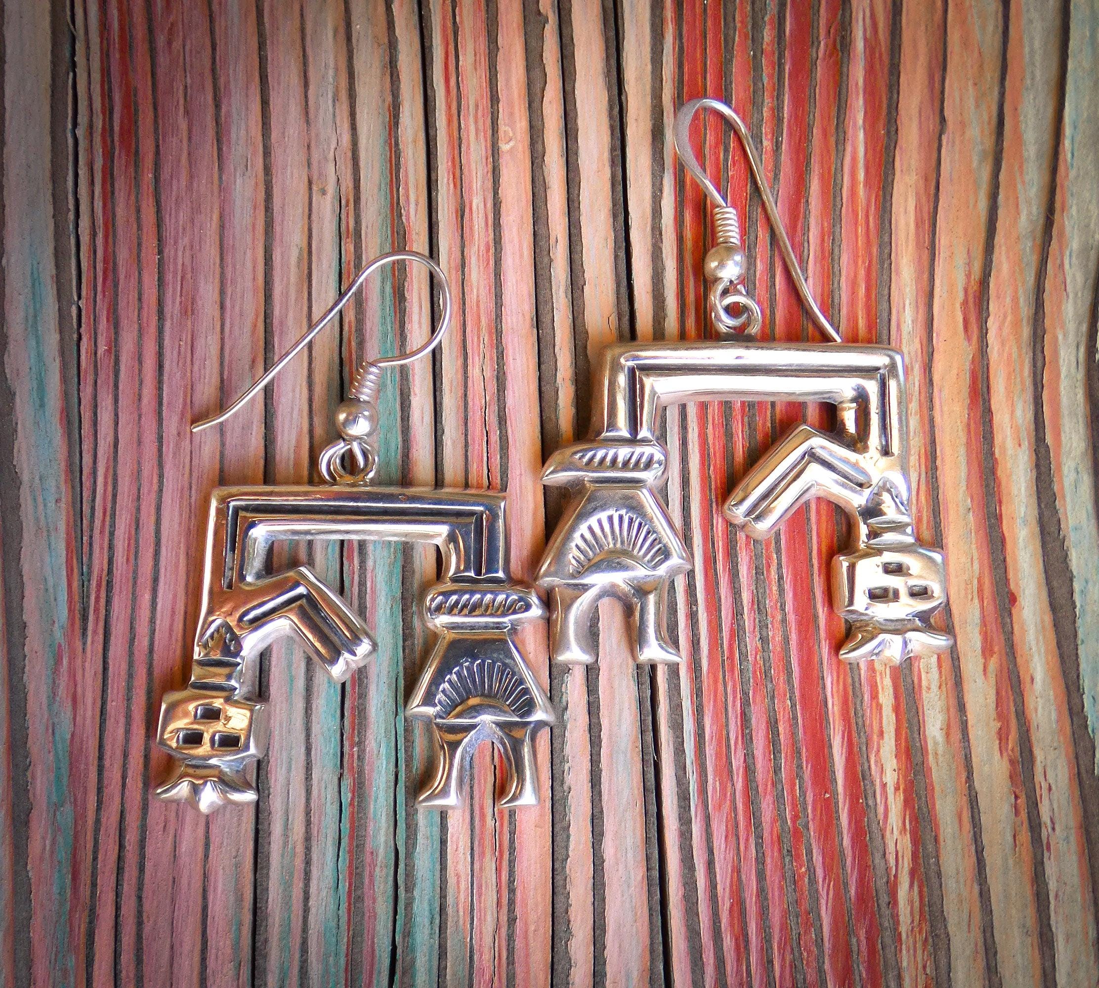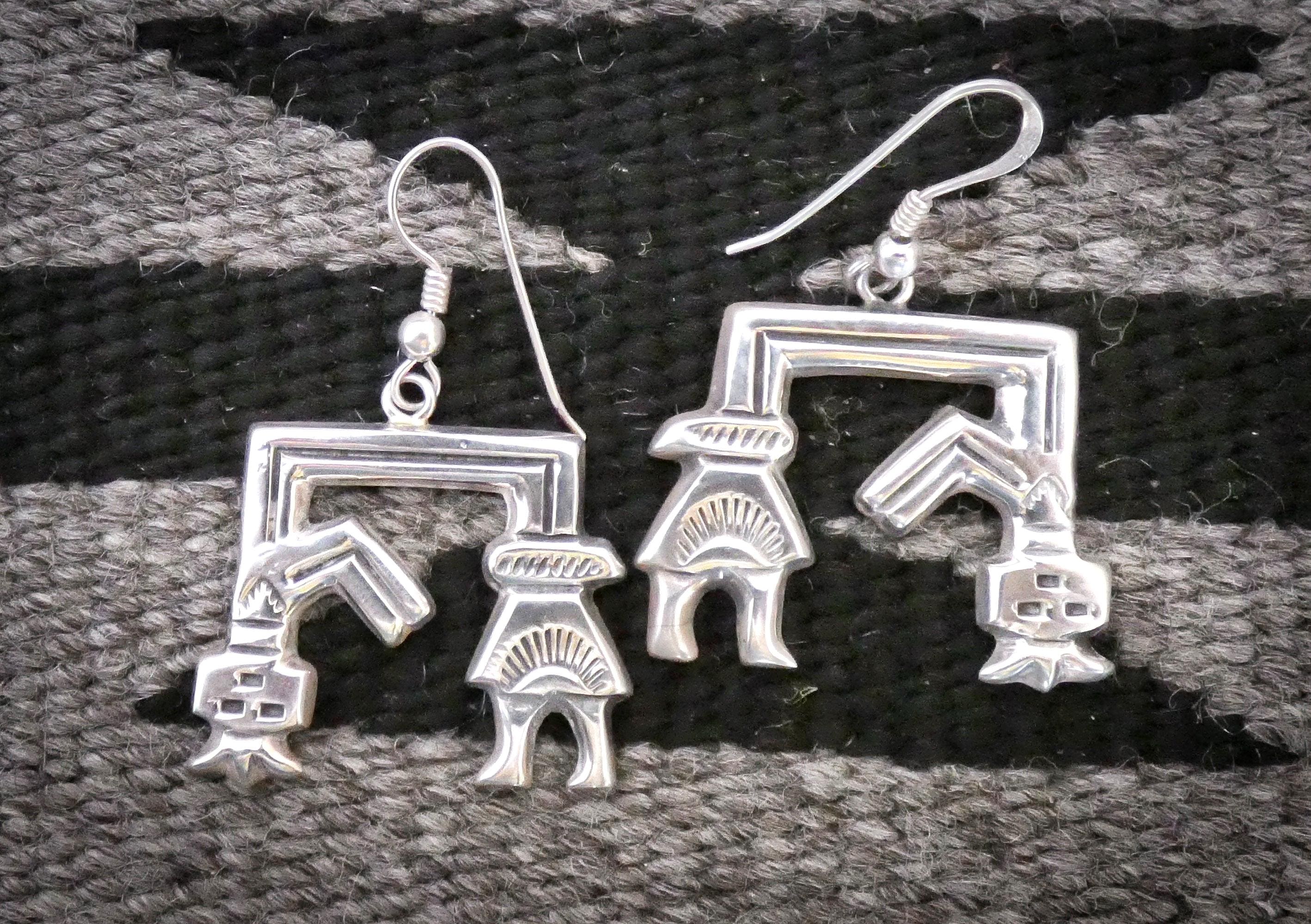 This is a great opportunity to own such fun yet historical jewelry! These earrings feature a design not normally seen. The Sterling Silver is hand-tooled into a Rainbow Dancer Yei design. The Navajo Yei spirits, control elements like rain, snow, wind, and sun. Show off your unique kachina collection with this pin!