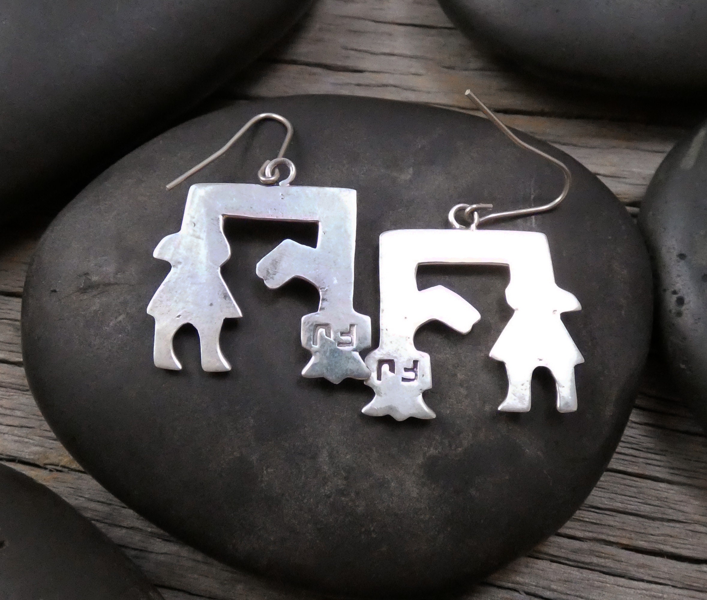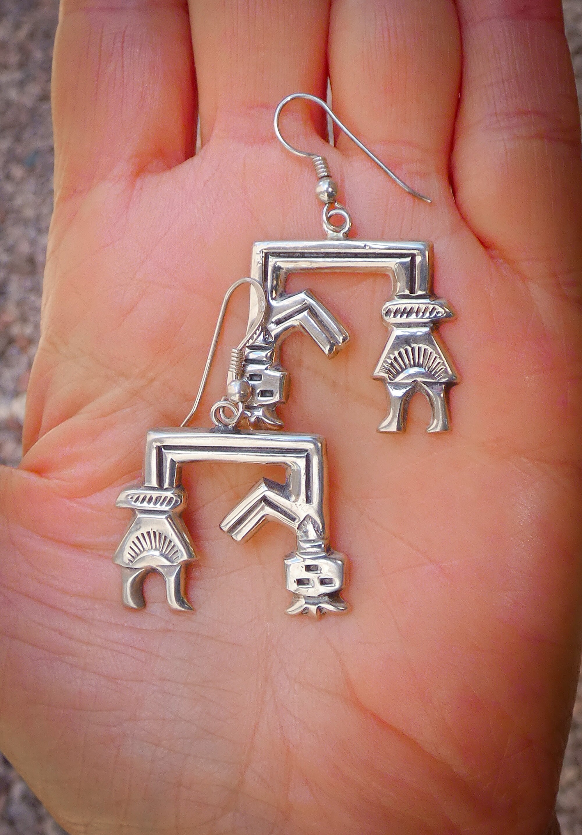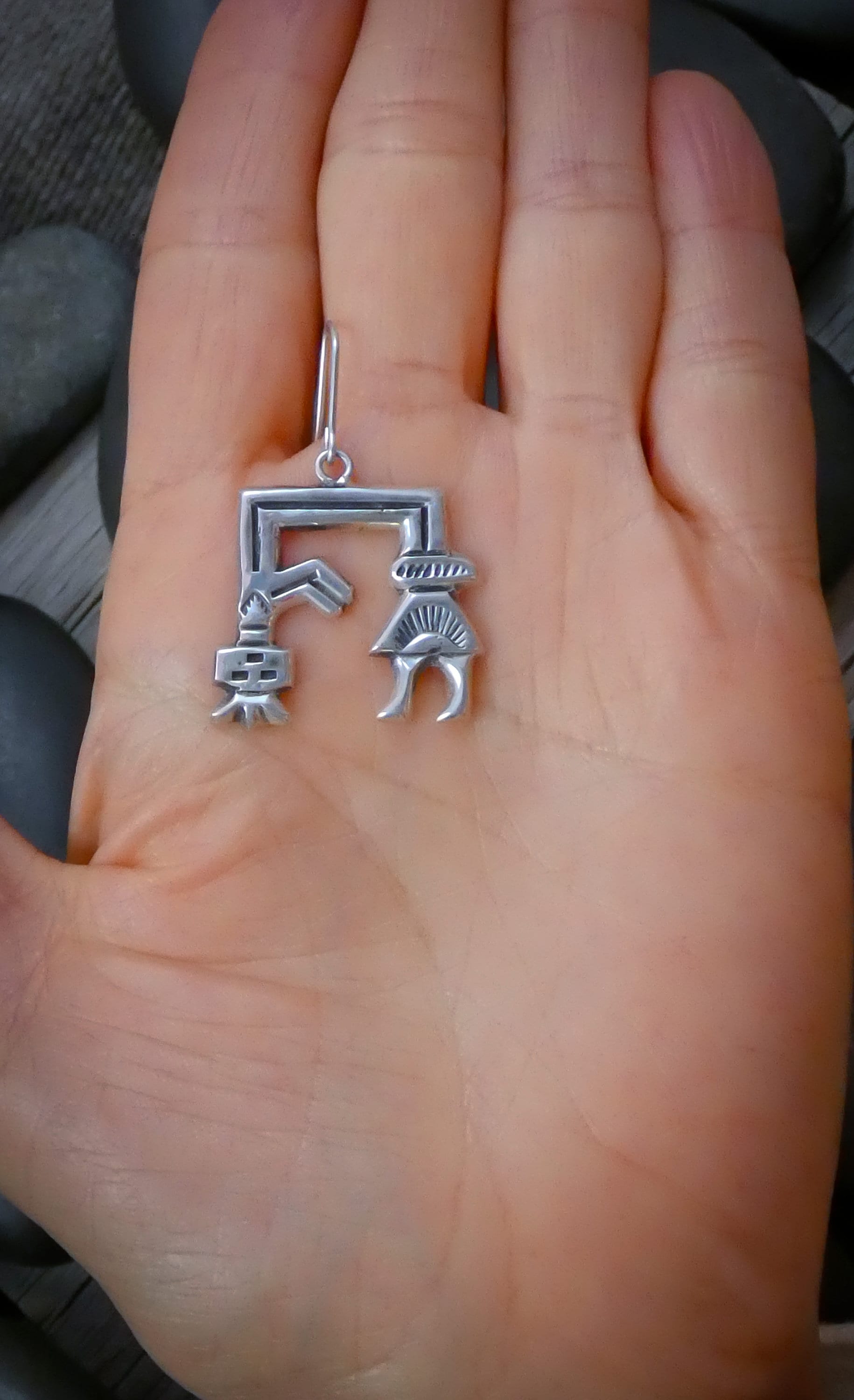 This is a great opportunity to own such fun yet historical jewelry! These earrings feature a design not normally seen. The Sterling Silver is hand-tooled into a Rainbow Dancer Yei design. The Navajo Yei spirits, control elements like rain, snow, wind, and sun. Show off your unique kachina collection with this pin!