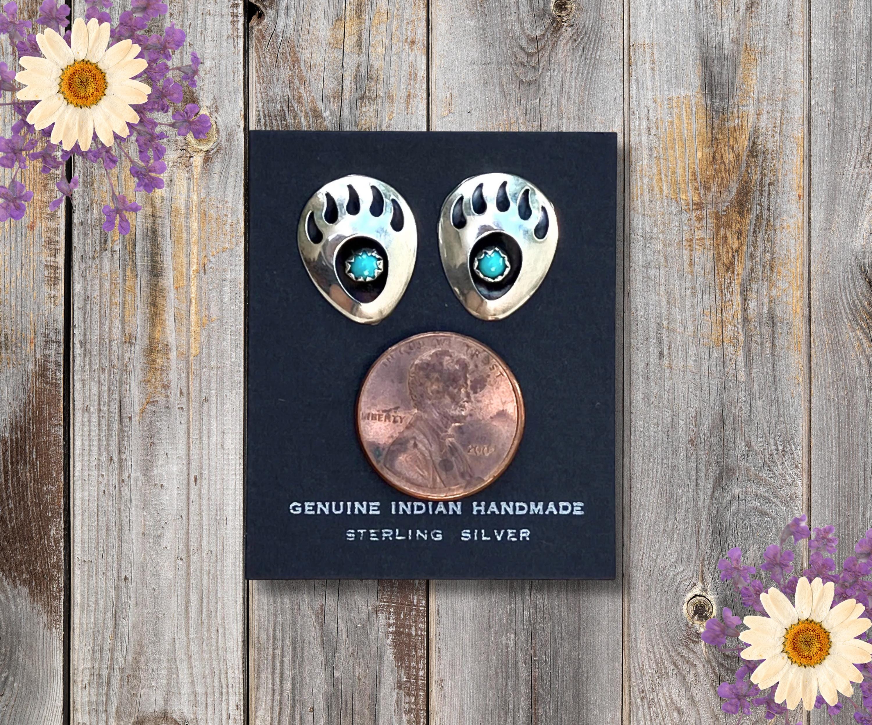 This vintage Navajo shadow box 9 piece necklace and matching post earrings offers a signature touch of Add some Navajo culture to your wardrobe. This set is lovingly handcrafted with sterling silver and Turquoise in a shadow box setting. The bear paw is found in many Native American works of art, and is seen as a symbol of strength and healing. This will be a treasured accessory, very traditional and beautifully handcrafted. This is a signature piece and you will make a statement wearing this Southwestern necklace!