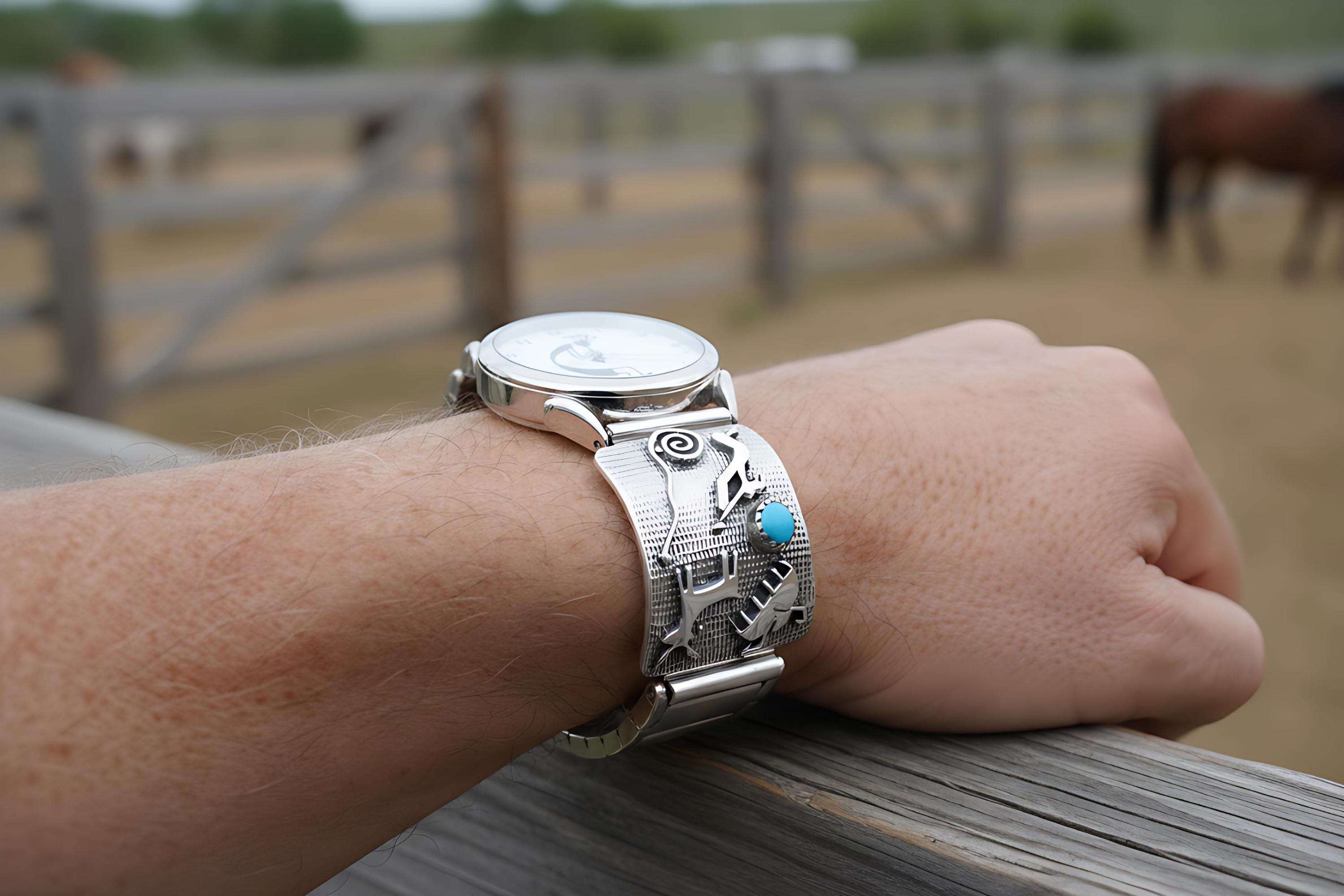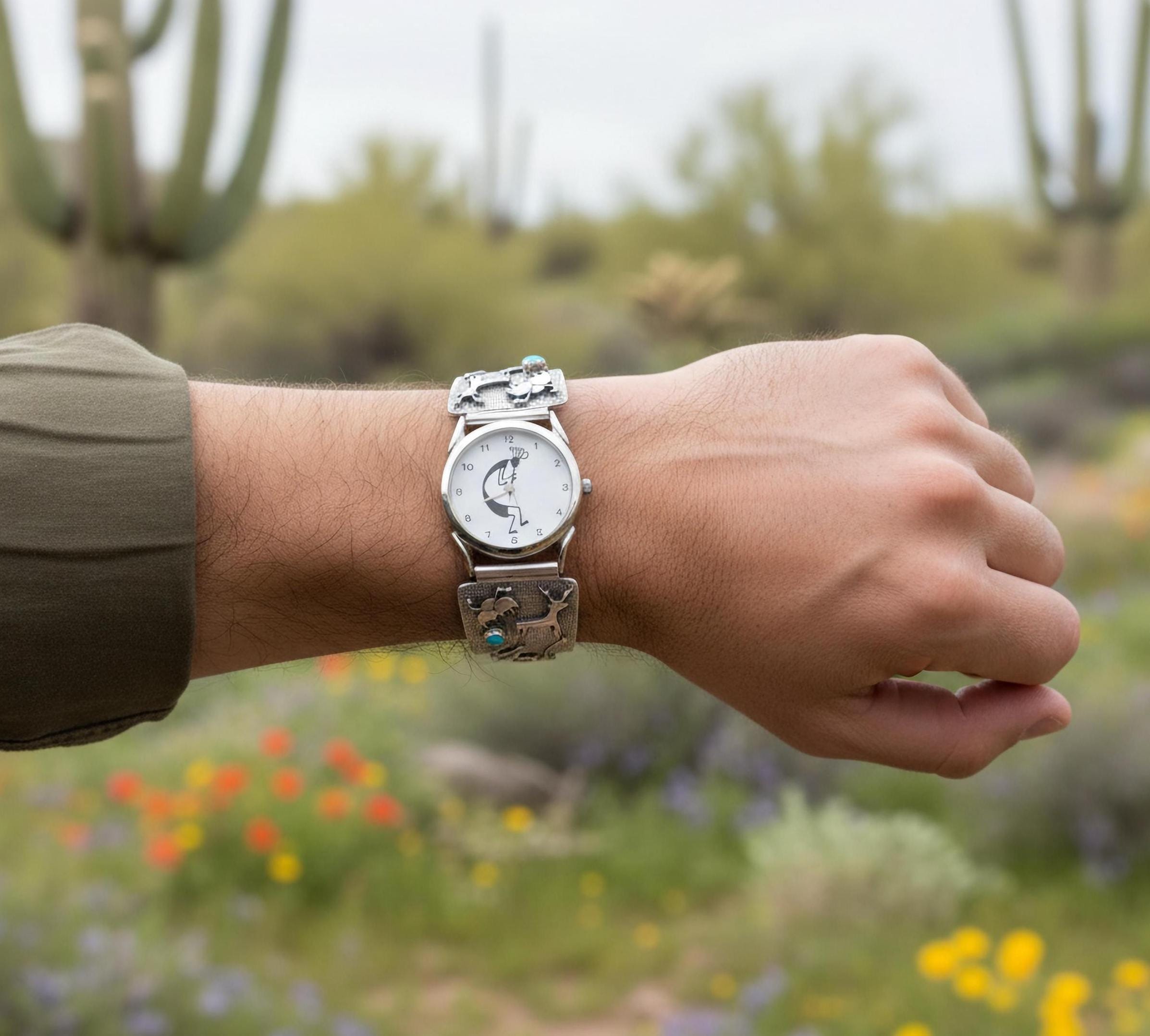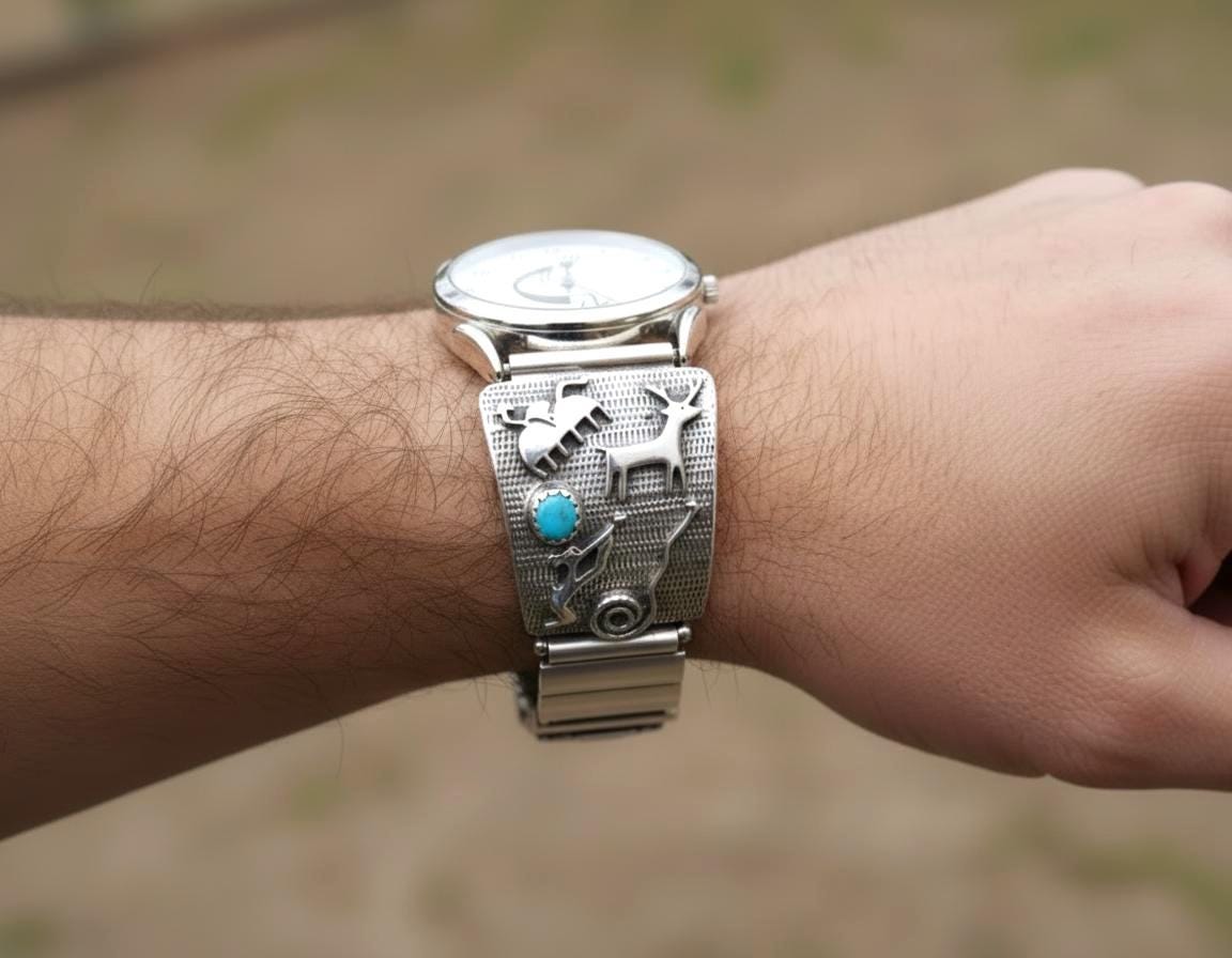 Handsome and traditional, this is the perfect piece for you. As you can see, the detail is amazing! This men's Petroglyph Cave Art watches are wonderful examples of Native American tradition and culture. Handcrafted from Sterling Silver into an expertly hand-tooled design and set with a Turquoise stone on each tip. The Silver detail of this watch is amazing! The clean and bold work wonderfully capture detail of the cave art. Perfect gift to yourself or someone special!