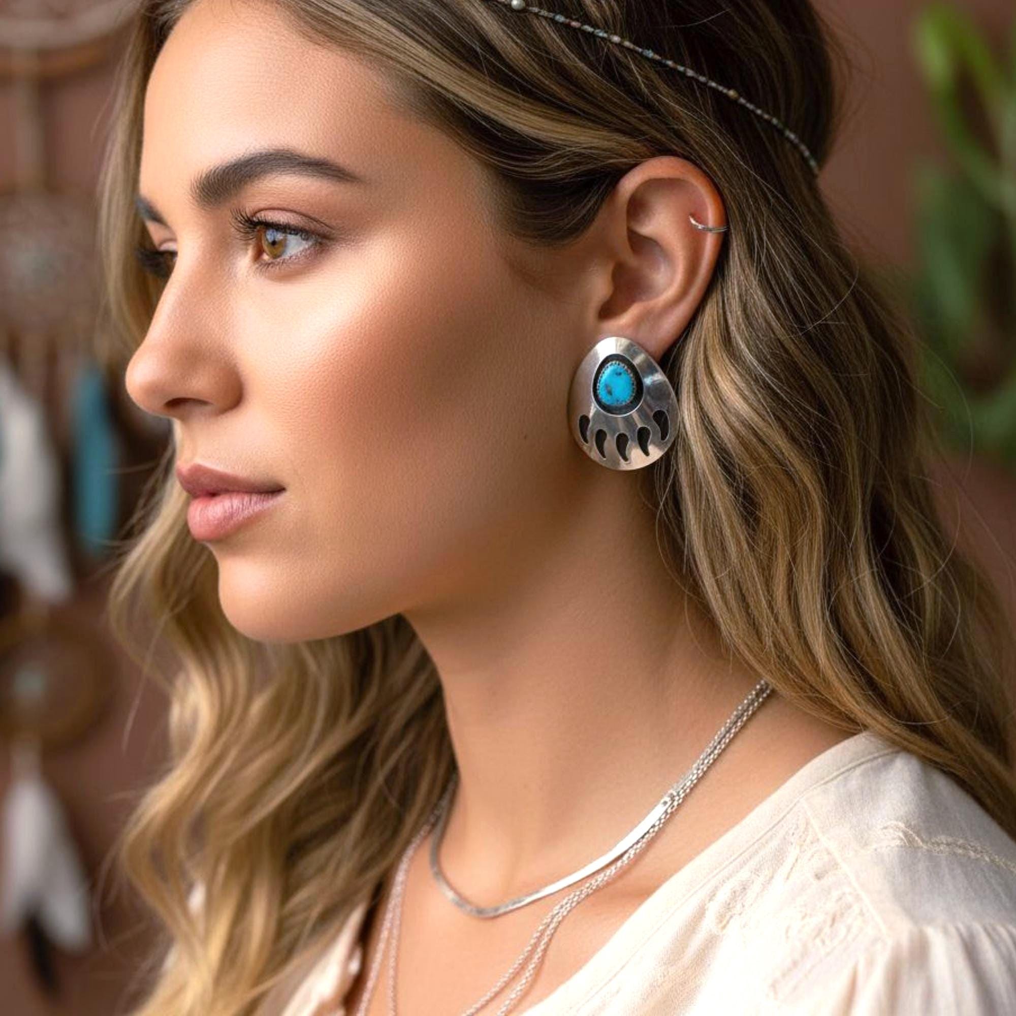 These vintage Native American earrings offer a signature touch of Navajo culture to your wardrobe. Handmade from Sterling Silver and Turquoise, these earrings are traditional and beautifully crafted with a shadow box bear paw design.