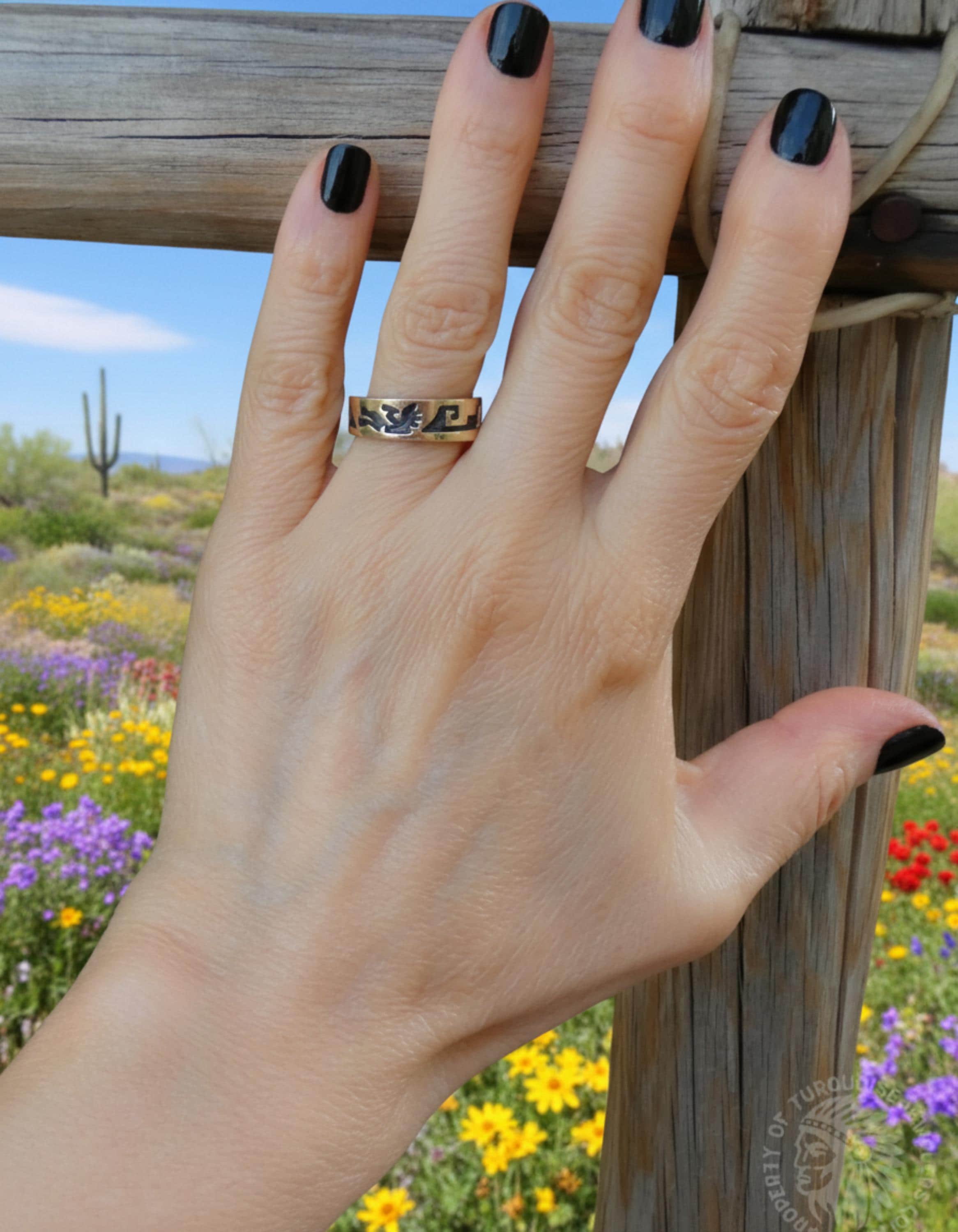 This band is overlaid with 14k gold with Kokopelli petroglyphs and whirling log symbol designs around 3/4 of the band. Perfect stacking or for an anniversary or wedding band.