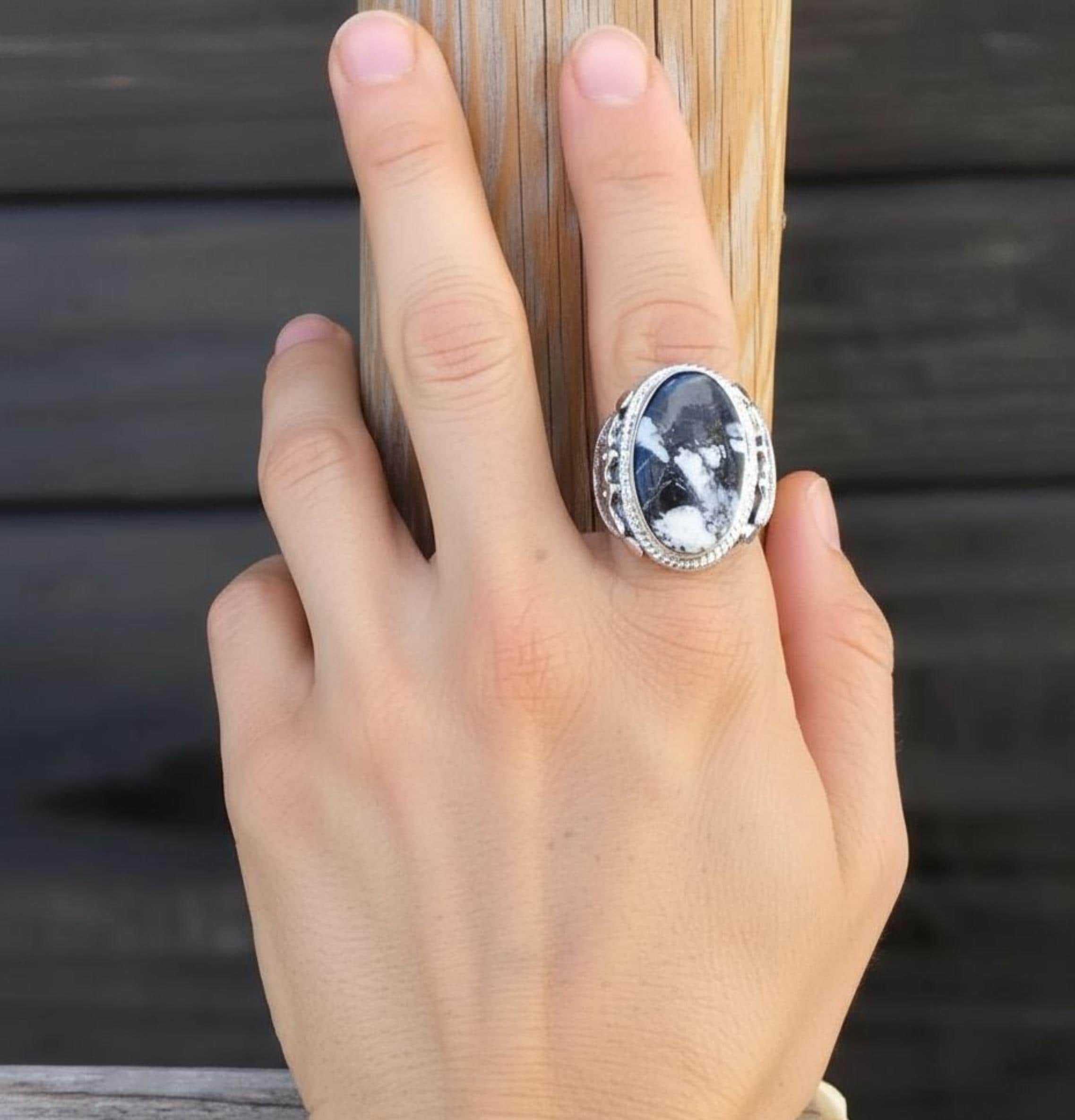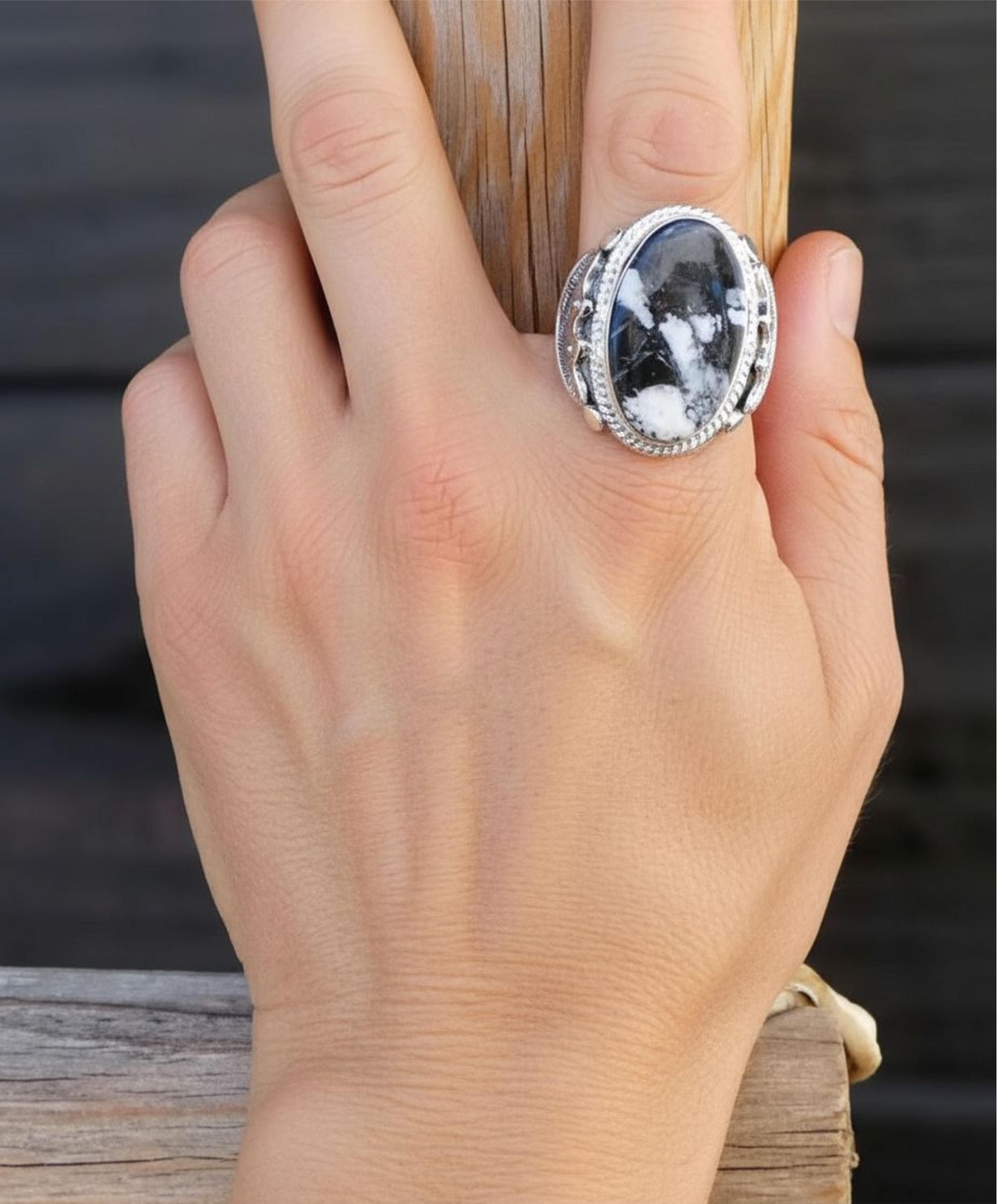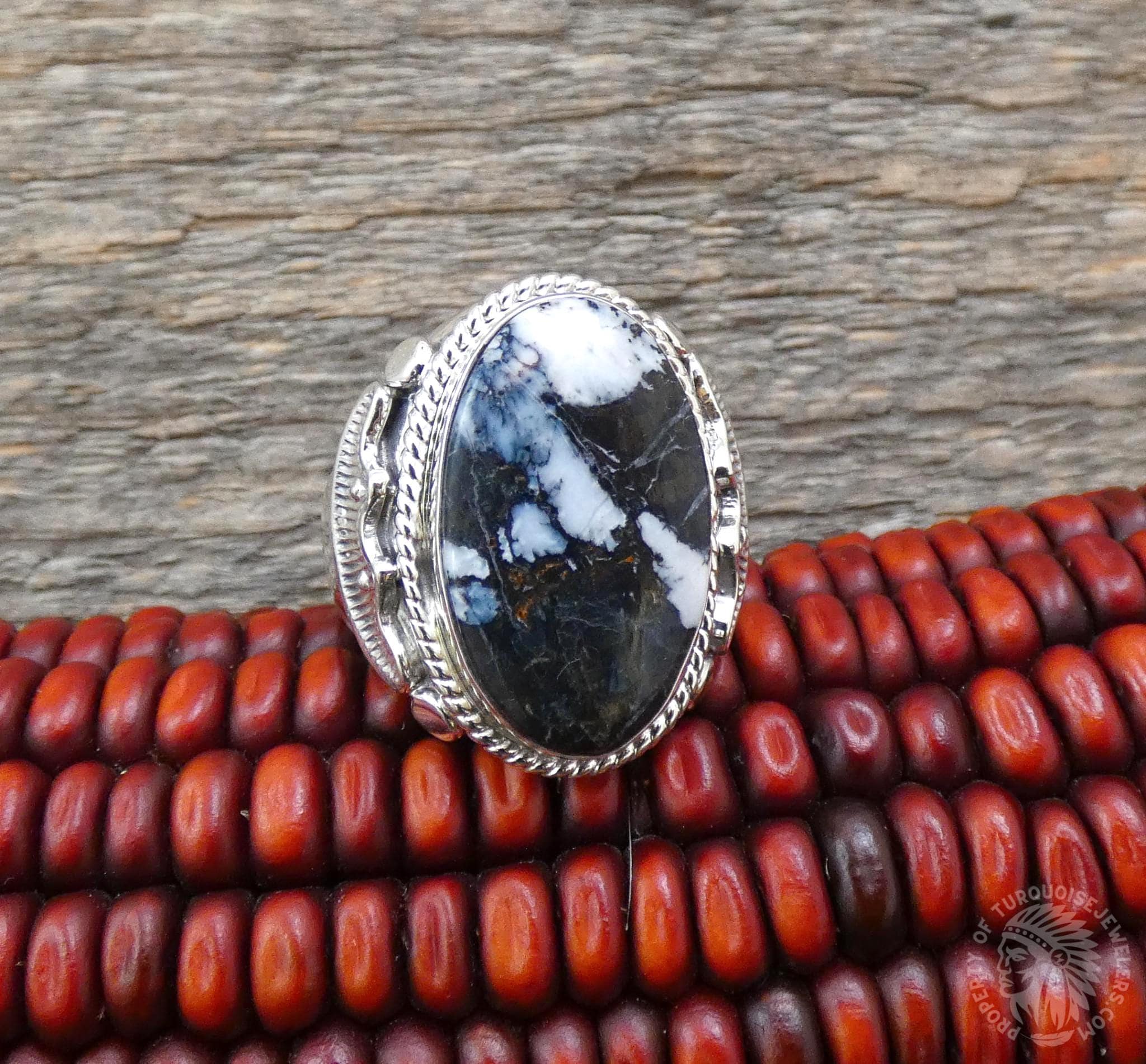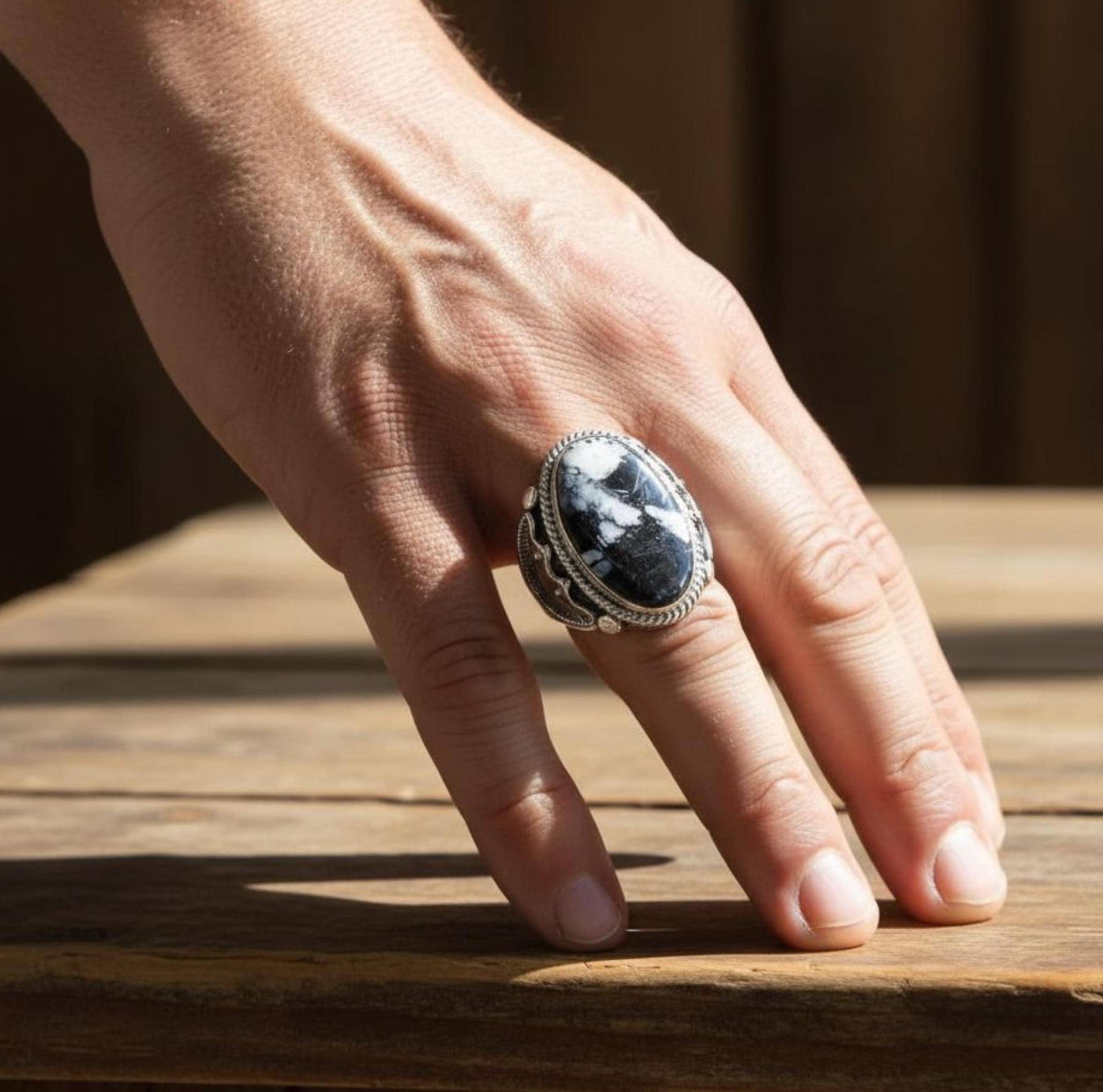 Traditional Native American jewelry making is one of the most recognizable and respected art-forms in the modern world. This handmade Men's ring will become your signature! It features a striking, rare, White Buffalo setting with an stunning hand-tooled border. This gemstone is smooth white in color and is marked with bold black matrix into an oval design. This is that go to accessory that you can wear often due to the neutral nature of the stone.