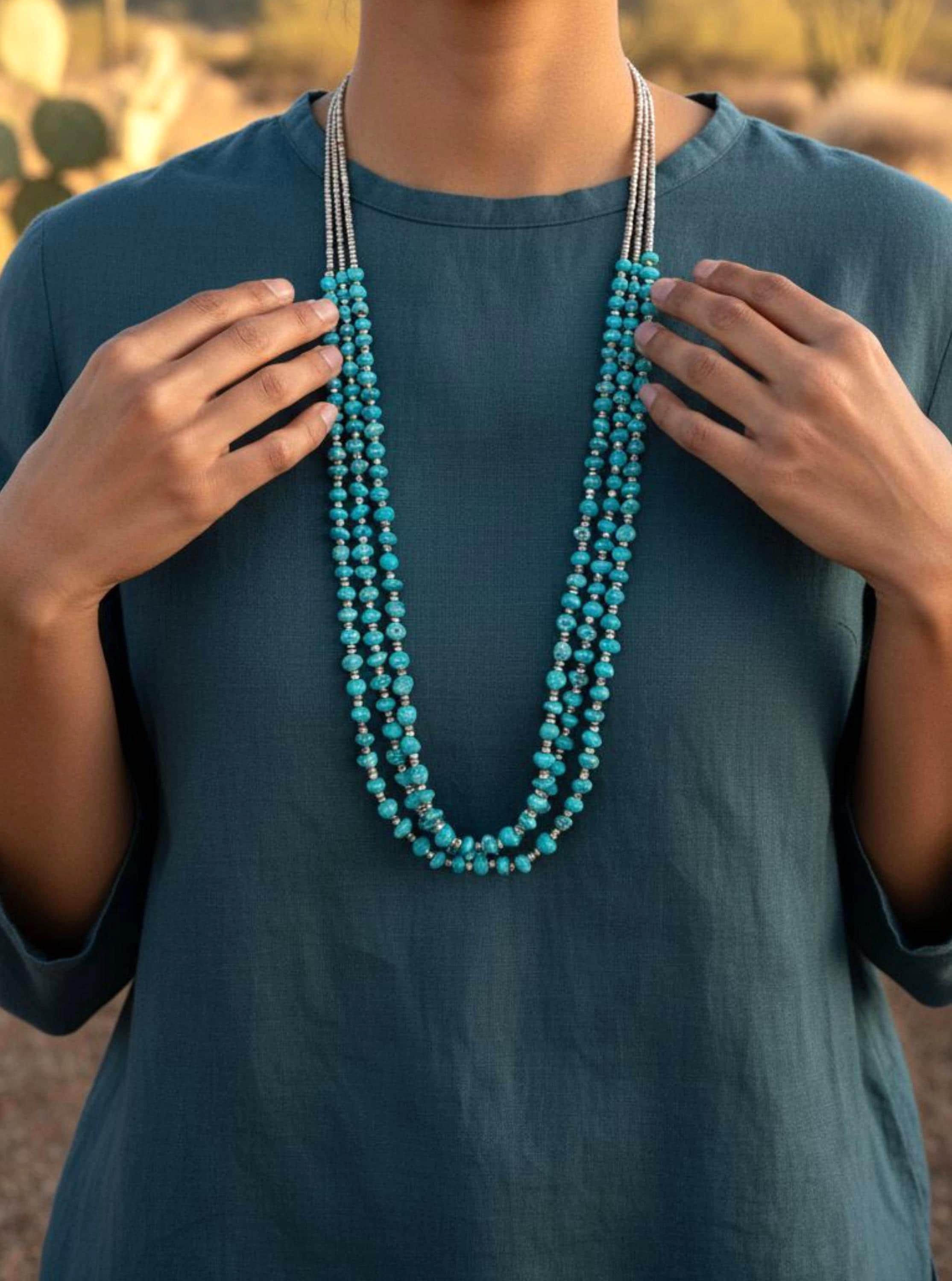 This vintage Santo Domingo necklace is that vintage wardrobe accessory that you've been searching for. It is handcrafted with 3 strands of beautiful vivid Turquoise stones and pin shell. This is perfect for dressing up any outfit! Native American handmade.