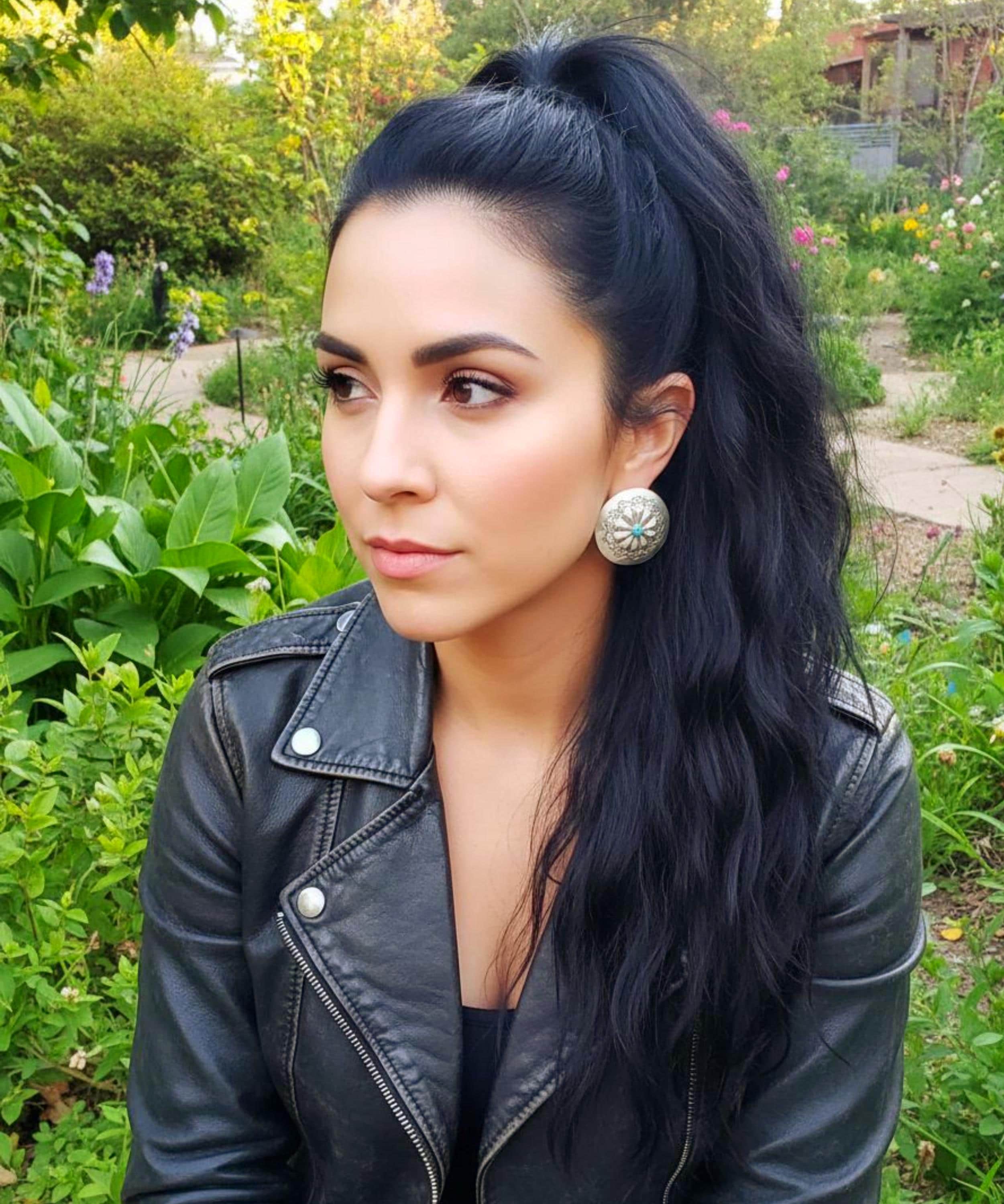 These pierced earrings are handcrafted with Sterling Silver & Turquoise into a "reposé" Concho style design, a very traditional Navajo artform. The fine craftsmanship of these Concho-style earrings is evident through the stamp and reposé (pop out) work showing the artist’s eye for detail! These eye-catching earrings would make a unique addition to any Native American jewelry collection.