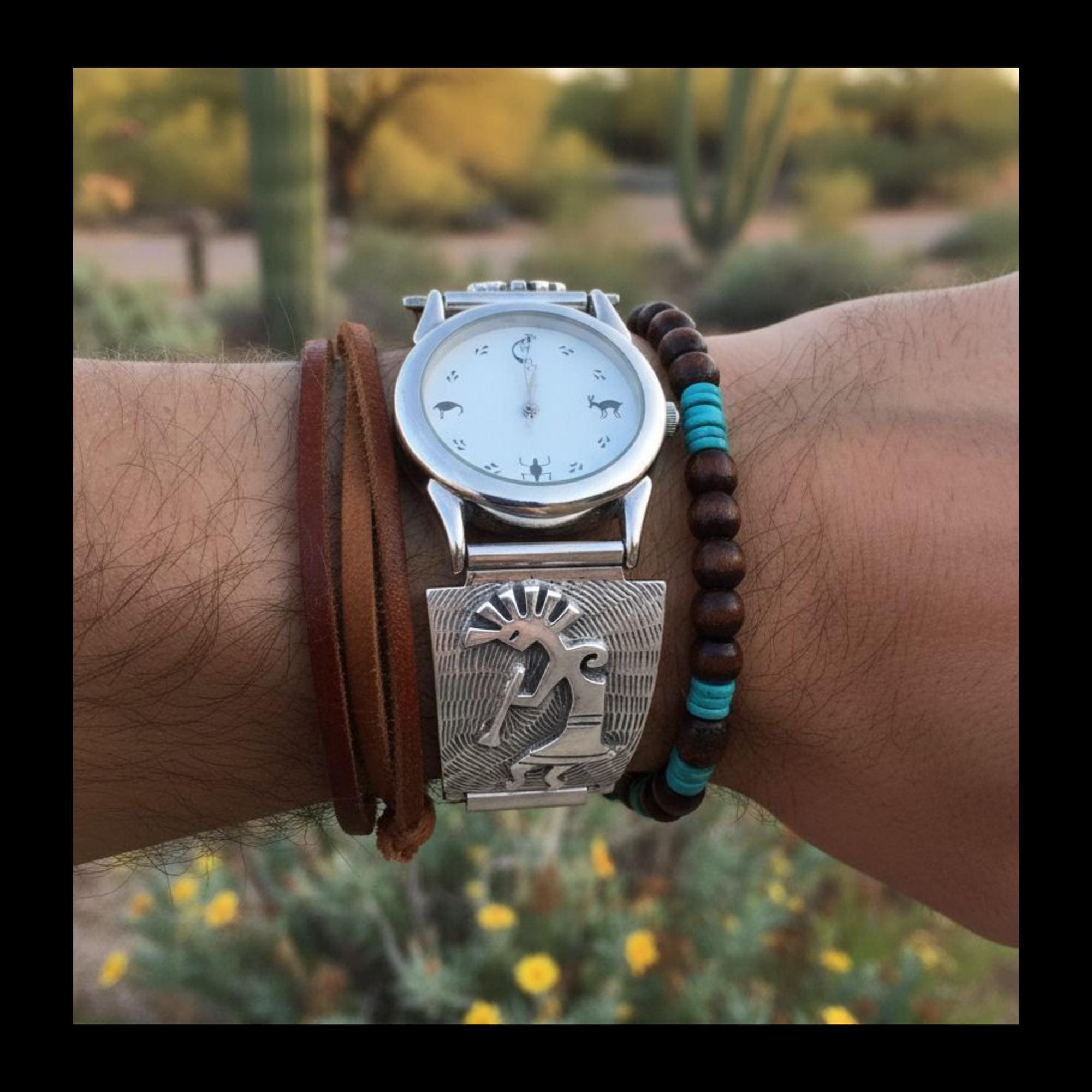 Handsome and traditional, this is the perfect piece for you. As you can see, the detail is amazing! This men's Kokopelli watch is a wonderful example of Native American tradition and culture. It is handcrafted from Sterling Silver into an overlay design. The image of the beloved Kokopelli has been carefully and meticulously detailed in this remarkable piece of jewelry. Perfect gift to yourself or someone special!