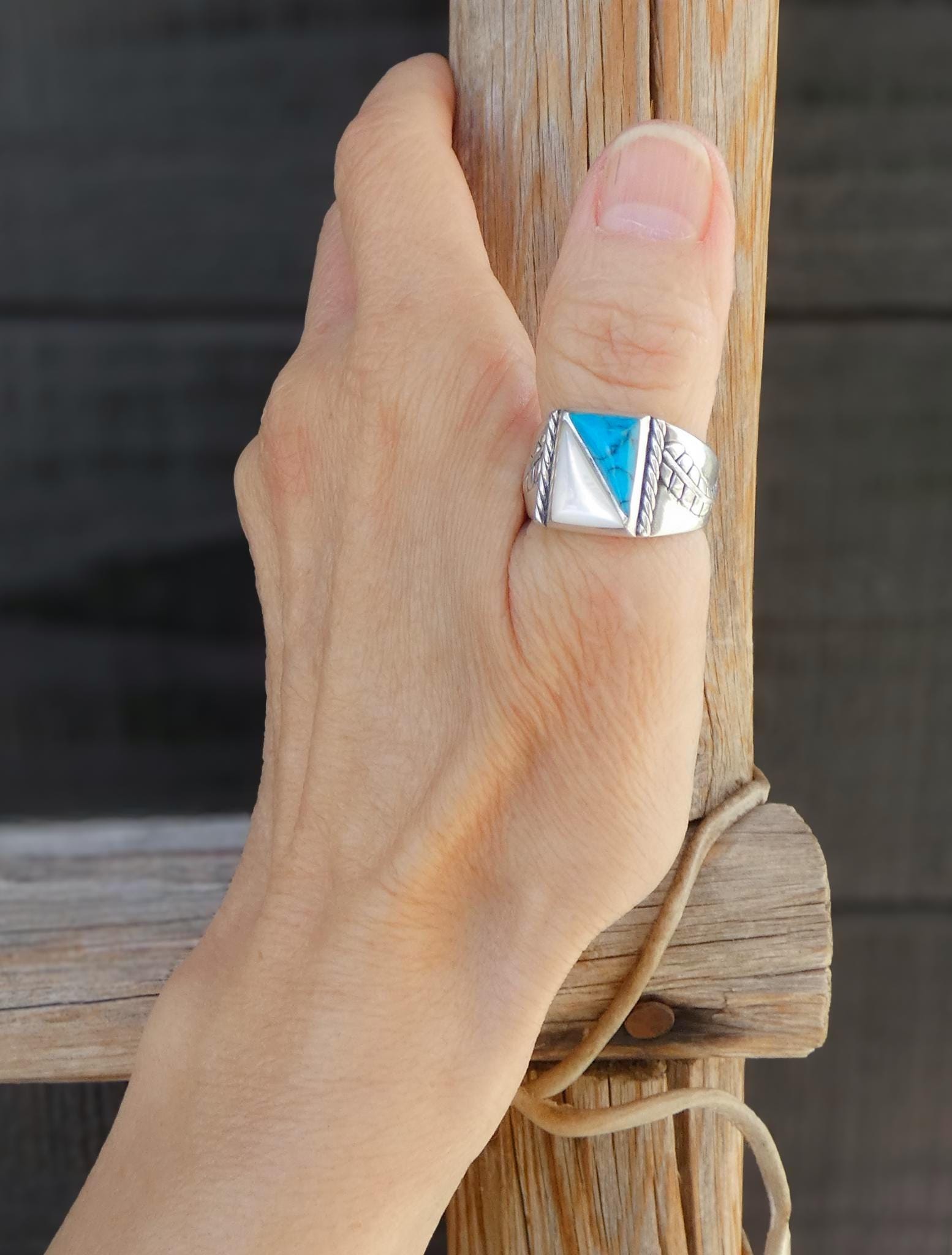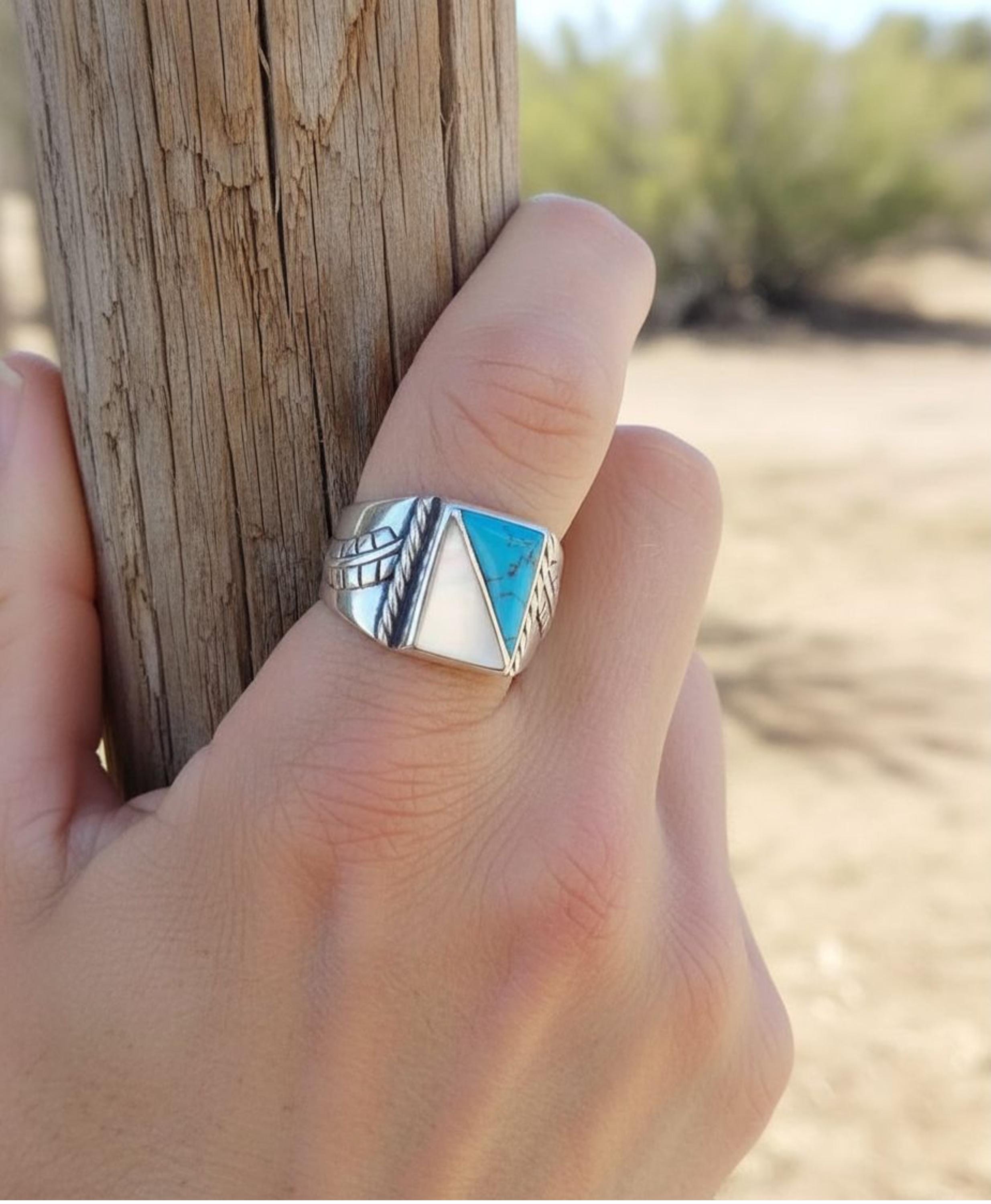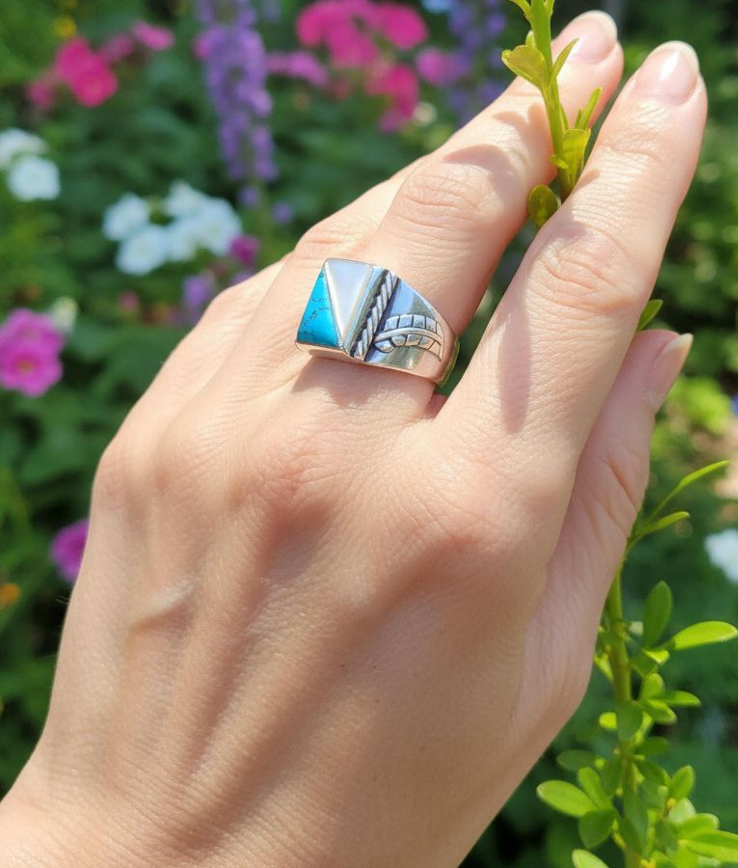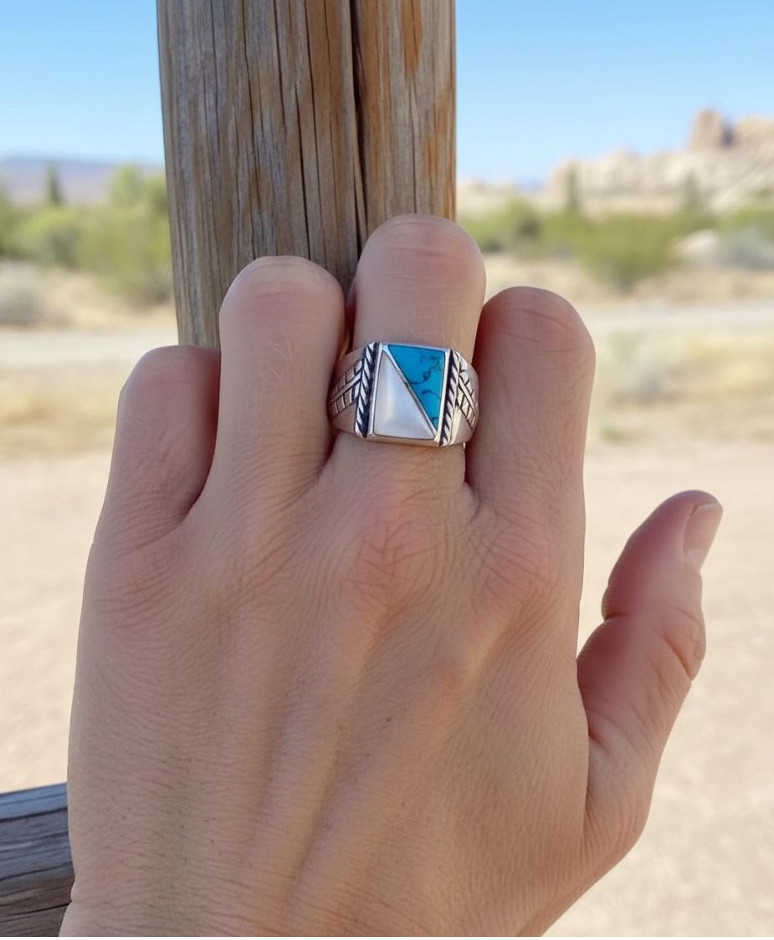 This handsome Sterling Silver and Turquoise ring is skillfully made with turquoise and mother of pearl. The silver work features leaves on the profile of the shank, giving the illusion that it is radiating away from the face, descending down the ring. This is the perfect gift for that special someone! Native American Navajo Handcrafted in the 80's. Vintage.