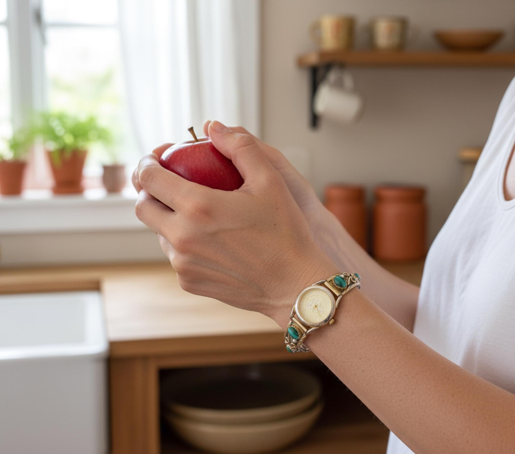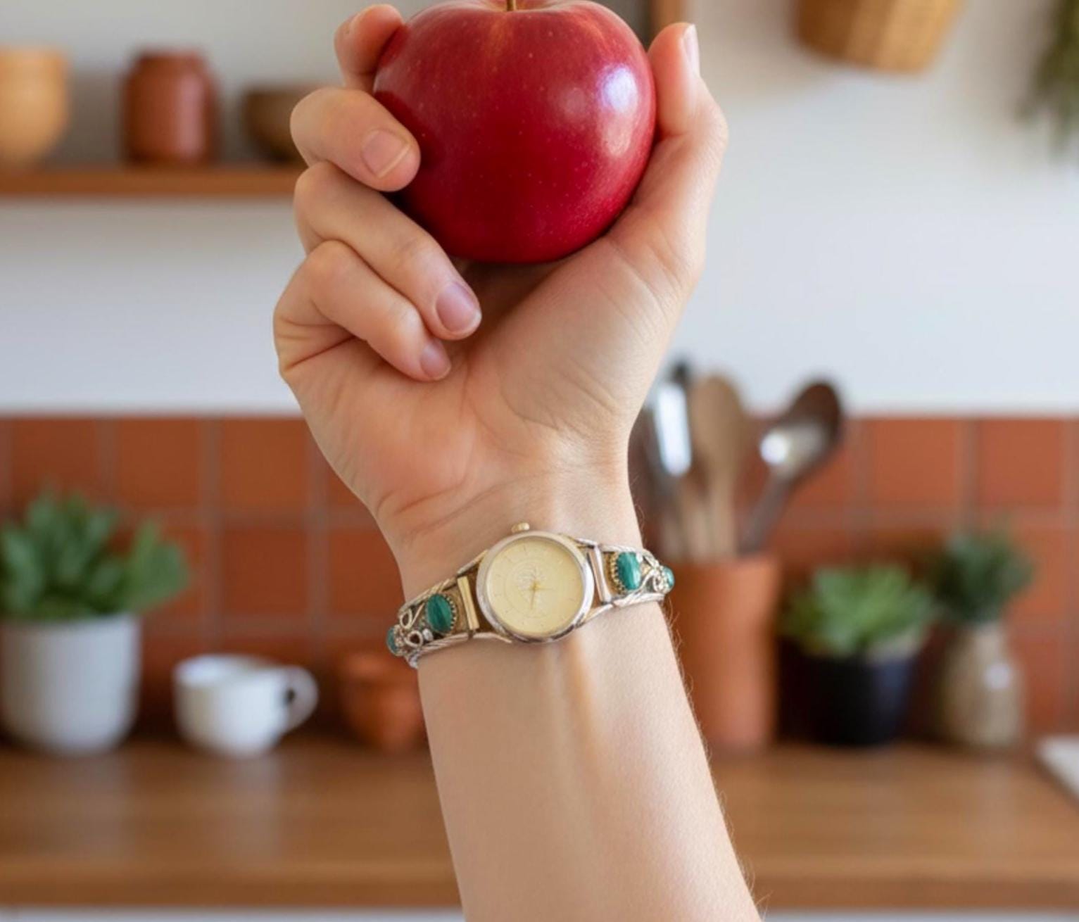 This women's vintage watch is a wonderful example of Native American tradition and culture. The intricate detail is amazing and completely handcrafted from 12KGF and Sterling Silver. On each side, the tips feature gold fill leaves, background and scroll work with malachite stones. Beautifully handcrafted in the traditional Navajo way.