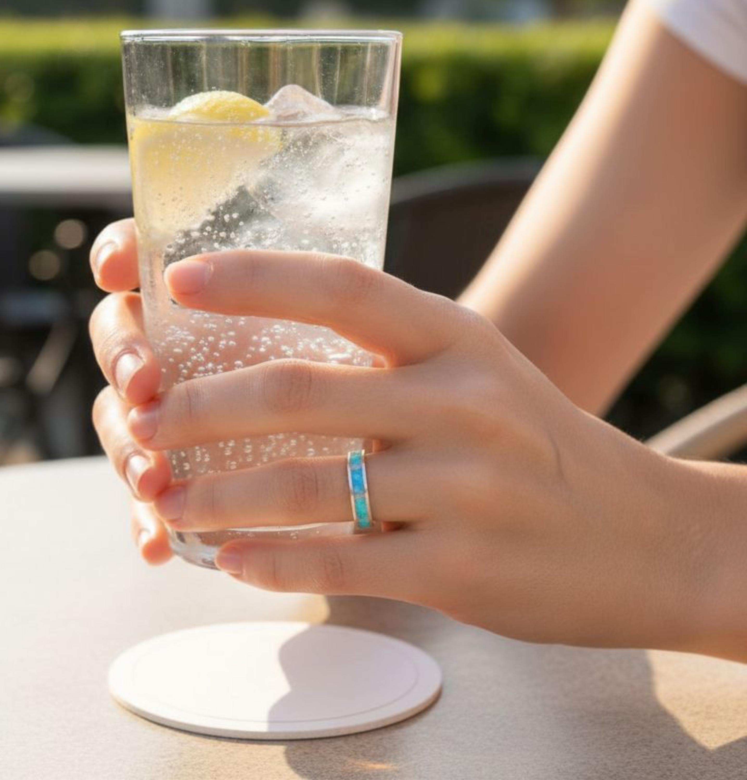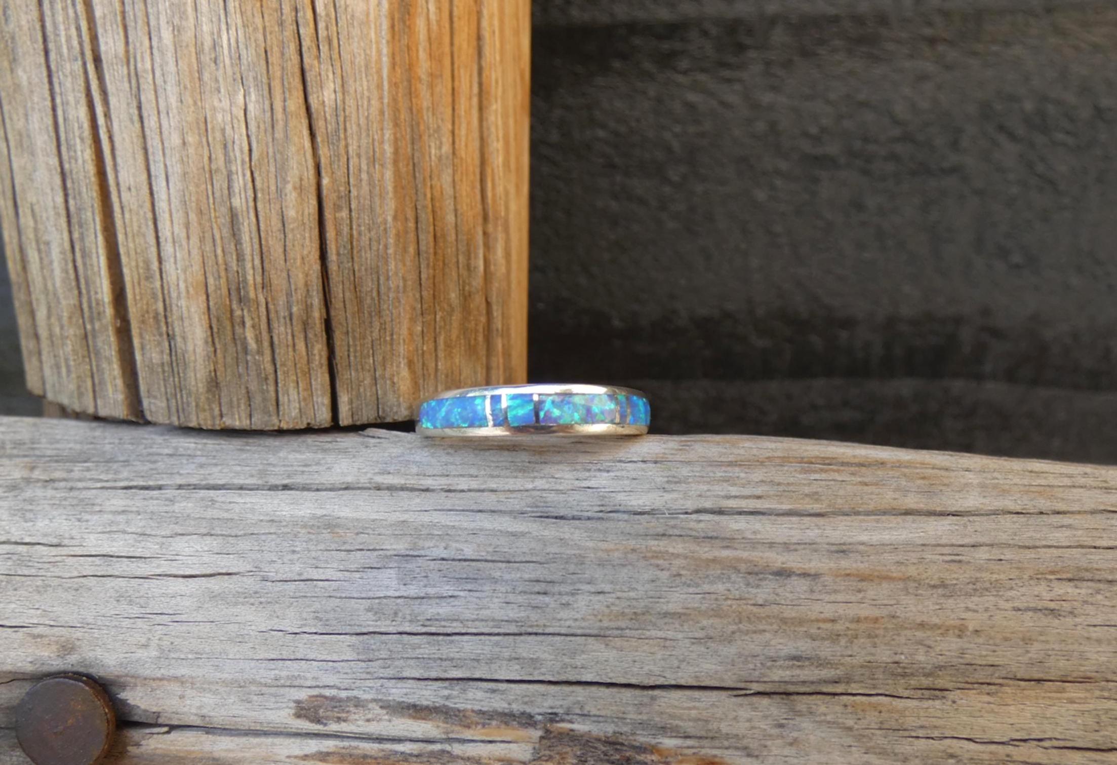 This Native American Navajo ring is handcrafted with Sterling Silver and features blue opal (lab) inlaid stones. Perfect for stacking with other rings and the sleek and smooth inlaid design is a creative element with its own unique flair! This ring has all the same precision and delicacy that the Navajo silversmiths are known for.