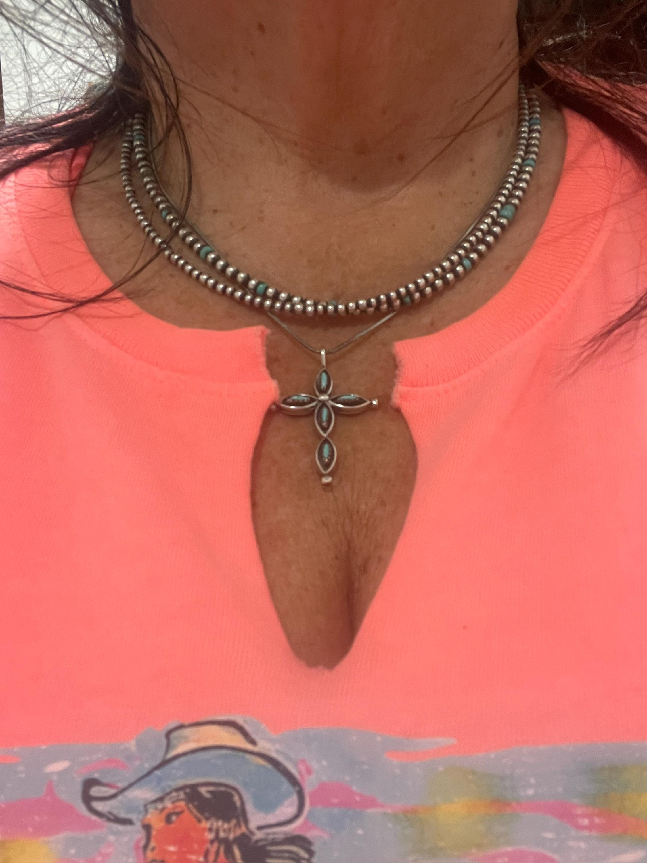 This Native American Zuni Cross Pendant is handcrafted with Sterling Silver and a bright shade of Turquoise on one side, and a vivid shade of red Coral on the reverse side. This special accessory will have a lot of meaning to the person who wears it. The styling is delicate, timeless and traditional; just what you expect from Native American Jewelry!