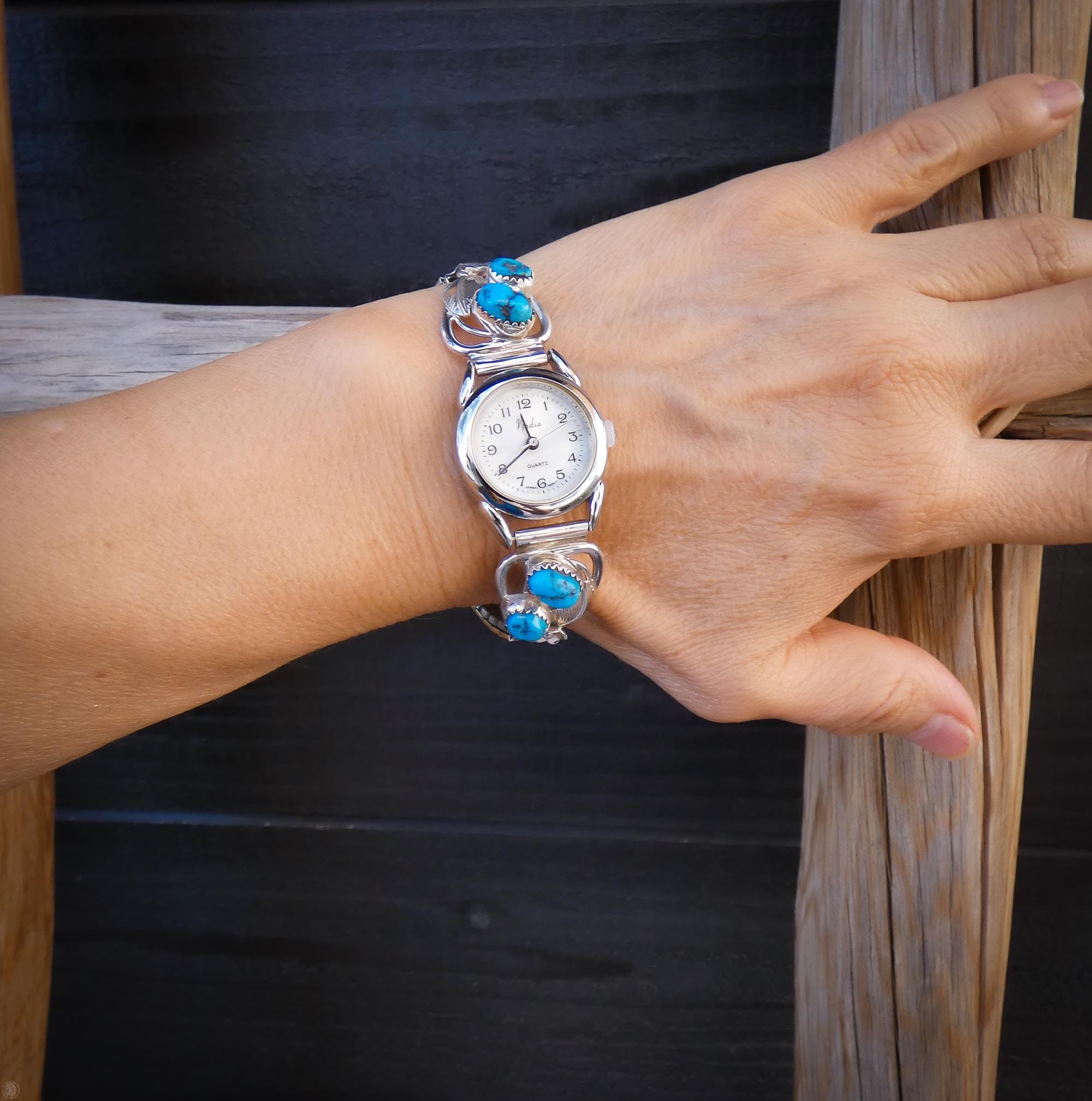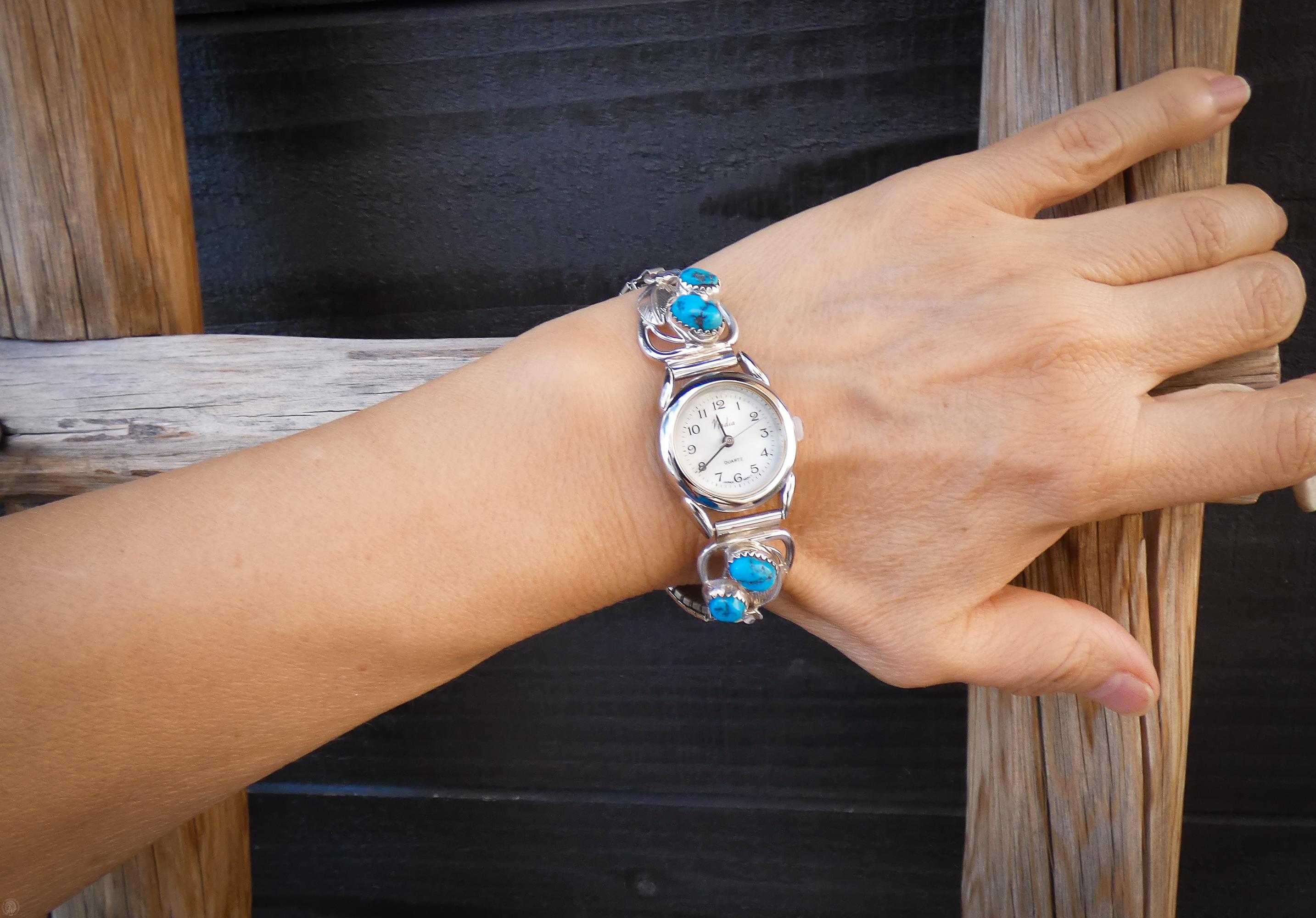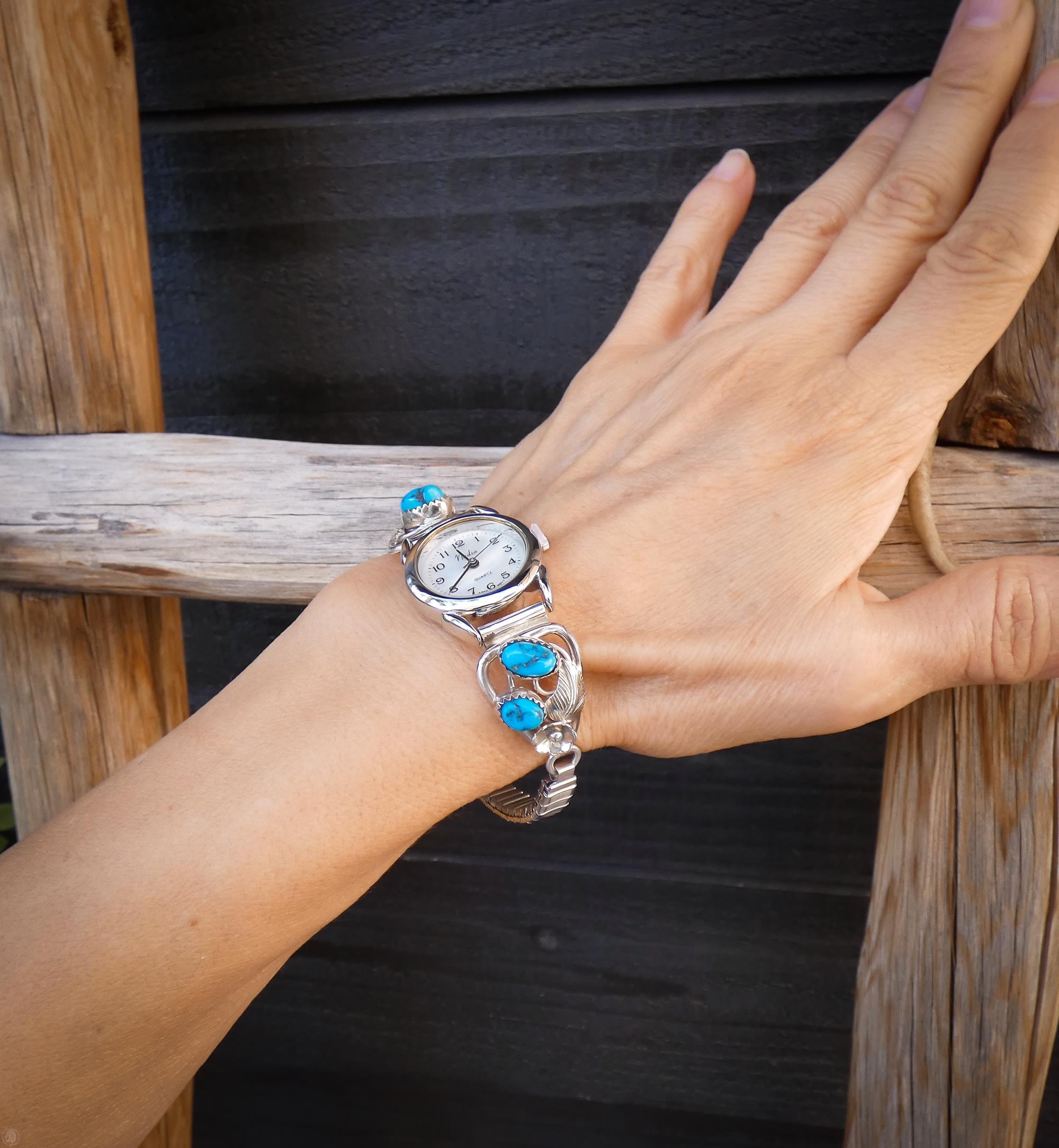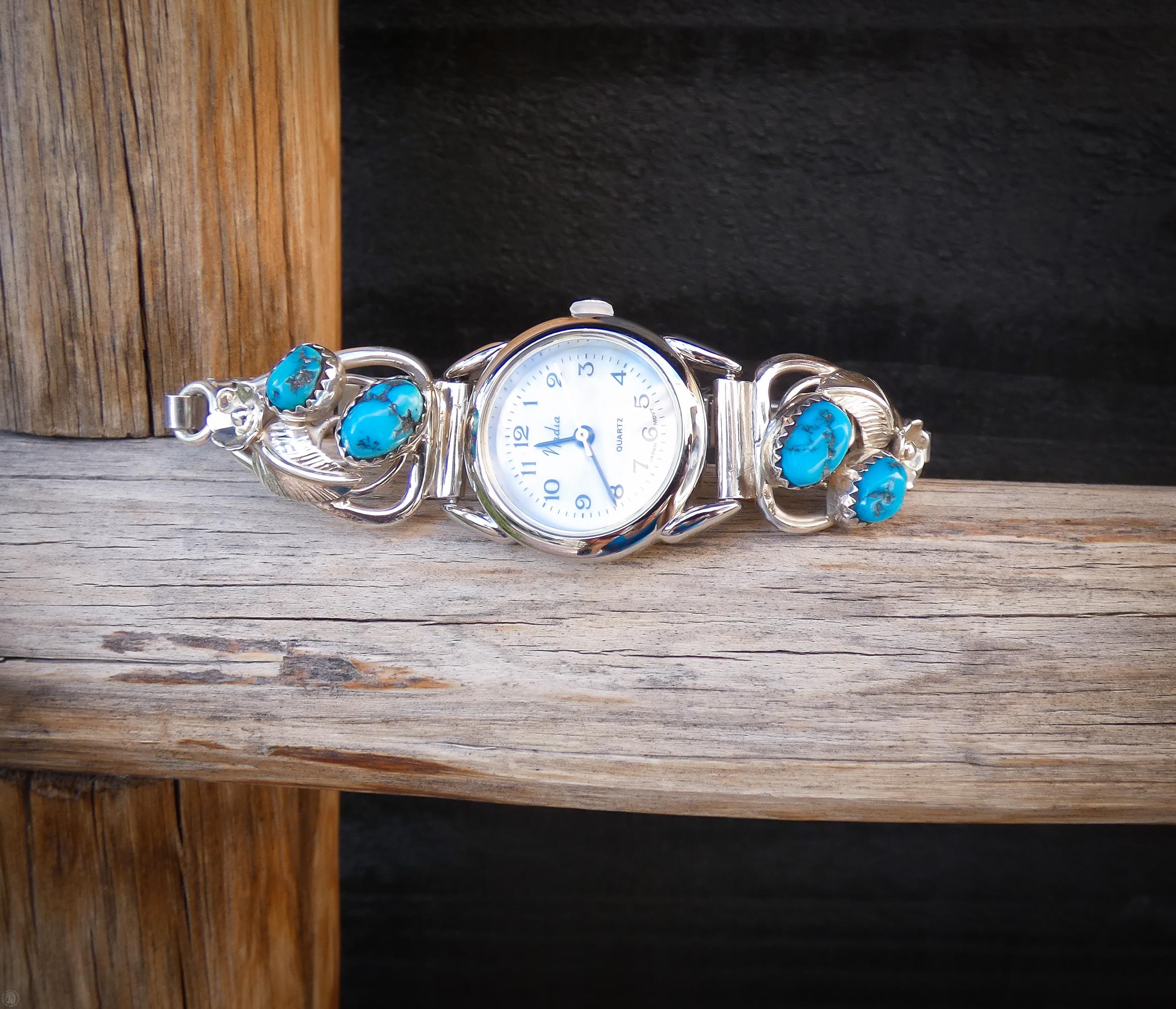 This gorgeous watch band is handcrafted from Sterling Silver with Turquoise stones beautifully set among the leaf and scroll work within the tips. The hand tooled tips are such a stunning example of Native American culture!