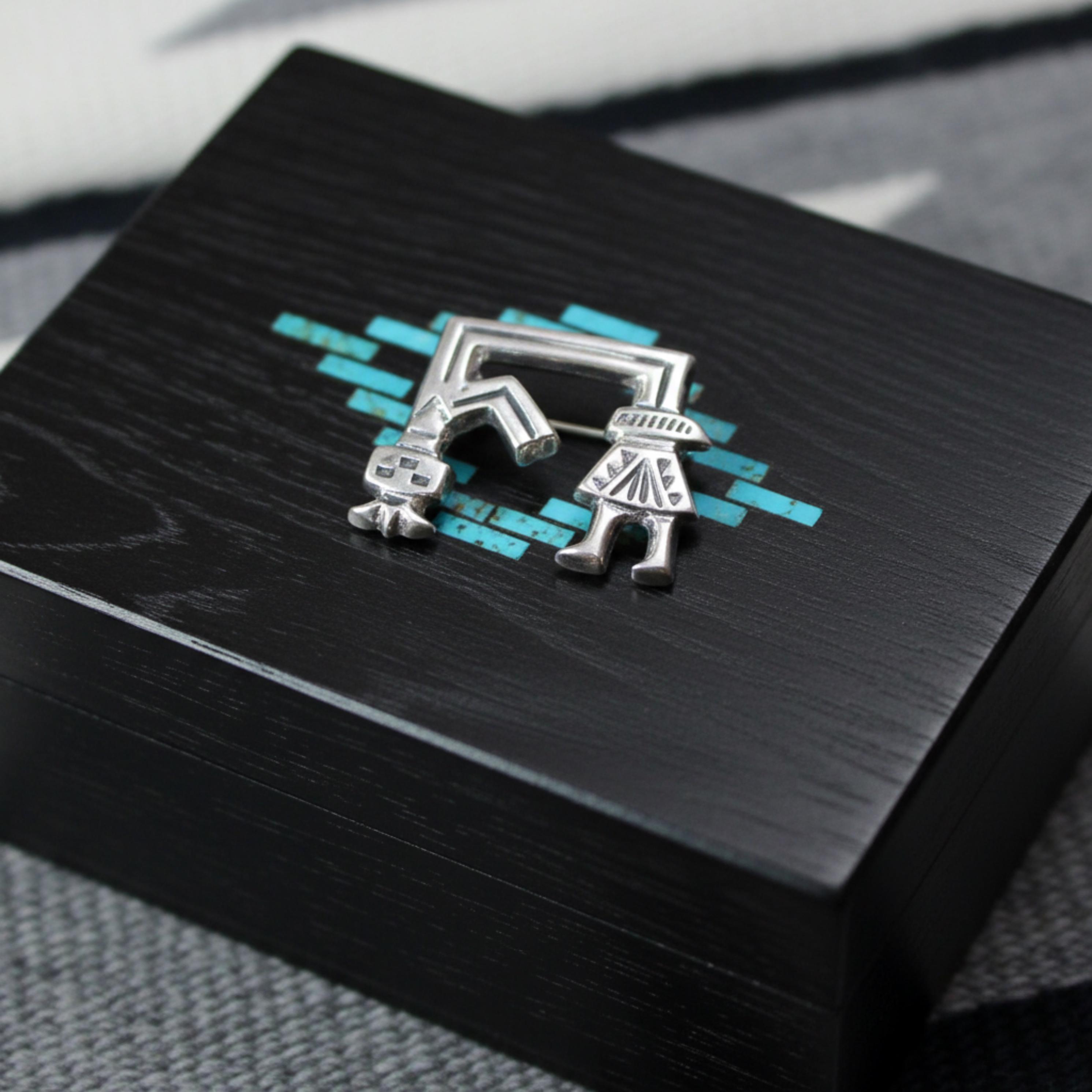 This is a great opportunity to buy such a fun piece! This pin features a special design unlike what you normally see. The Sterling Silver is hand-tooled into a Rainbow Yei design. The Navajo Yei spirits, control elements like: Rain, Snow, Wind and Sun. The Yei is also associated it with the Rainbow Goddess. Show off your unique style and start a conversation with this pin! This is a vintage piece.