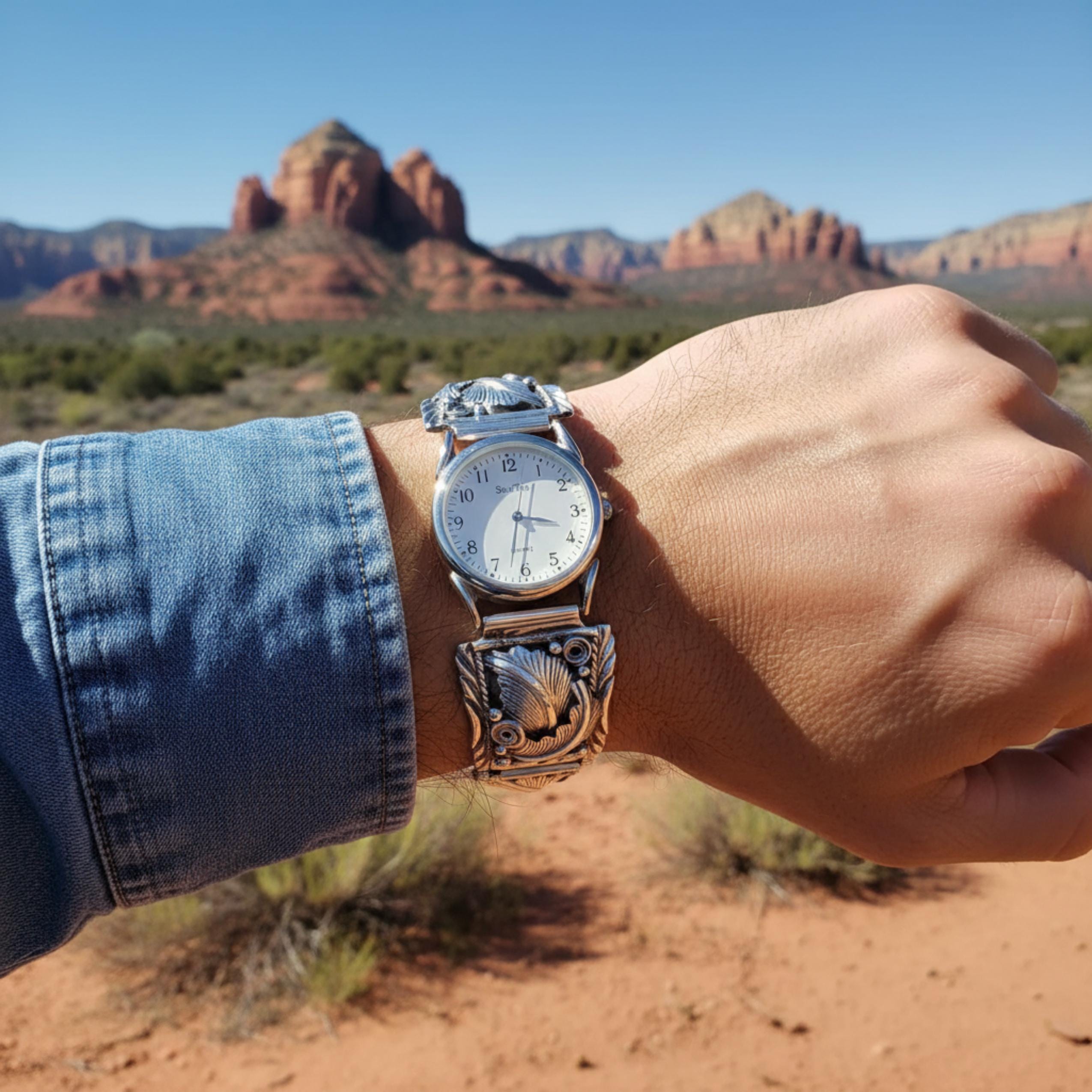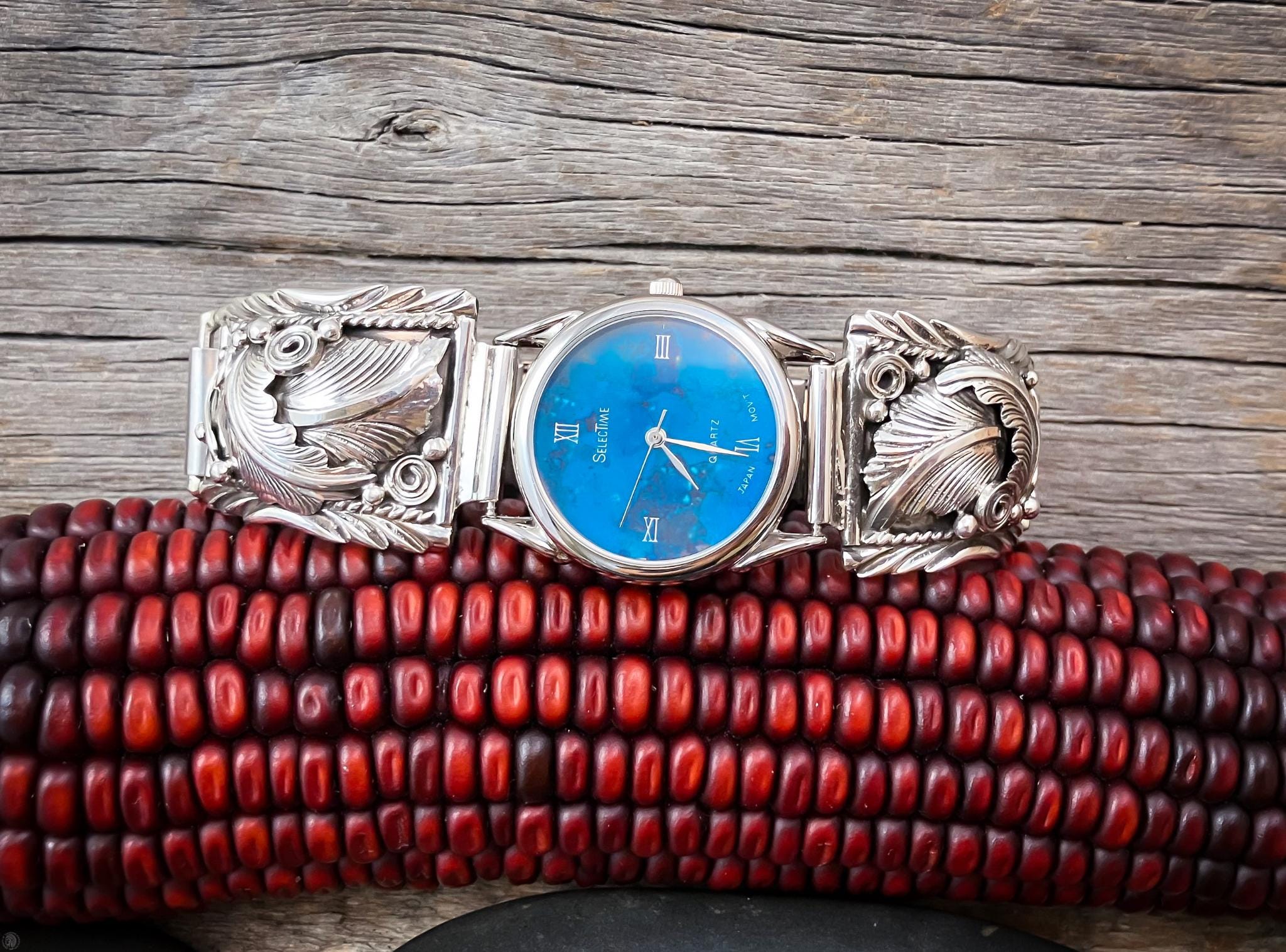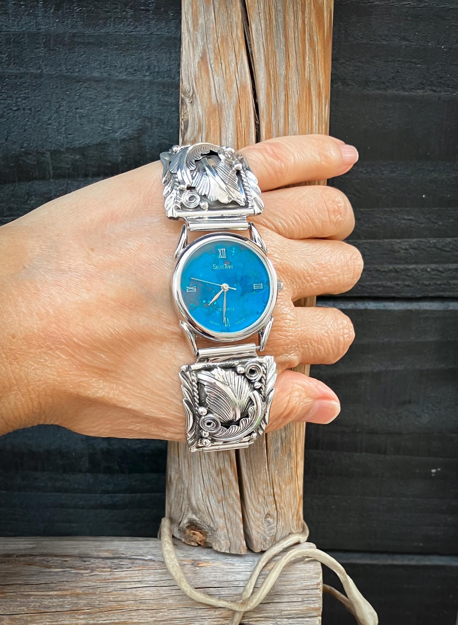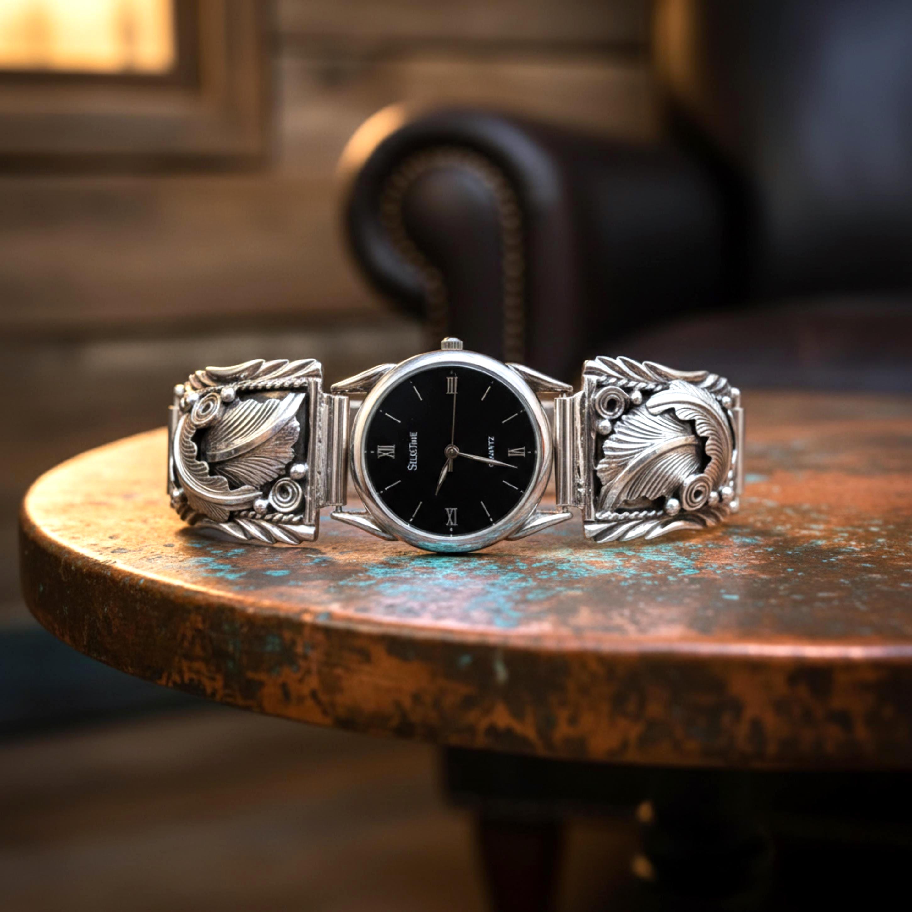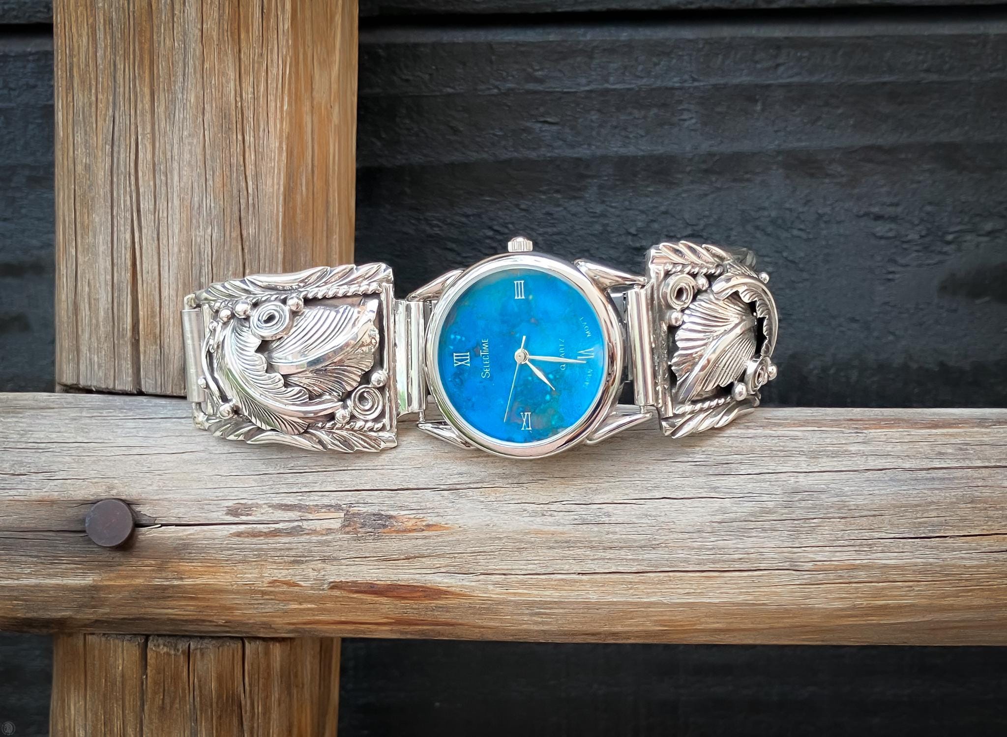 This is a beautiful vintage Navajo work of art handcrafted with Sterling Silver. The design of the watch tips is absolutely magnificent with expertly hand-tooled leaf and scroll work. Please look closely at the details because this is a one-of-a-kind example of Native American artistry, no longer being made. This is the perfect gift to yourself or someone special.