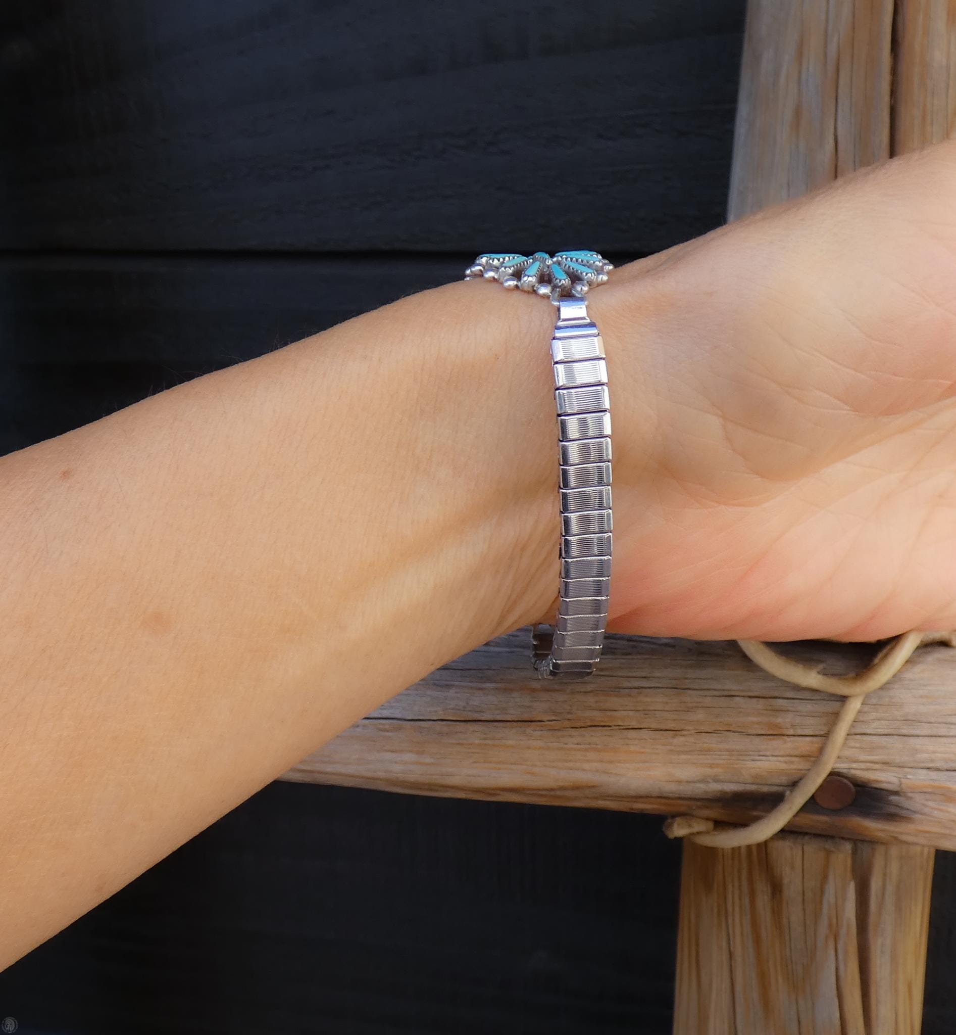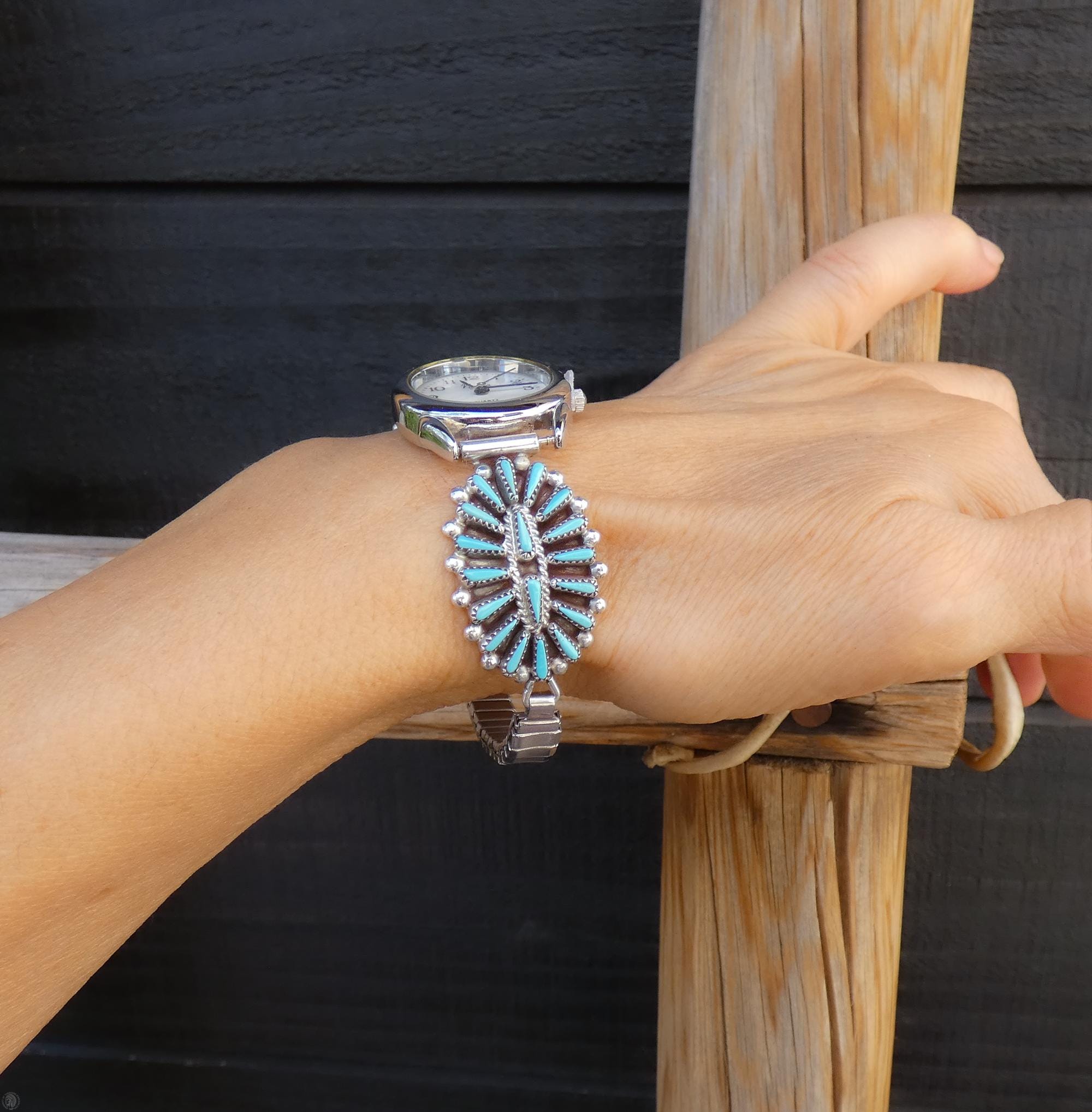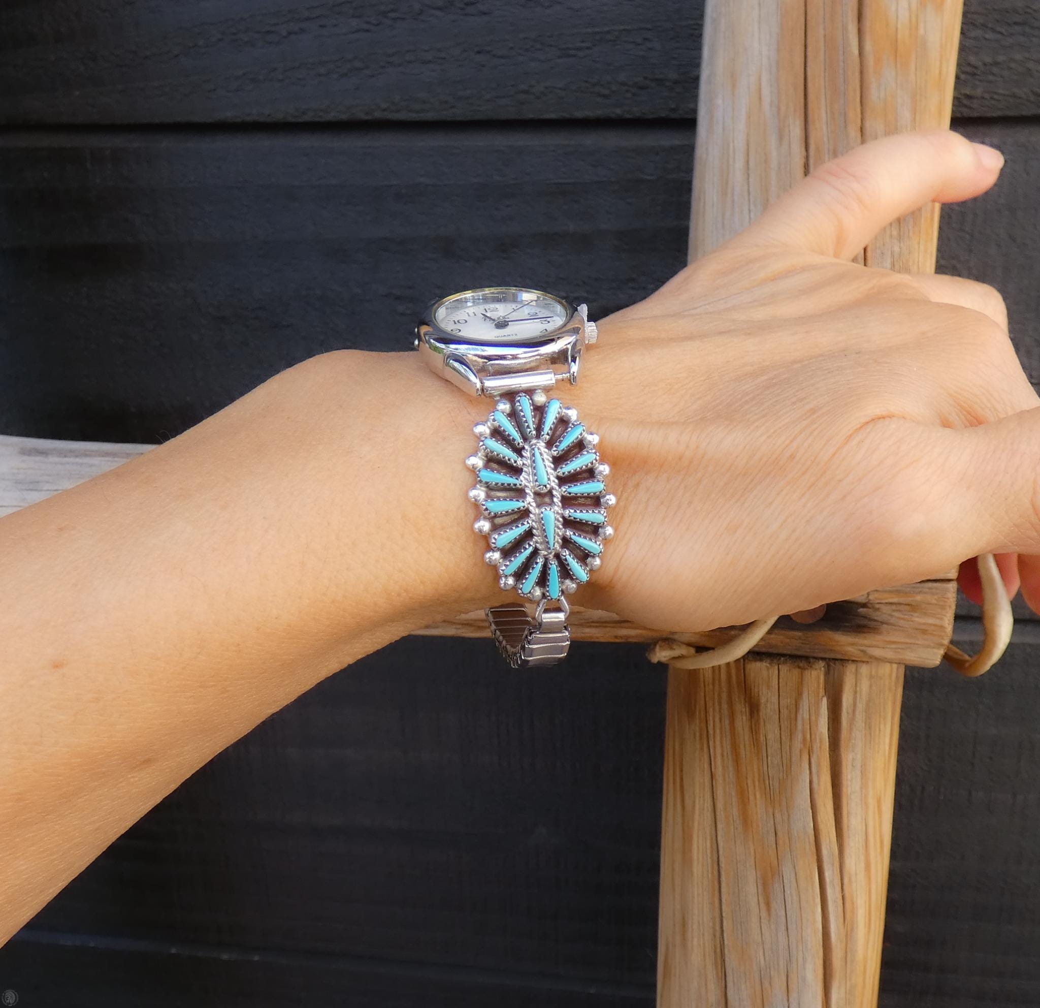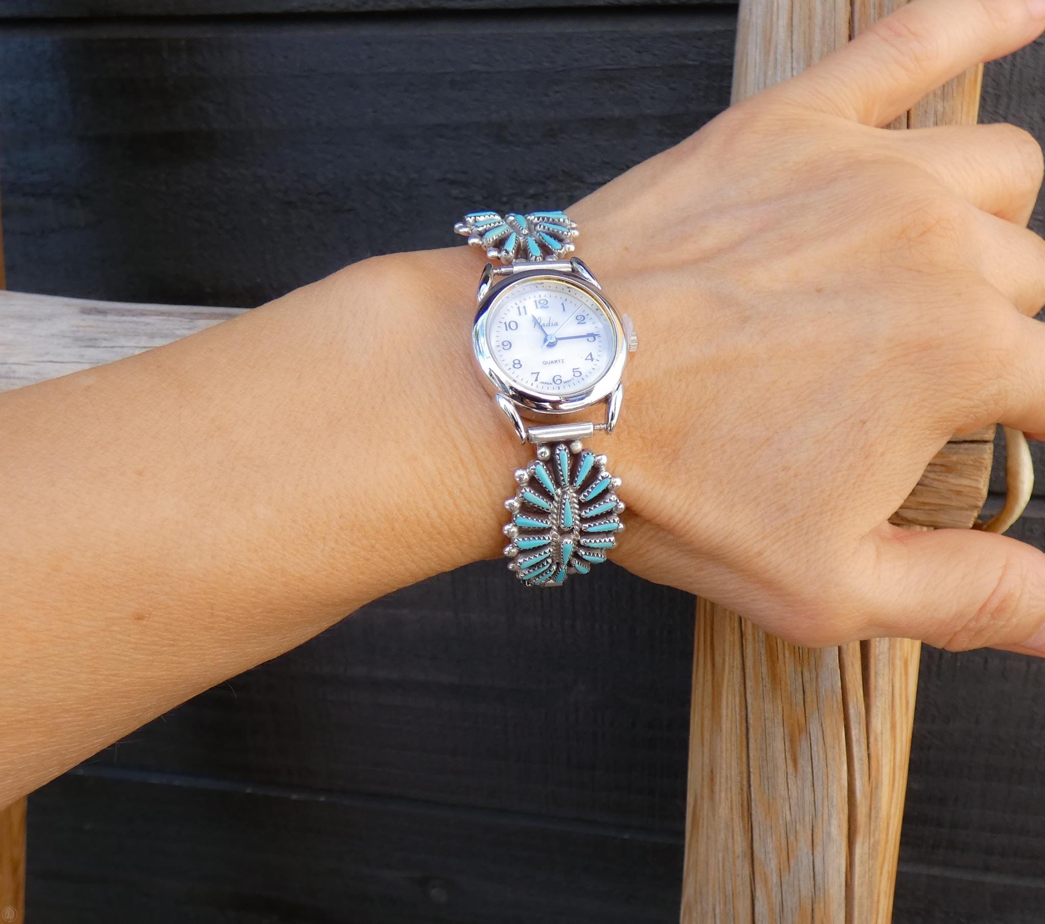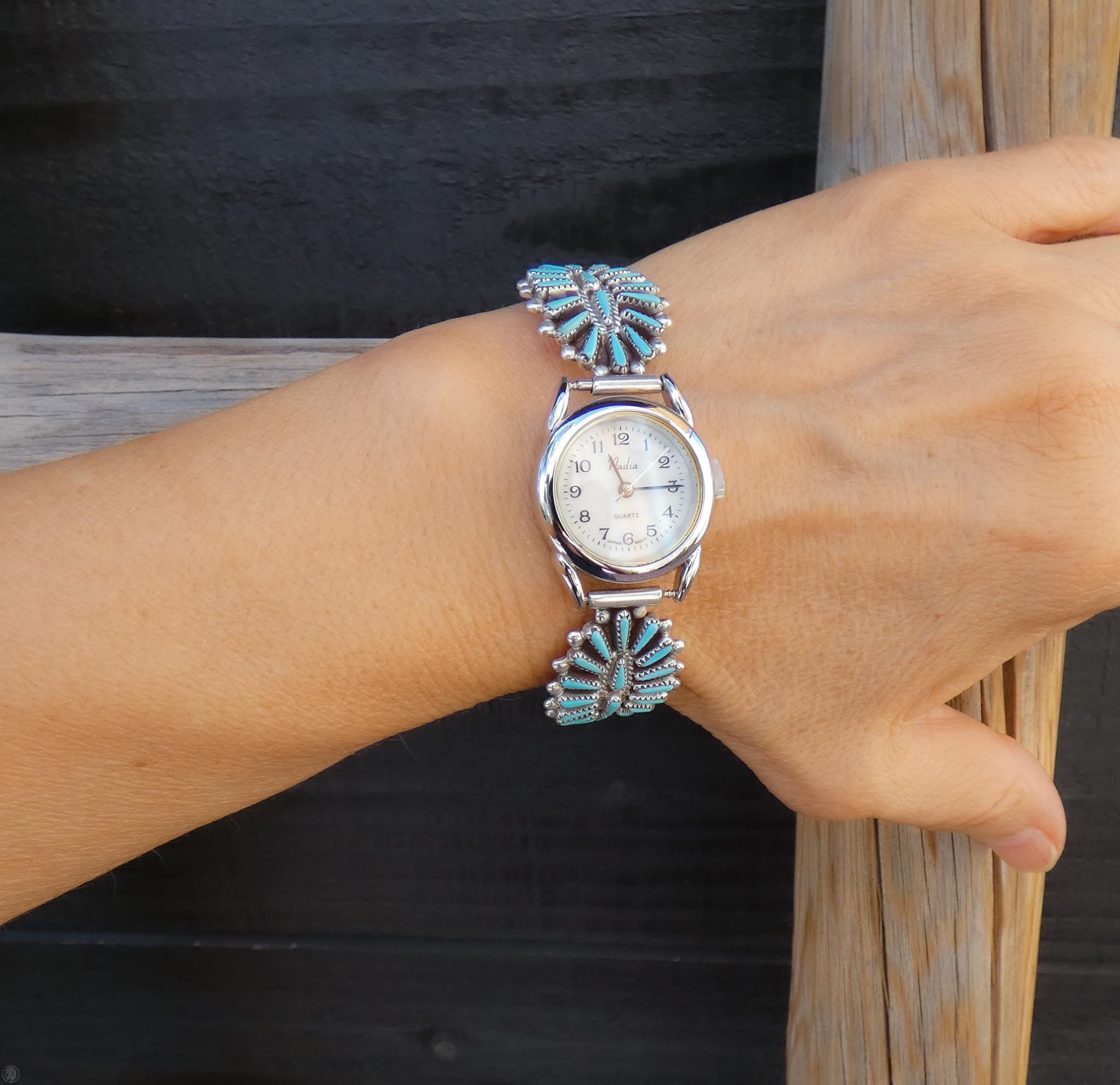 Amazing and rare, this Zuni Native American Women’s Silver Turquoise Watch is vintage never worn. It is handcrafted from Sterling Silver with individually cut needlepoint Turquoise stones beautifully set in a traditional Zuni cluster setting, truly a historical work of art!
