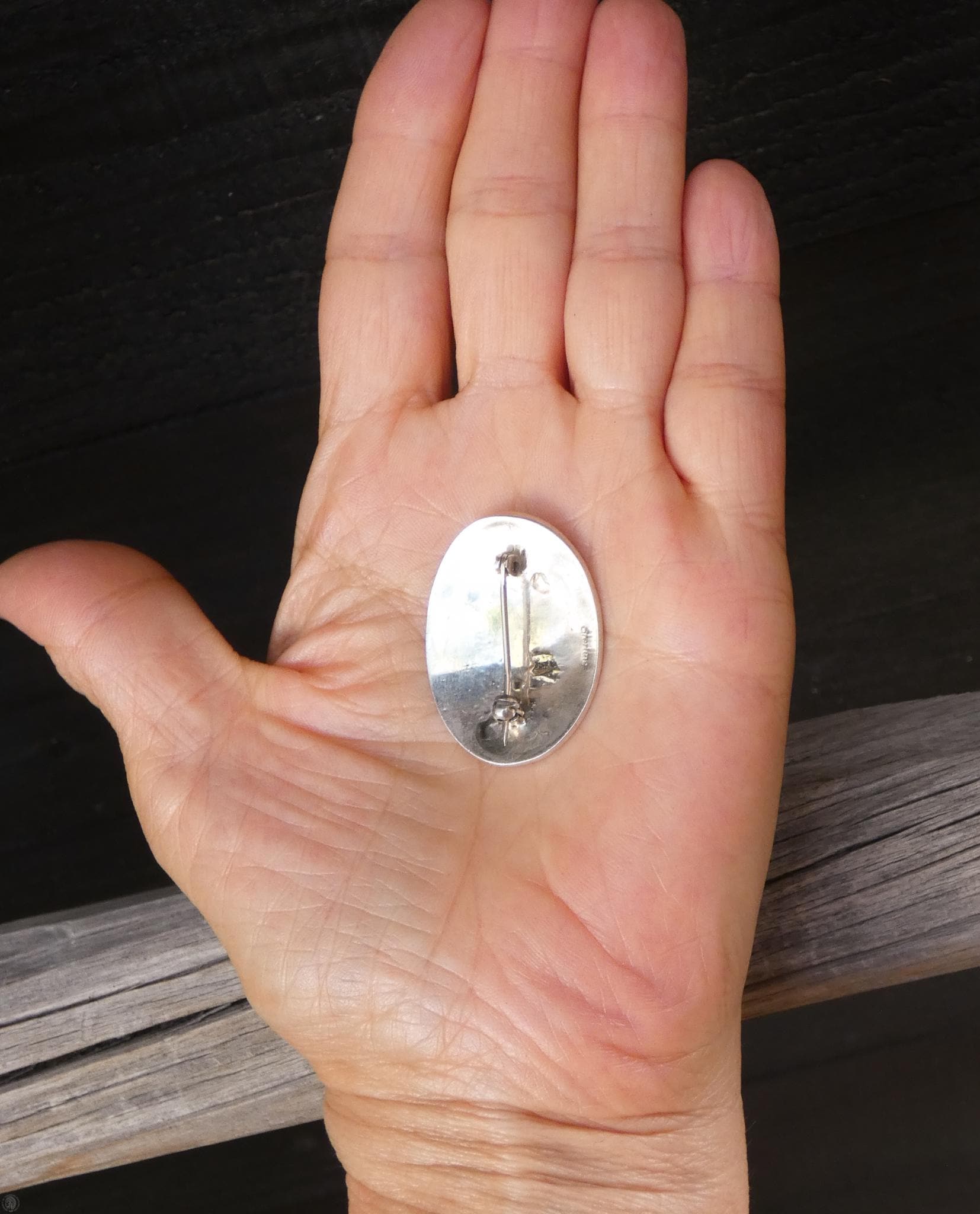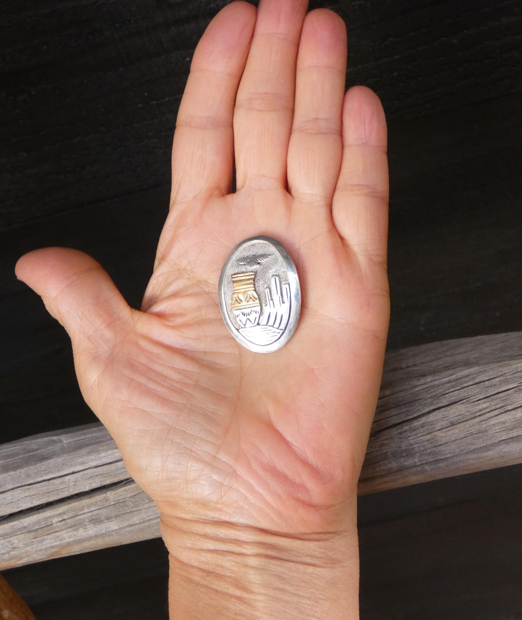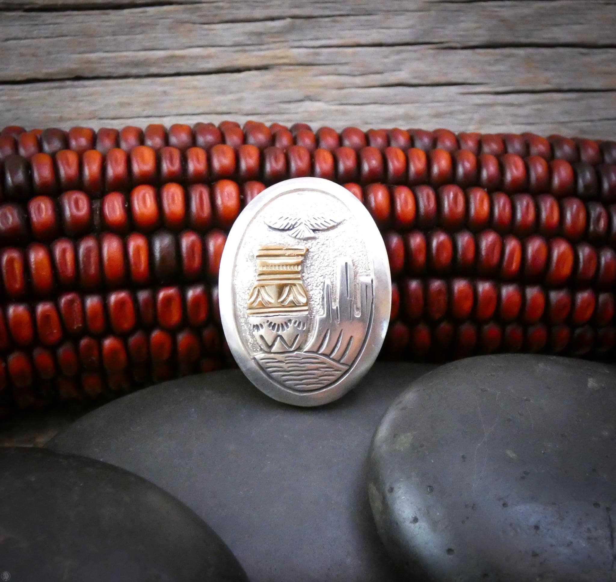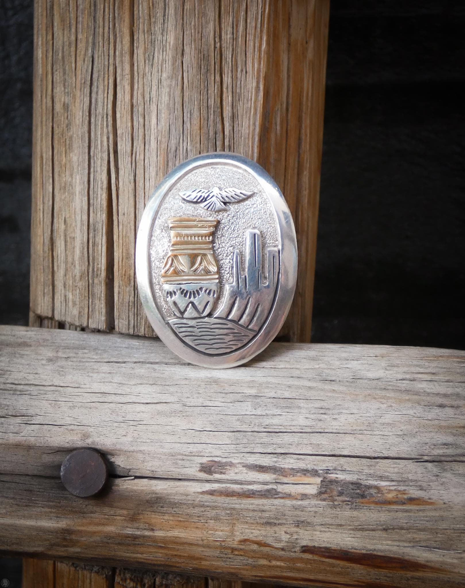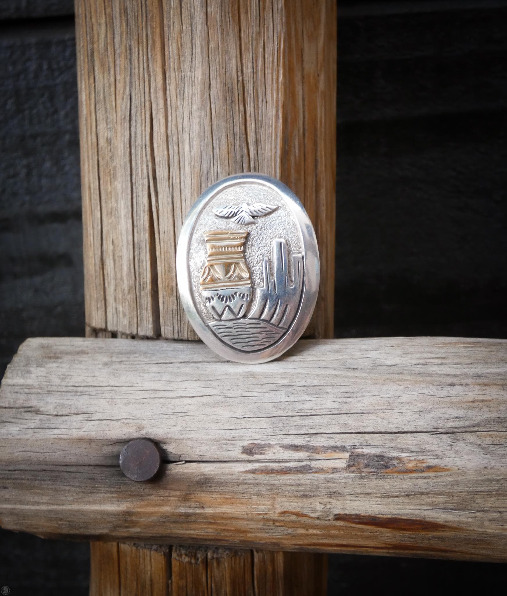 This vintage Native American Navajo brooch pin is beautifully made with 12KGF & Sterling Silver. The design is 100% hand tooled featuring Native American pottery with an eagle in flight. This is folk art at its finest; the perfect gift for anyone who loves unique Native American jewelry.
