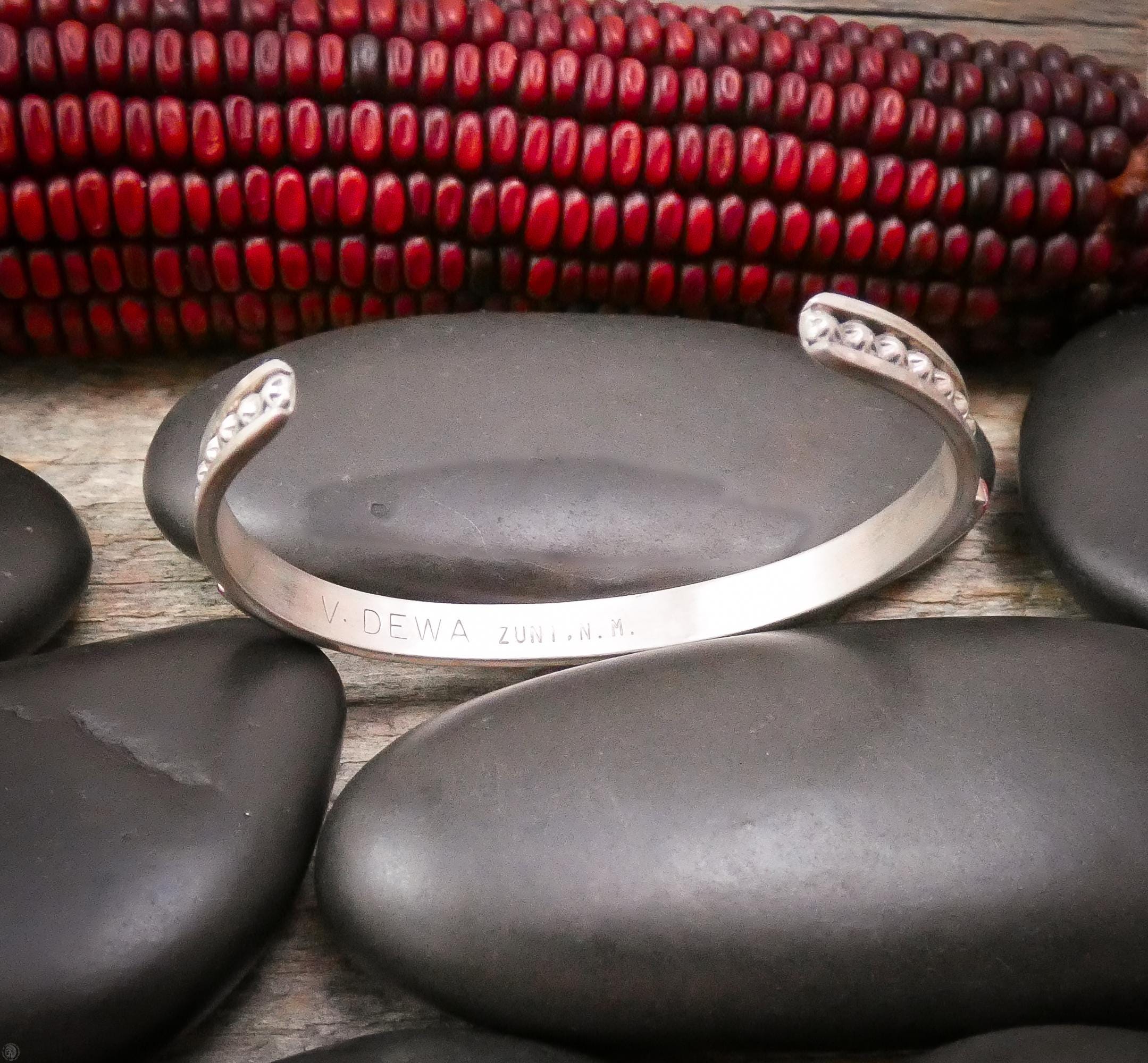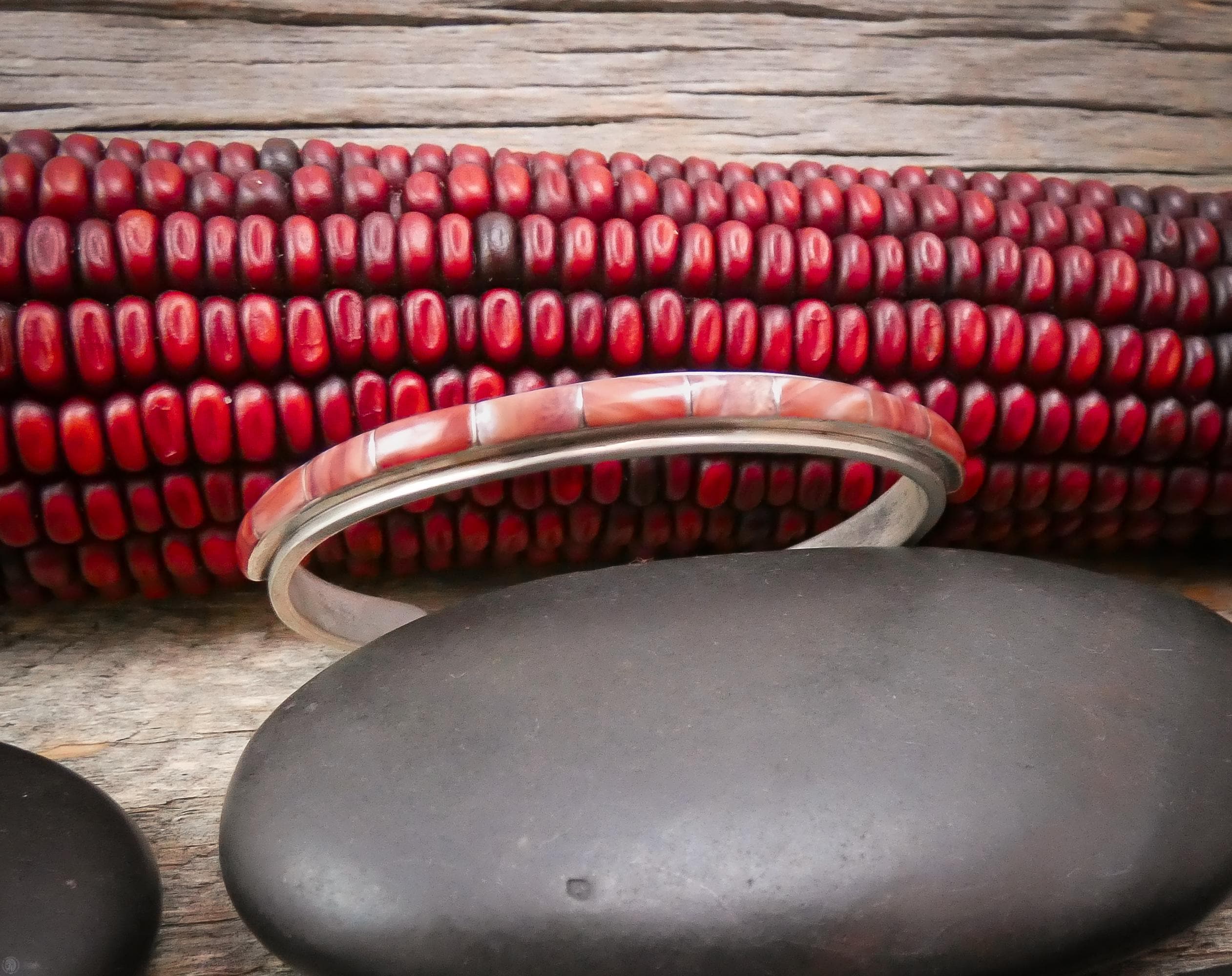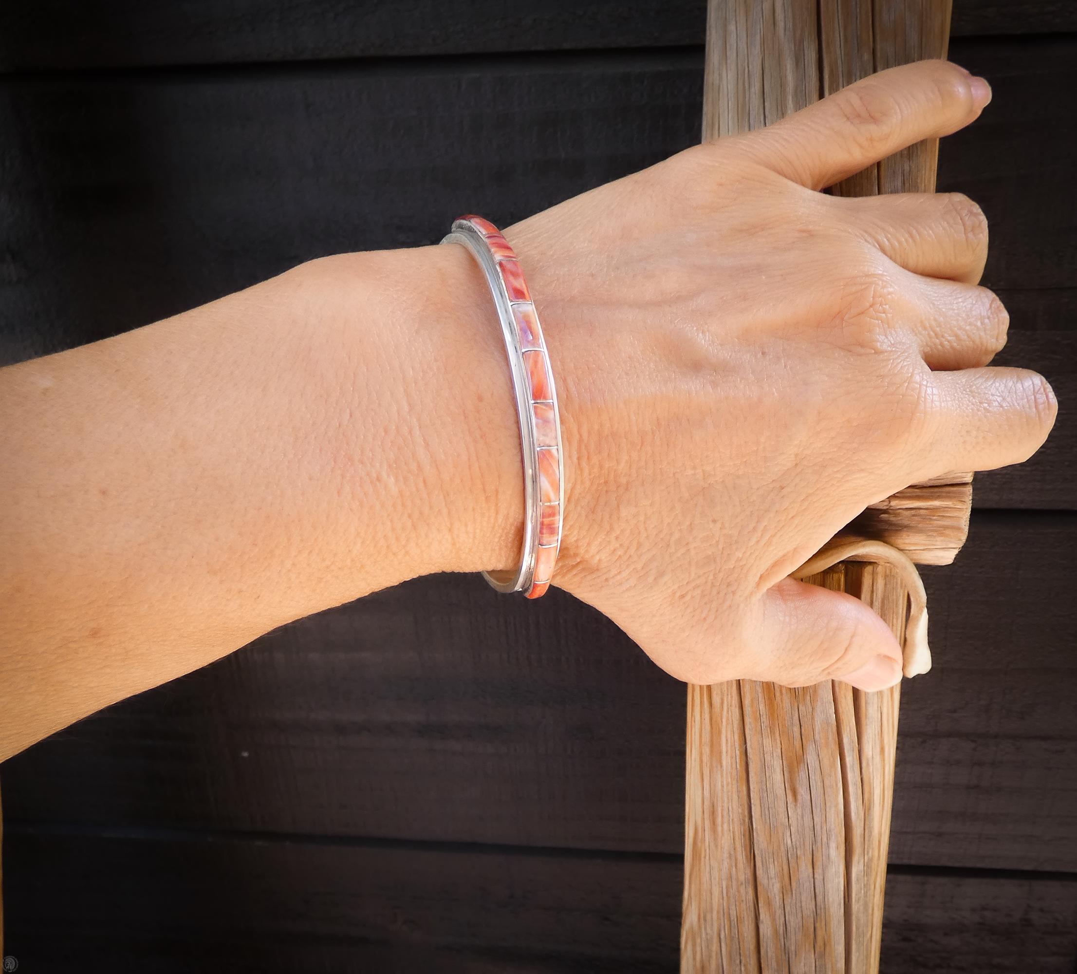 This Zuni bracelet is handmade with Spiny Oyster into a stacking row design.