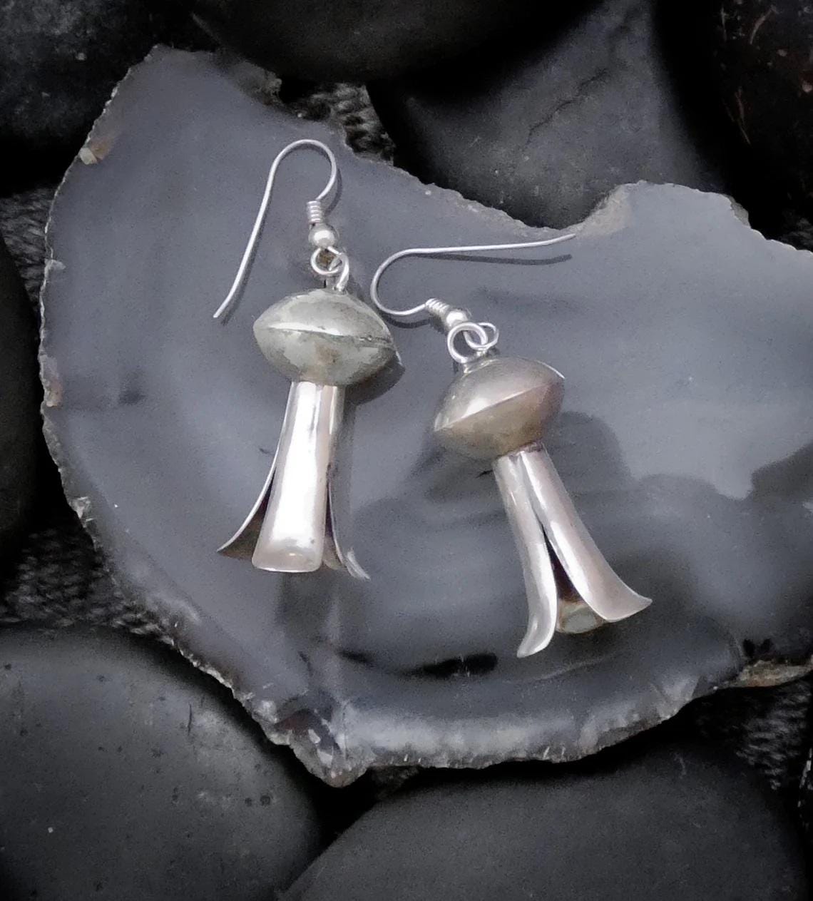 These Navajo Vintage Sterling Silver Earrings were handmade in the early 1990's in northern New Mexico, by Navajo Silversmith craftsman Johnny Begay. They have never been sold or worn. These classic traditional earrings can be worn casually or dressed up. The beautiful craftsmanship is on display for these vintage artisan earrings.