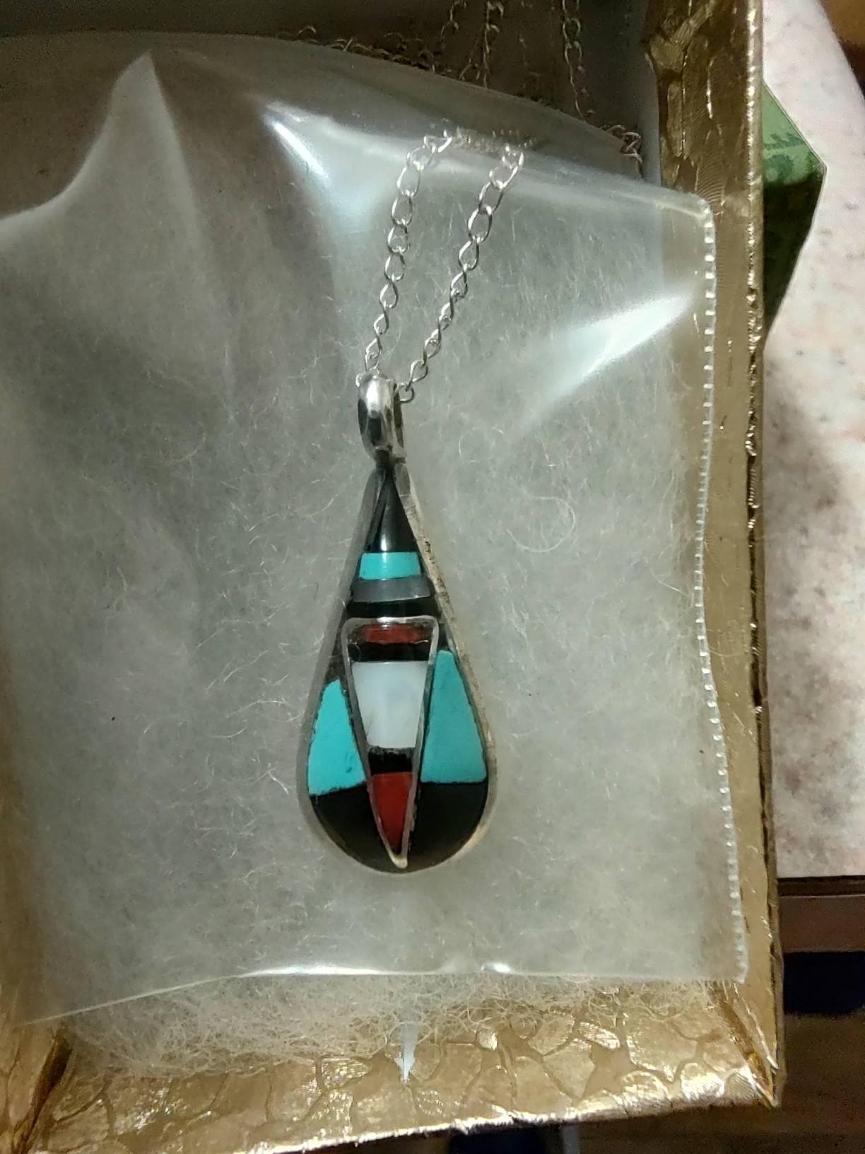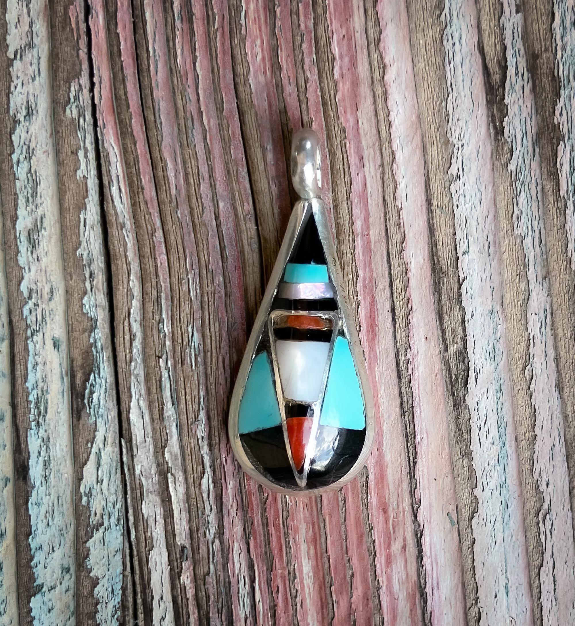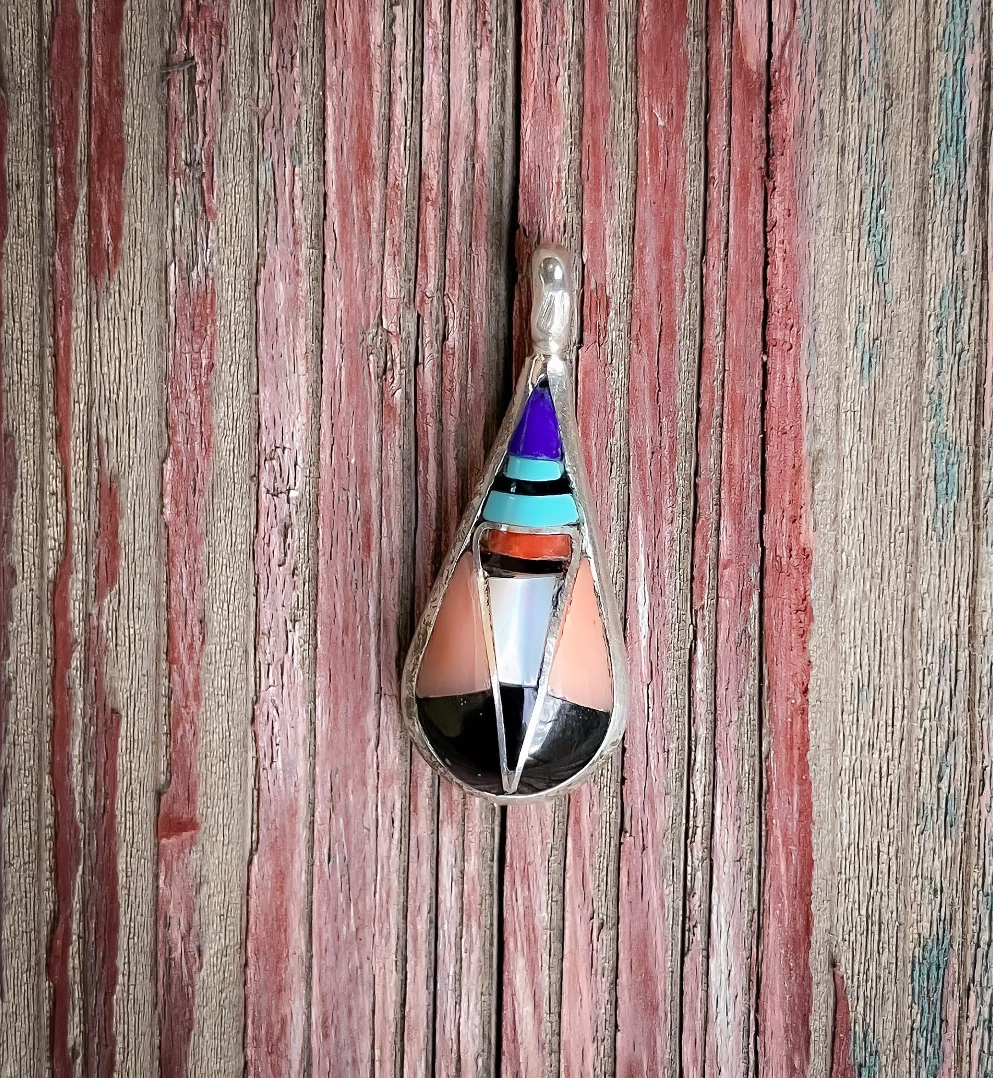 This pendant is a vibrant accessory that you will be proud to show off! Handcrafted with Coral, Mother of Pearl, Turquoise, and Onyx into an expertly hand-tooled inlay design. It is a chic accessory that is lightweight for all day comfort - a perfect addition to any collection!