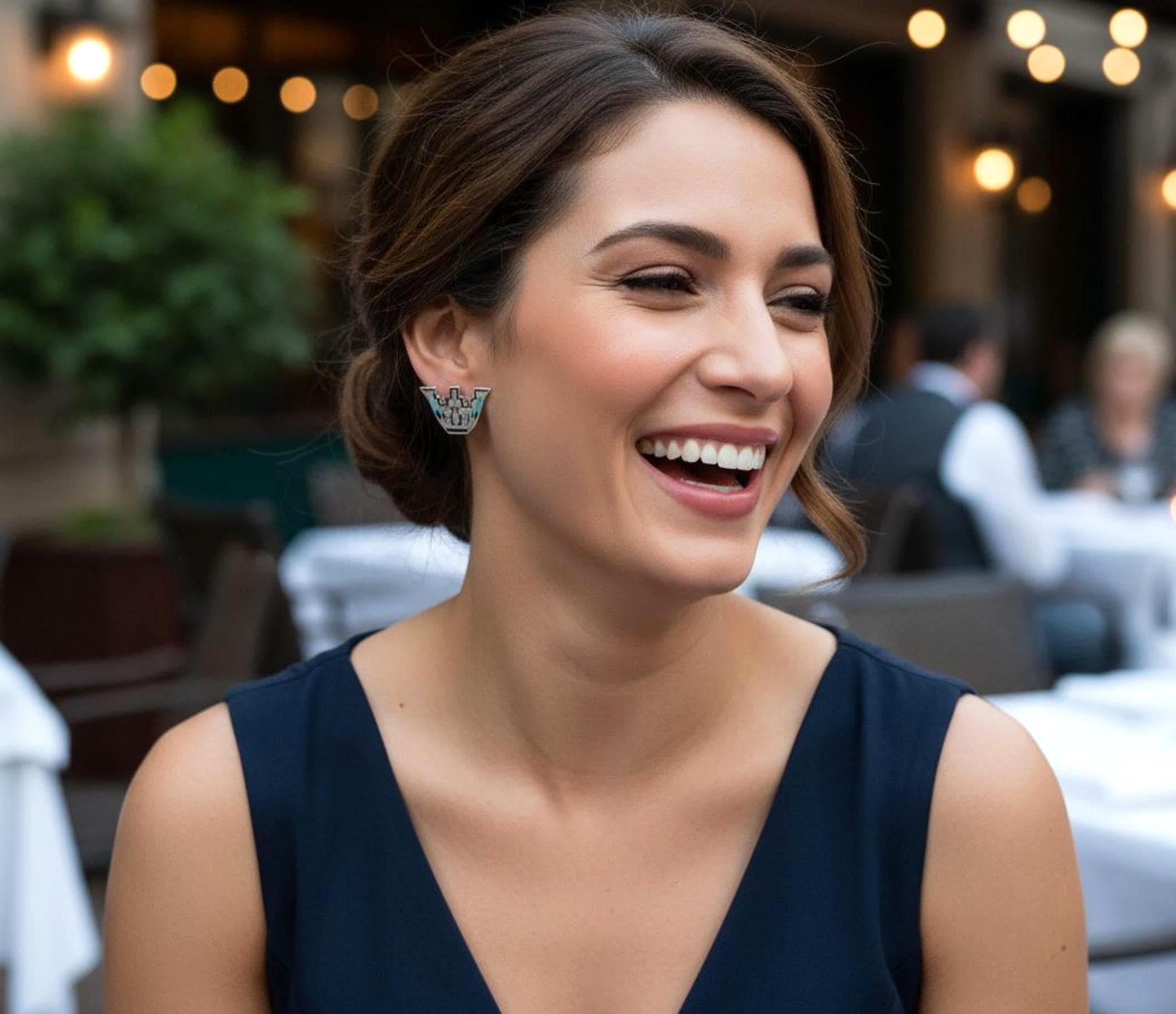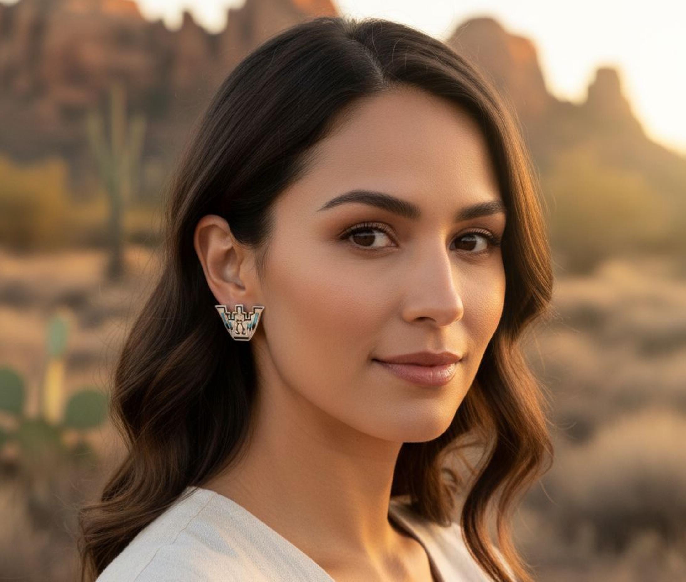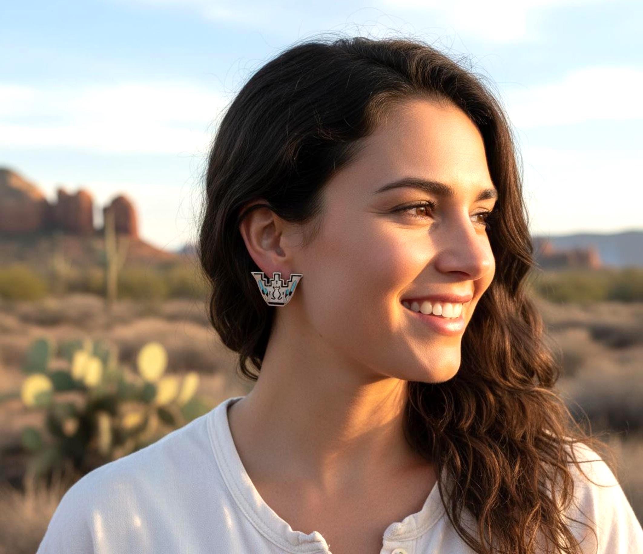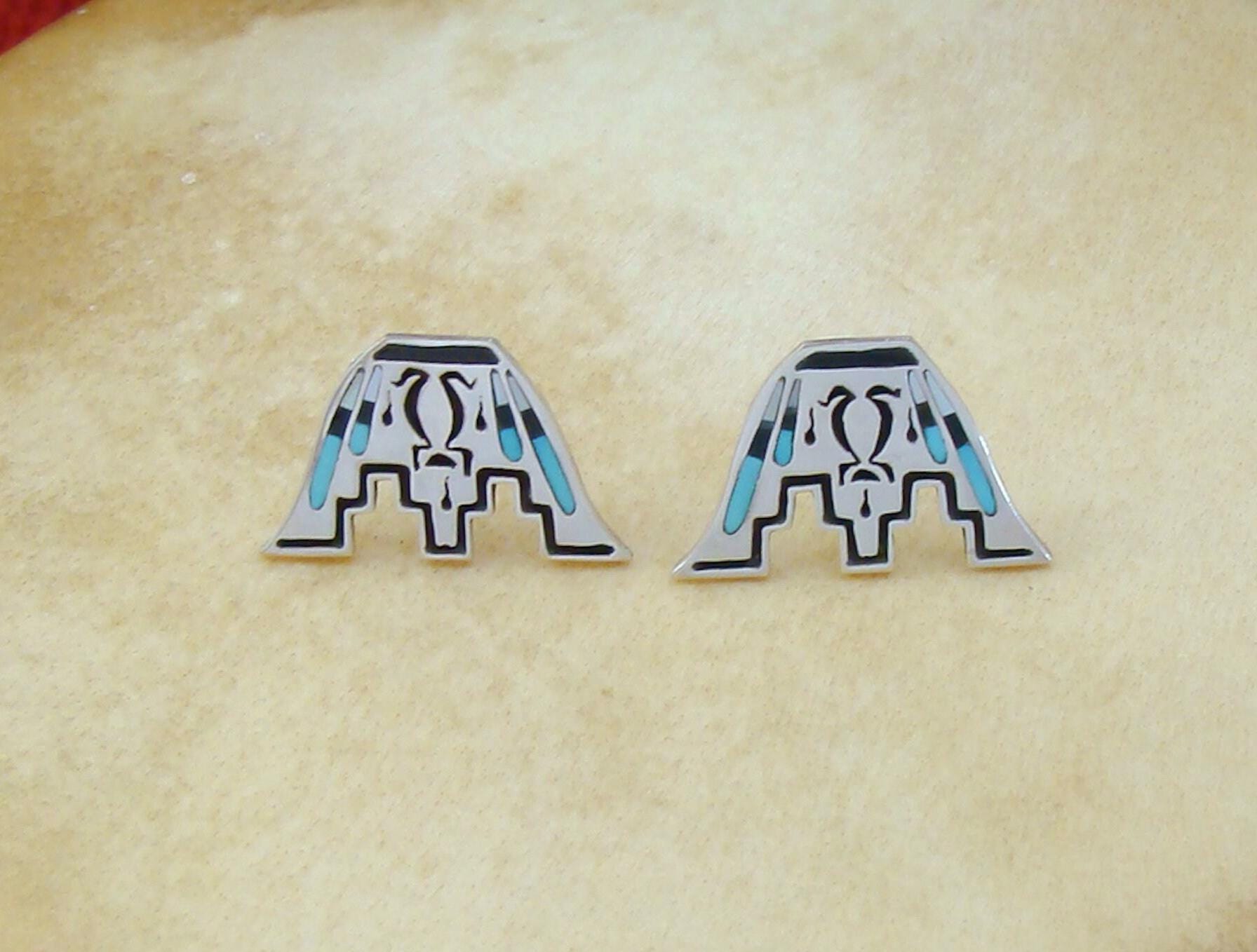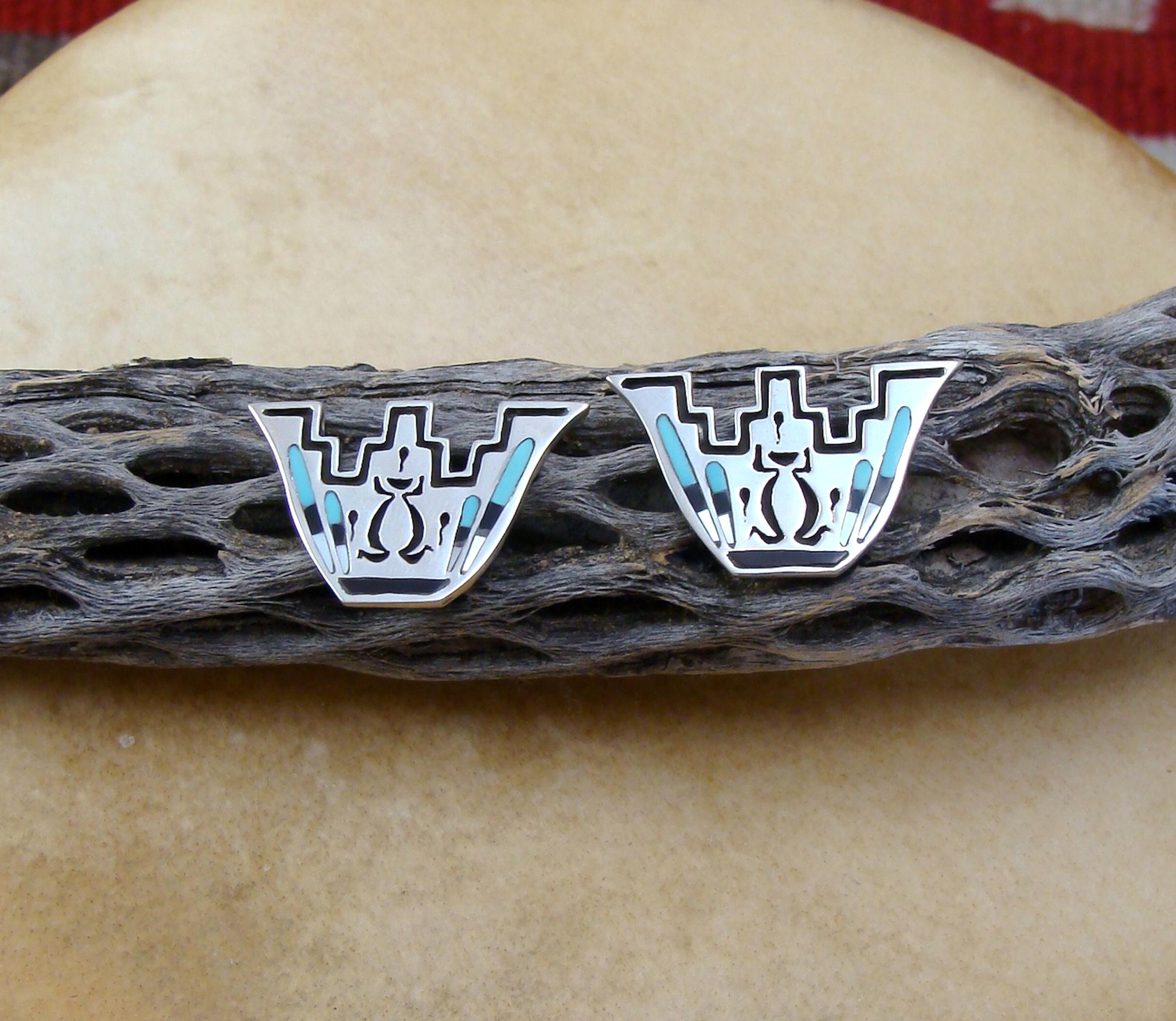 These attractive Vintage Zuni post earrings are handcrafted from Sterling Silver and inlaid with Turquoise, Onyx and Mussel Shell. Expertly handcrafted into a traditional Native American depiction, they are colorful and light weight for all day wear! These vintage earrings are in new condition, never worn, and will be a delightful addition to any collection.