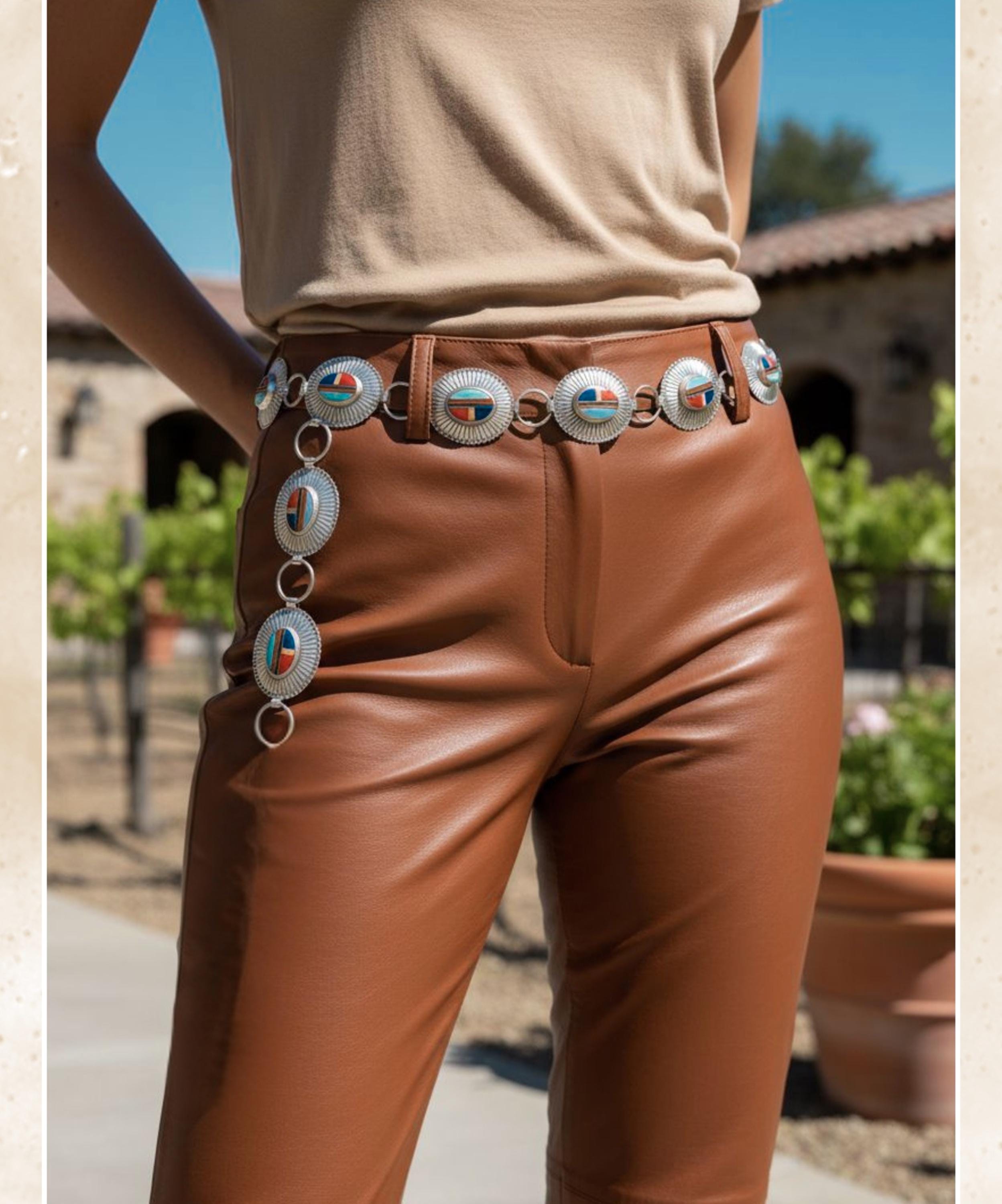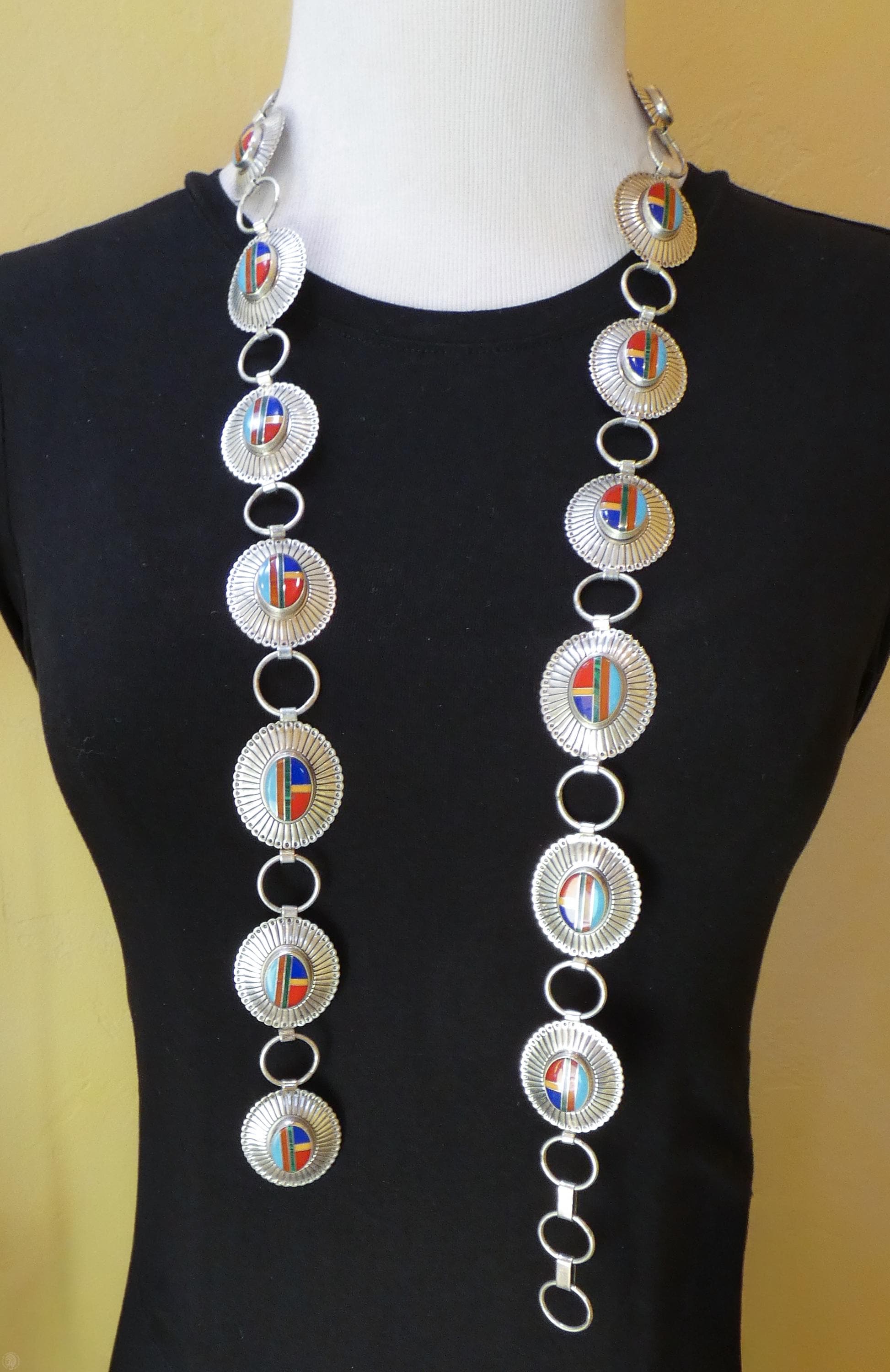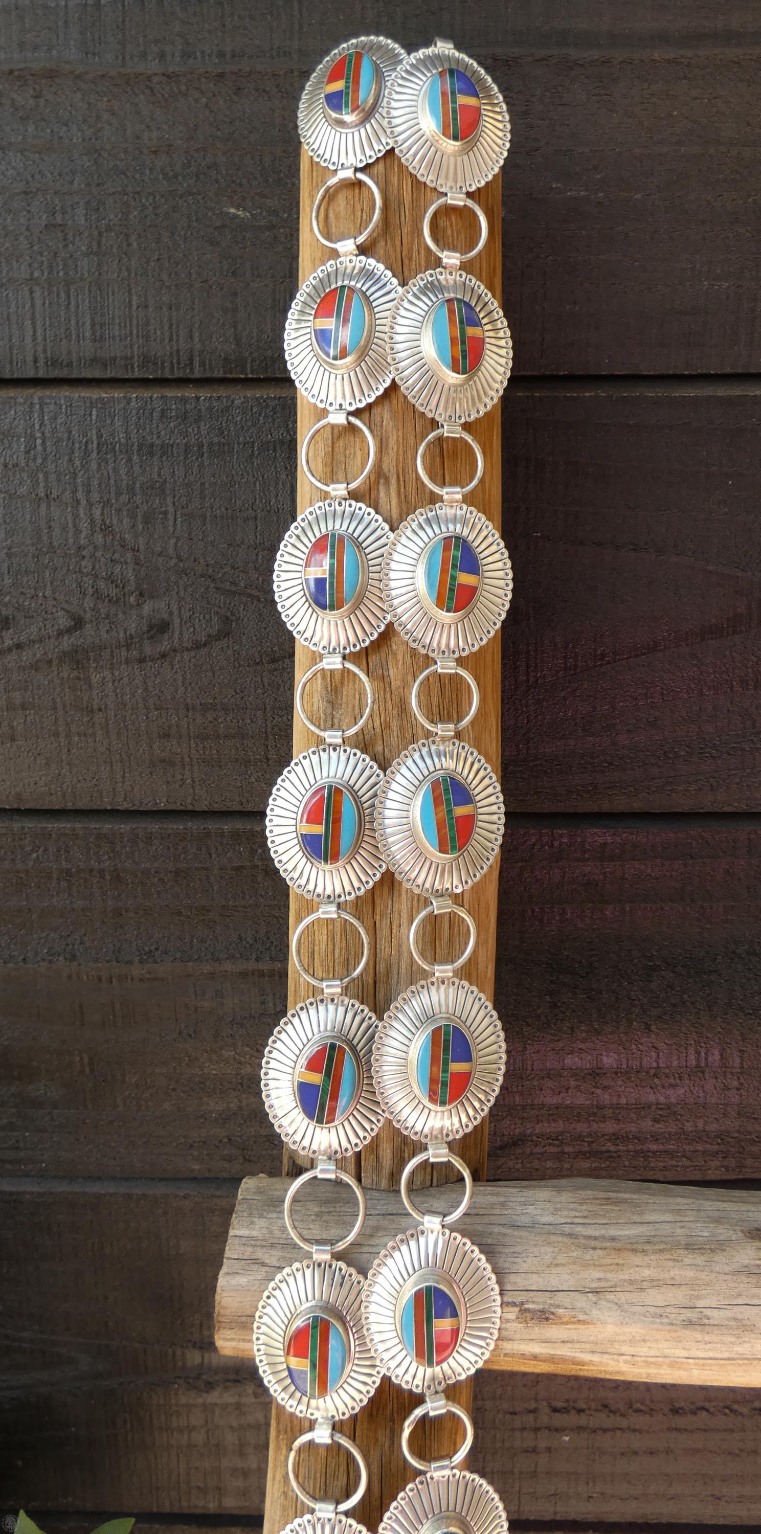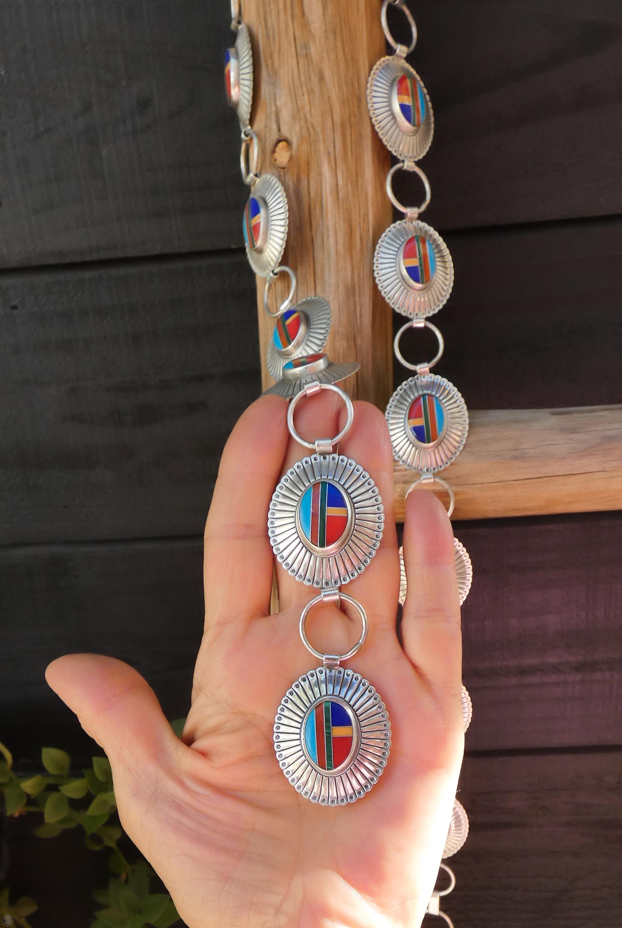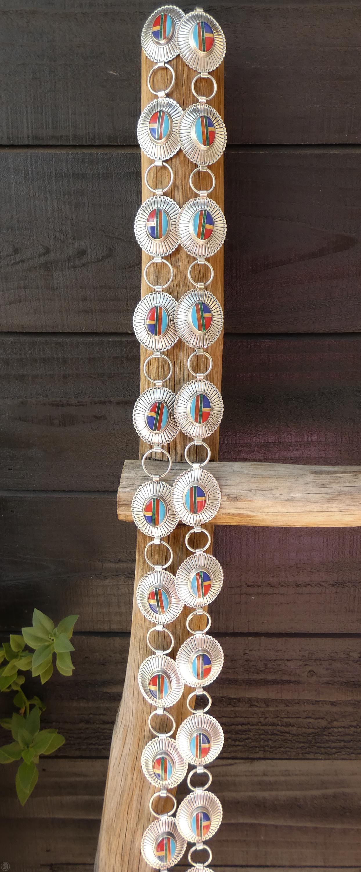 This belt is handcrafted from Sterling Silver and inlaid with Turquoise, Lapis, Malachite, Sugilite, Spiny Oyster & Coral into a geometric design. This is a gorgeous, colorful, accessory that is perfect for dressing up. It will definitely add a hint of tradition to any outfit worn with it and is in the link form that can be easily adjusted. Links can be removed for a custom fit.