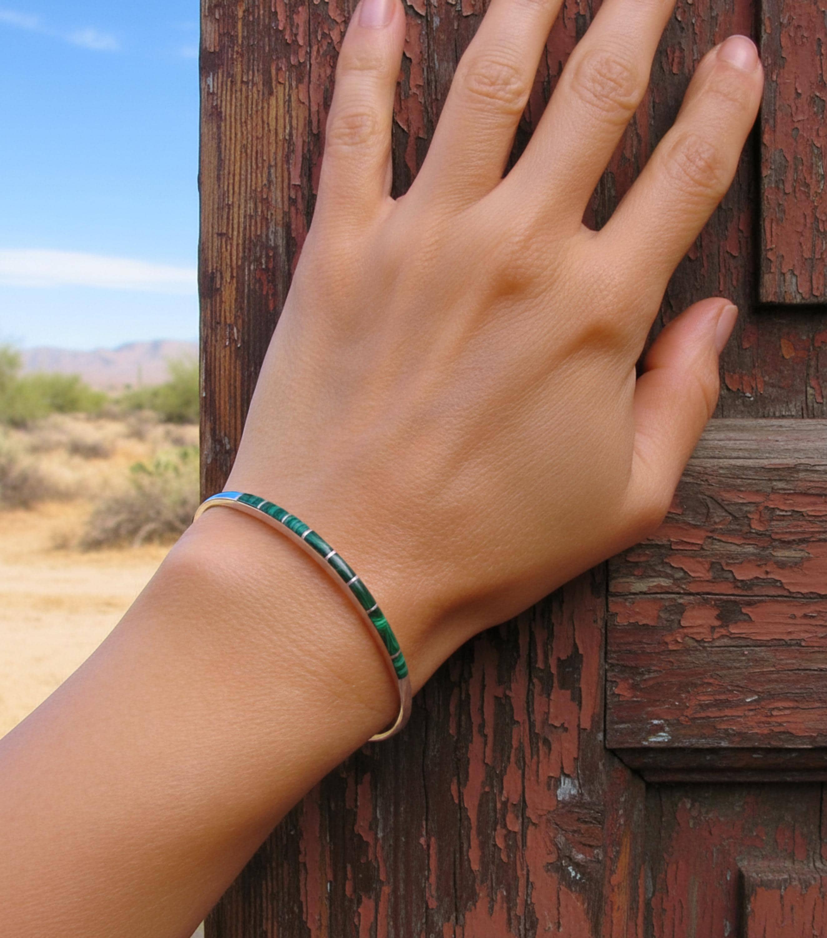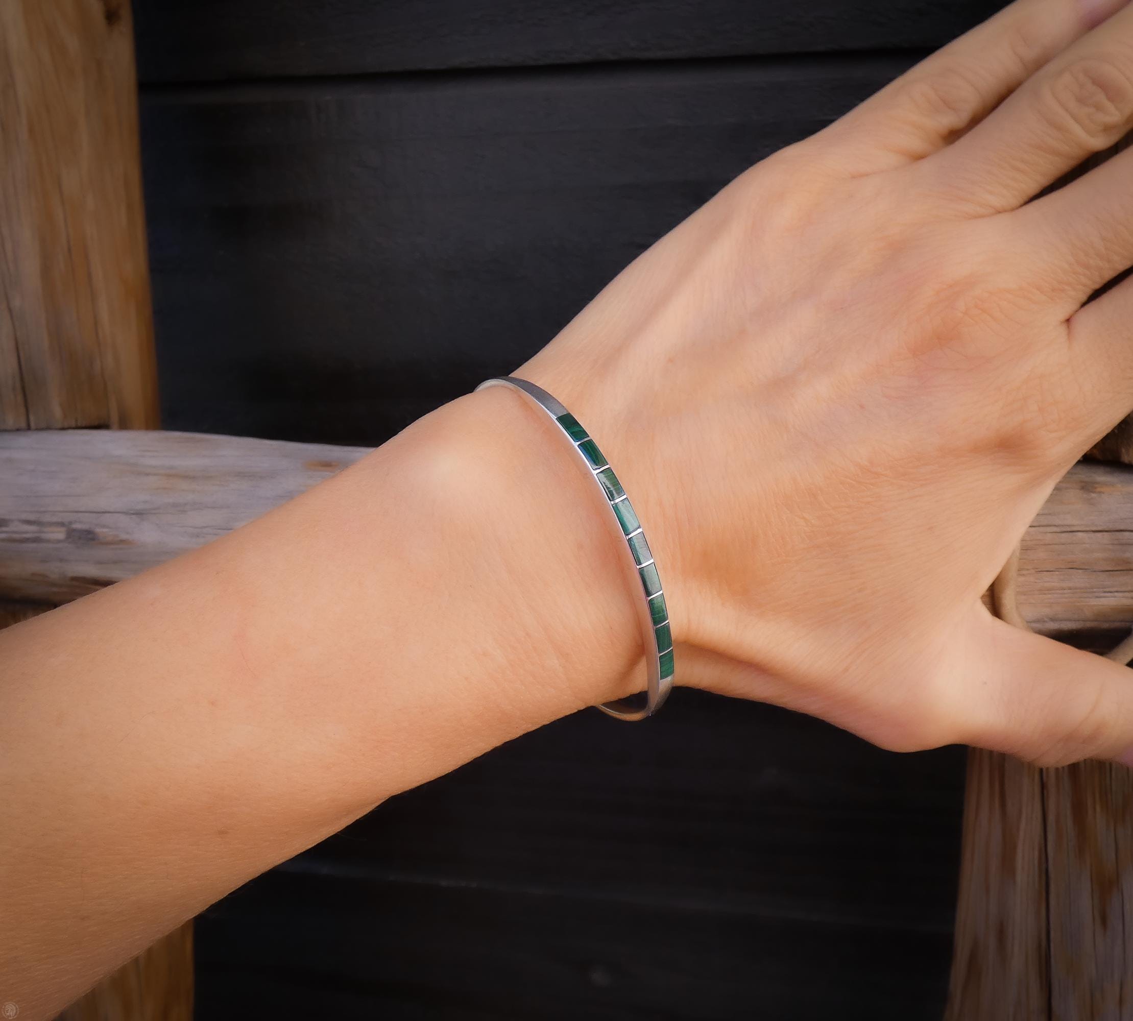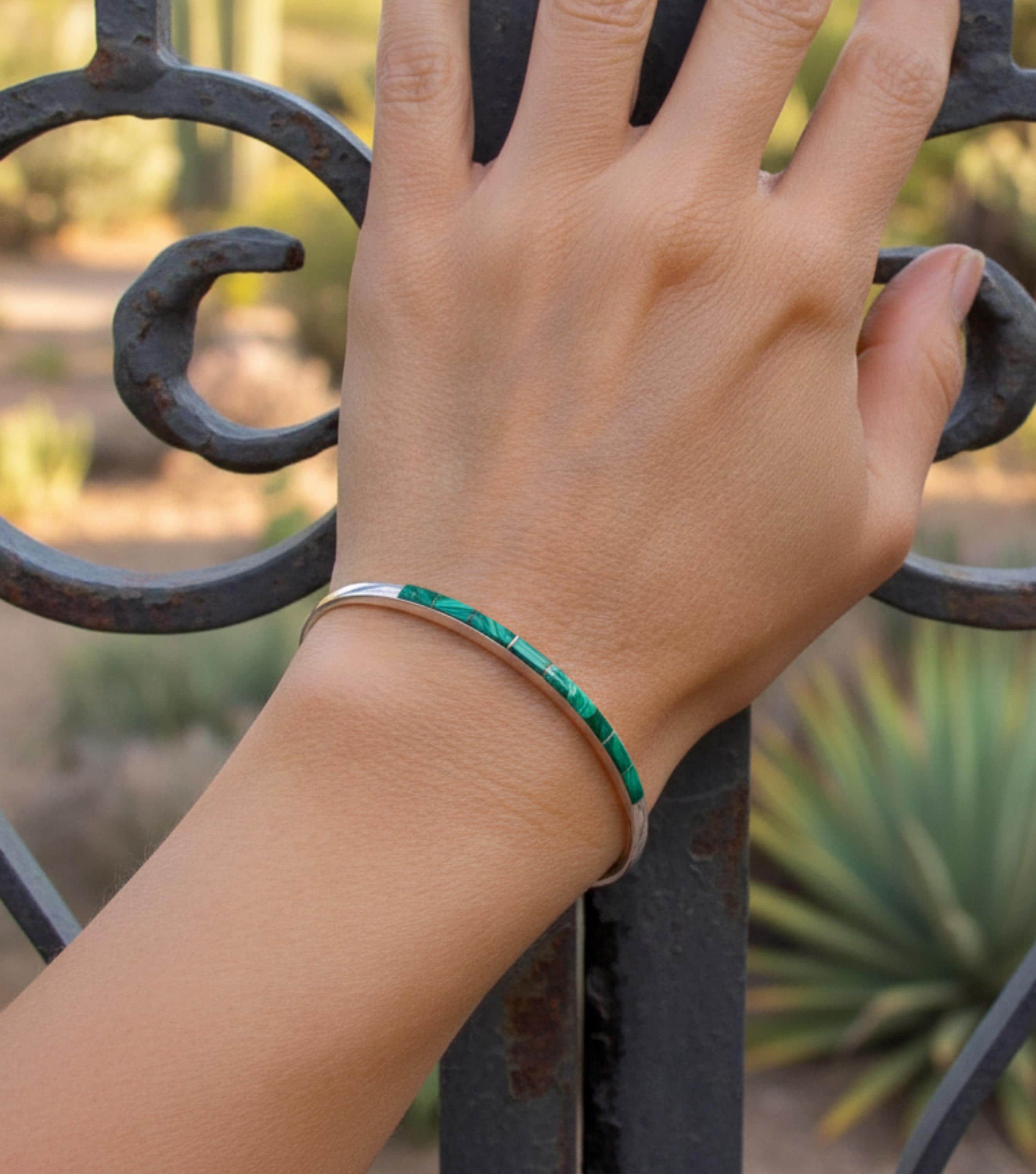 Please measure over your wrist bones before purchase, inlaid bracelet cannot be adjusted. We had a few of these bracelets so the malachite characteristics may vary from the images shown.