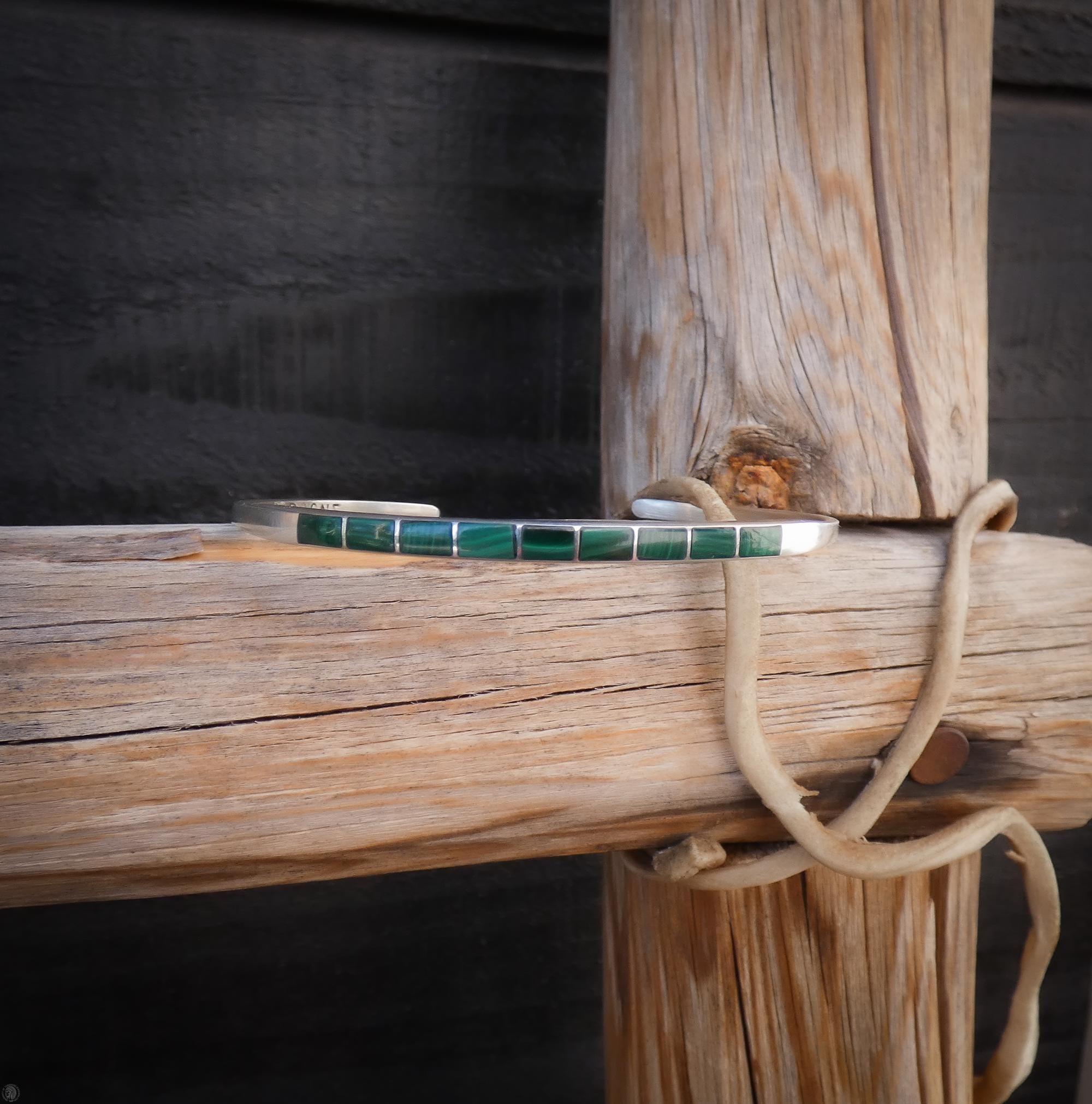 This stunning Sterling Silver bracelet is one of a kind! It is made in the traditional Zuni way by making the Malachite stones the central feature of the accessory. This specific bracelet has a clean elegant look with the stones perfectly inlaid into the top of the cuff. Wear something that sets you apart!