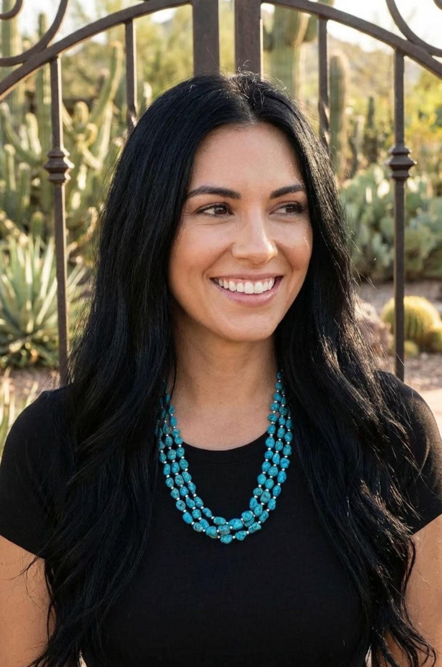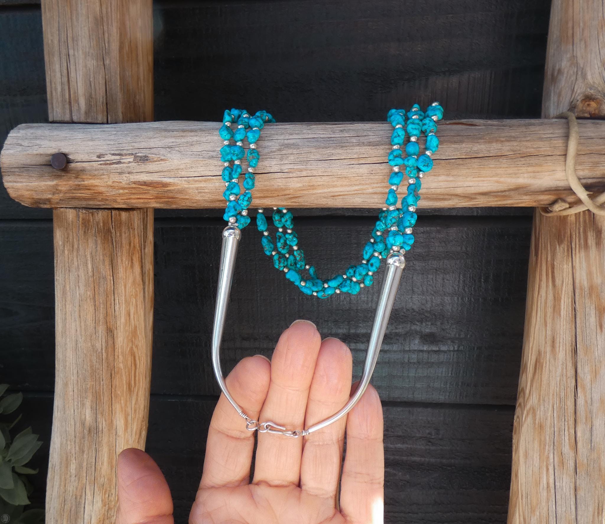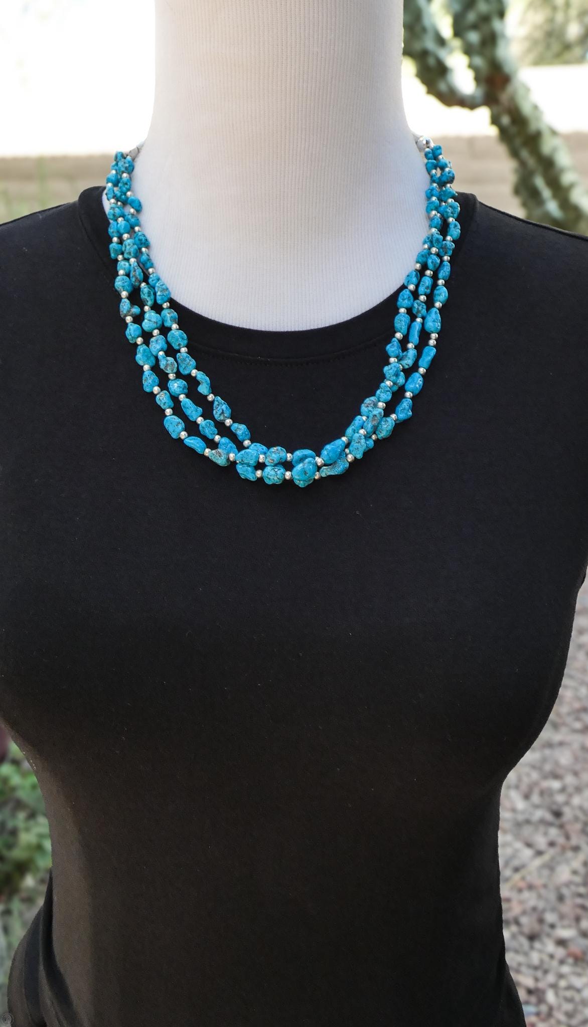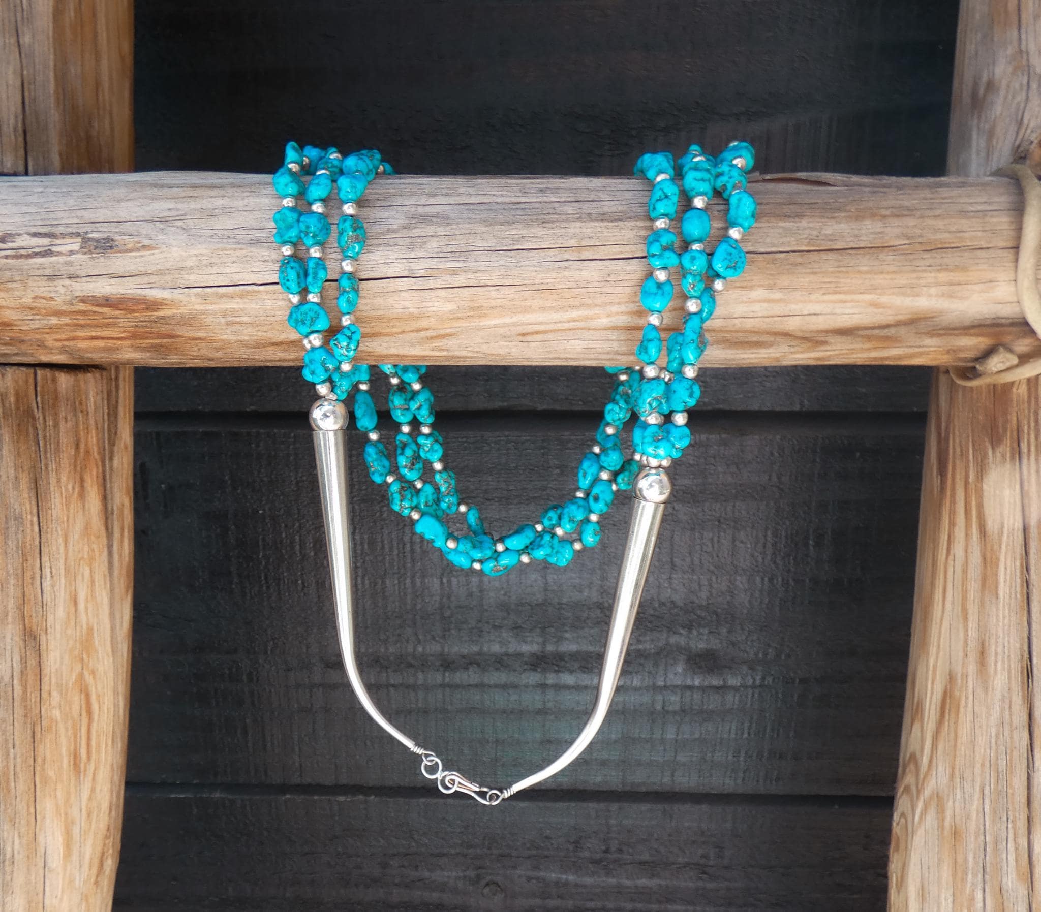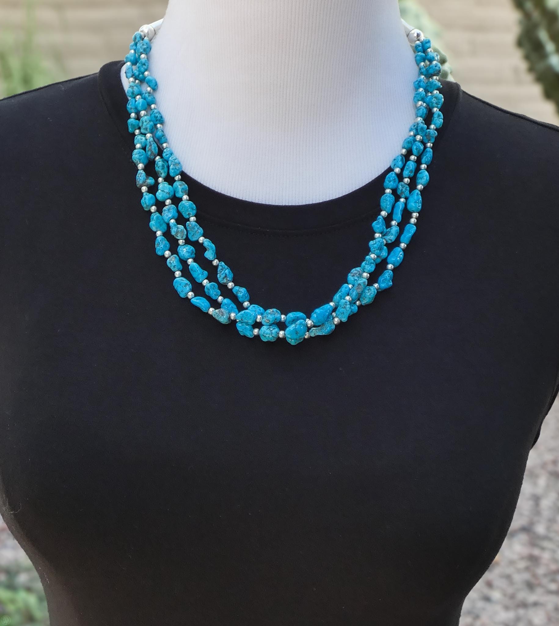 This vintage 3 strand Navajo Turquoise bead necklace is a classic Native American accessory that you've been searching for. It is handcrafted with Sleeping Beauty Turquoise Nugget beads mined from the Sleeping Beauty mine in Globe, Arizona. It is finished with sterling silver cones and findings. This is that timeless accessory that you will enjoy for years to come. Native American Navajo Handcrafted.