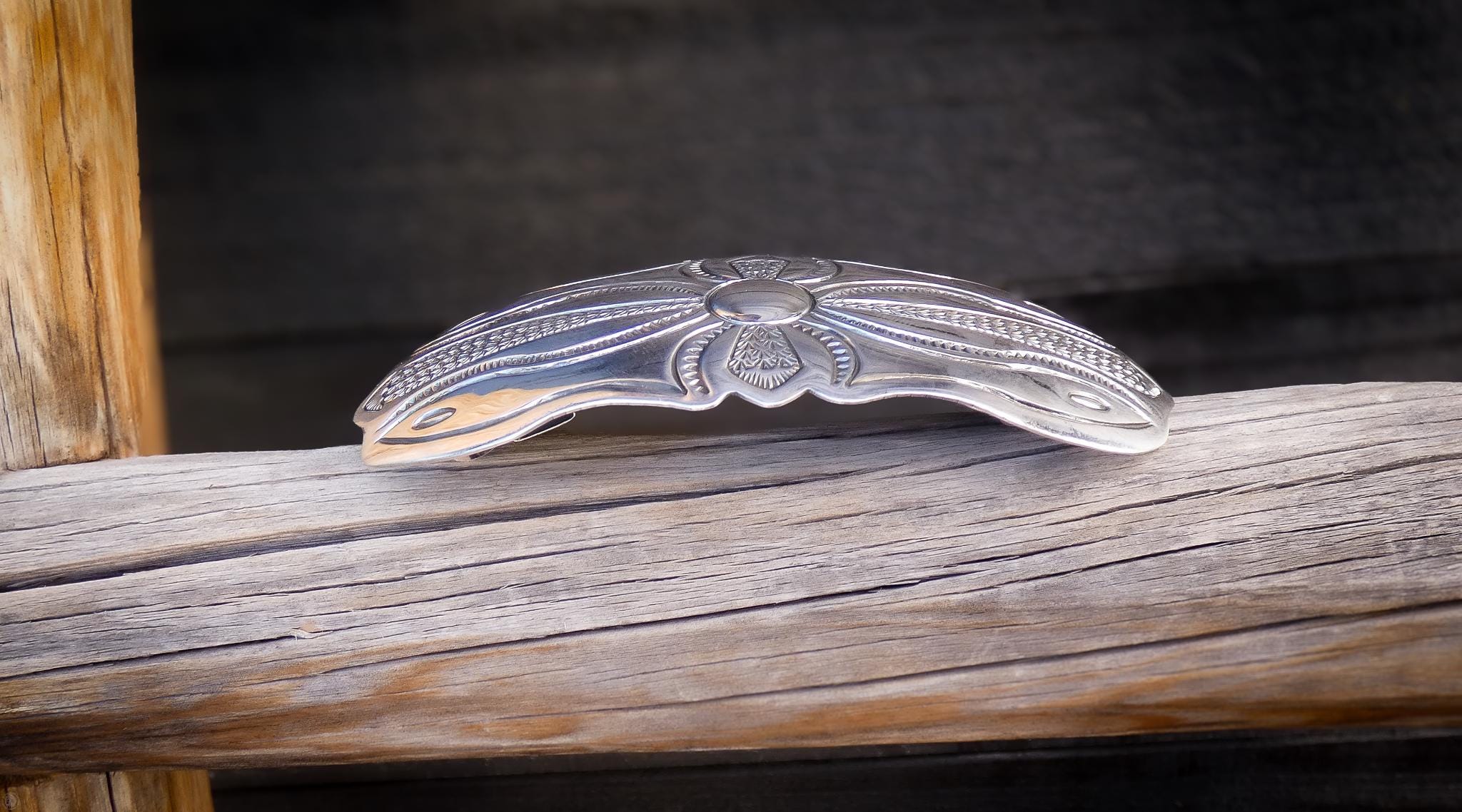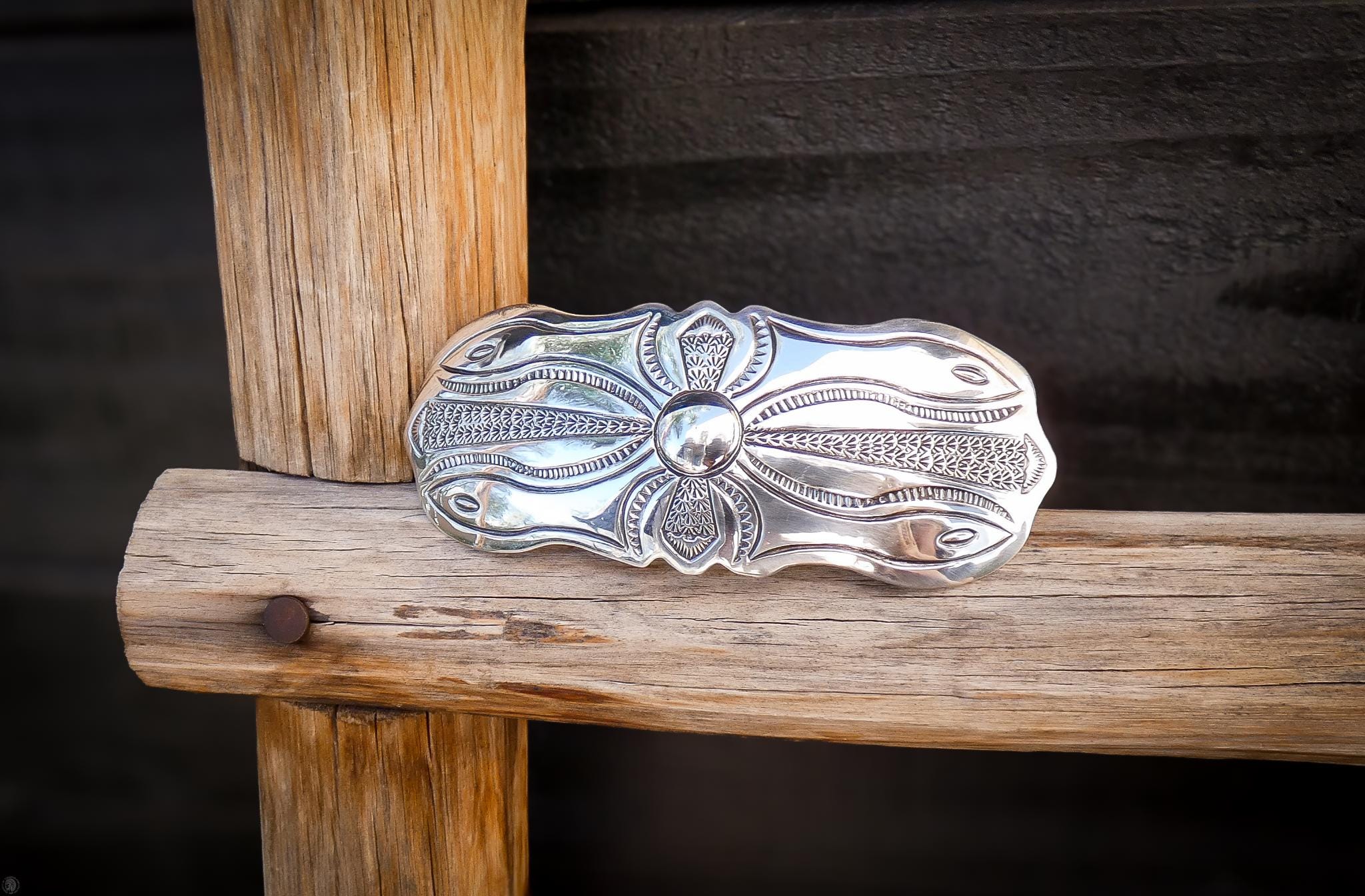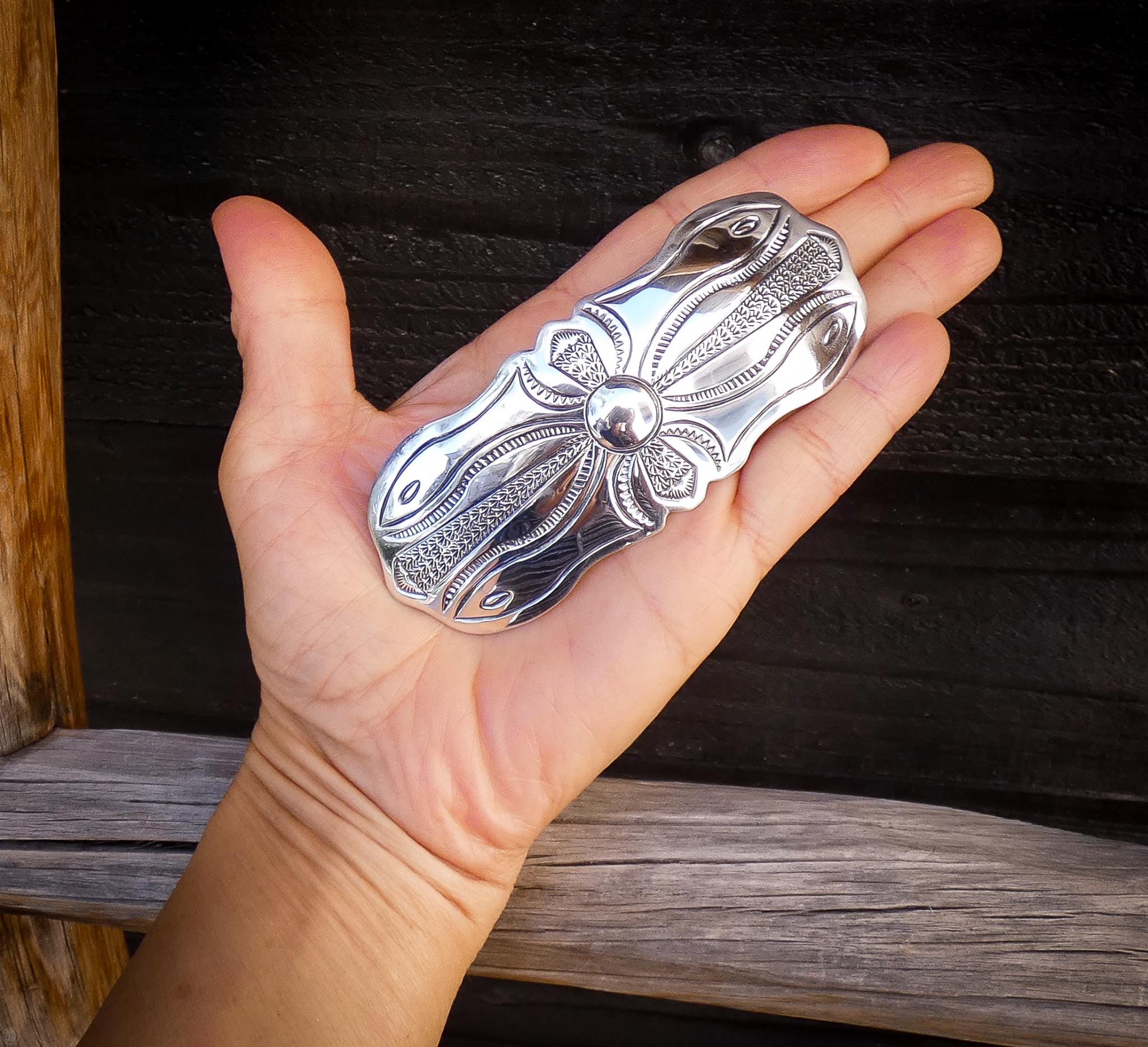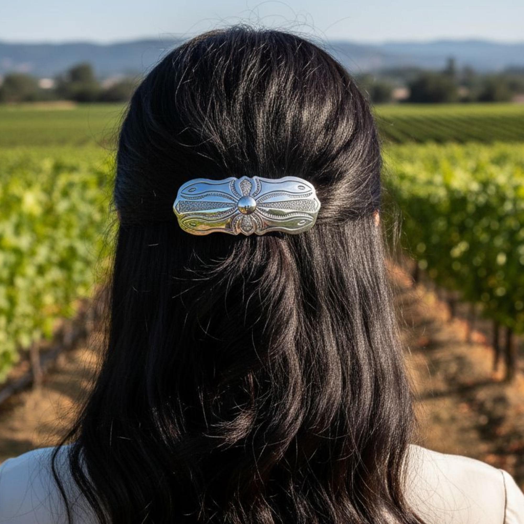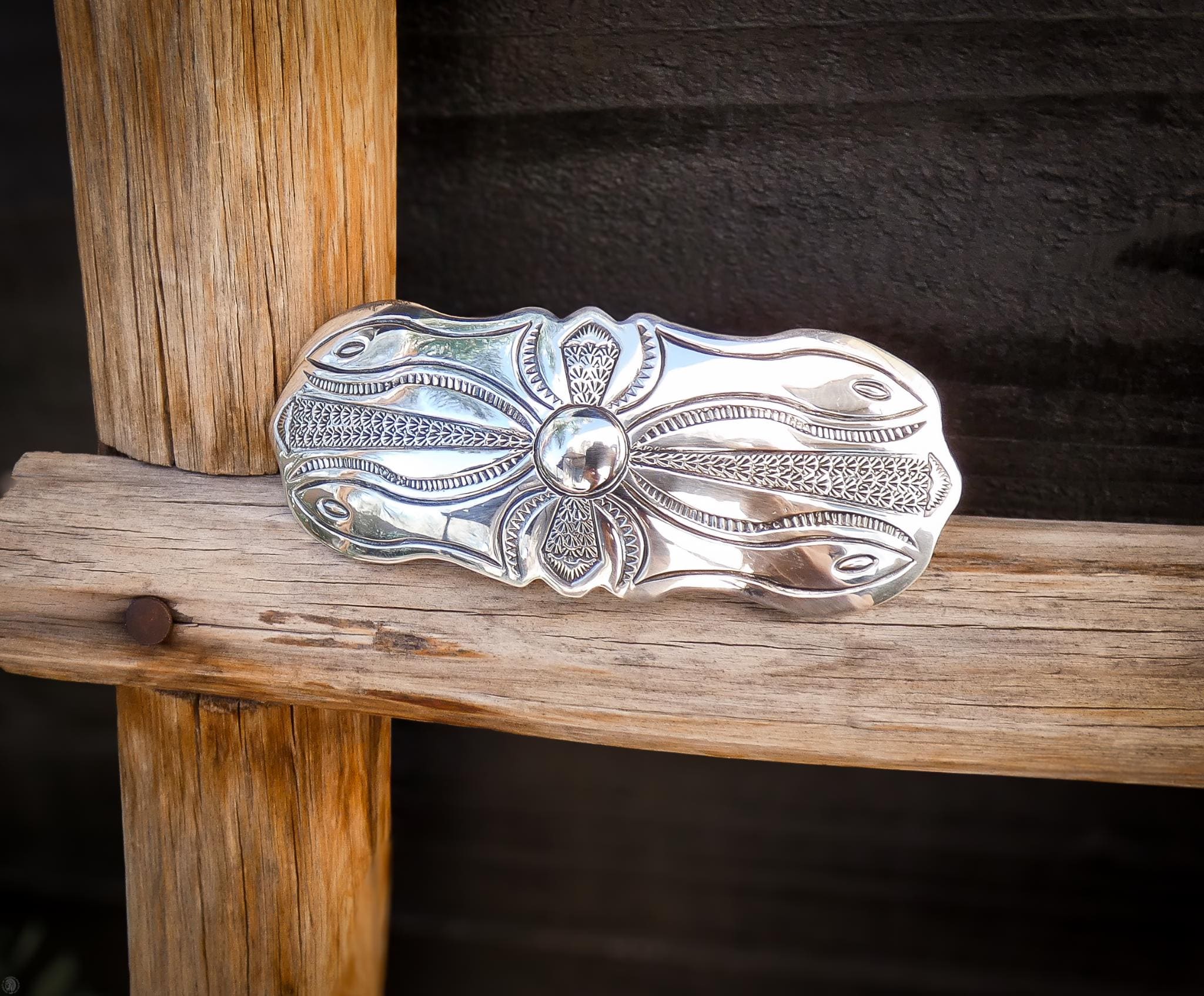 This vintage Sterling Silver concho barrette is a handmade Navajo treasure! Accessorize your hair with this barrette! This piece will surely flatter any length or color of hair. The finish is a hand-stamped Sterling Silver design. The finished product is an understated, traditional look -- unparalleled excellence in craftsmanship!