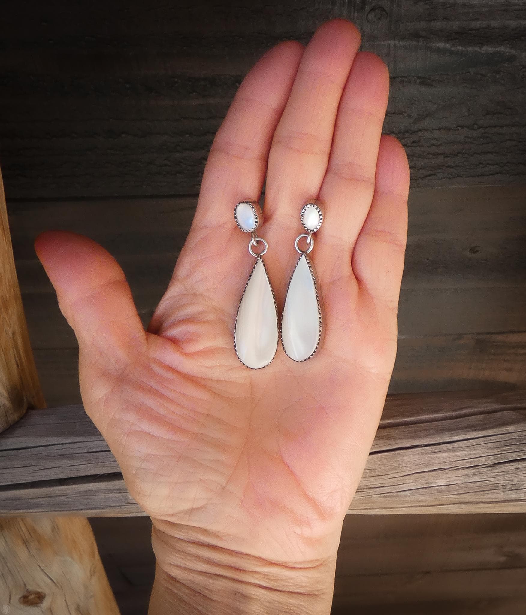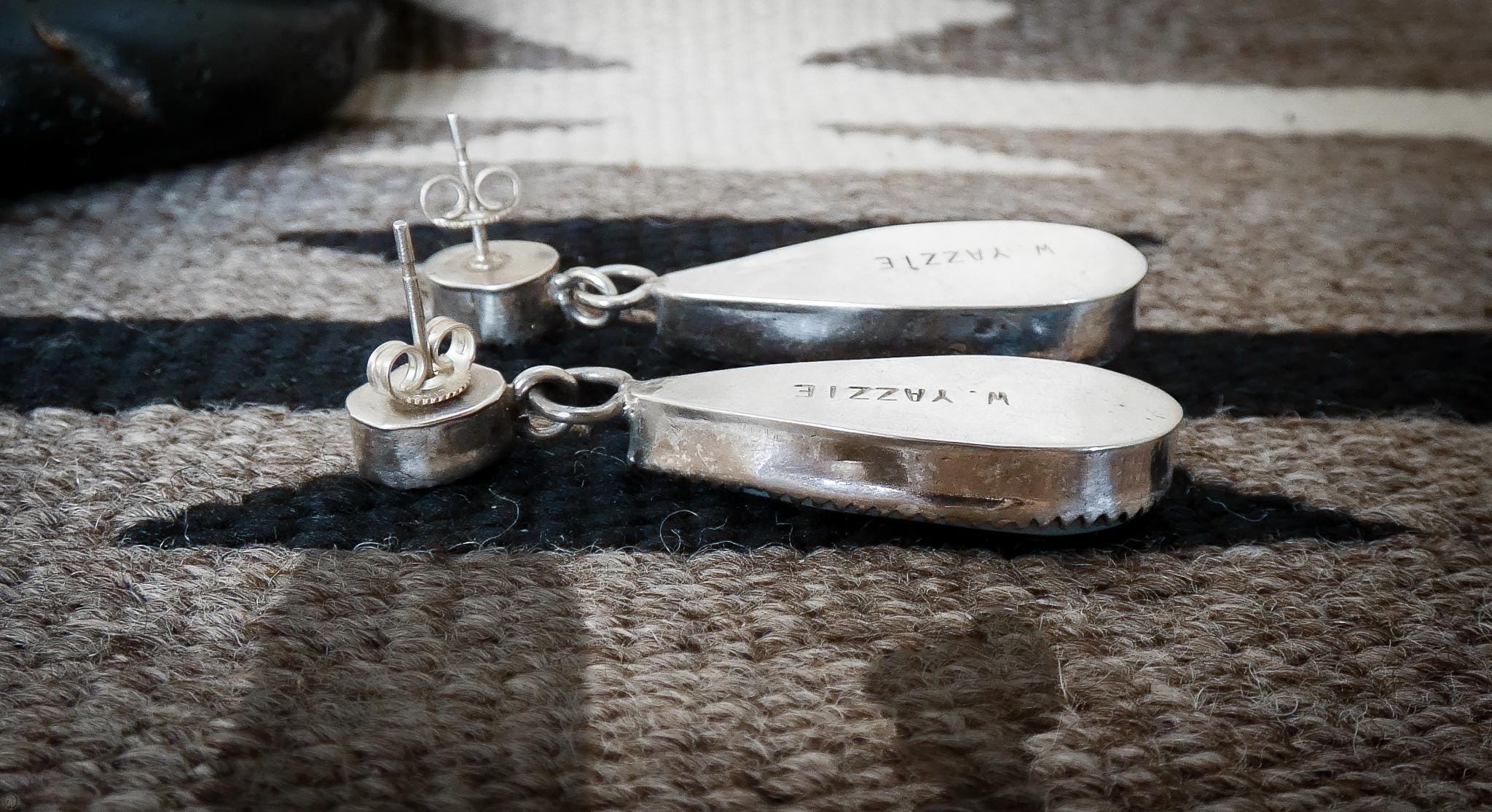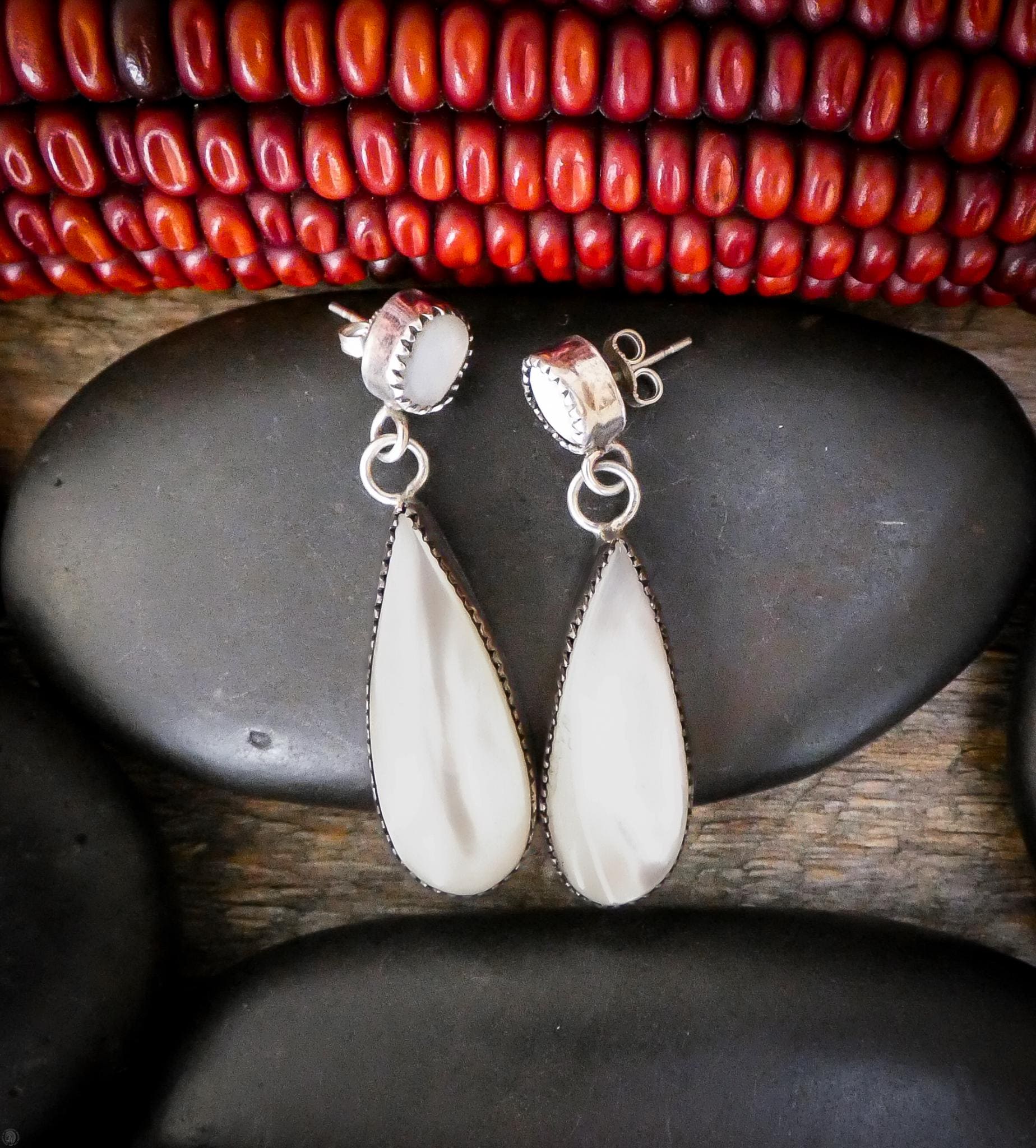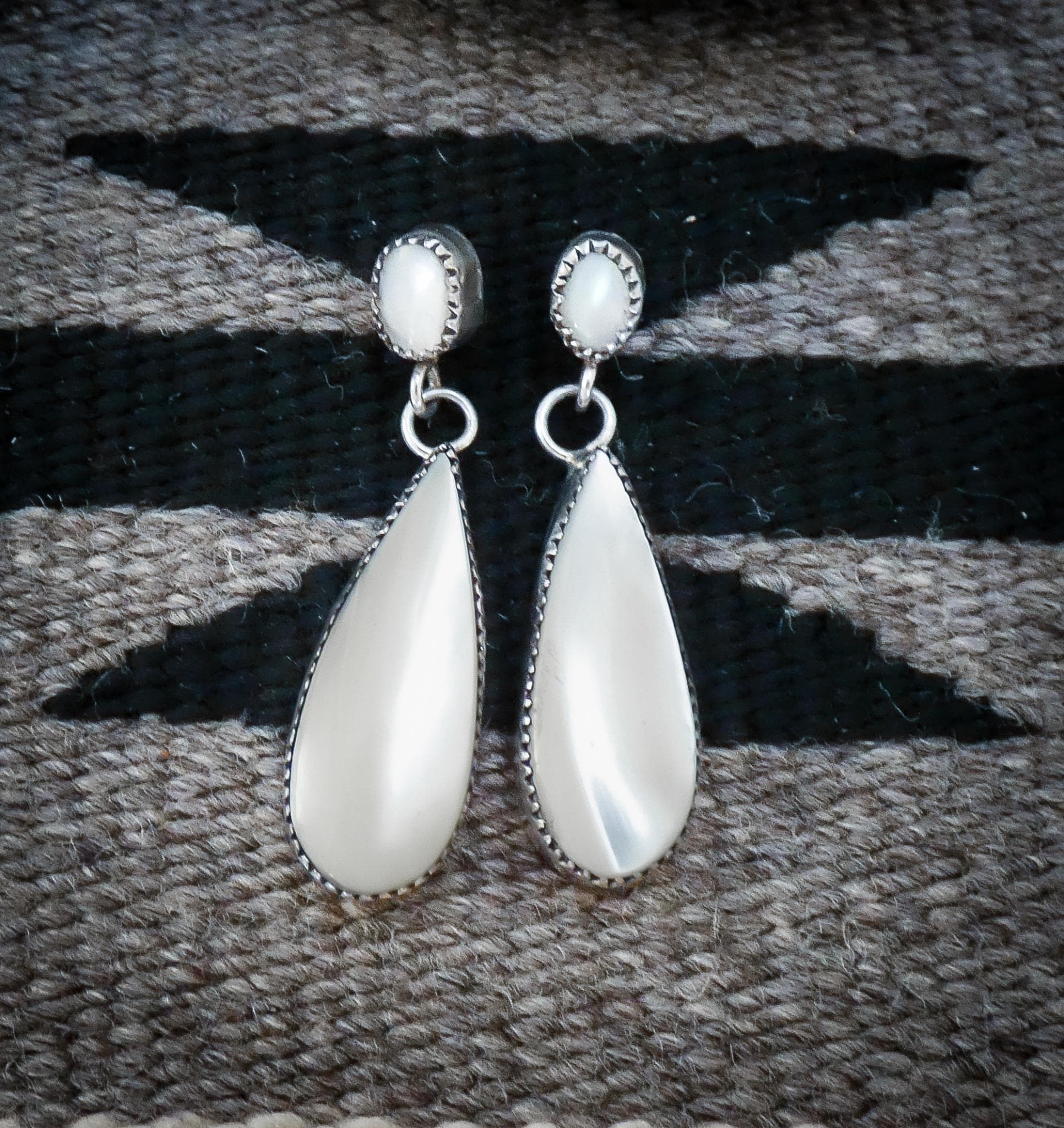 Looking for a classic contemporary look? These elegant Mother of Pearl post dangle earrings are perfect for women of all ages. Long and short hairstyles are fine with this length. They offer handcrafted elegance and Navajo charm! This vintage pair is handcrafted with Mother of Pearl and are set in Sterling Silver. Vintage Native American Navajo Handcrafted in the 80's.