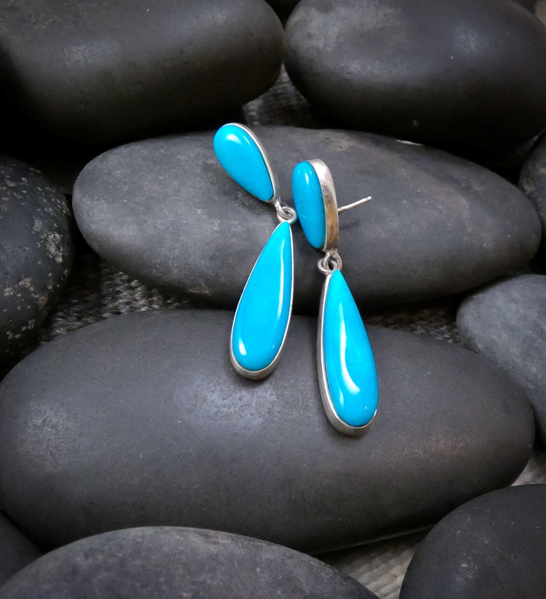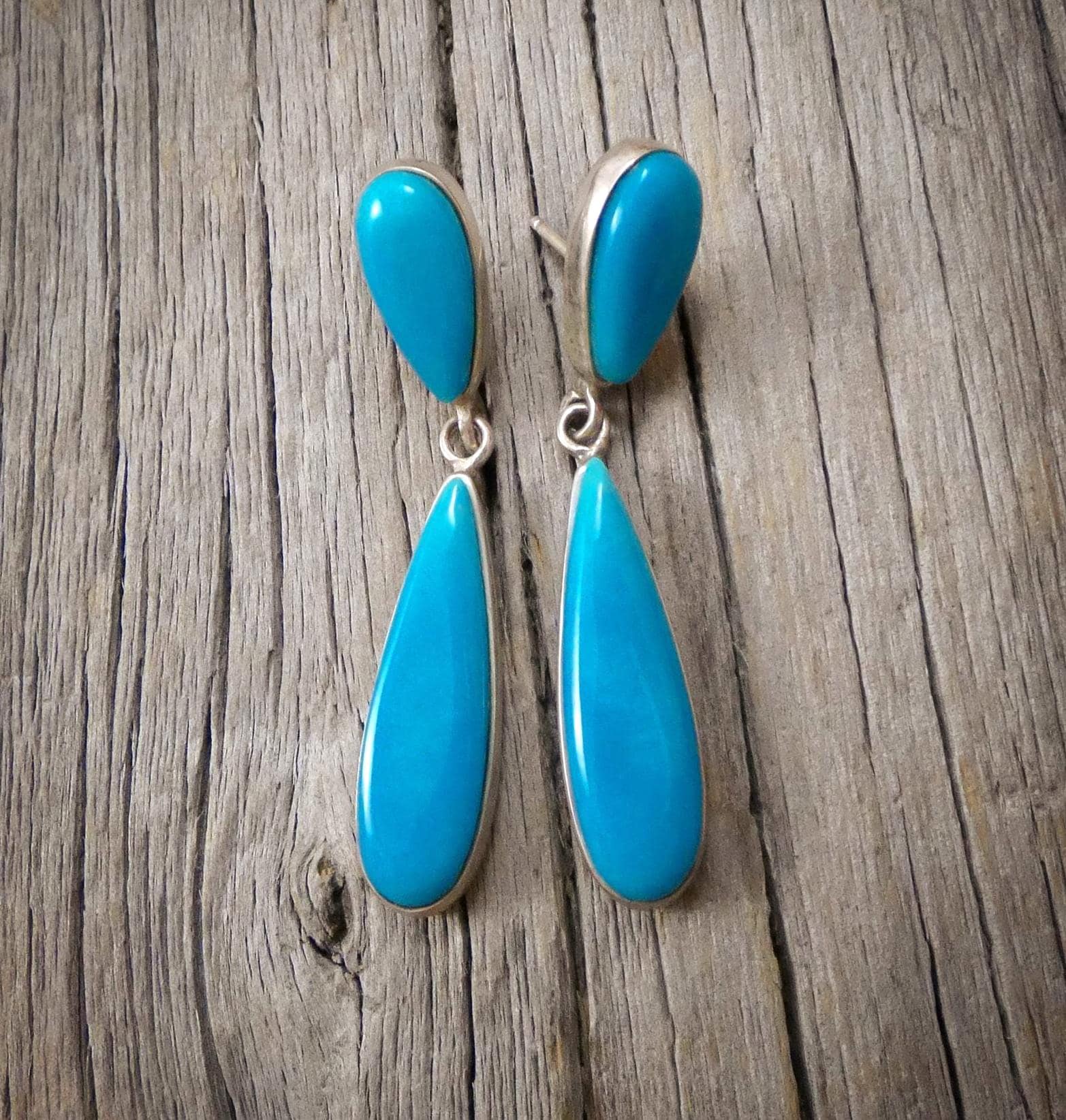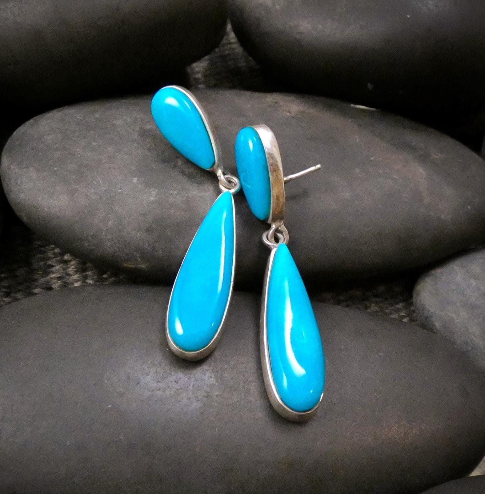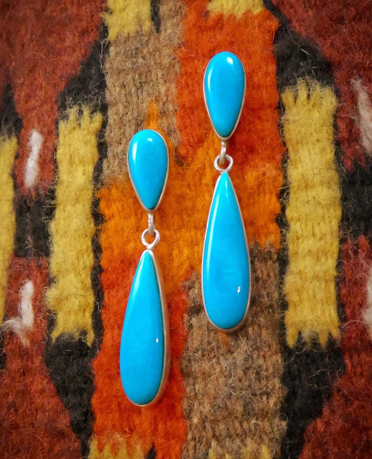 These vintage Native American Navajo post dangle earrings are perfect for women of all ages. Handcrafted with vibrant blue turquoise stones, these earrings will accentuate either long or short hairstyles. They offer handcrafted elegance and Navajo charm! Vintage Native American Navajo, handcrafted in the 80's.