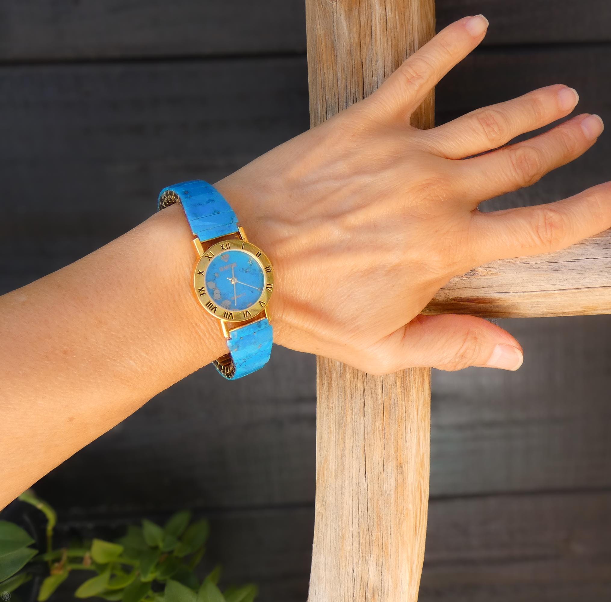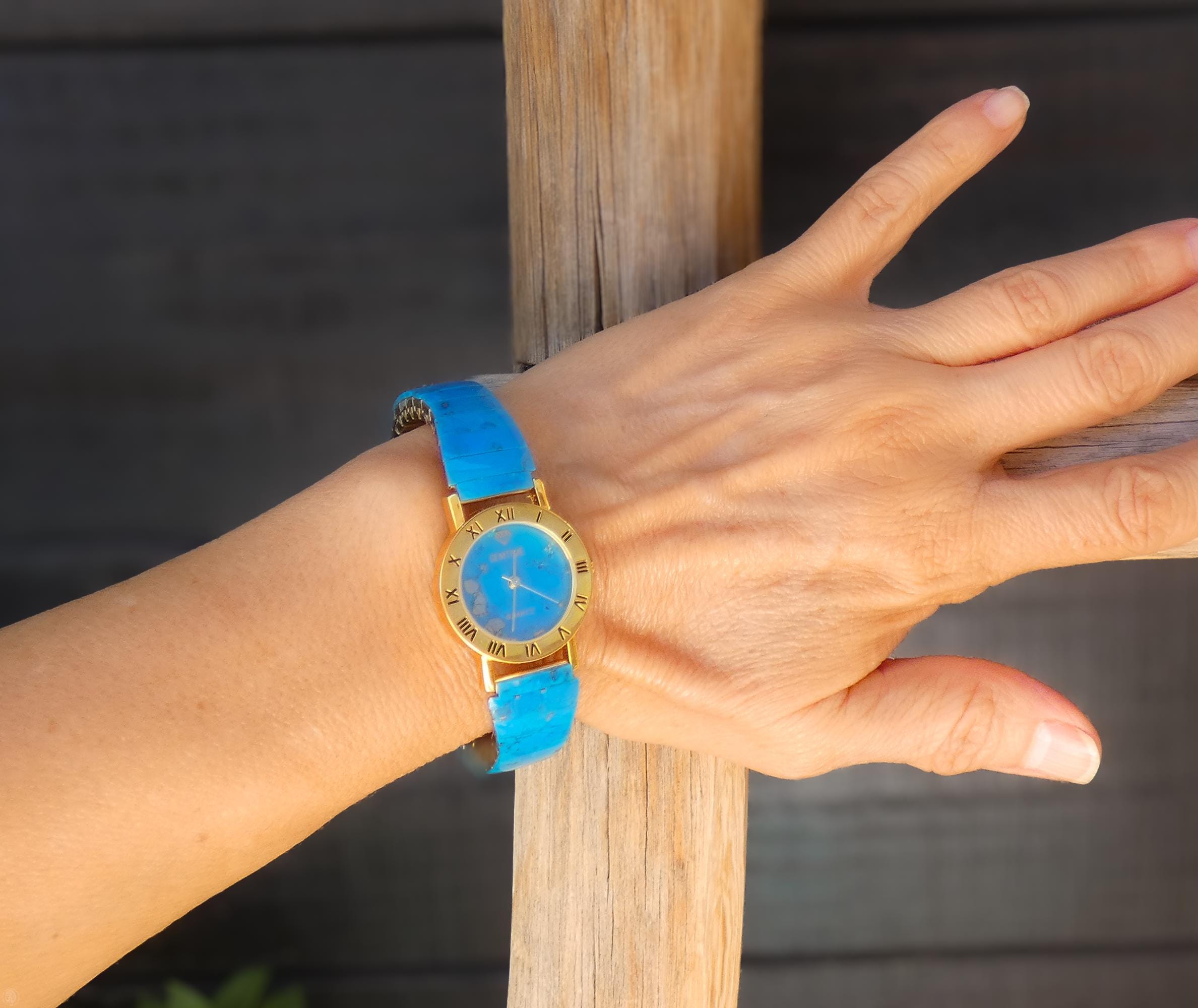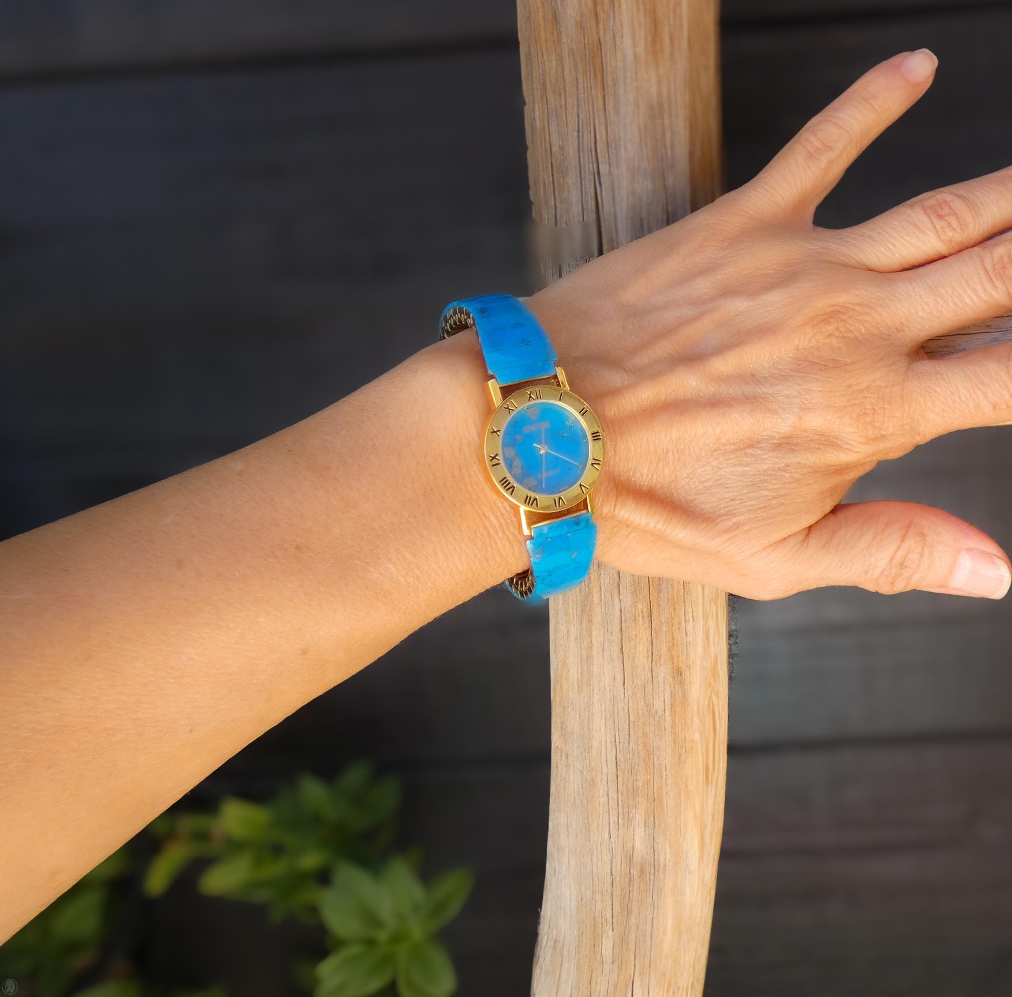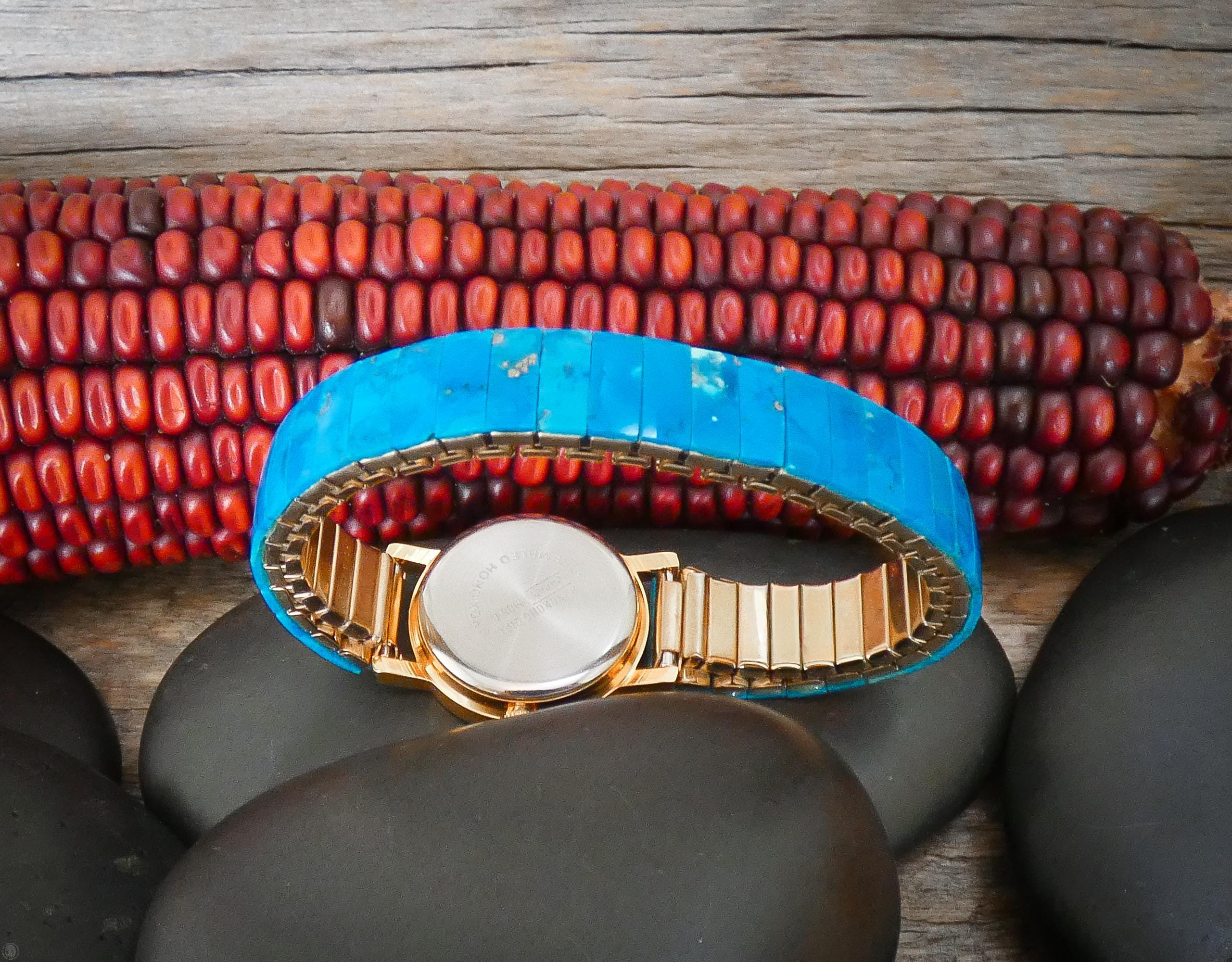 Looking for something that will certainly be noticed with the flick of your wrist? This is the perfect piece for making a statement! This stunning watch displays excellence with Turquoise stones placed perfectly around the entire link design. This accessory is a work of art that you will be proud to show off!