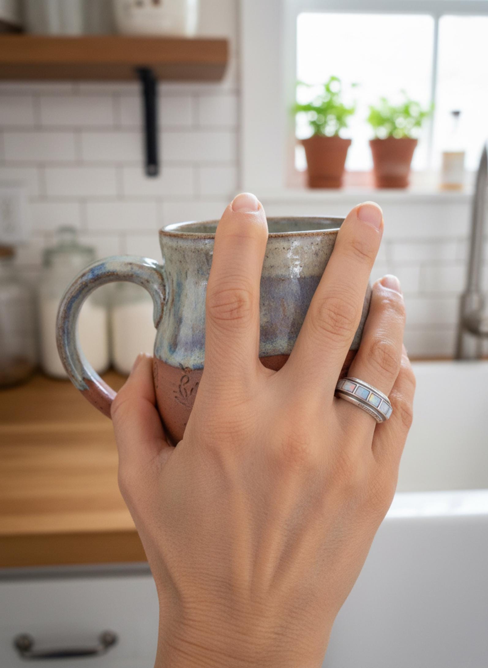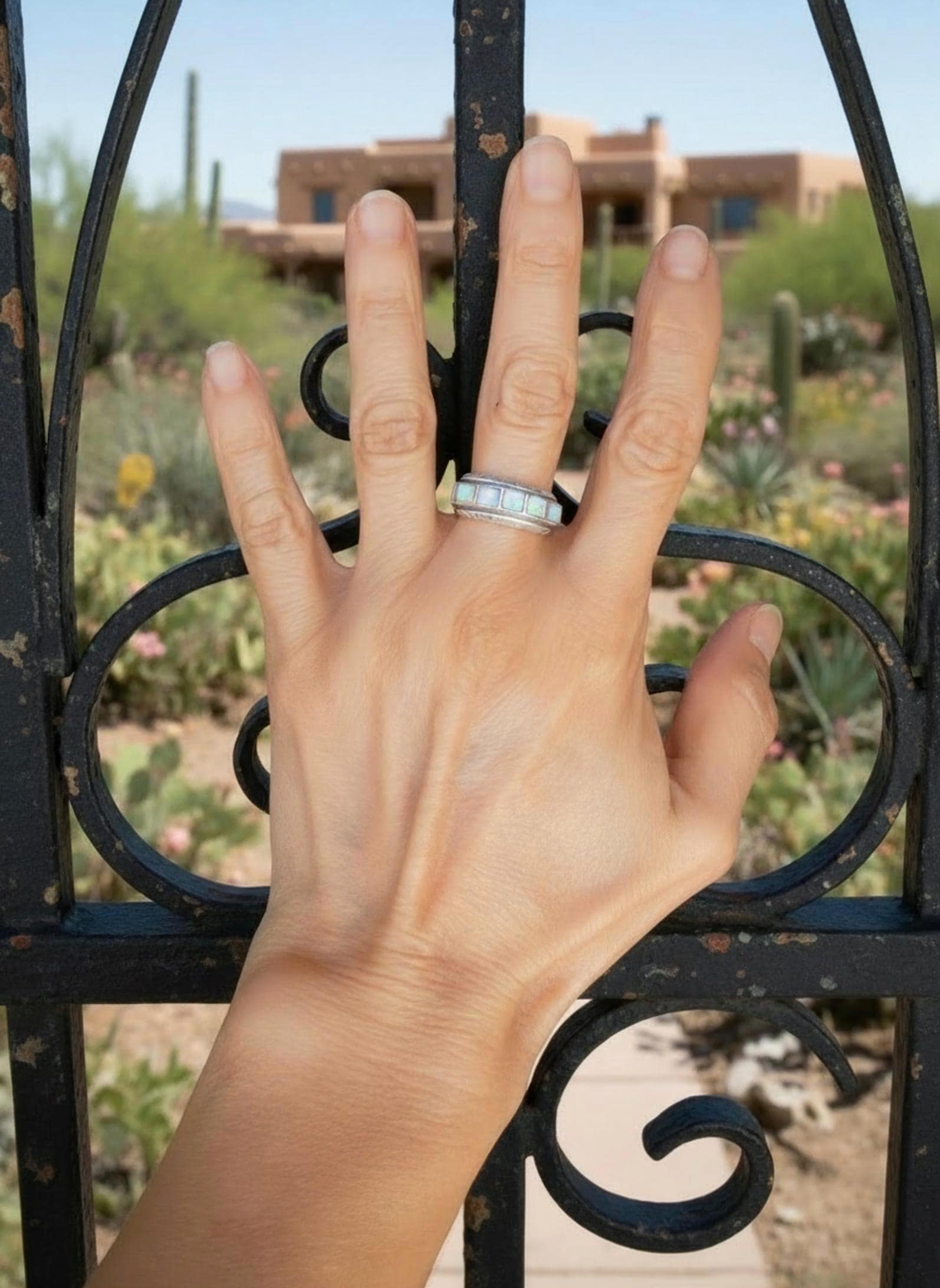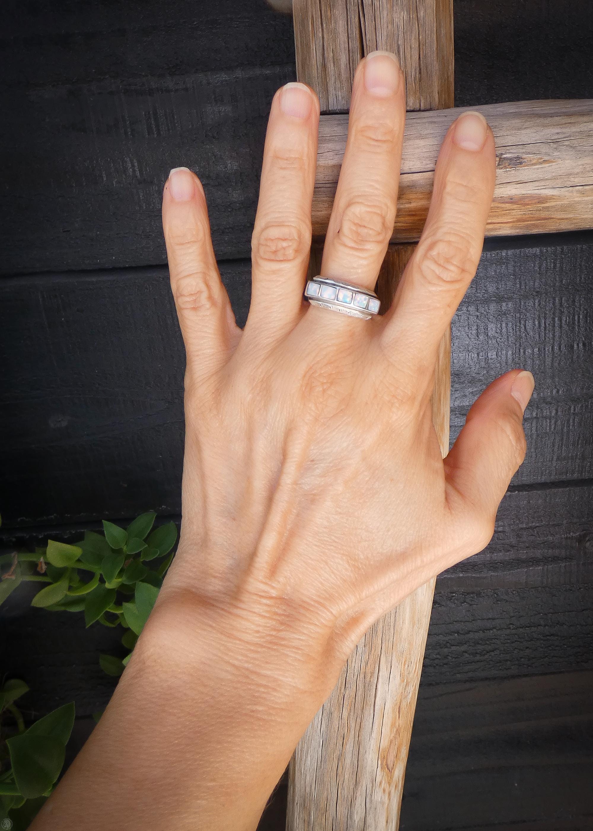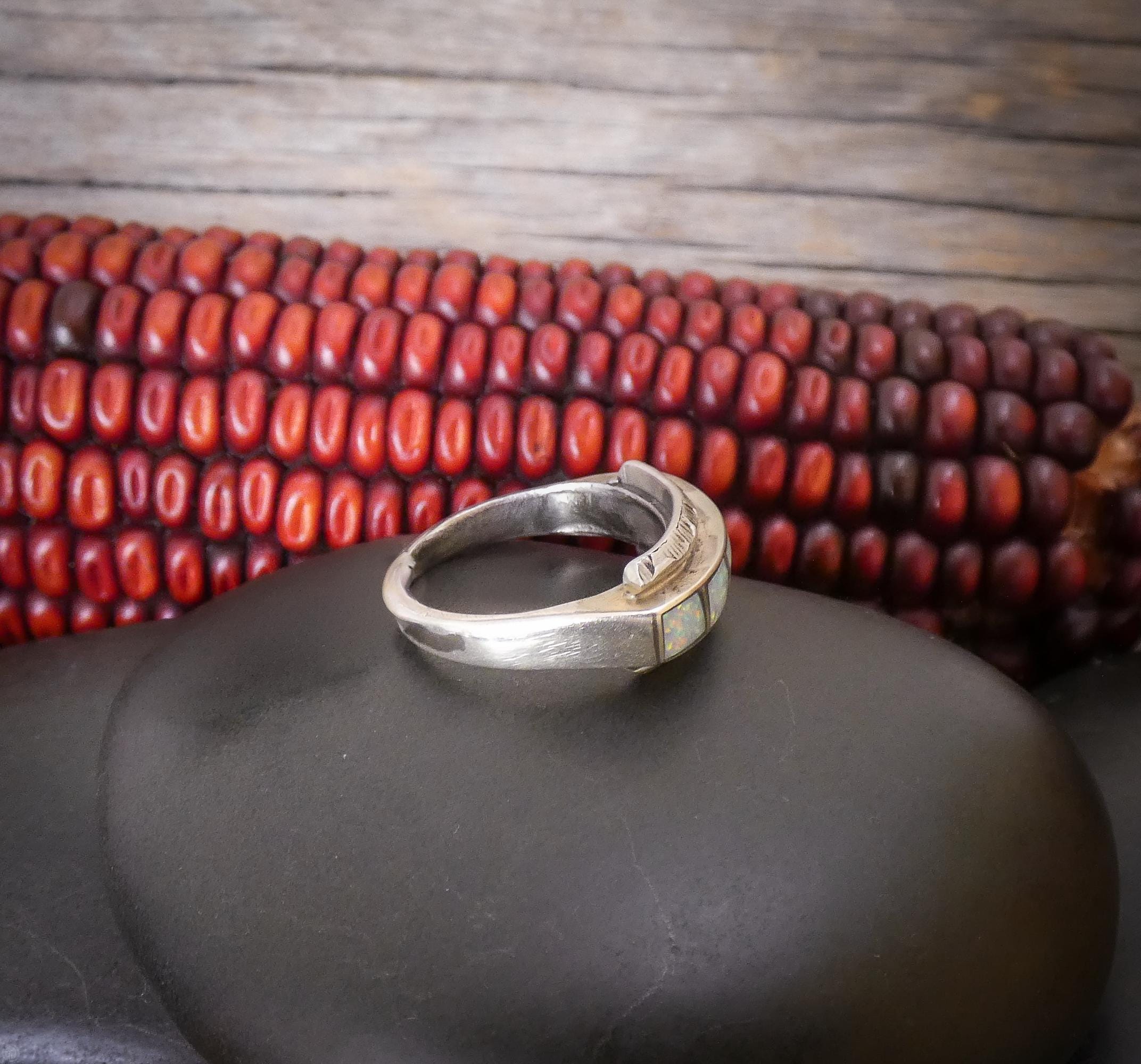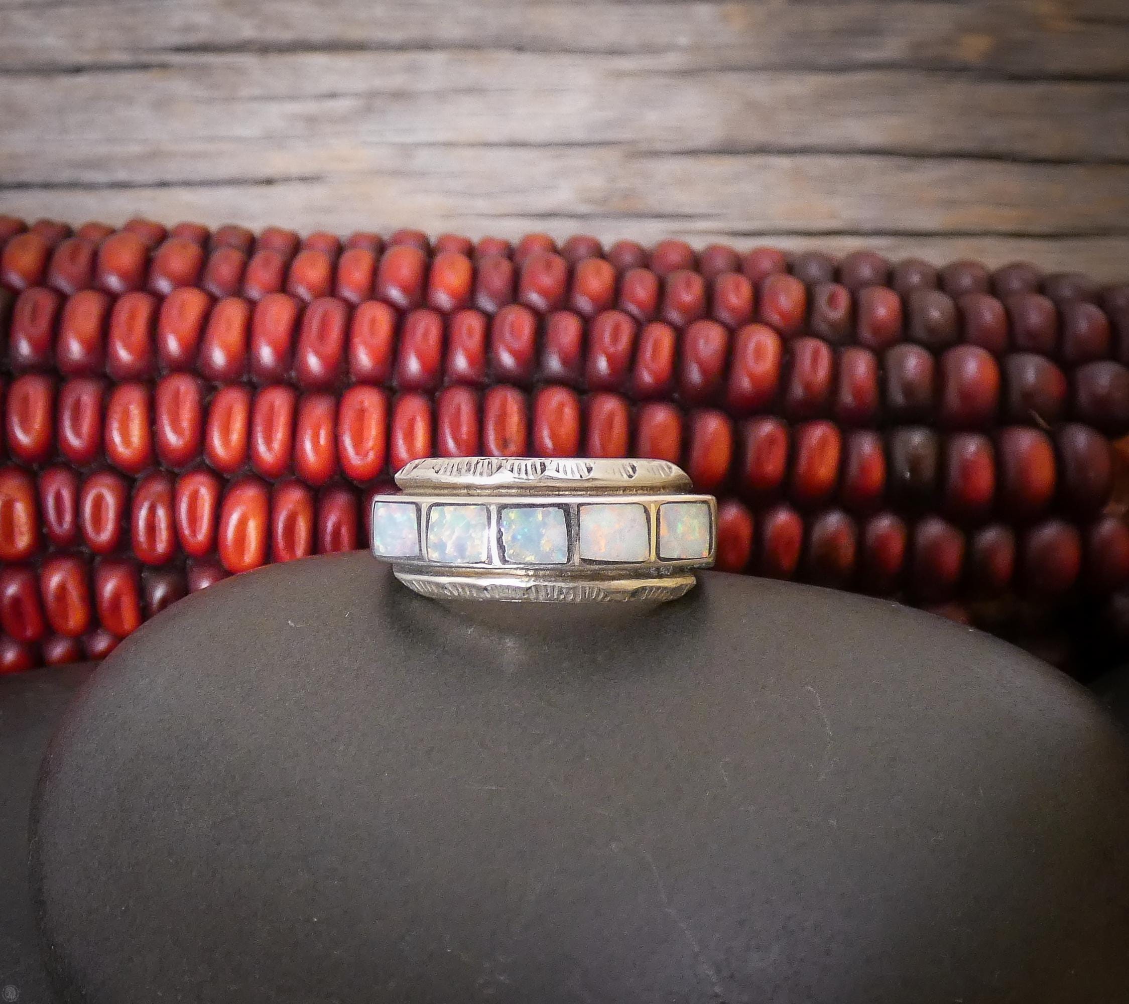 This Zuni ring is handcrafted with Sterling Silver and opal (lab created) inlaid stones. The silver diamond shape lining separating the stones is a creative element that gives the piece its own unique flair! This ring has all the same precision and delicacy that the Zuni silversmiths are known for. The neutral shade is perfect for accessorizing and they really add sparkle to any complexion.