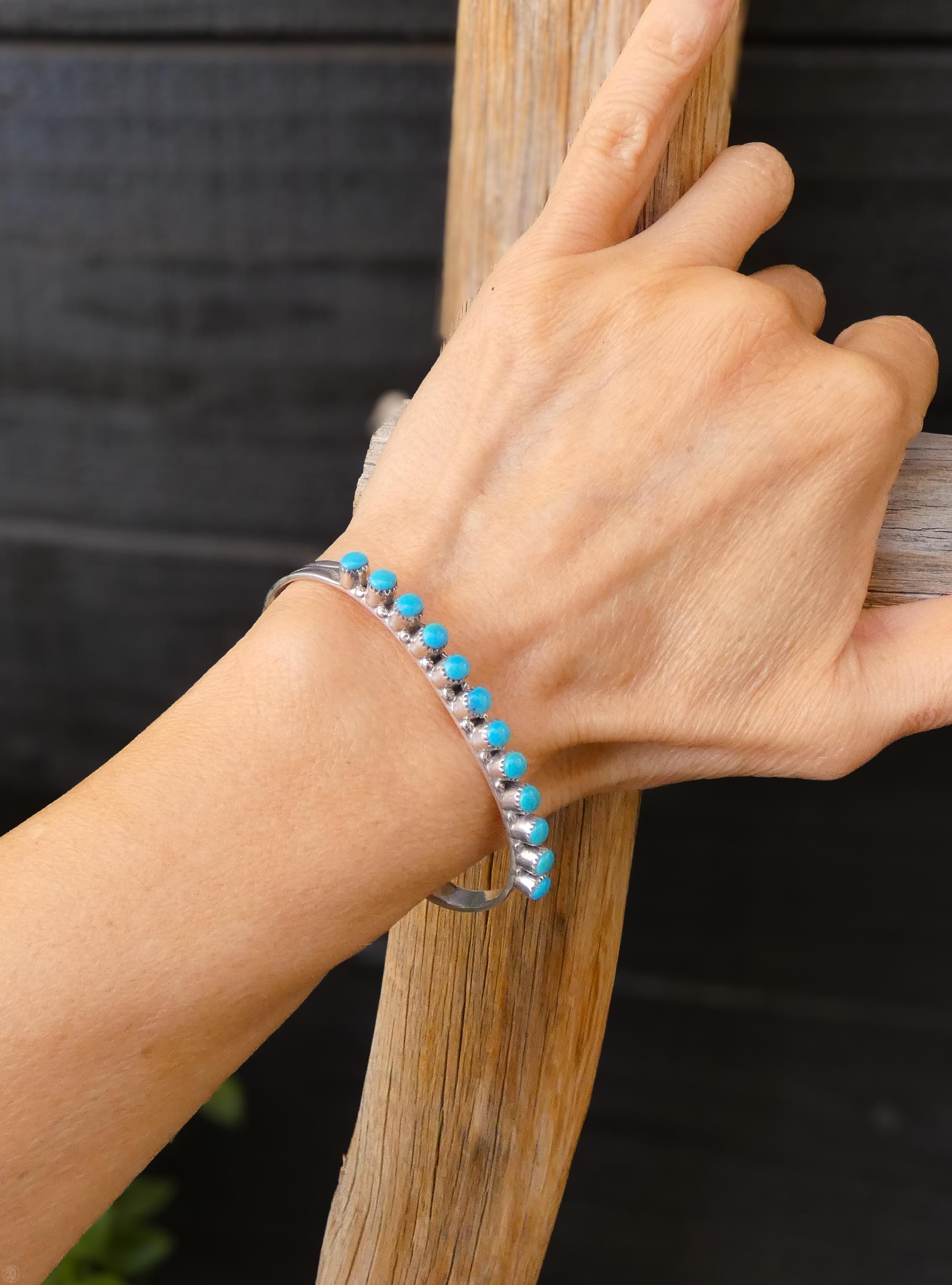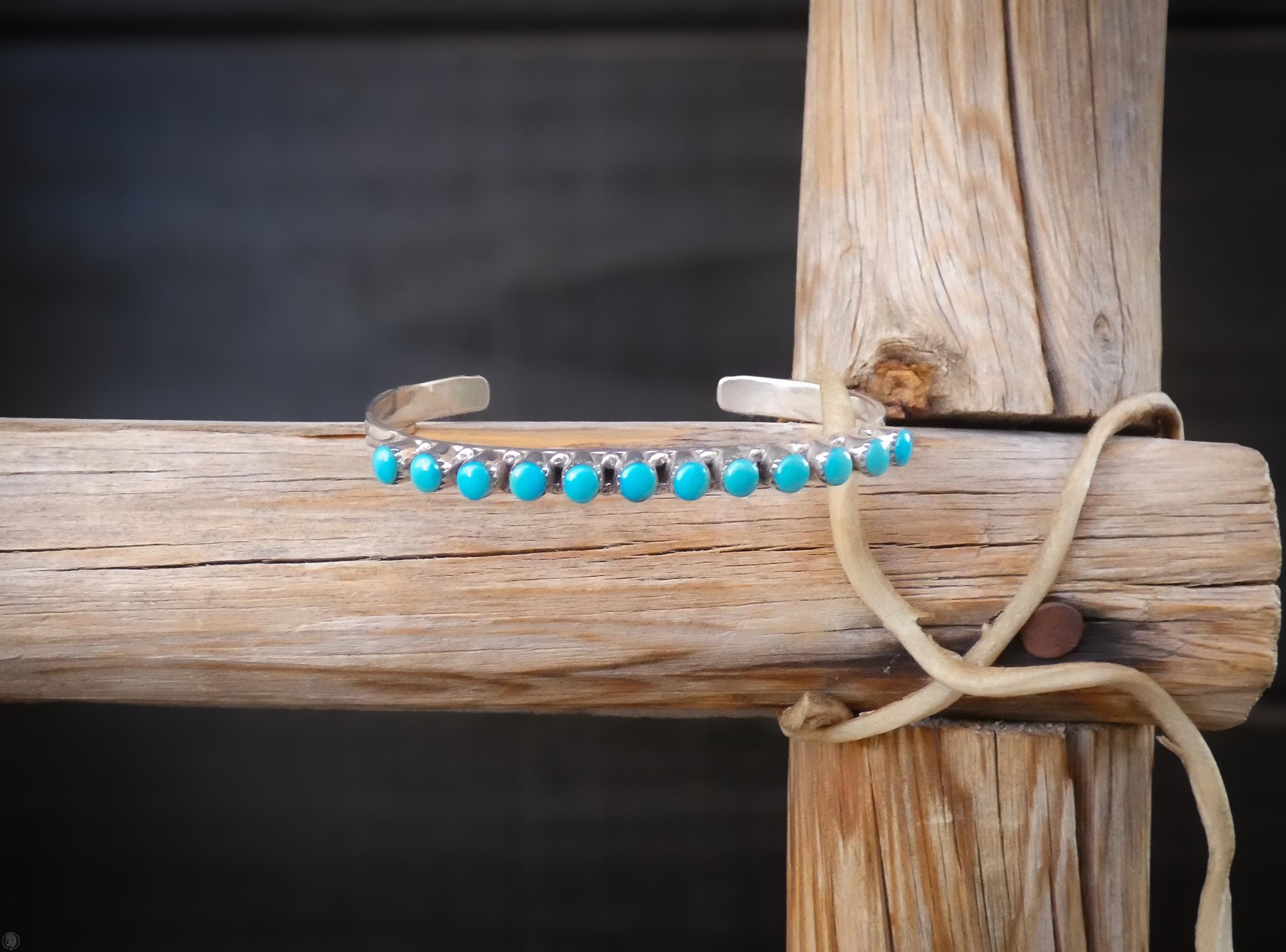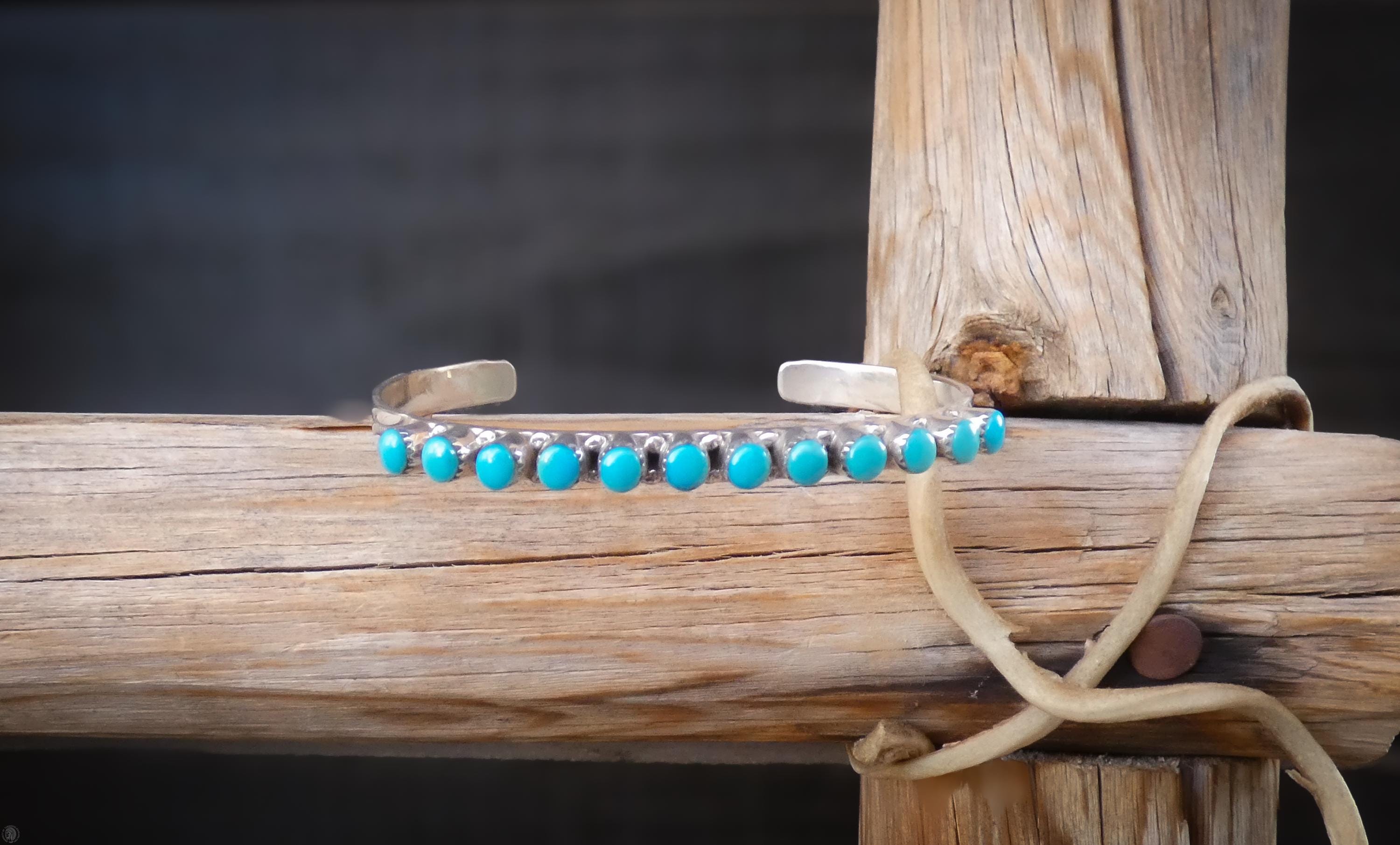 This women's Zuni Bracelet offers a signature touch of culture to your wardrobe. It is handcrafted with Sterling Silver and 10 Turquoise stones set in a traditional yet timeless style.