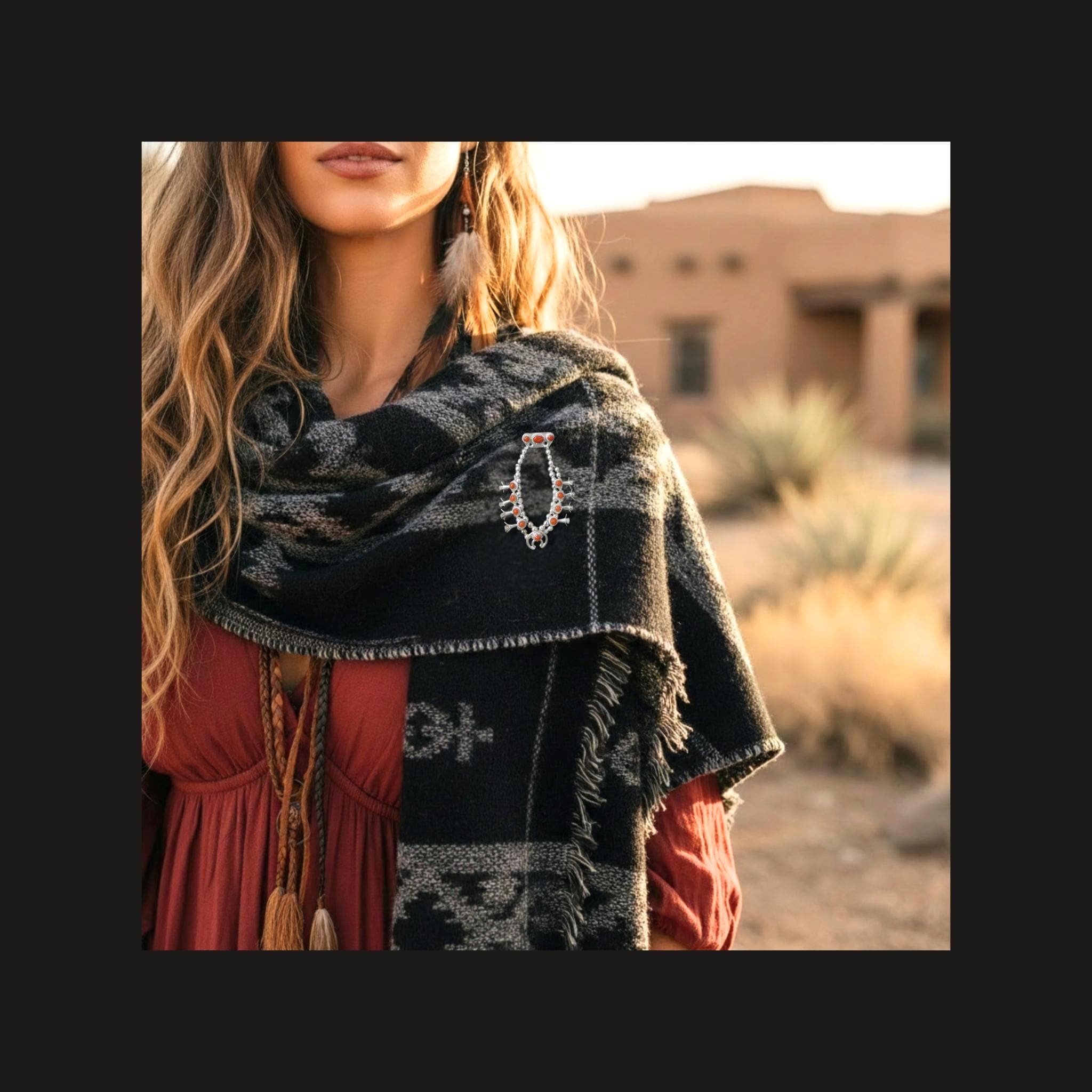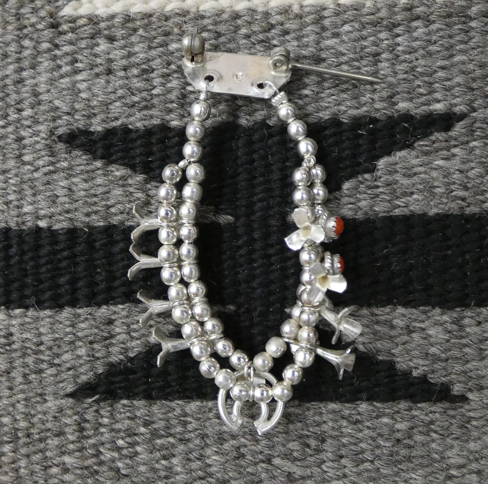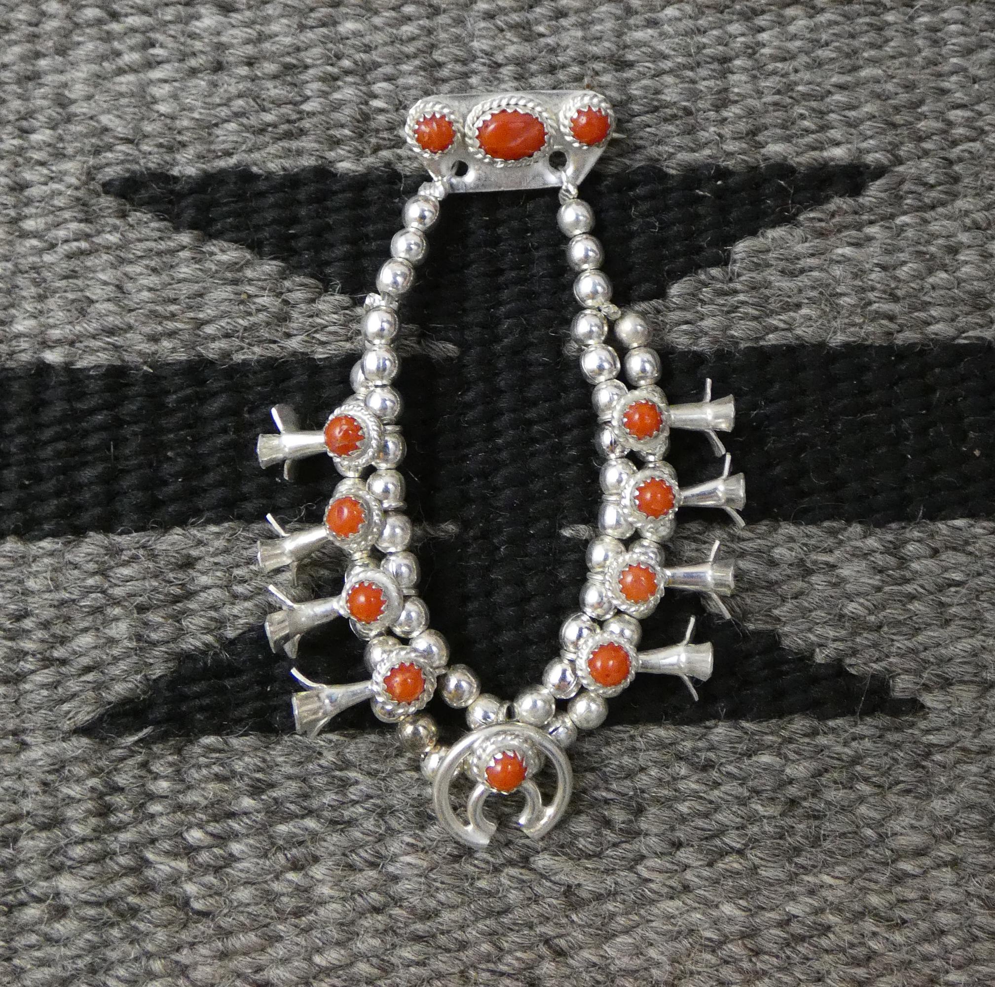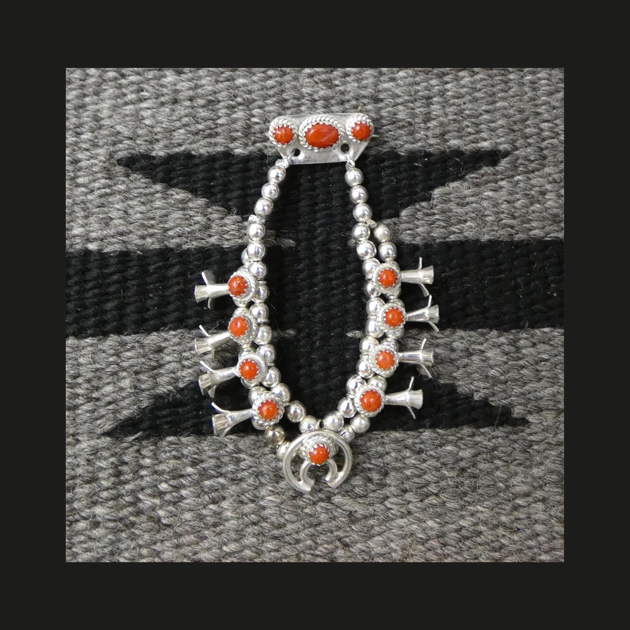 This RARE vintage Navajo Squash blossom brooch pin is handcrafted from Sterling Silver and Coral. This delicate silversmith piece is something to treasure, as coral is not used in jewelry work anymore which goes to show you how old this piece is. This brooch was crafted in the 80's which make it vintage. Native American Navajo Handcrafted. Vintage, never worn.