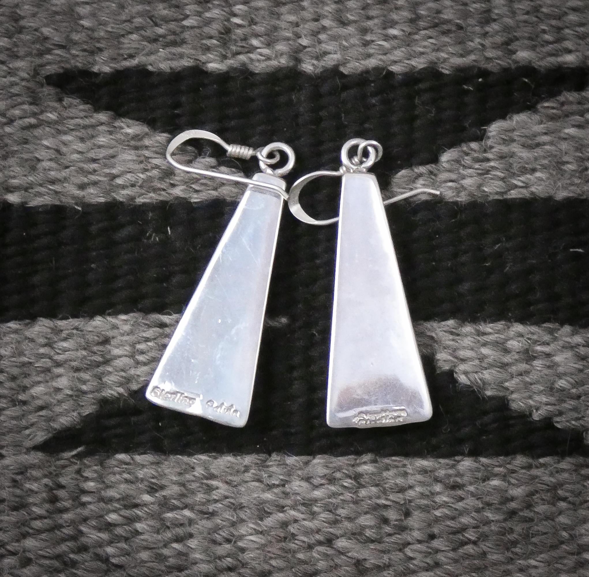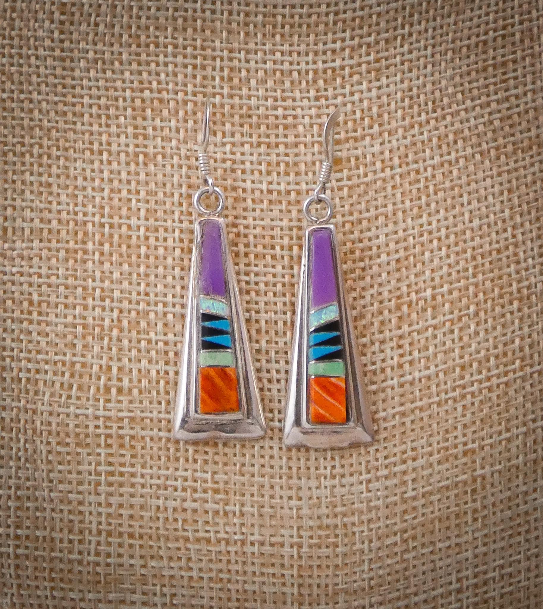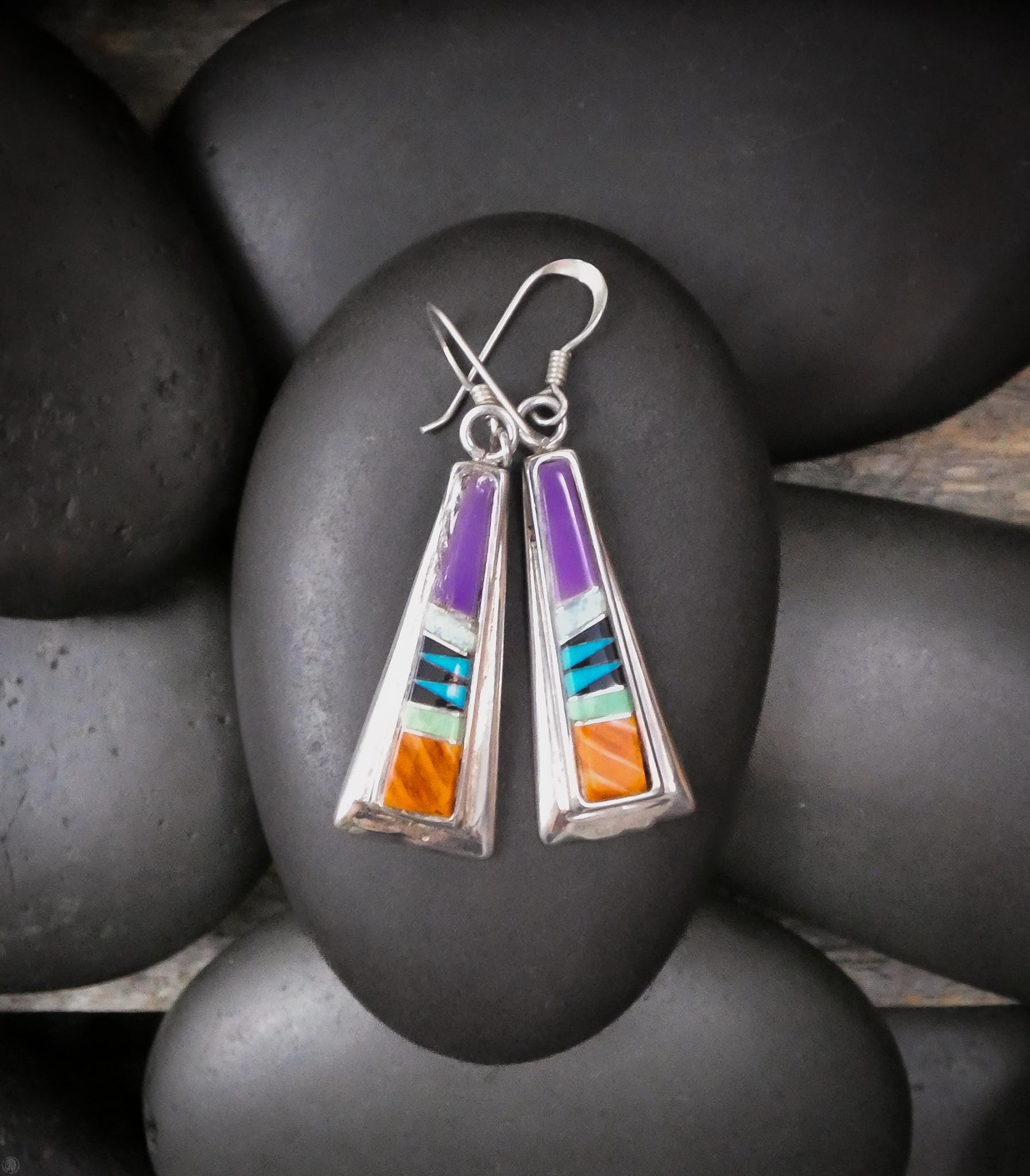 These vintage Navajo handcrafted Dangle Earrings feature Turquoise, beautiful Black Onyx, Spiny Oyster, Mother of Pearl and Gaspeite. Artisan Calvin Begay used many different stones to craft a spectacular piece of jewelry. Calvin Begay jewelry is in high demand! Vintage and handmade 1990's.