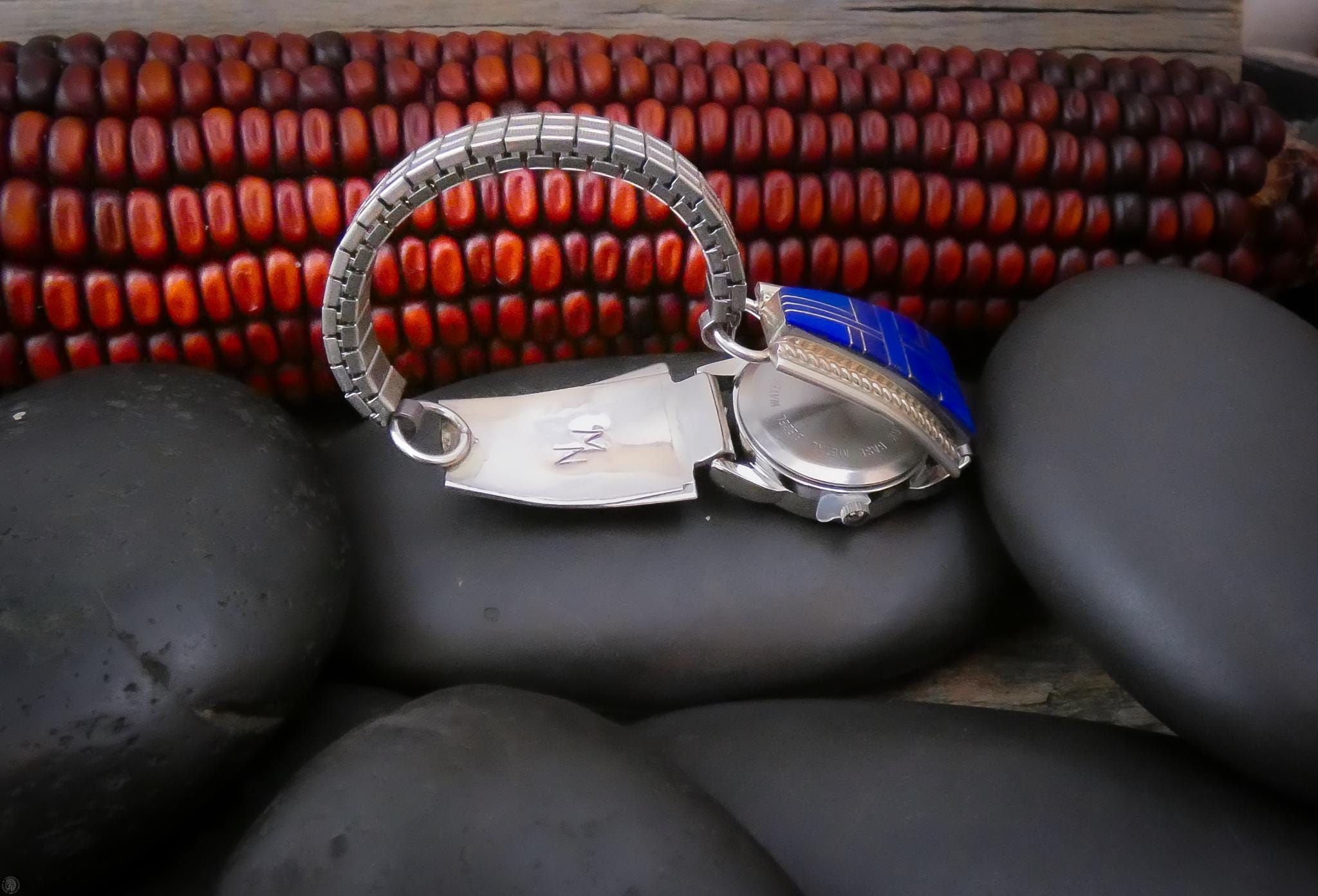 Gorgeous and unique, this is the perfect piece for you. As you can see, the detail is amazing! This women's watch is a wonderful example of Native American tradition and culture. It is handcrafted by Navajo artisans from Sterling Silver. The tips of this watch are adorned with Lapis. This is a vintage item, never worn.