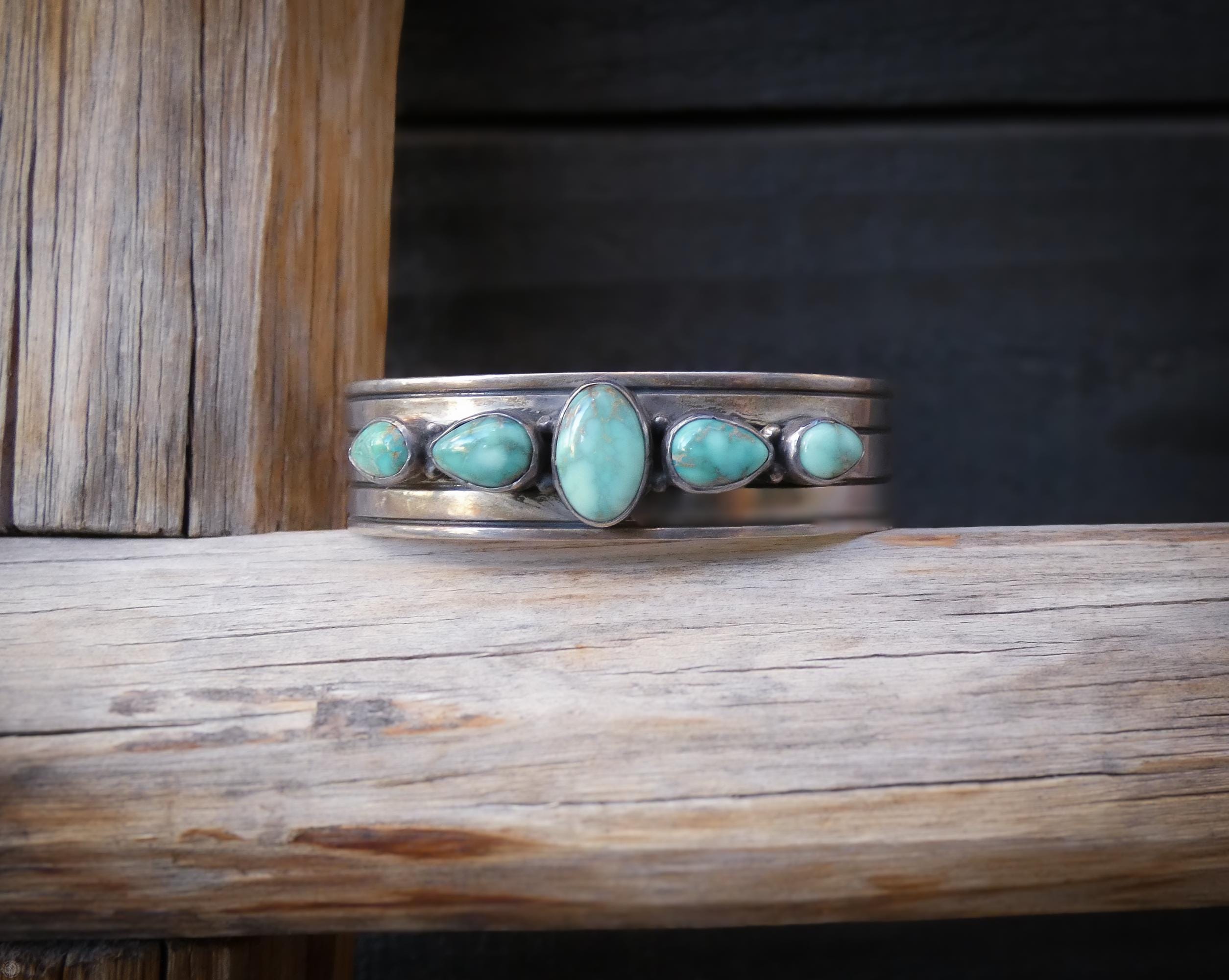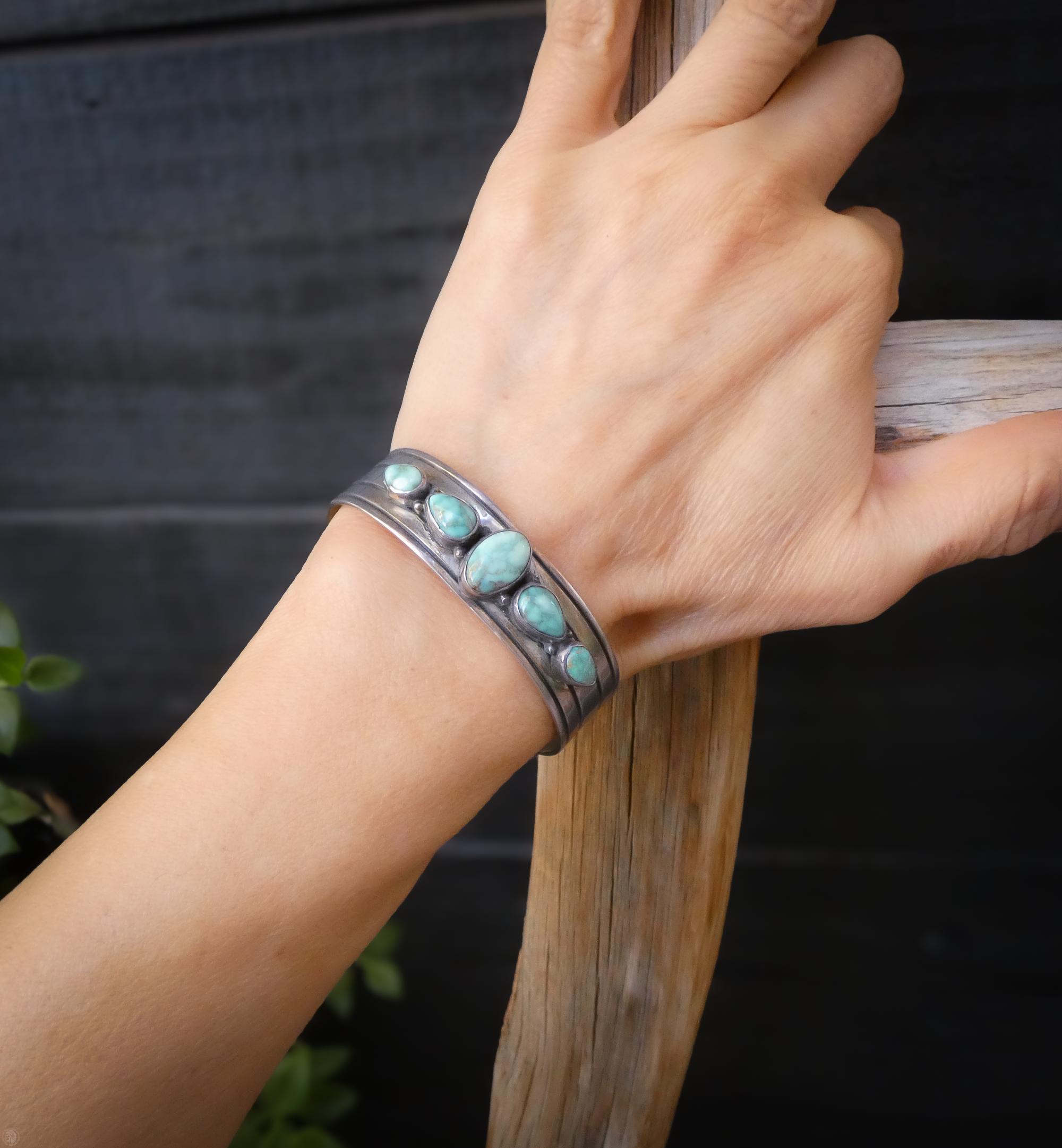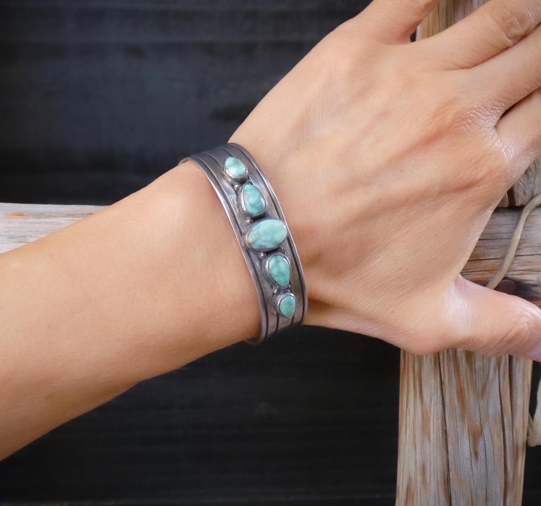 This Vintage Native American Navajo bracelet is handcrafted in Sterling Silver and features a soft green Nevada Turquoise stones. Easy to wear, this is that special accessory that will be cherished for a lifetime!