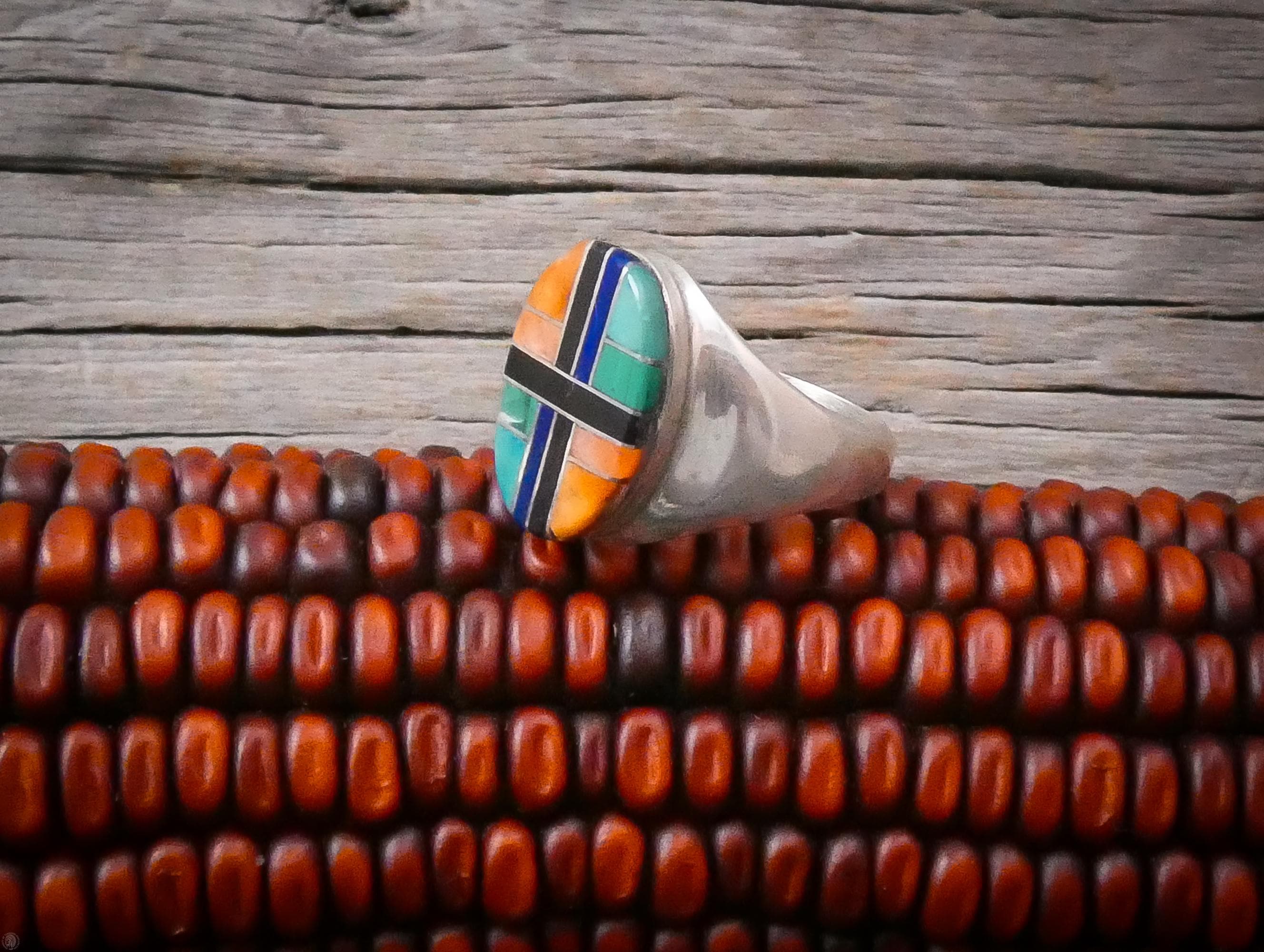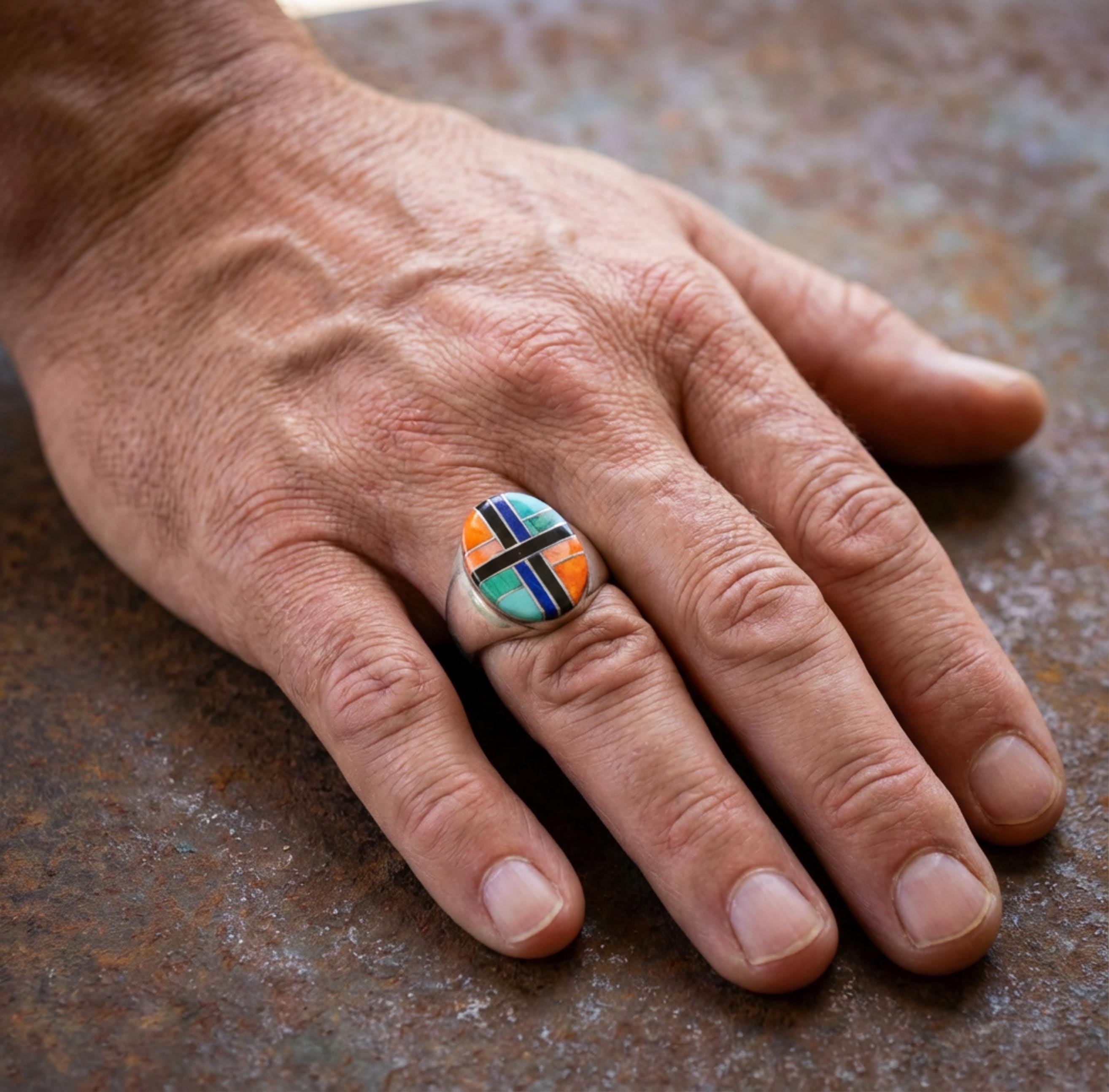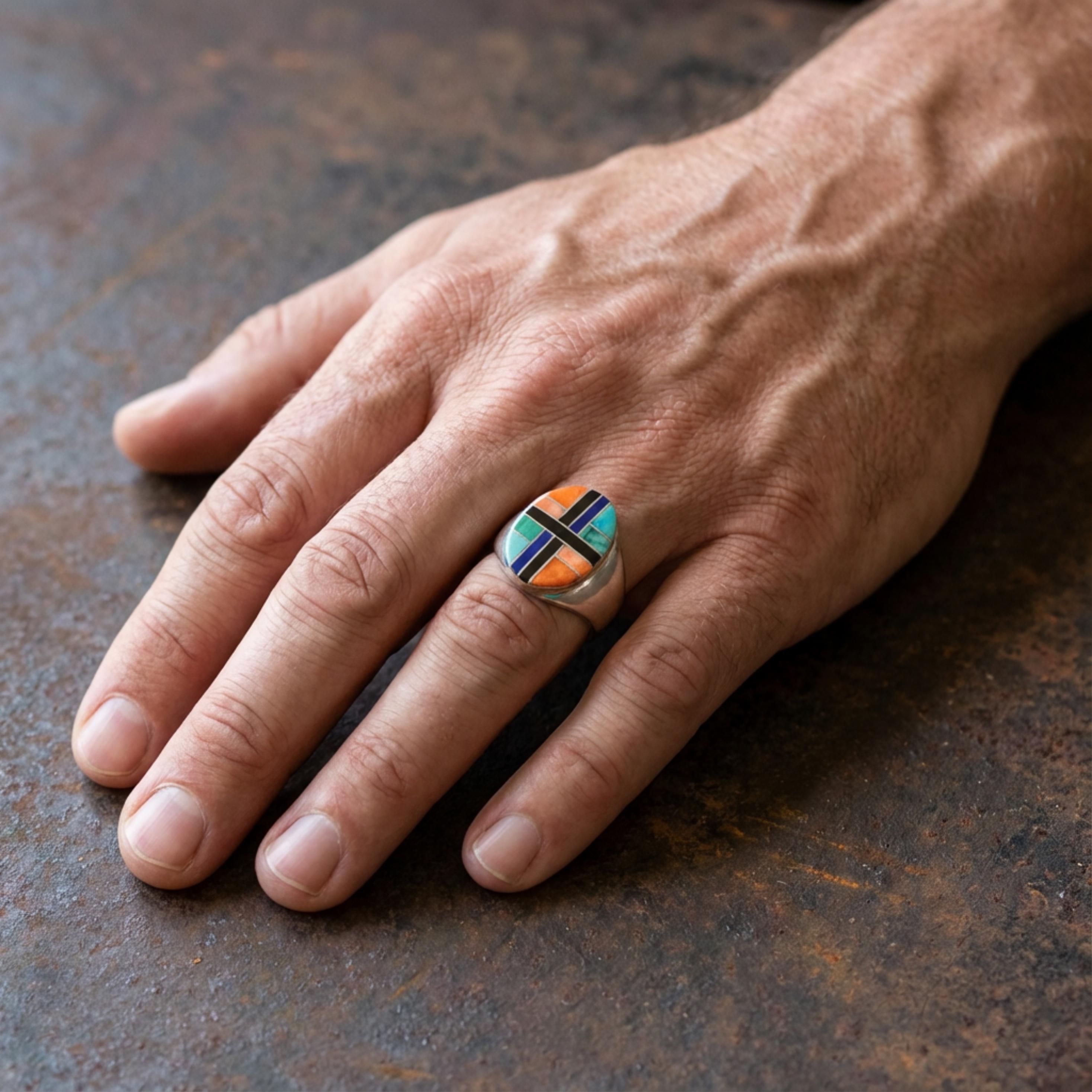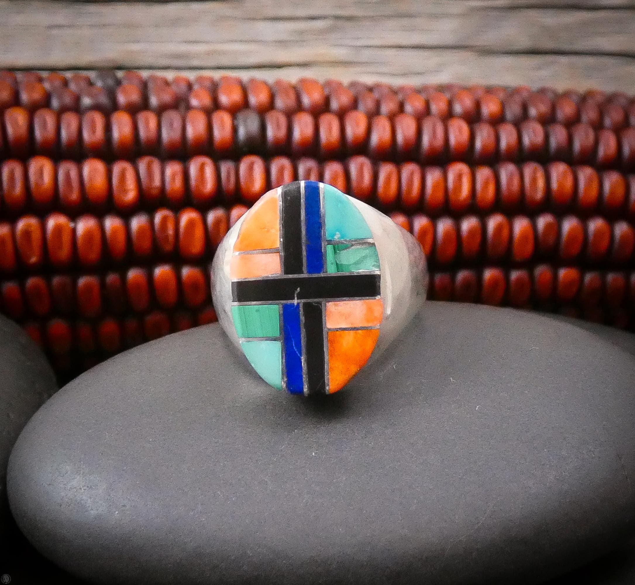 This beautiful ring is handcrafted with Sterling Silver and inlaid with Onyx, Malachite, Turquoise, Spiny Oyster and Sugilite. It is a very elegant, contemporary design with it's clean, smooth lines, and vibrant classic color.