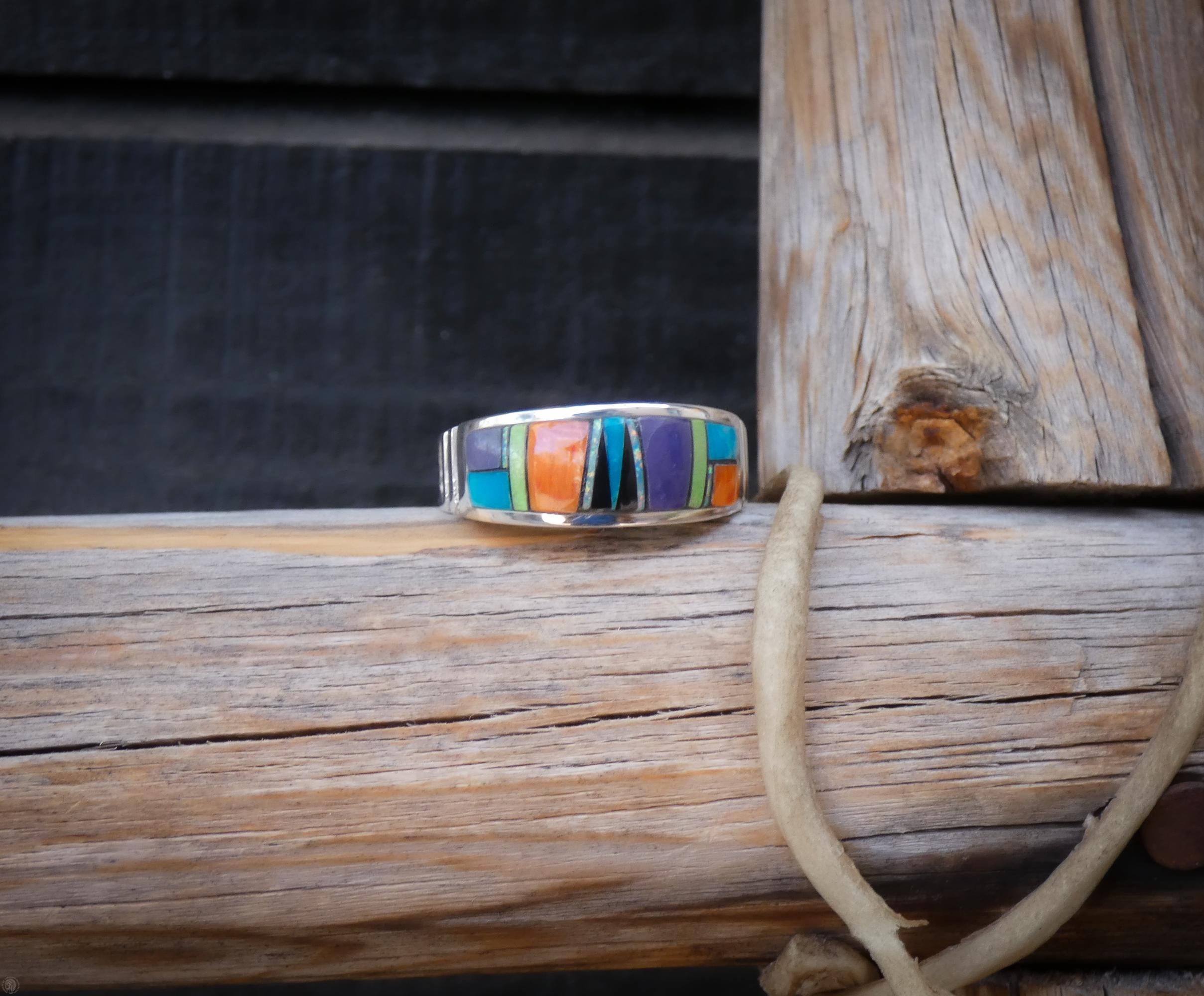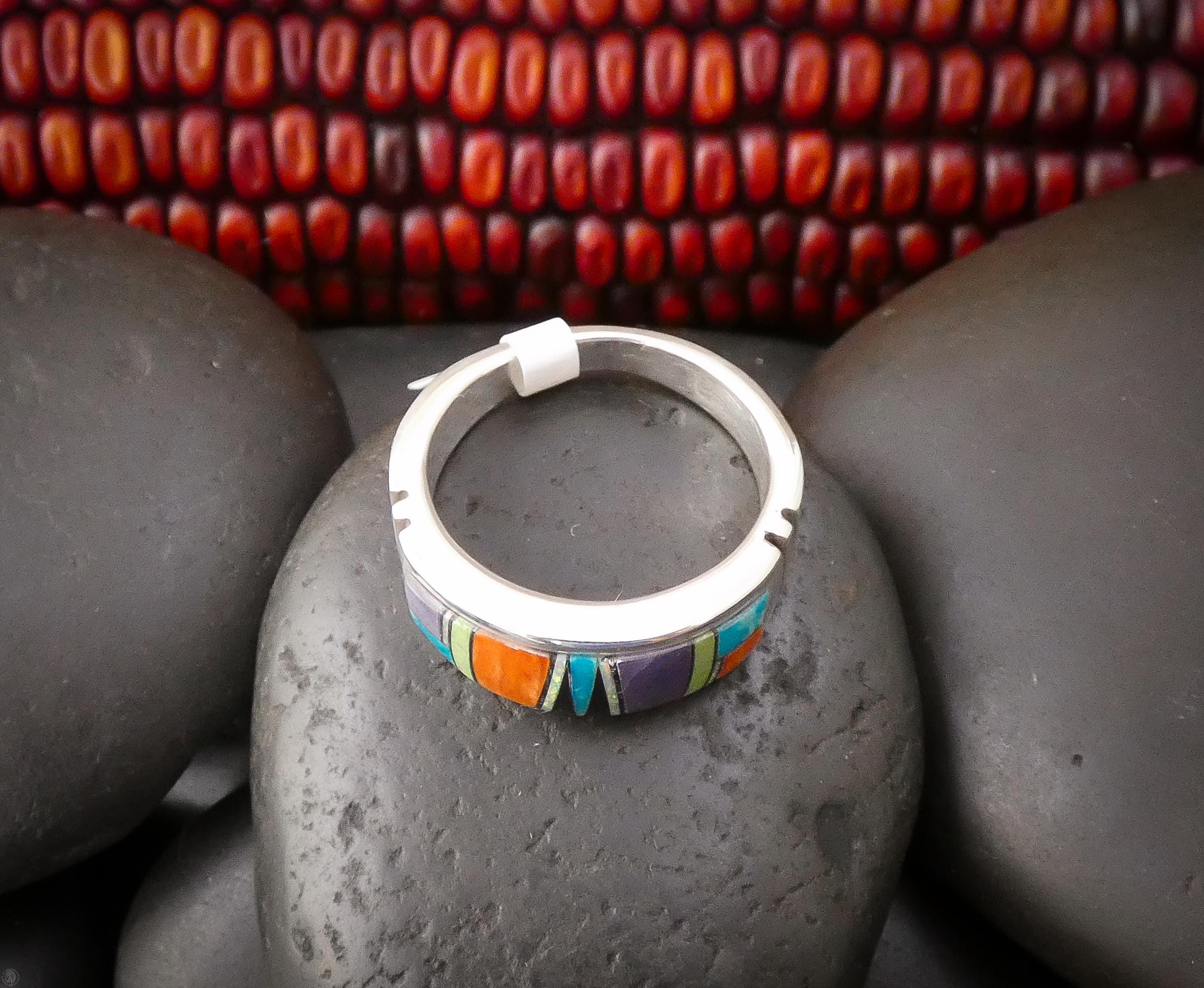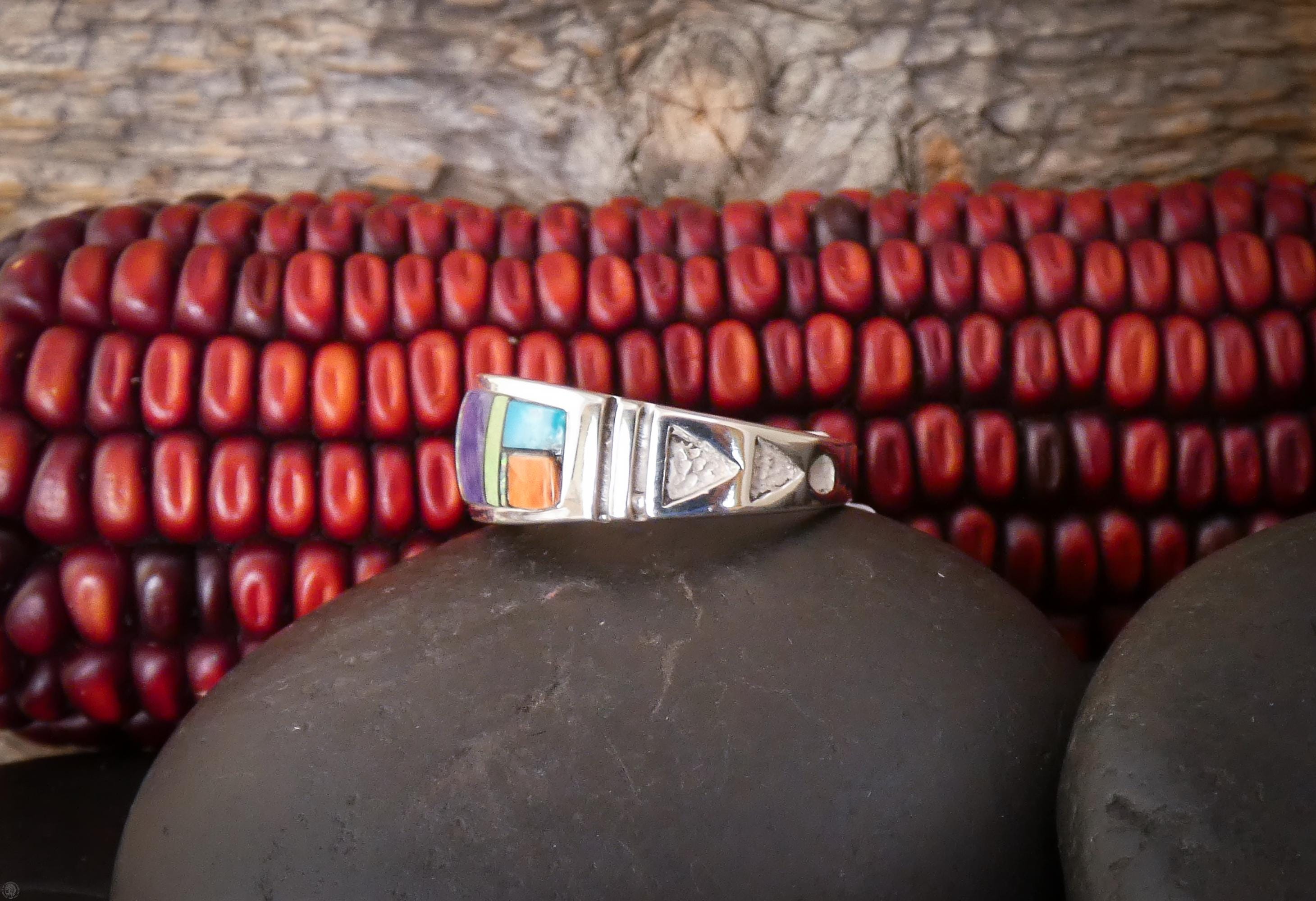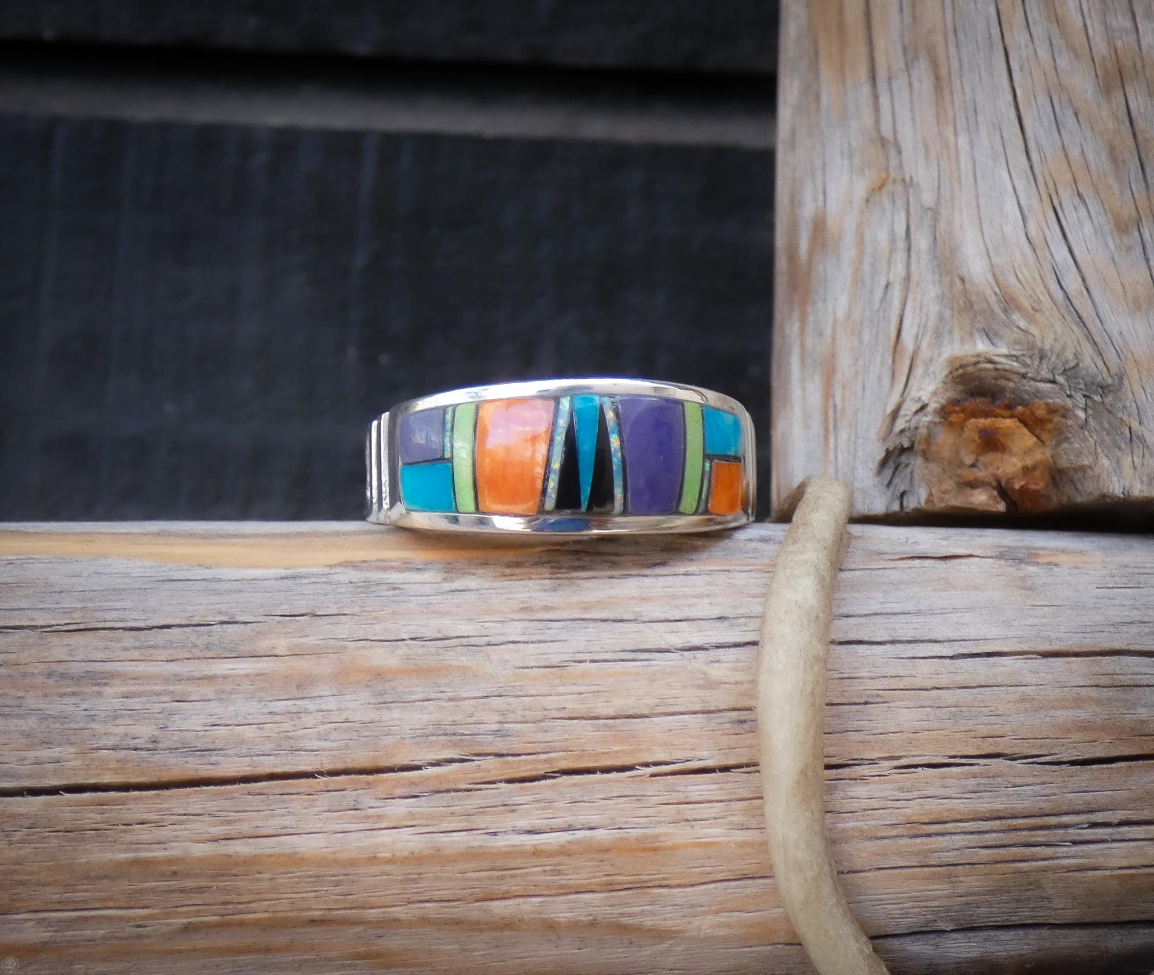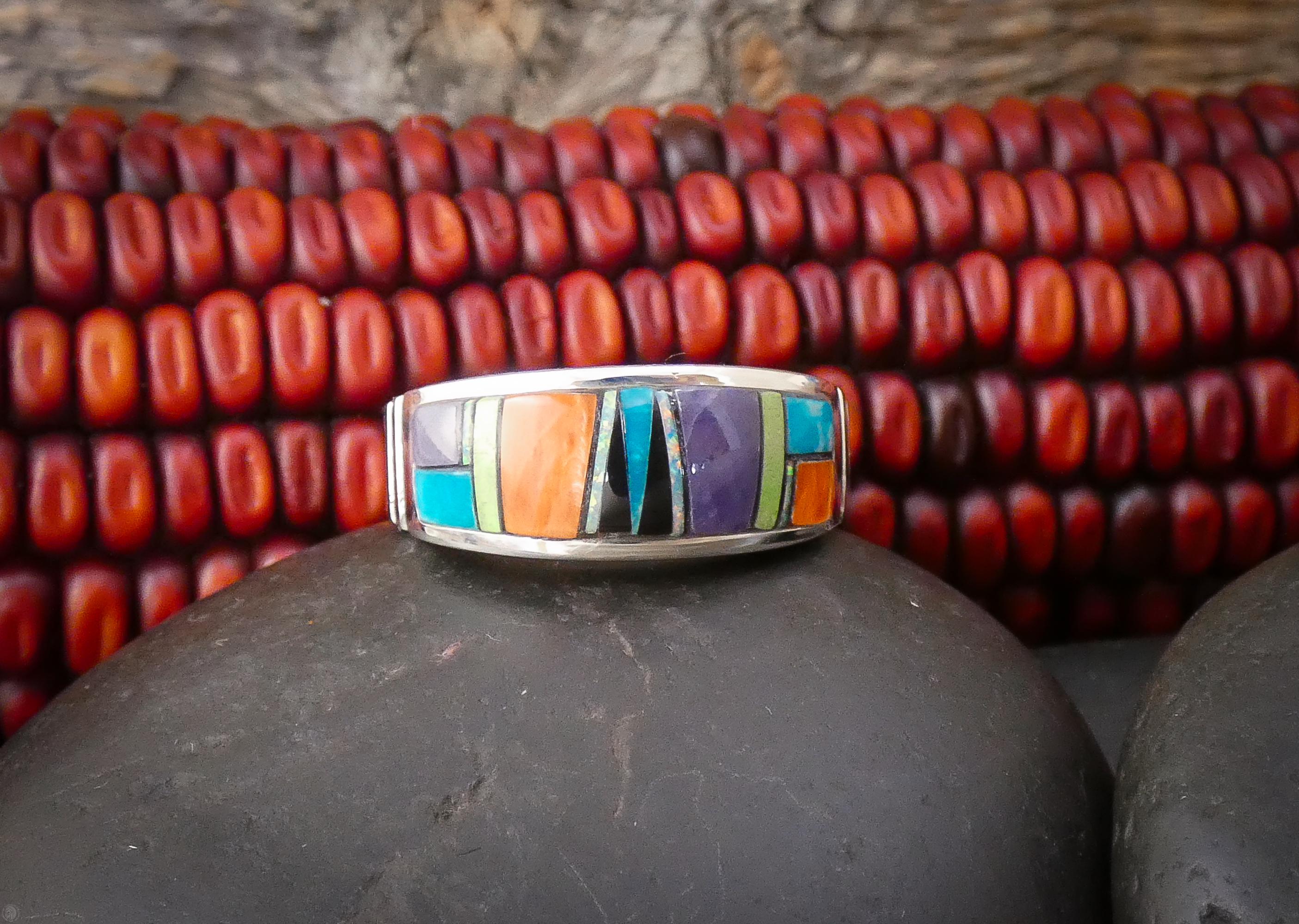Each stone is carefully selected and fitted by hand, creating a vibrant mosaic of color and craftsmanship that reflects the skill and heritage of Native American silversmithing. The result is a striking yet wearable band that feels both timeless and distinctive.
