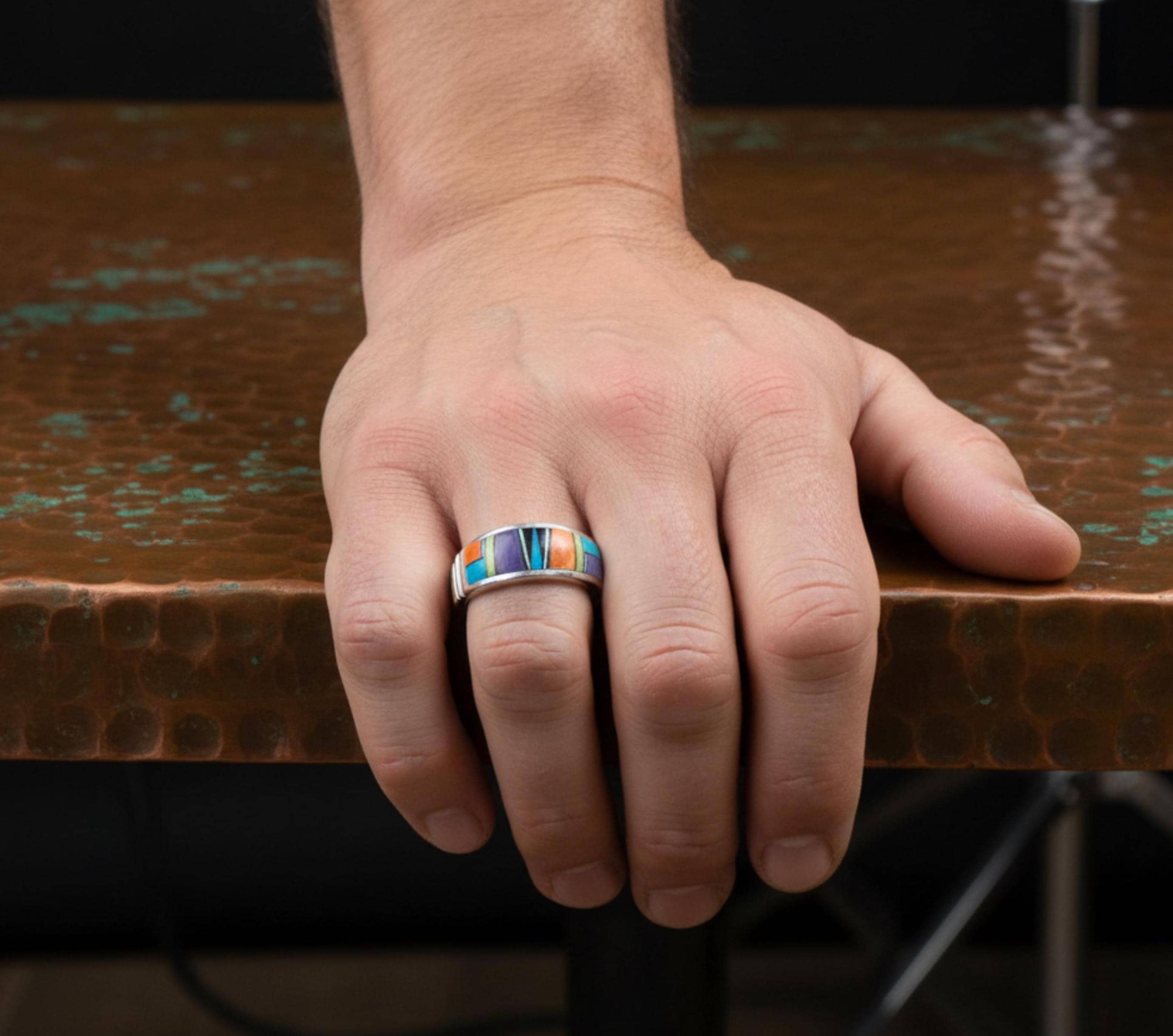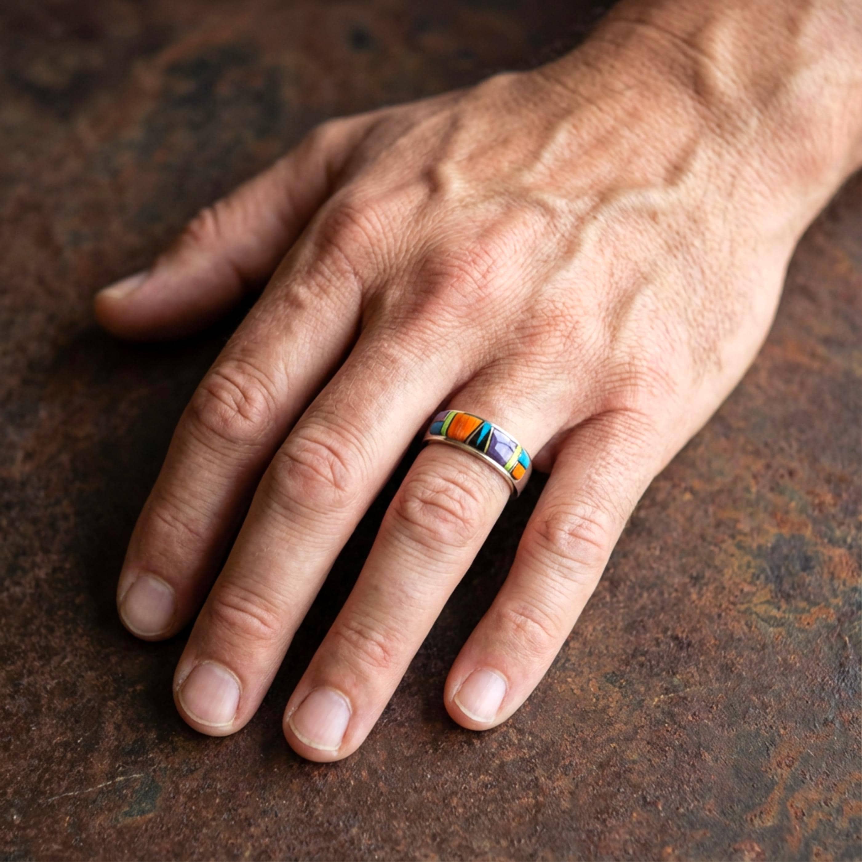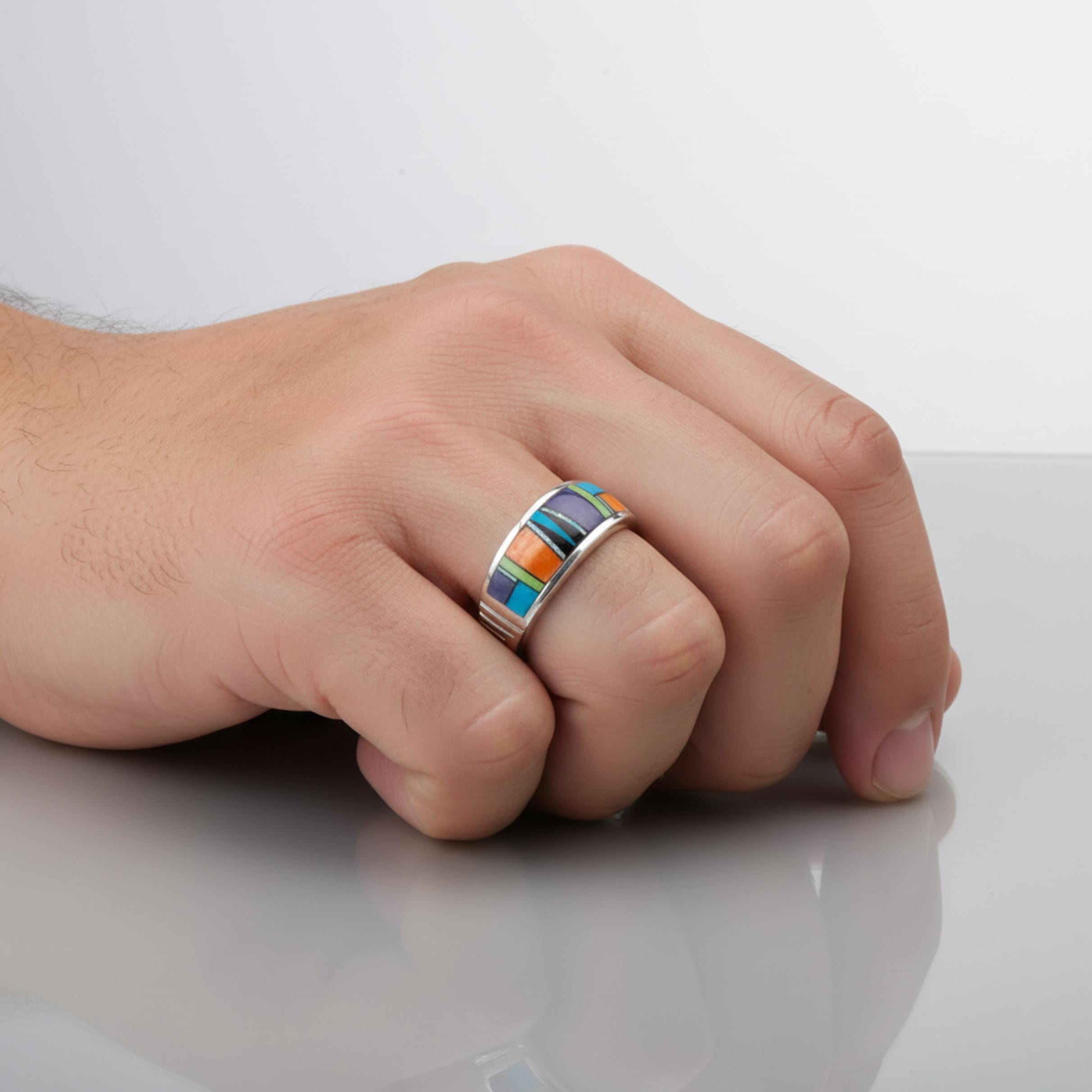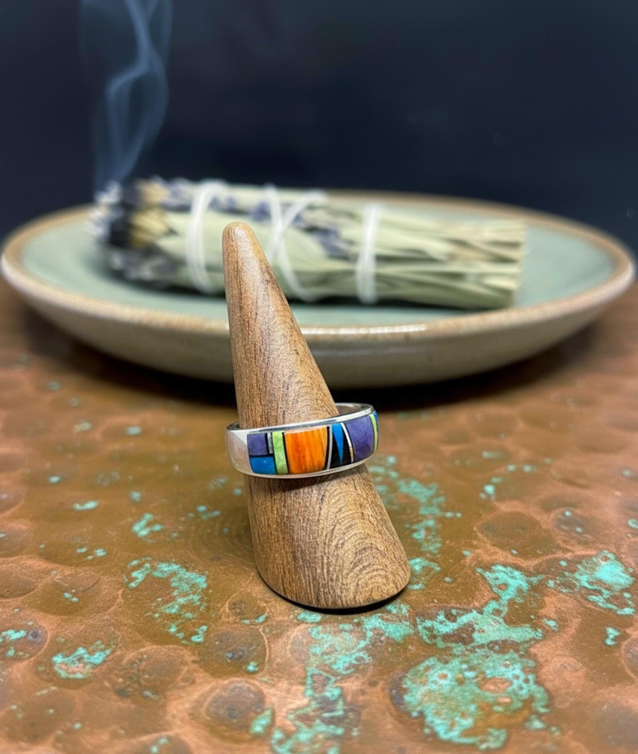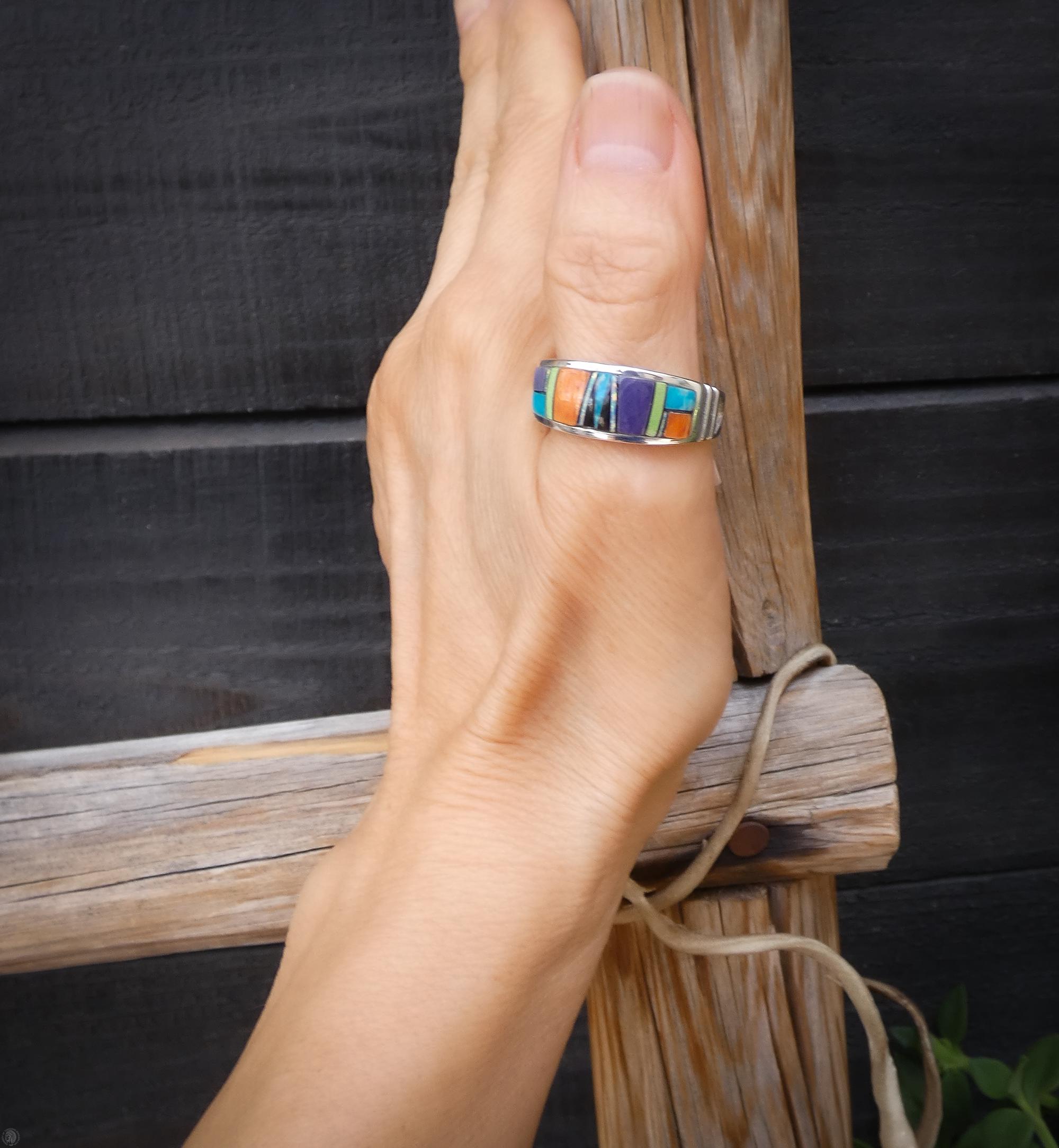 This beautifully handcrafted Navajo multi-stone inlay band ring is made from solid sterling silver and signed by renowned artist Rick Tolino. Designed in the traditional Navajo inlay style, the ring features precisely hand-cut stones set into a smooth, flush surface, with subtle raised detailing that adds depth and a rich, tactile texture.