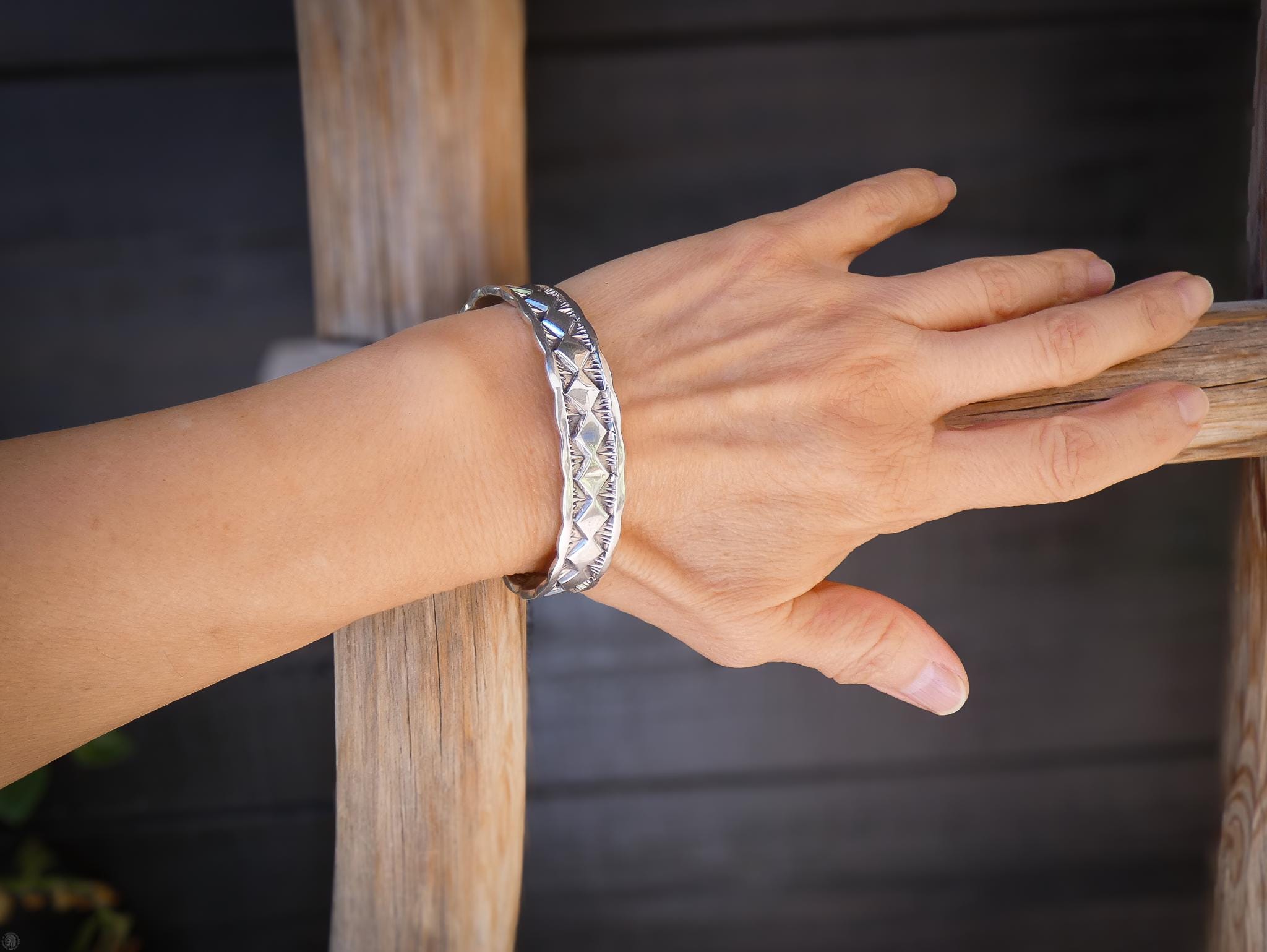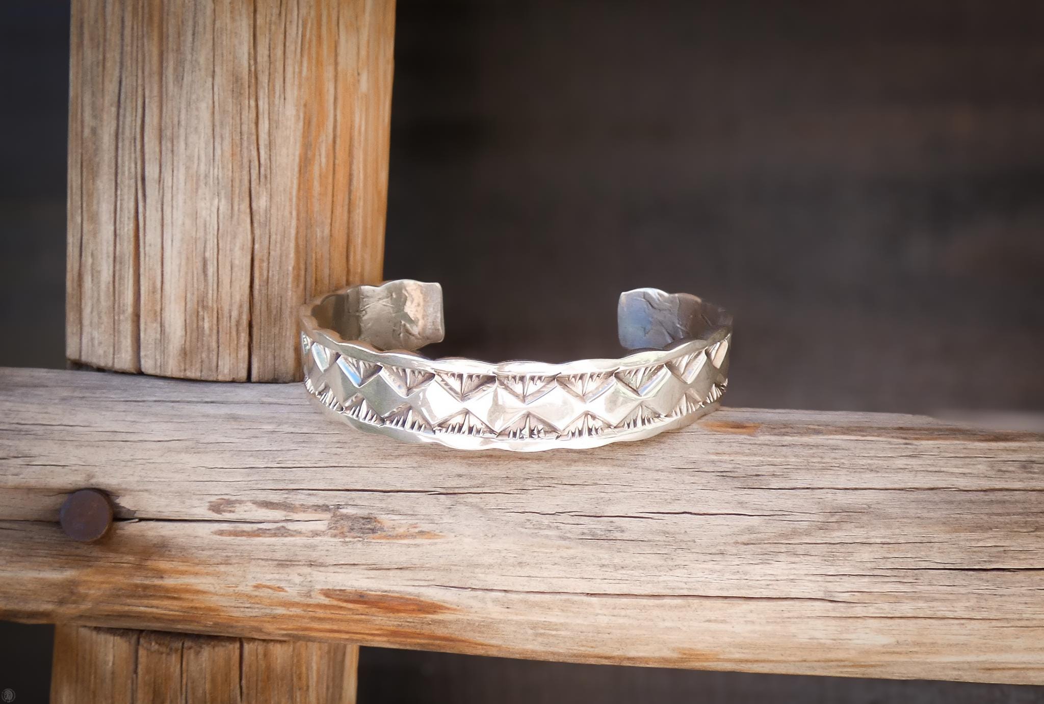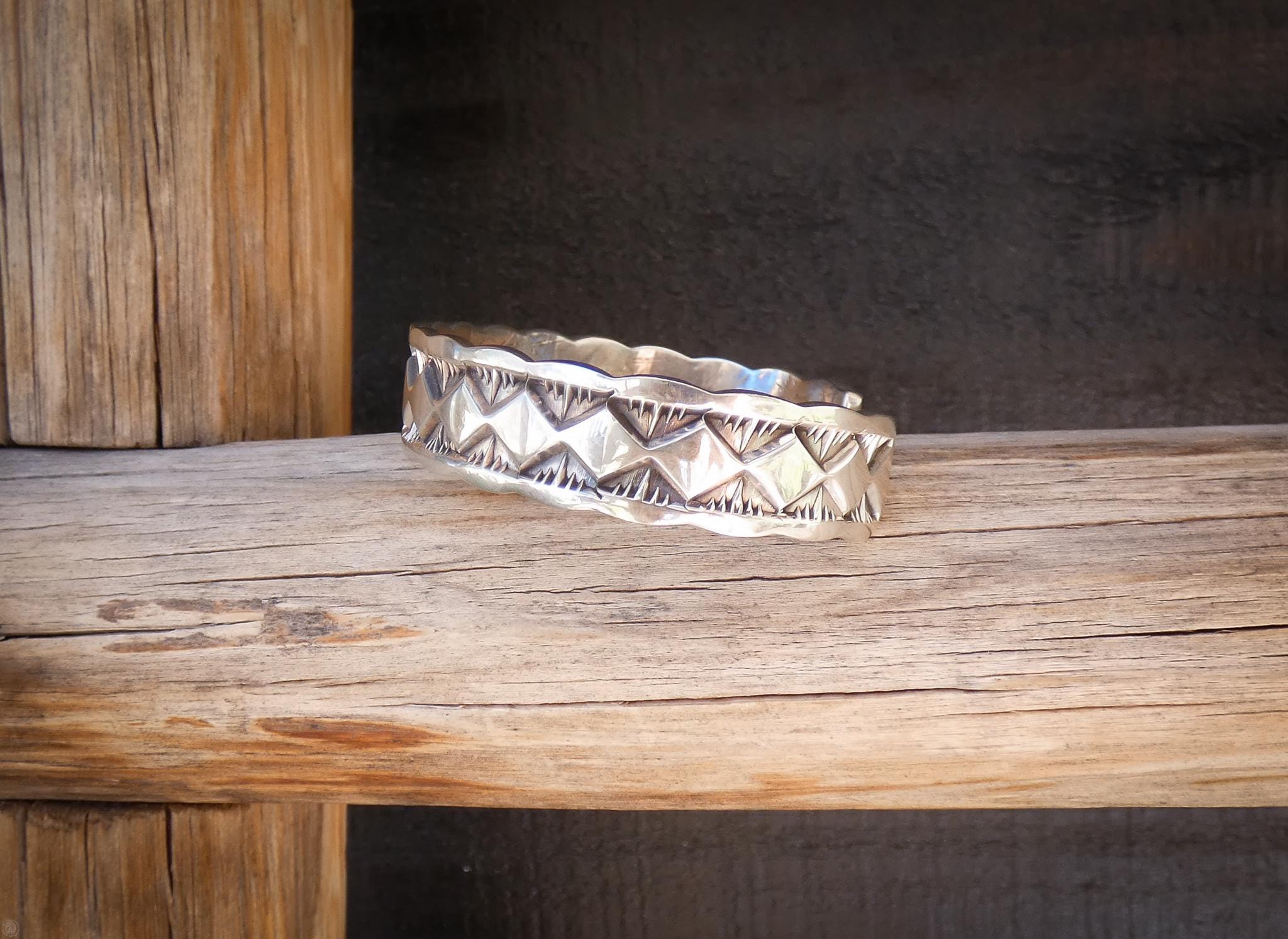 This Unisex cuff bracelet is handcrafted with solid heavy gauge sterling silver. Purchased in the 1990's, this cuff is completely handcrafted by award winning Apache artist Marc Antia.