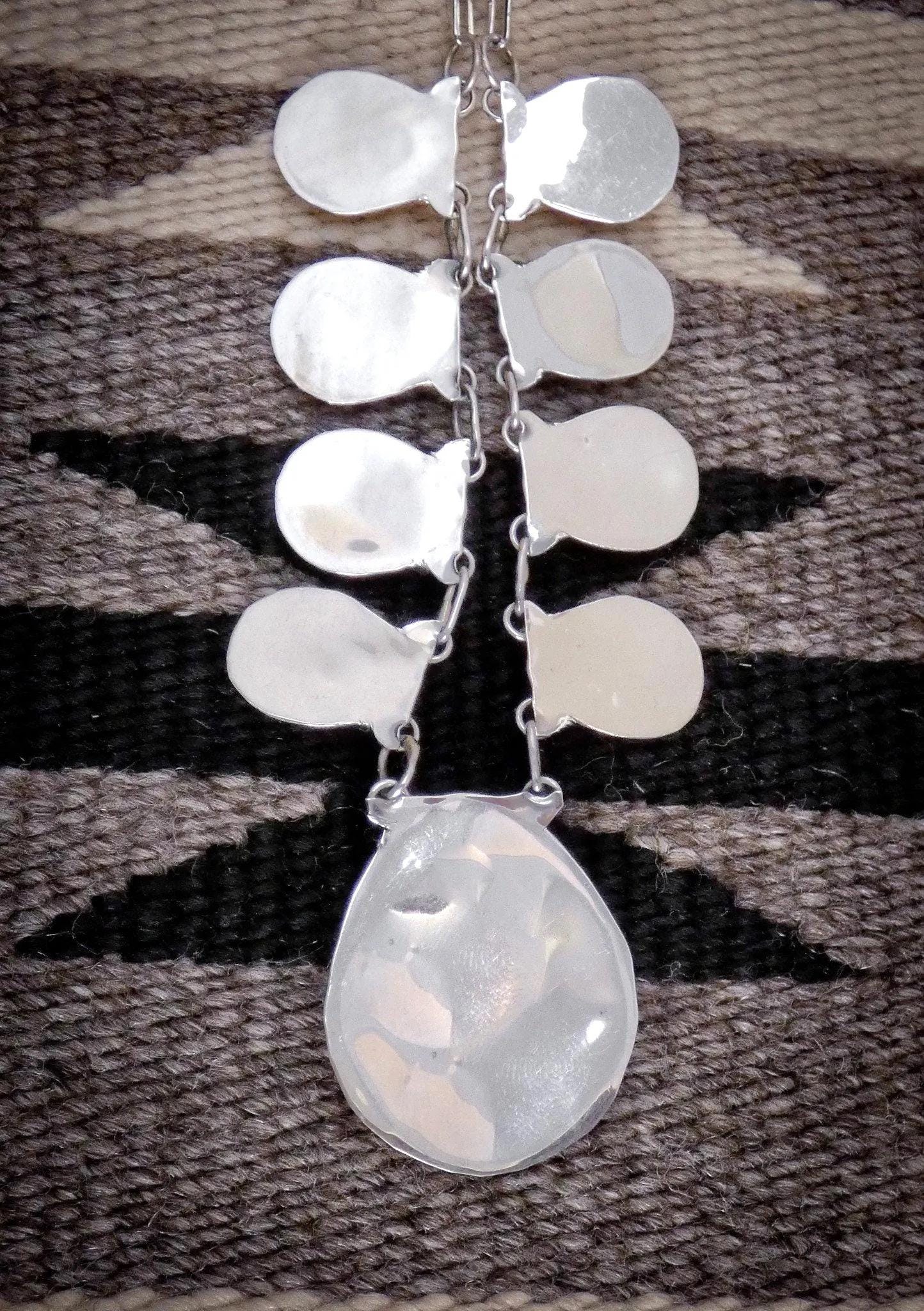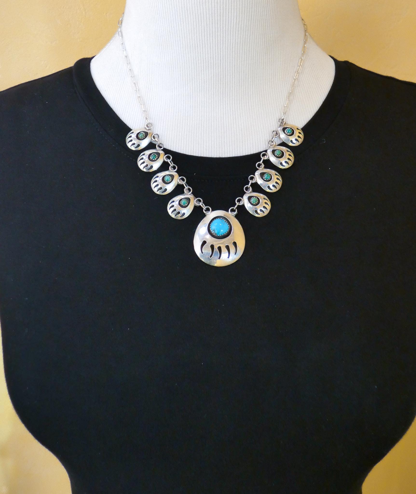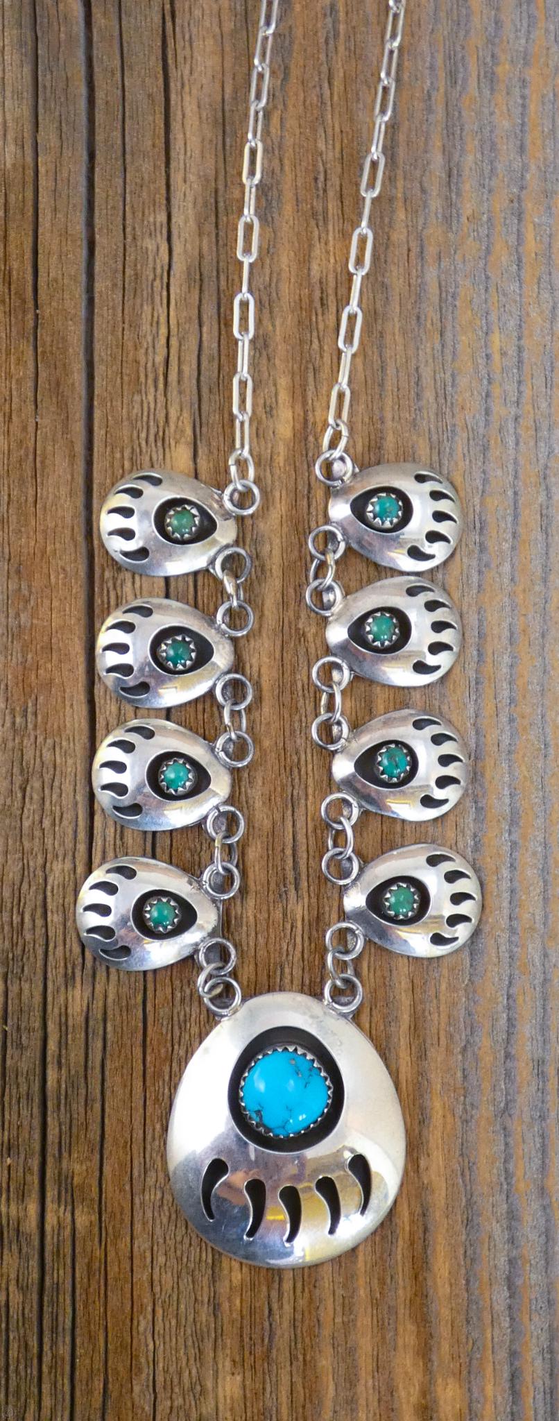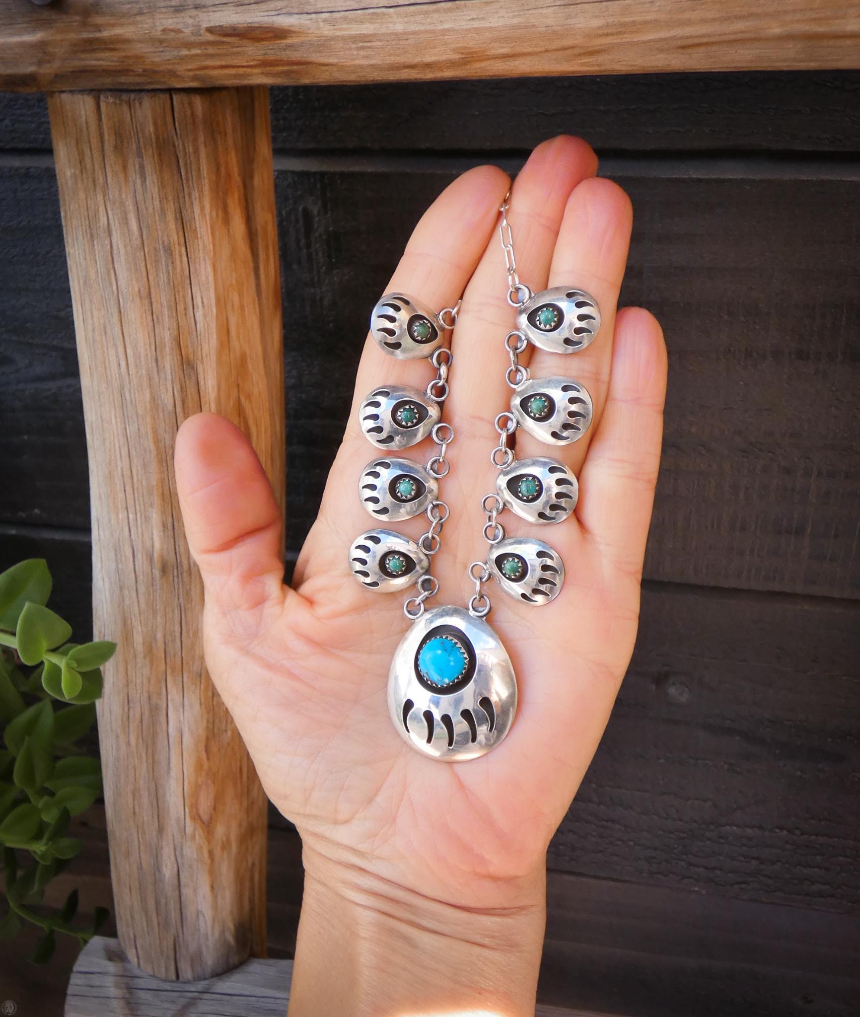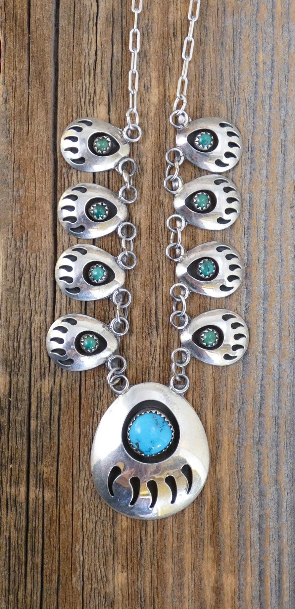 This vintage Native American Navajo shadow box 9 piece necklace offers a signature touch of Navajo culture to your wardrobe. This set is lovingly handcrafted with sterling silver and Turquoise in a shadow box setting, with Malachite as the adorning stone in the side pieces. The bear paw is found in many Native American works of art, and is seen as a symbol of strength and healing. This is a signature piece you will make a statement wearing, and it will be treasured for its traditional handcrafted beauty!