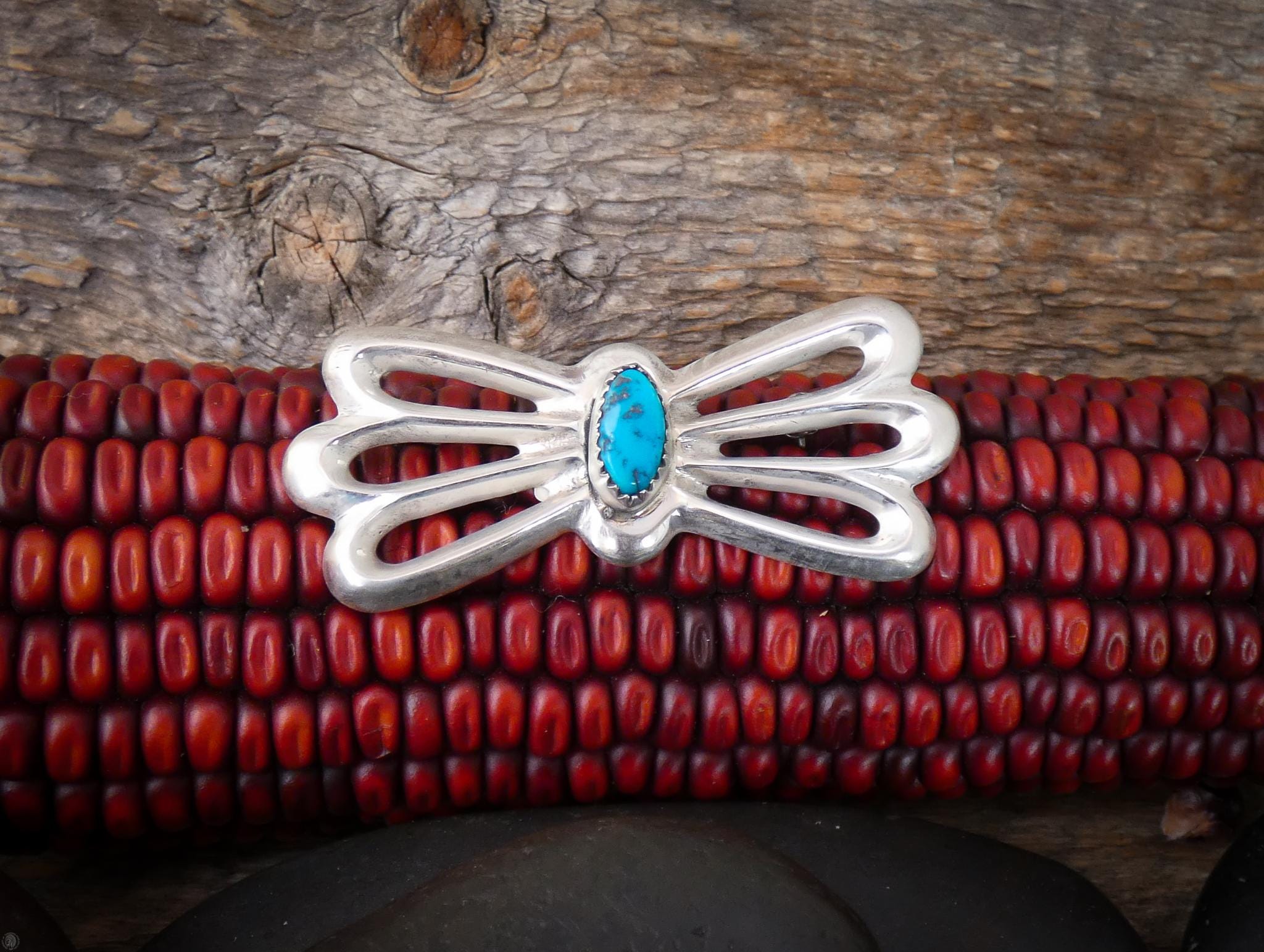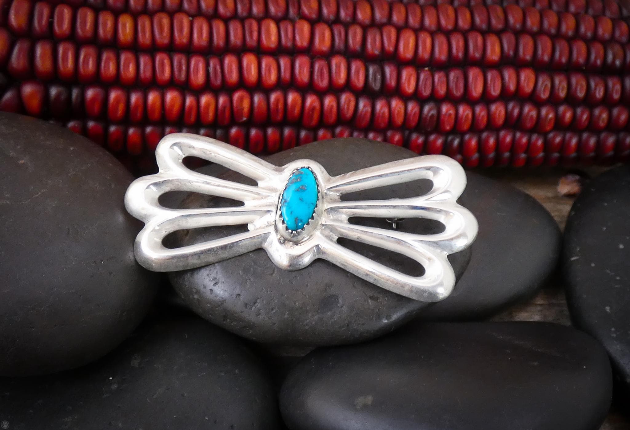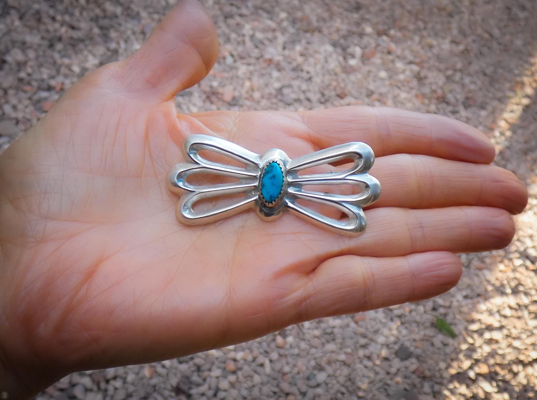 This Sterling Silver Turquoise Sandcast pin is truly an heirloom piece. The detail of the flowing design is superb and beyond beautiful! Sandcast is a medium where the molten silver is poured into a sand mold, after which it is hand-finished; a lost art form that is no longer being done. That lost art means that this heirloom piece is one-of-a-kind. Other than in other vintage jewelry, you will not find a piece that uses the same sandcast medium. What is even more rare is that this piece has never been worn, and it is incredibly hard to find a sandcast piece that has never been worn these days. This will be a piece you can cherish for its simplicity in design, but complexity in the method used to make it.