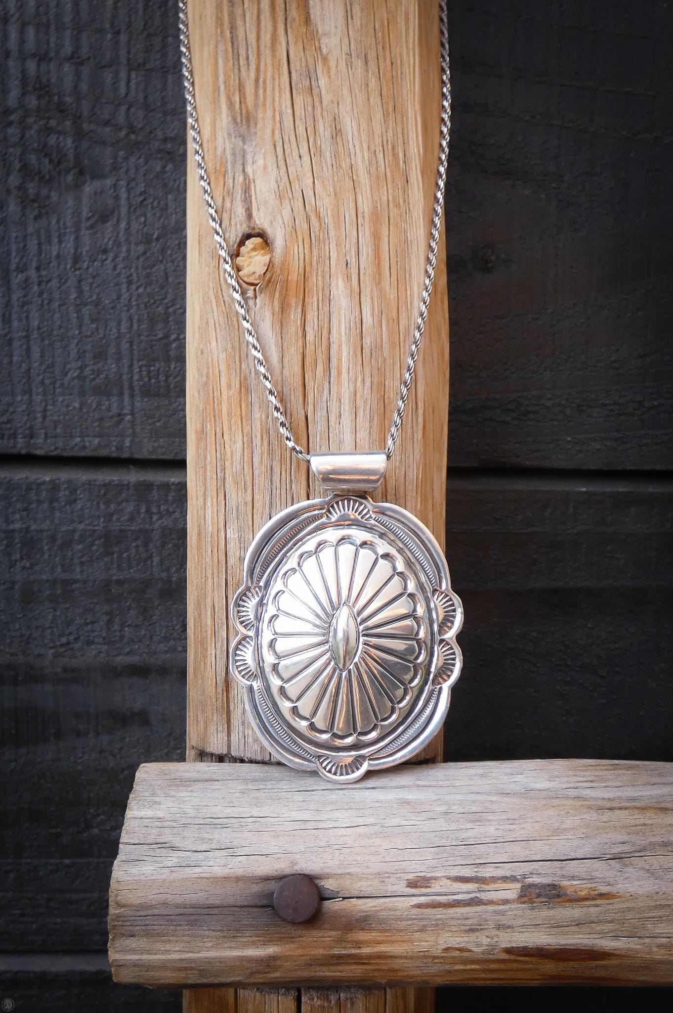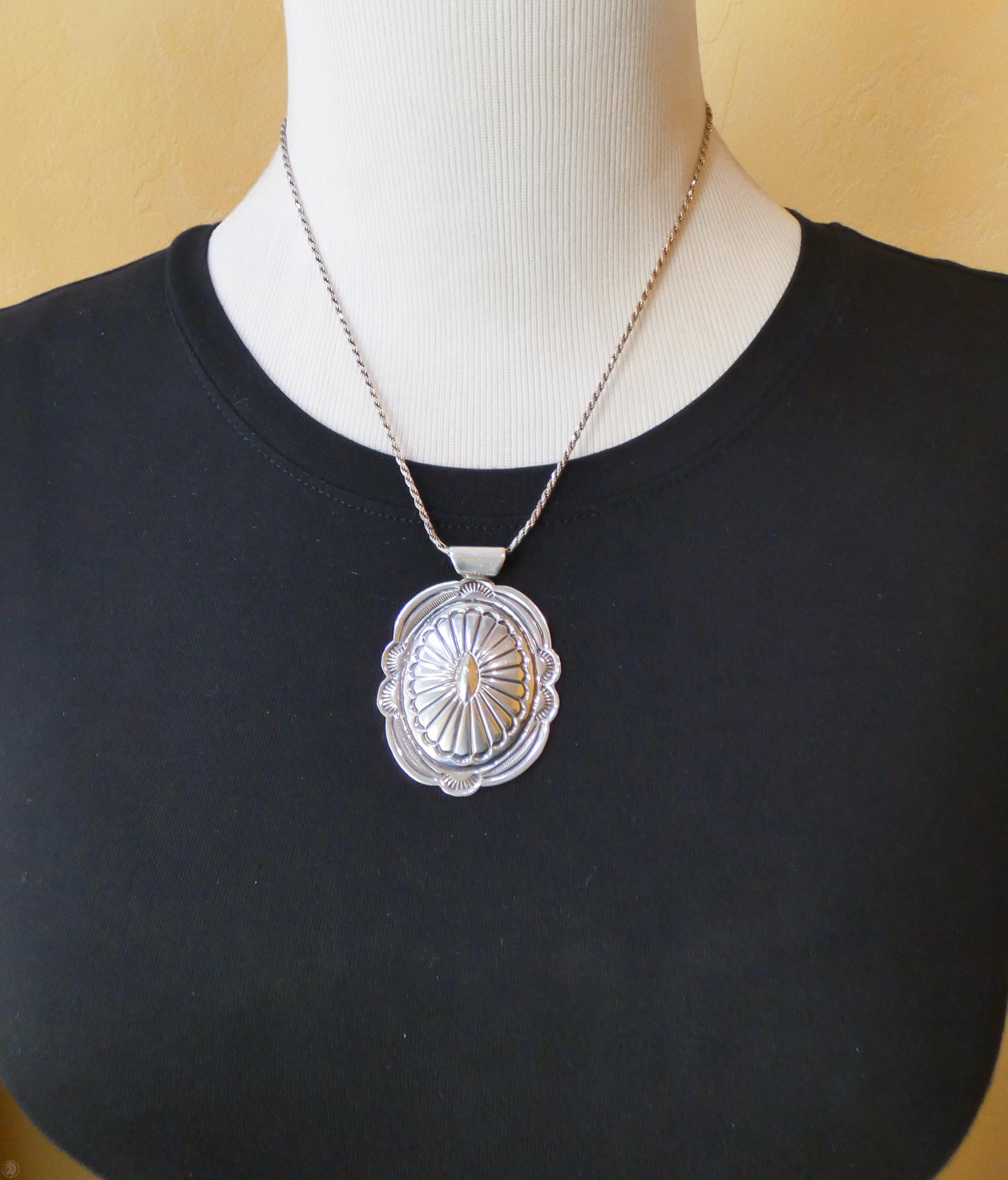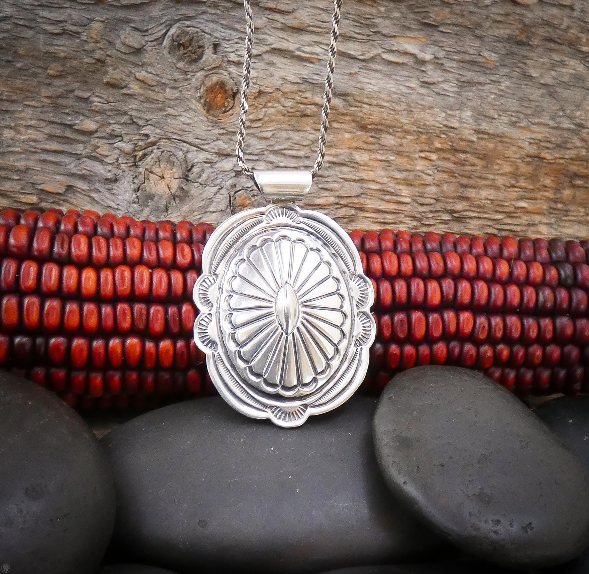 This vintage Navajo pendant features a classic oval concho design crafted in solid sterling silver — a timeless style rooted in Southwest Navajo tradition. The surface shows the kind of detail you only get from hand-finished work, with subtle texturing and depth that catch the light with a beautiful shine. It has a nice presence without being heavy, making it a versatile piece you can wear daily or layer with other necklaces.