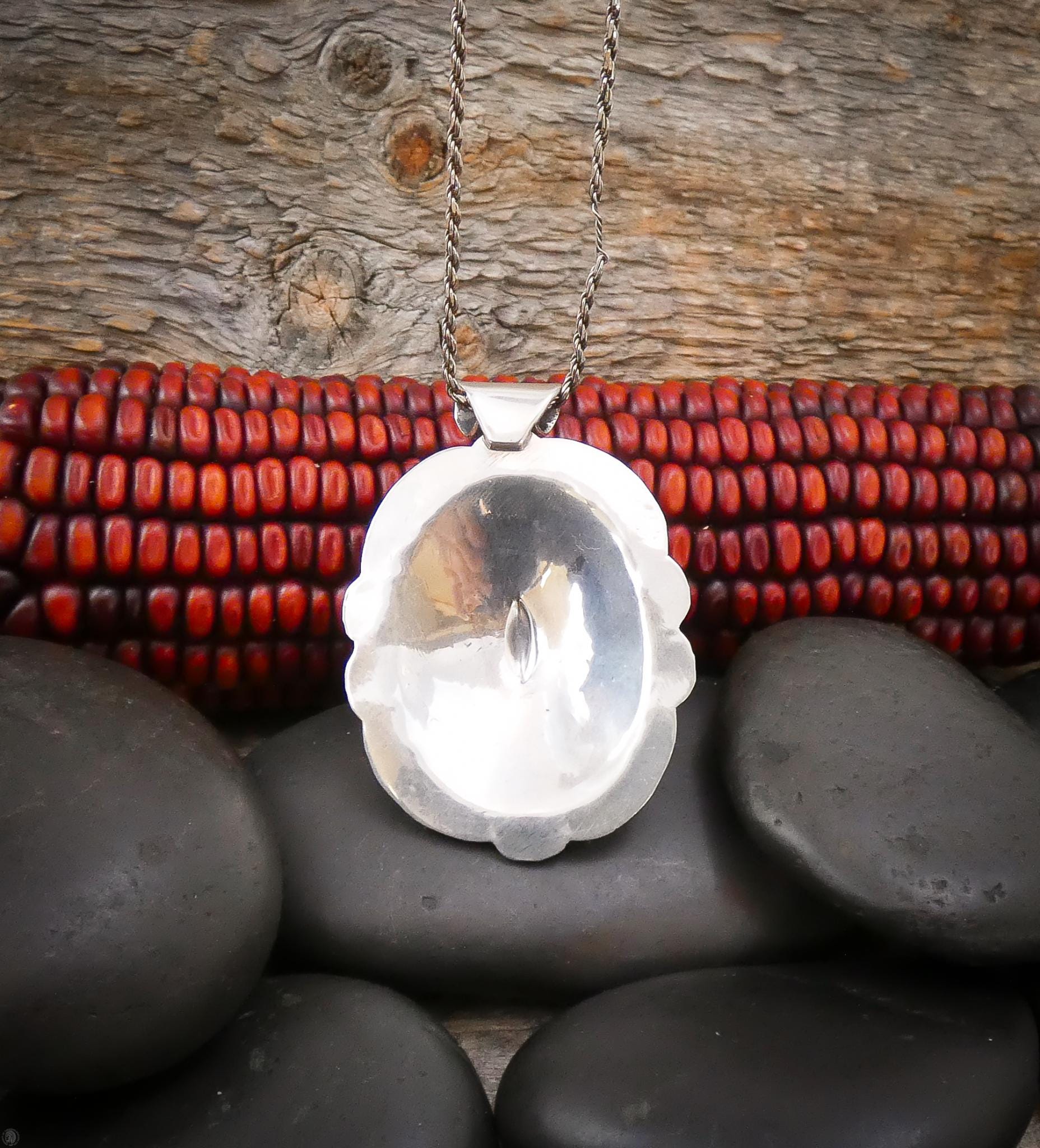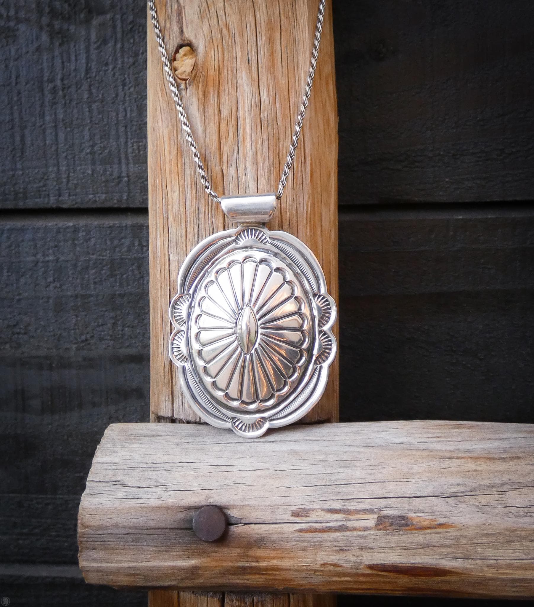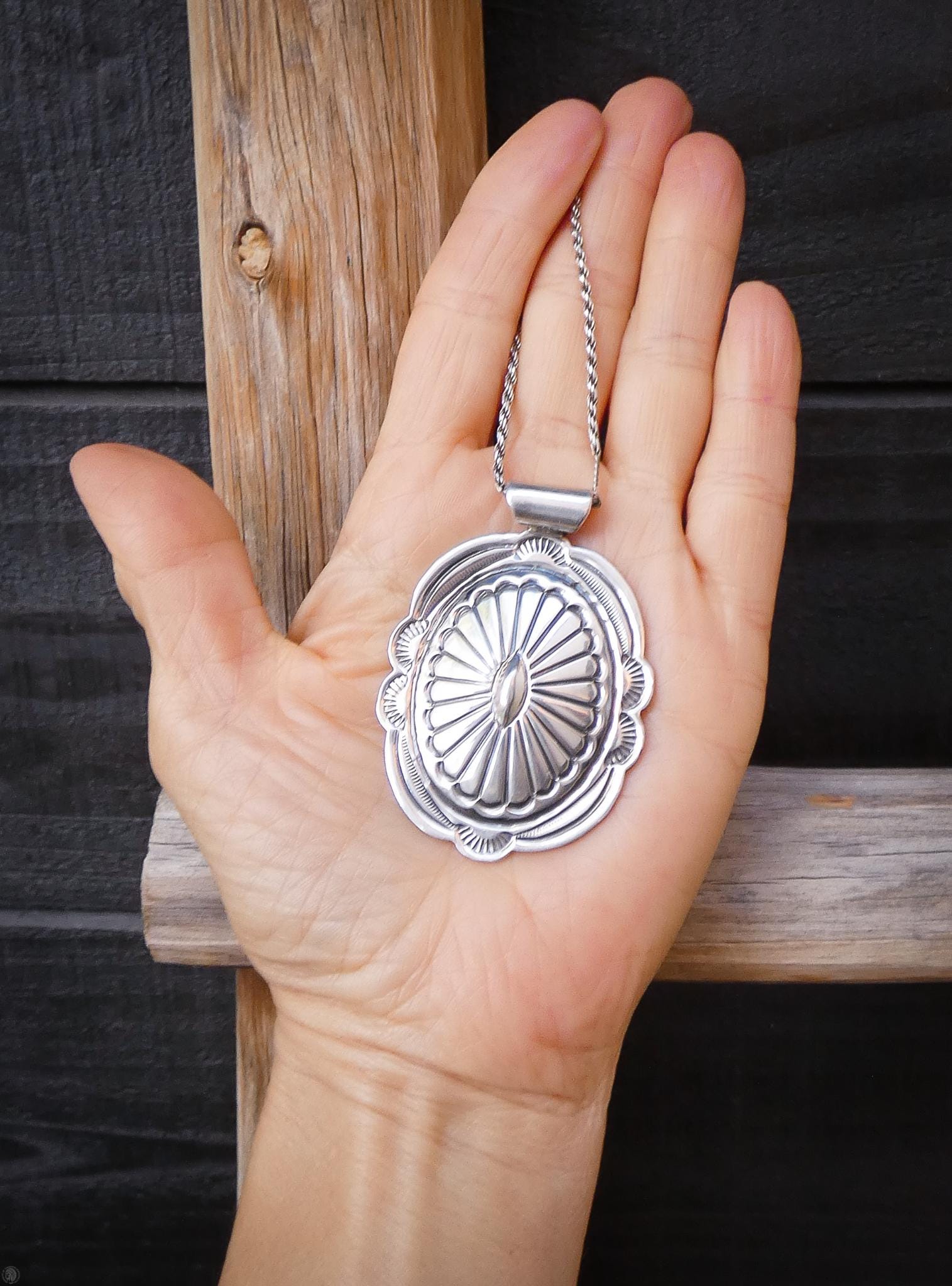 This vintage Navajo pendant features a classic oval concho design crafted in solid sterling silver — a timeless style rooted in Southwest Navajo tradition. The surface shows the kind of detail you only get from hand-finished work, with subtle texturing and depth that catch the light with a beautiful shine. It has a nice presence without being heavy, making it a versatile piece you can wear daily or layer with other necklaces.